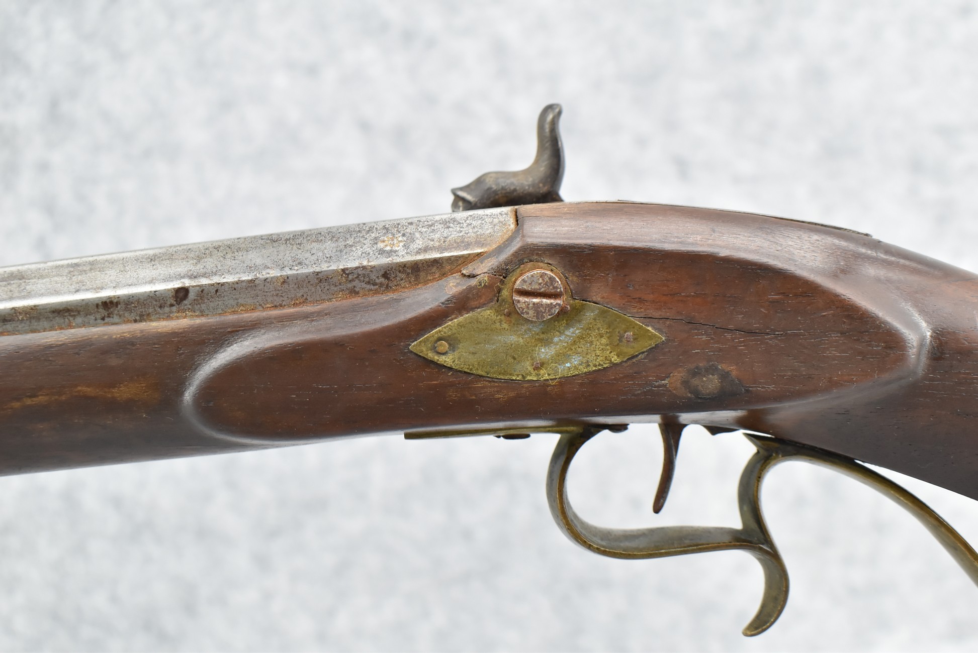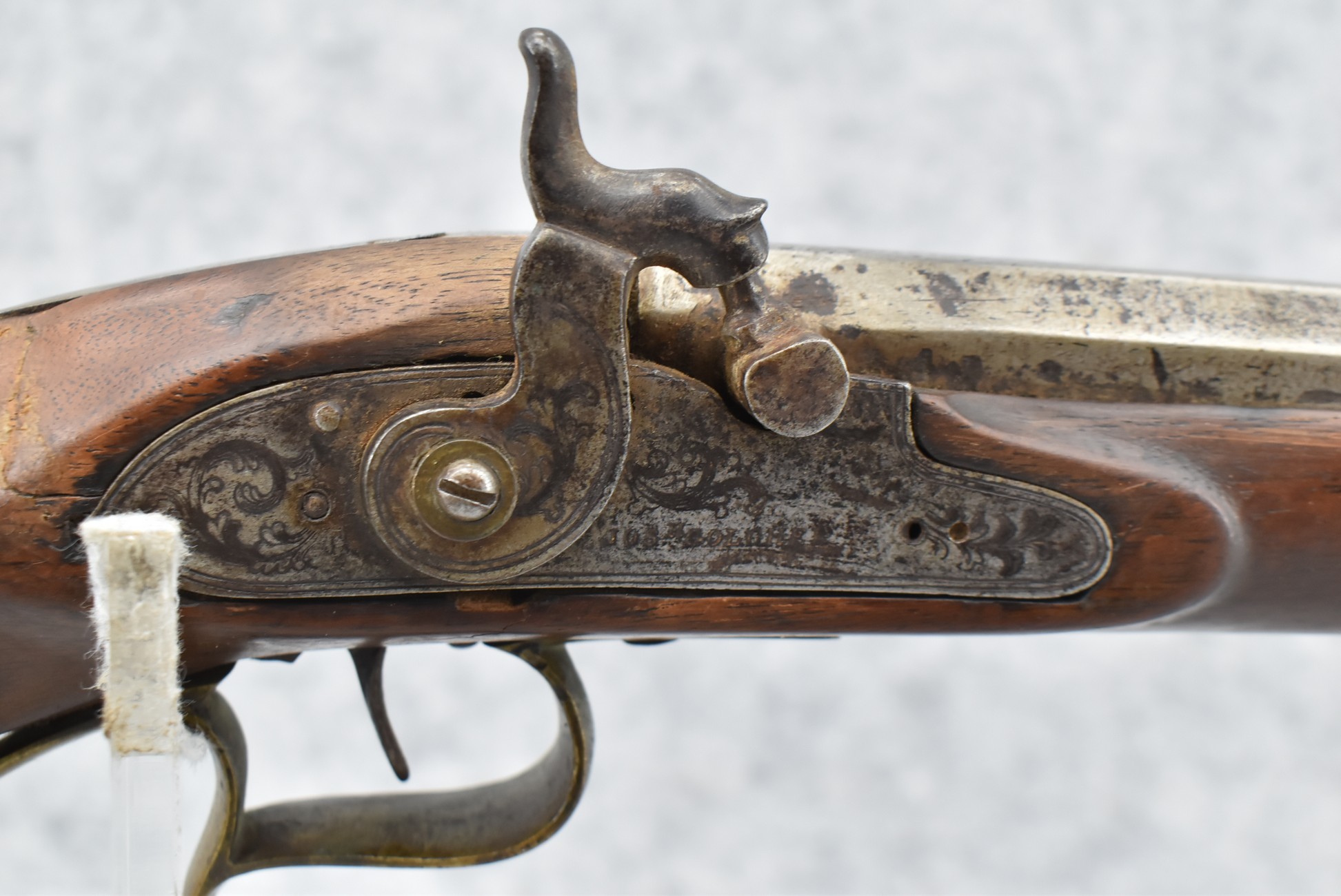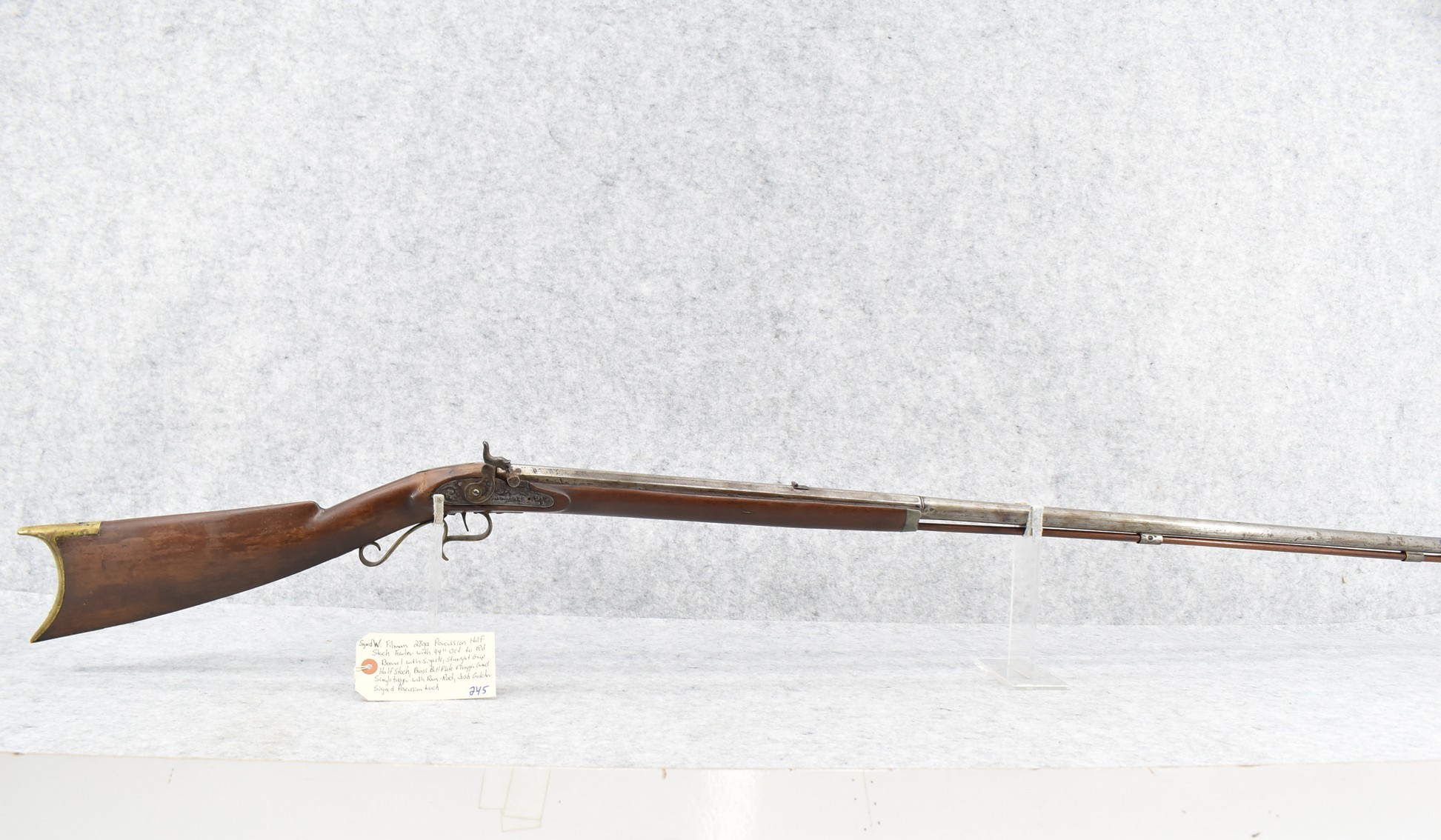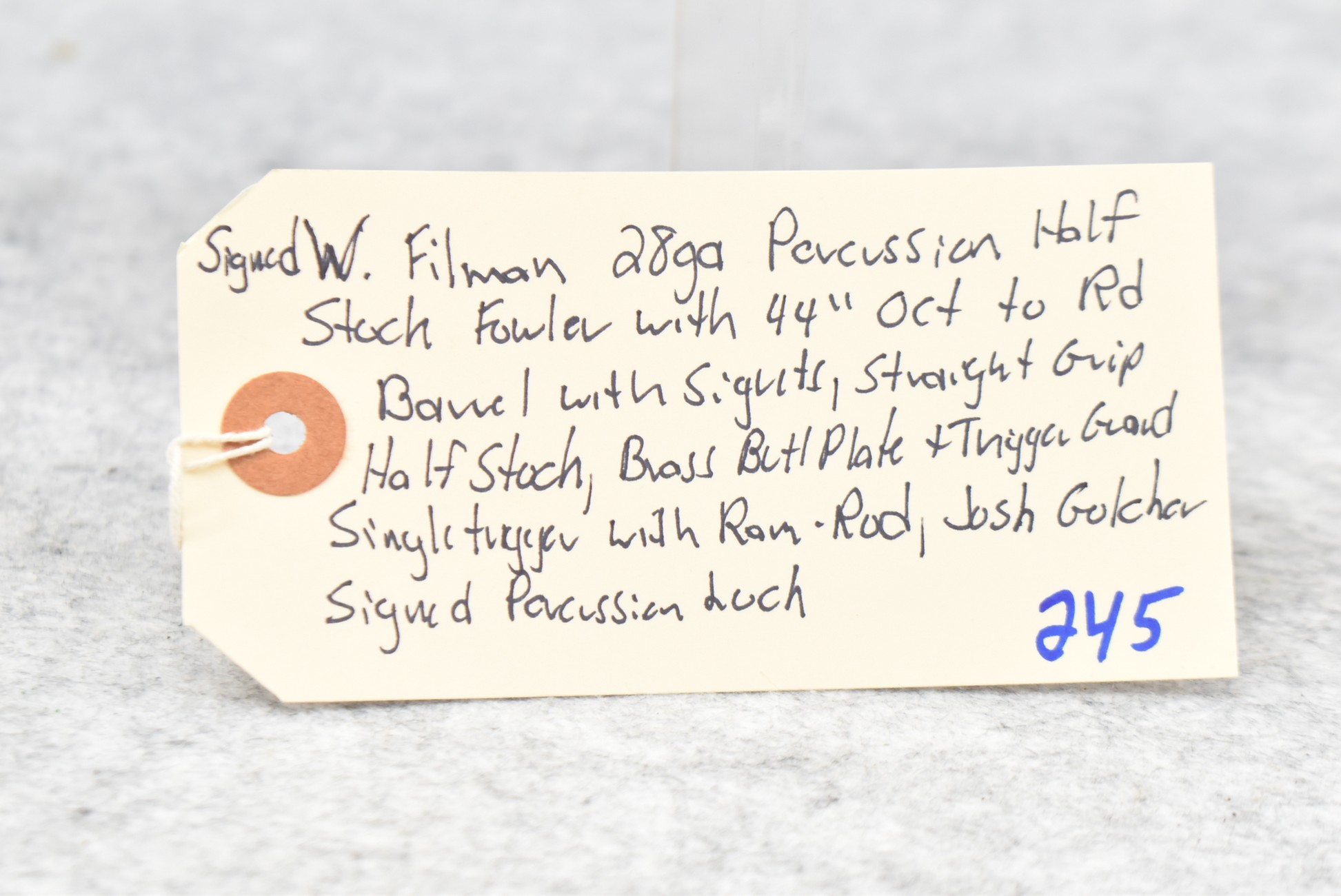 245. Signed Filman 28ga. Percussion Half Stock Fowler – w/44” Octagon to Round Barrel w/Sights – w/Straight Grip Half Stock w/Brass Butt Plate & Trigger Guard – w/Josh Golcher Signed Percussion Lock – w/Single Trigger – w/Ram Rod