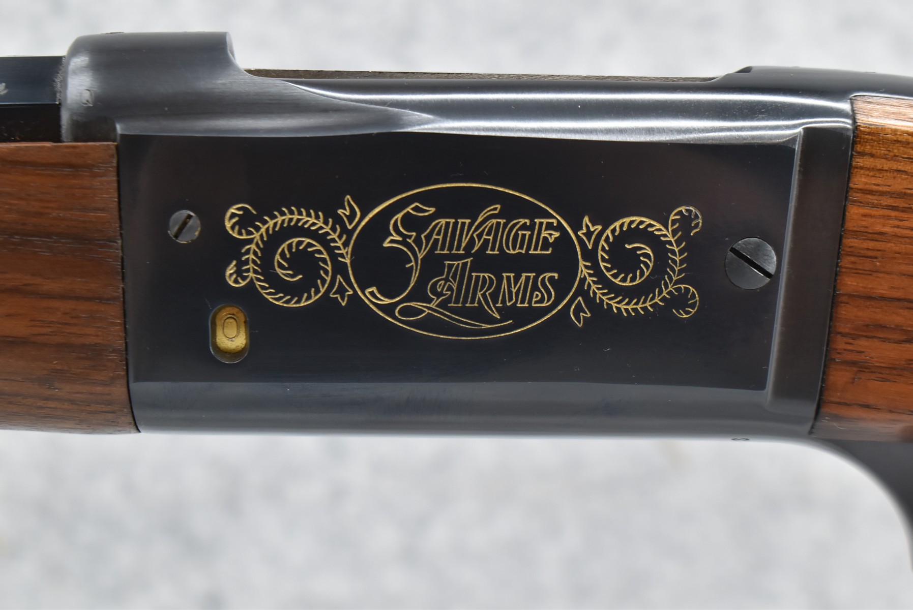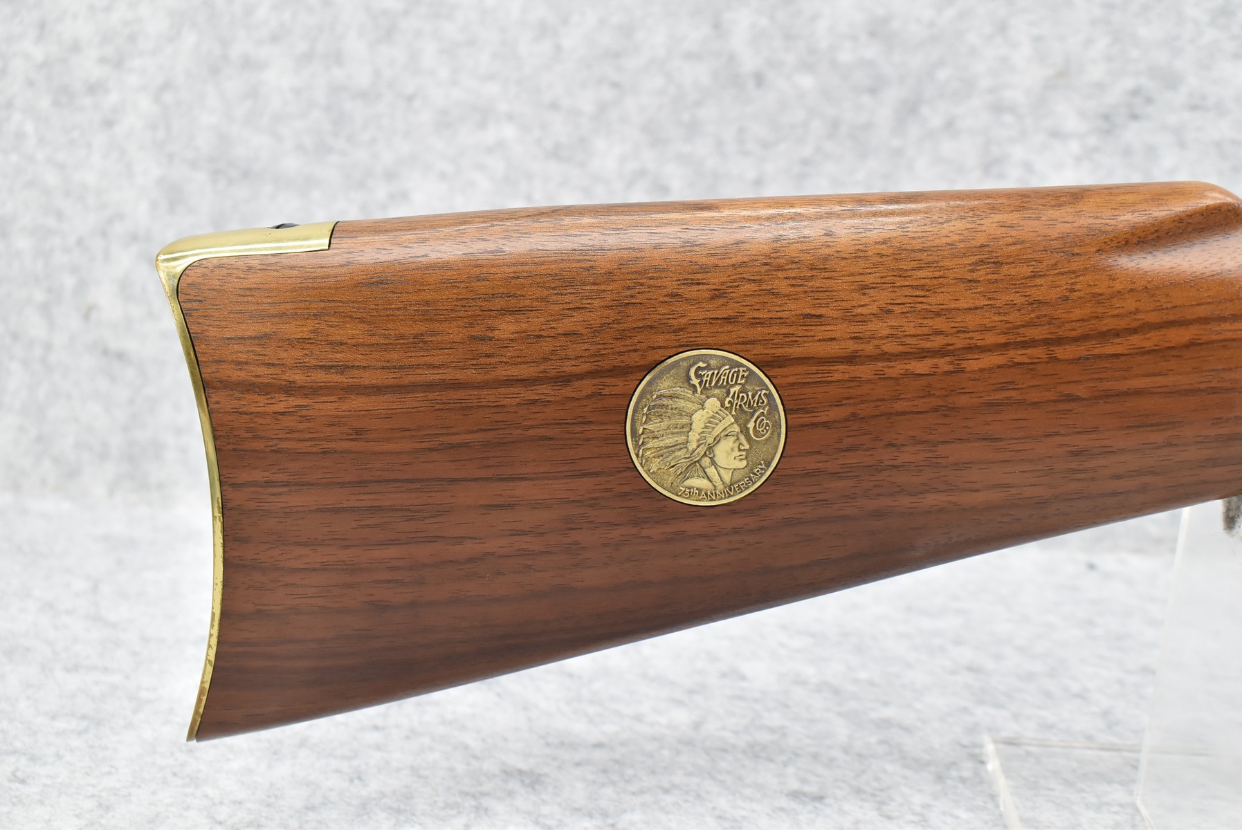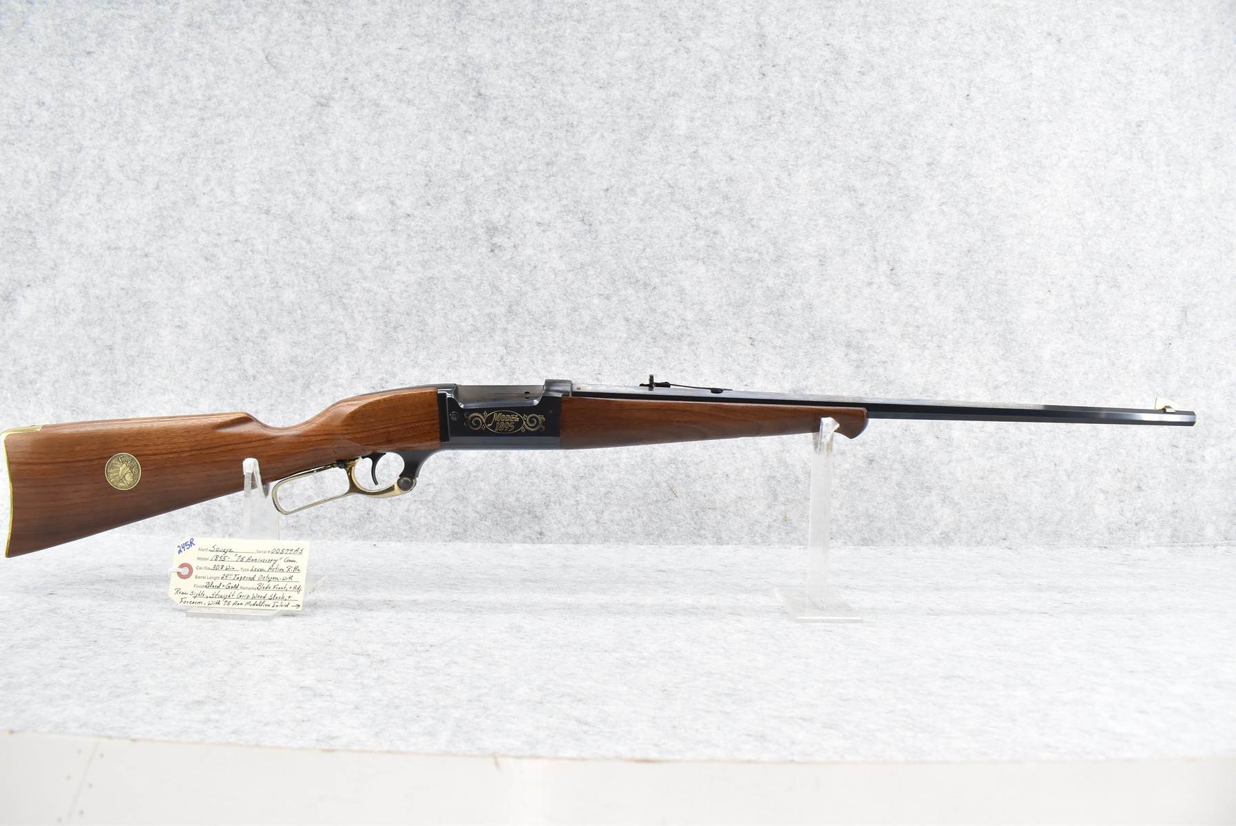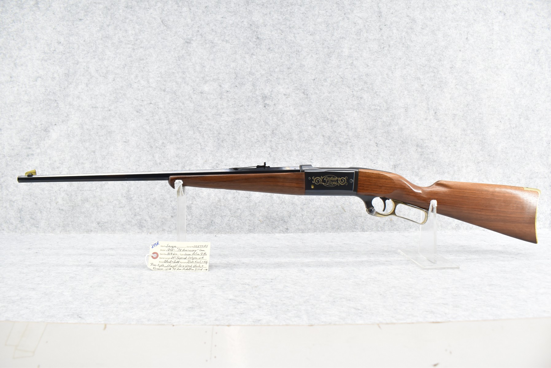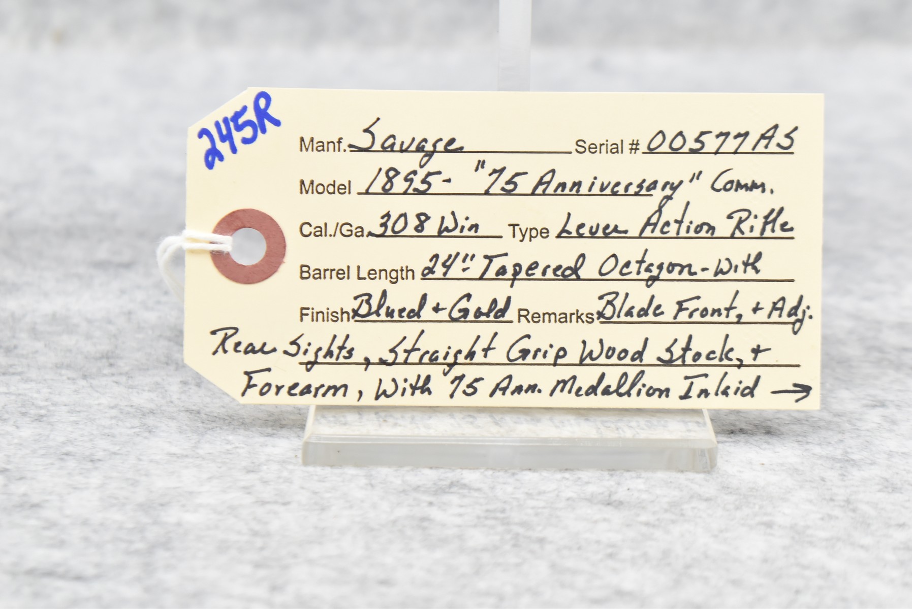 245R. Savage – Mod. 1895 – 75th Anniversary Commemorative – 308 Win. Cal. Lever Action Rifle – w/24” Tapered Octagon Barrel w/Blade Front & Adj. Rear Sights – Blued & Gold Finish – w/Straight Grip Wood Stocks w/75th Anniversary Medallion Inlaid on Right Side of Stock w/Gold Butt Plate & Lever