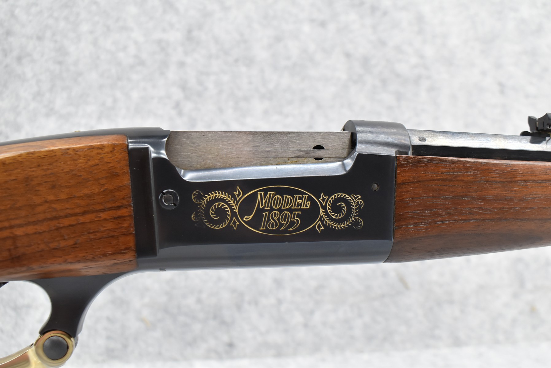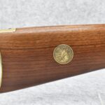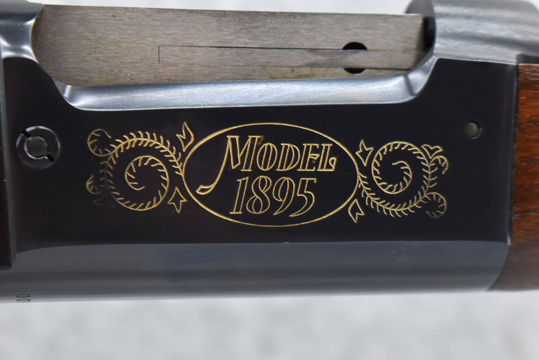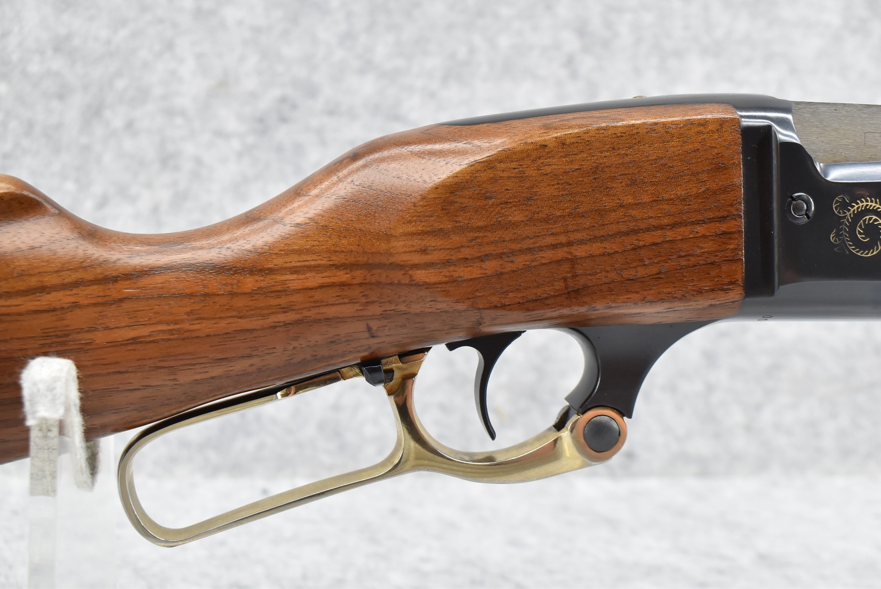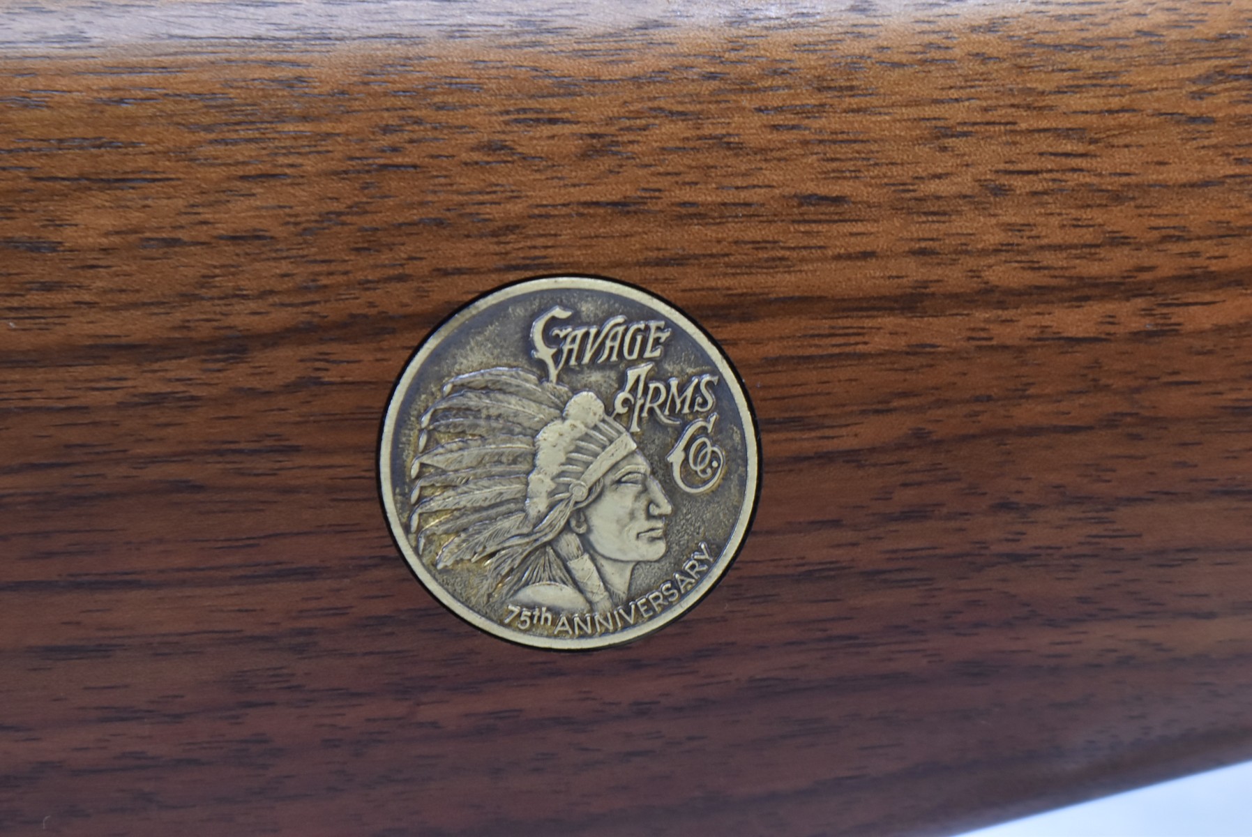245R. Savage – Mod. 1895 – 75th Anniversary Commemorative – 308 Win. Cal. Lever Action Rifle – w/24” Tapered Octagon Barrel w/Blade Front & Adj. Rear Sights – Blued & Gold Finish – w/Straight Grip Wood Stocks w/75th Anniversary Medallion Inlaid on Right Side of Stock w/Gold Butt Plate & Lever