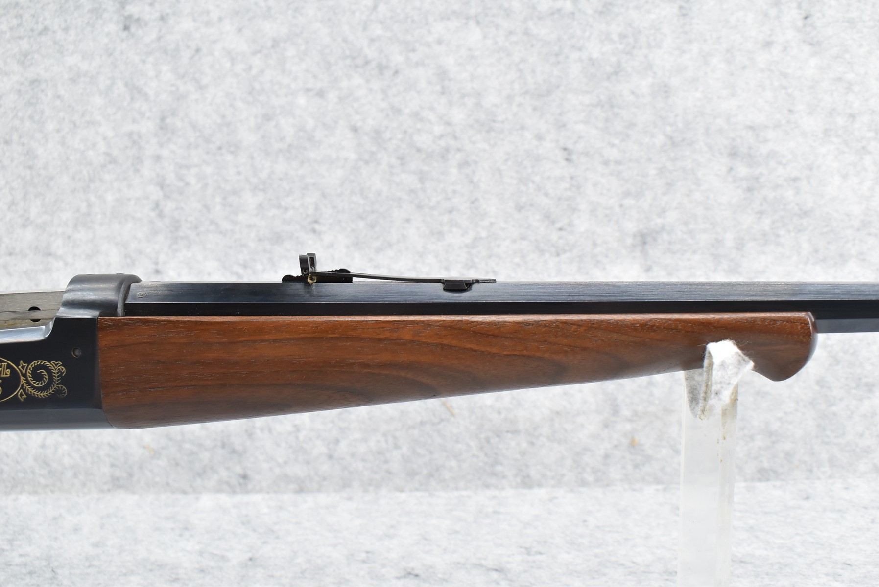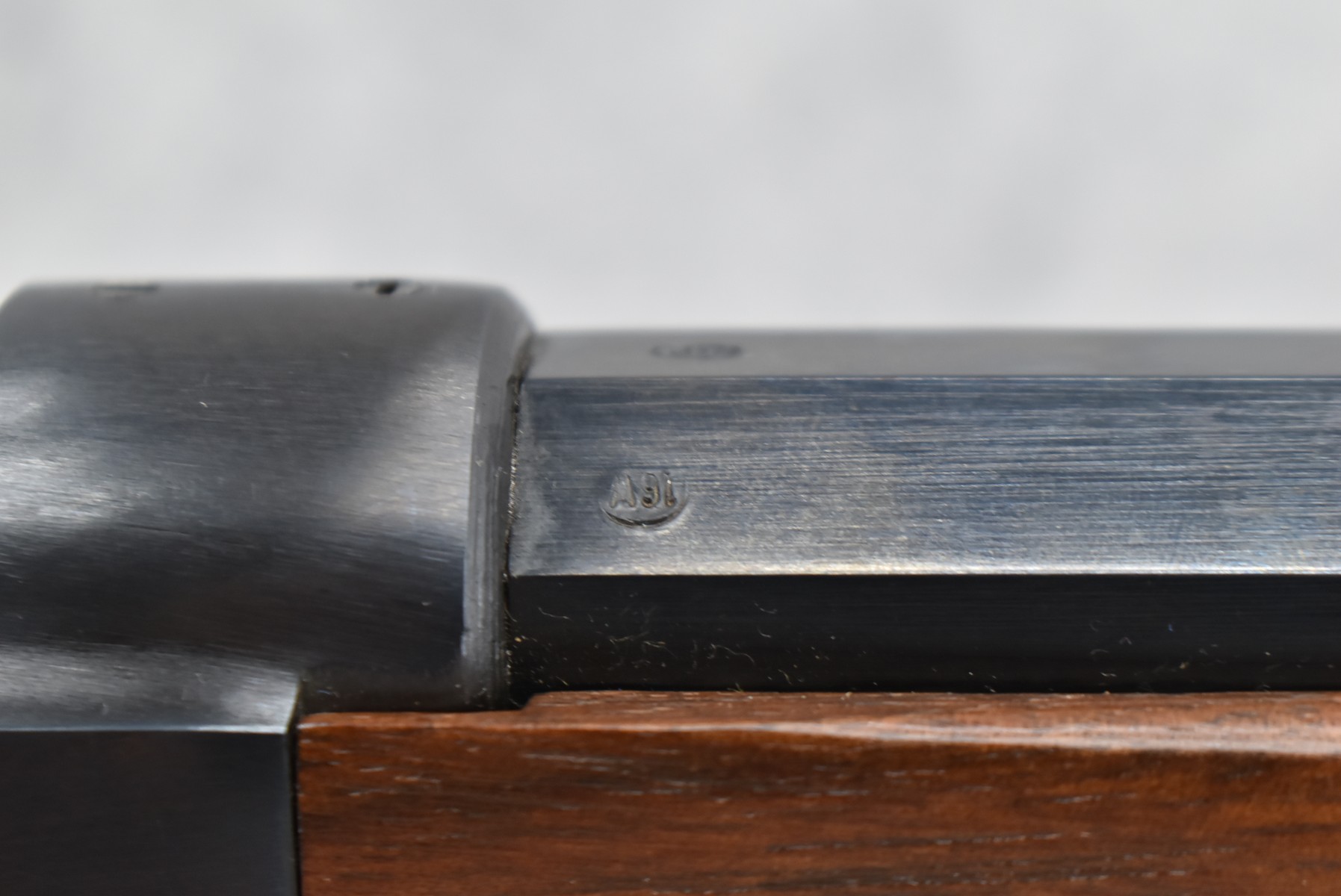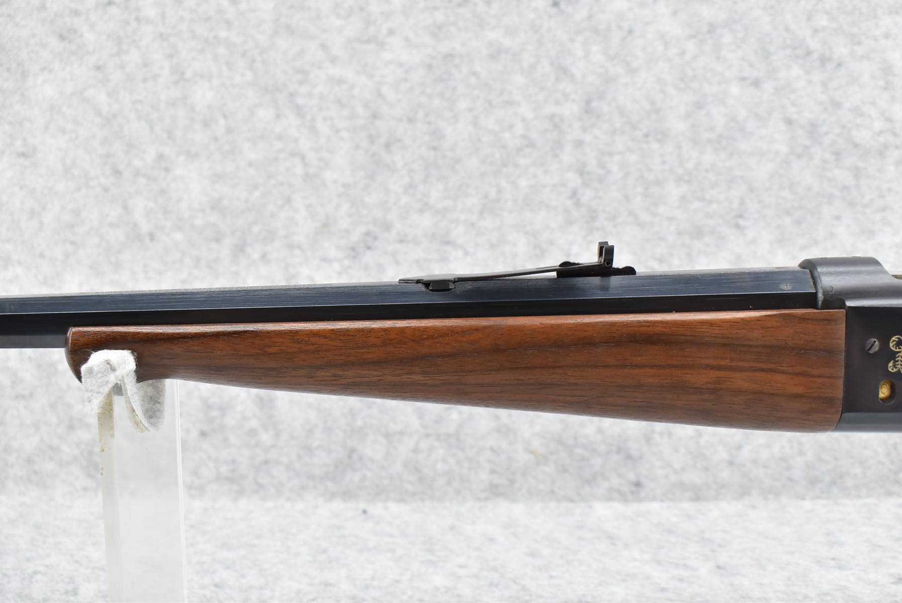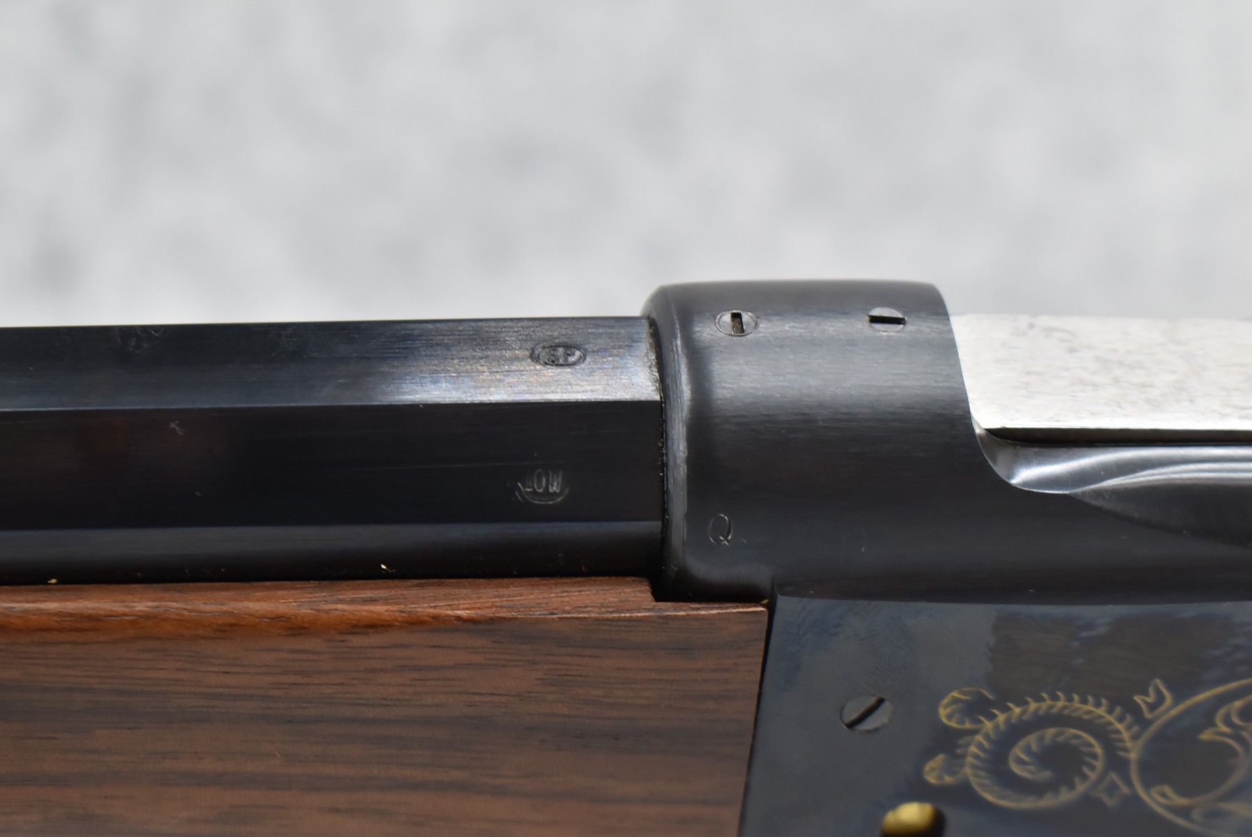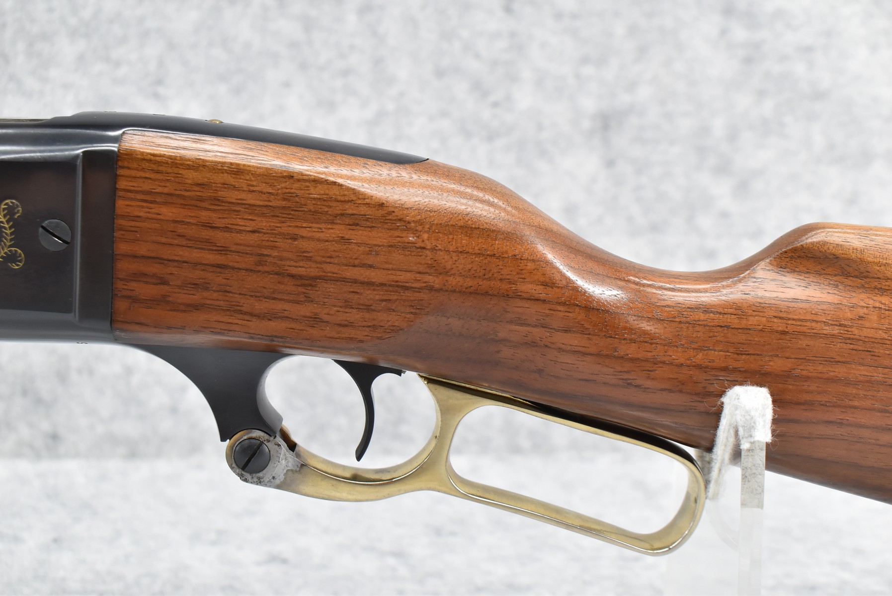 245R. Savage – Mod. 1895 – 75th Anniversary Commemorative – 308 Win. Cal. Lever Action Rifle – w/24” Tapered Octagon Barrel w/Blade Front & Adj. Rear Sights – Blued & Gold Finish – w/Straight Grip Wood Stocks w/75th Anniversary Medallion Inlaid on Right Side of Stock w/Gold Butt Plate & Lever