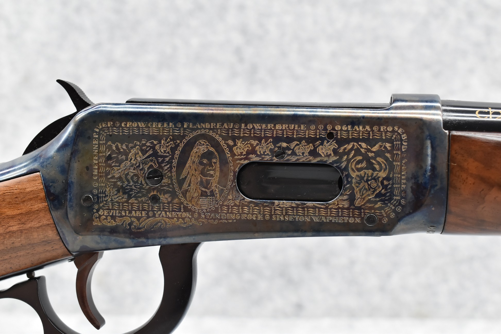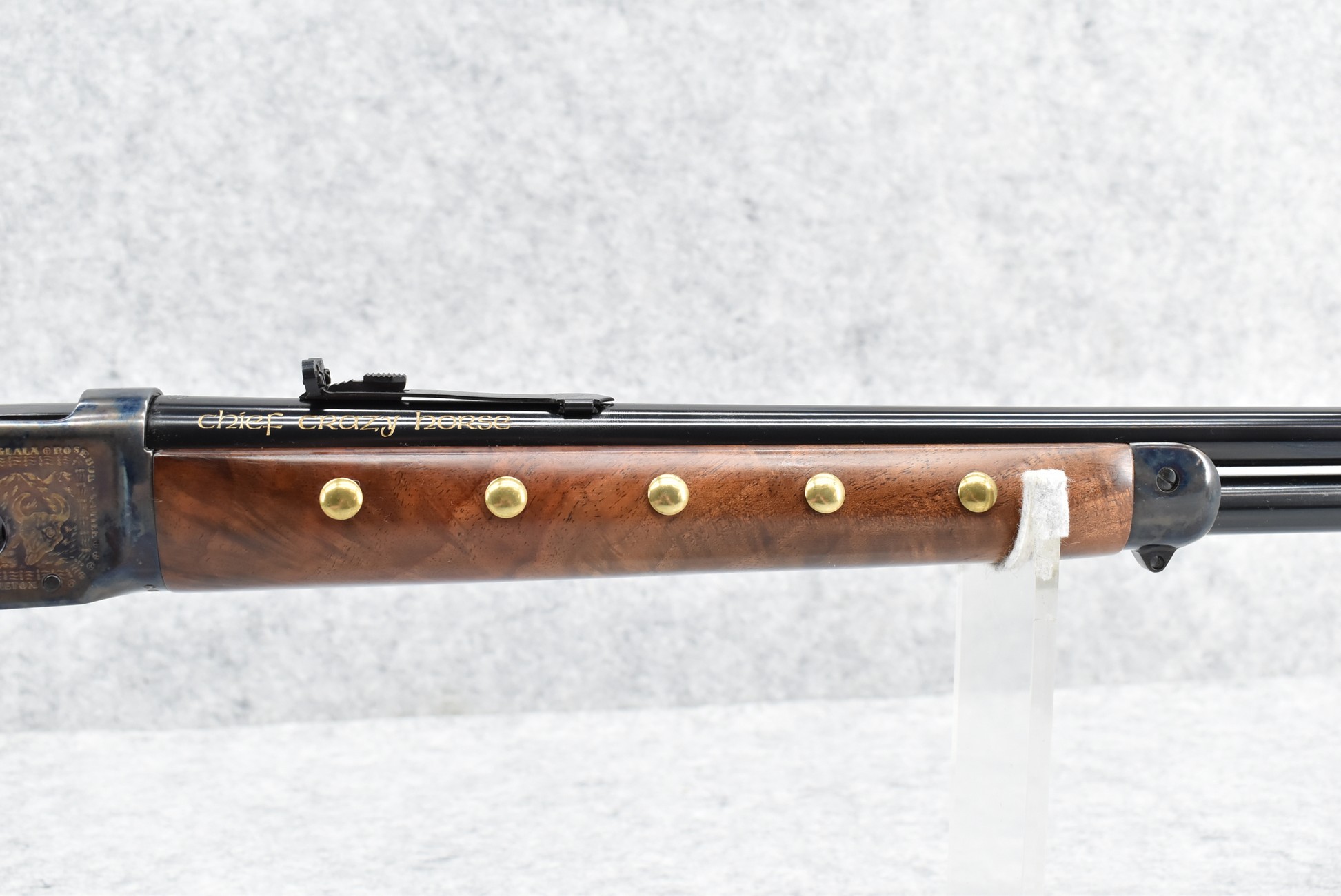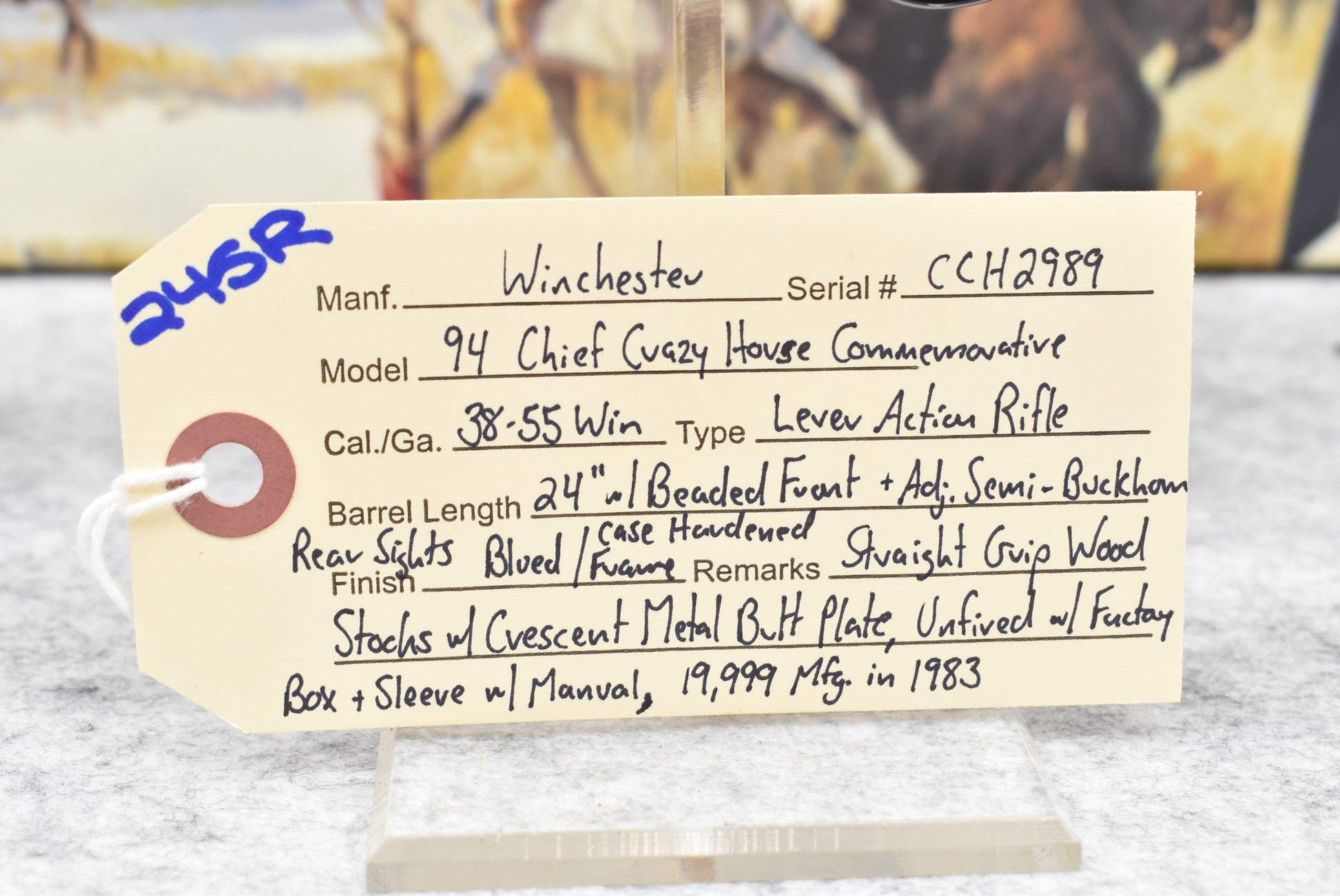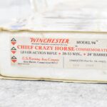 245R. Winchester – Mod. 94 Chief Crazy Horse Commemorative – 38-55 Win. Cal. Lever Action Rifle – w/24” Barrel w/Beaded Front and Adjustable Semi-Buckhorn Rear Sights – Blued Finish w/Case Hardened Frame – w/Straight Grip Wood Stocks w/Crescent Metal Butt Plate – Unfired w/Factory Box, Sleeve and Manual – 19,999 Manufactured in 1983