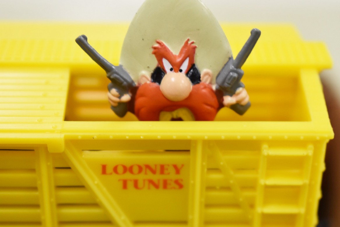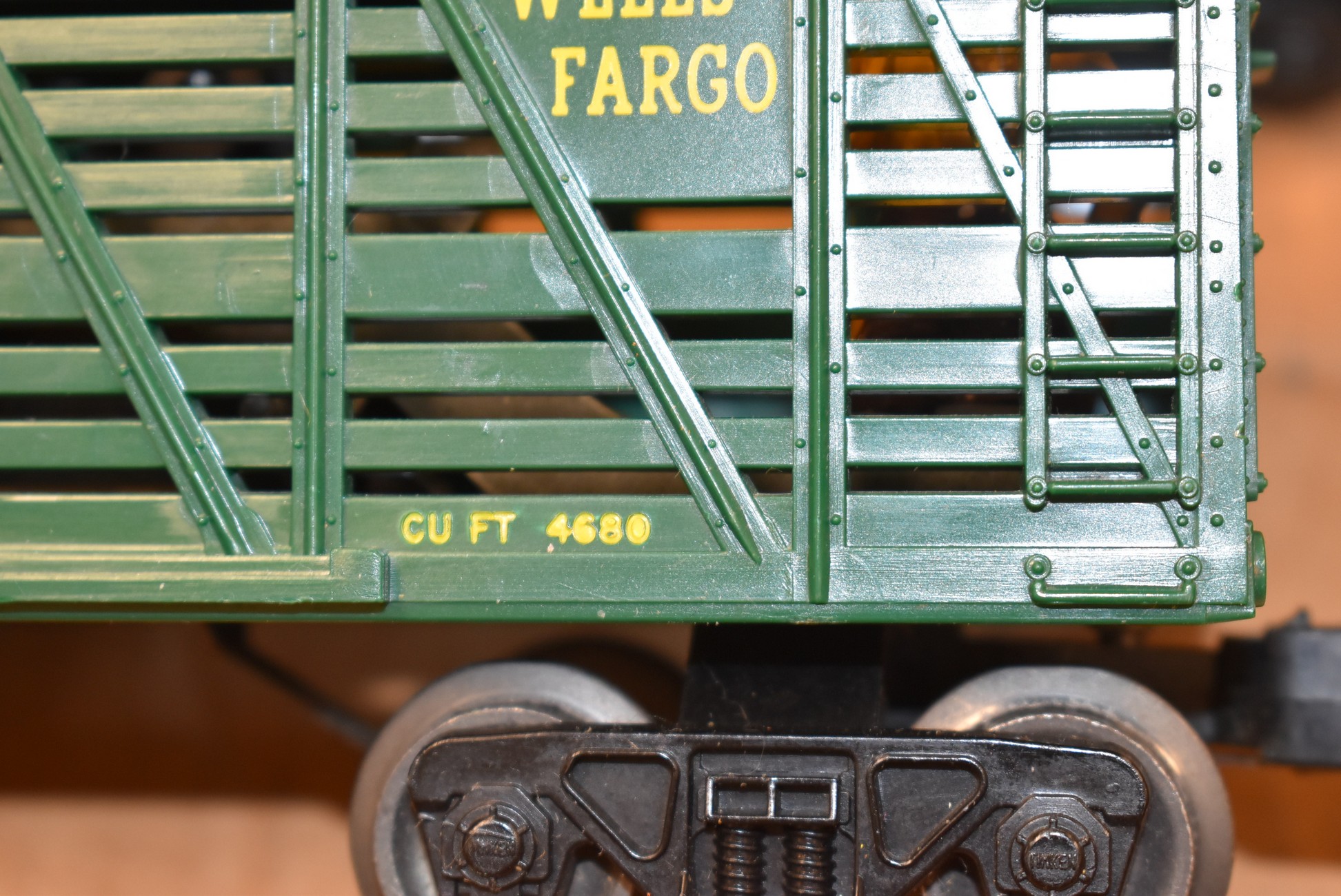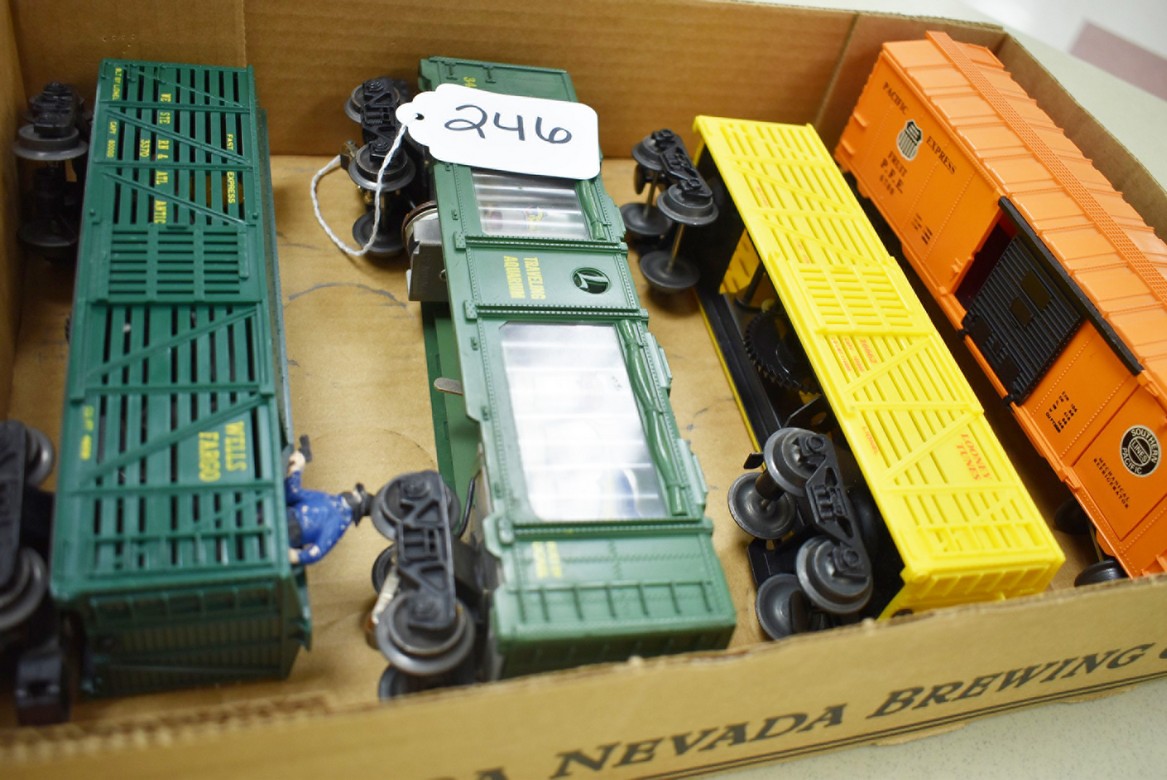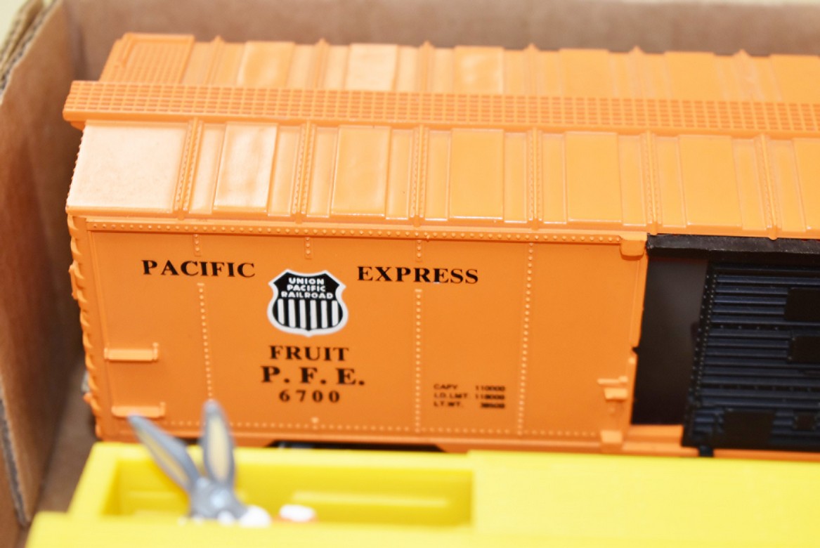 246. Lot of 4 Train Cars – Including Wells Fargo Western Atlantic 3370 “Sheriff and Outlaw” Car, Traveling Aquarium 3435, Looney Tunes 16662, and Pacific Express Fruit P.F.E. 6700 – No Boxes