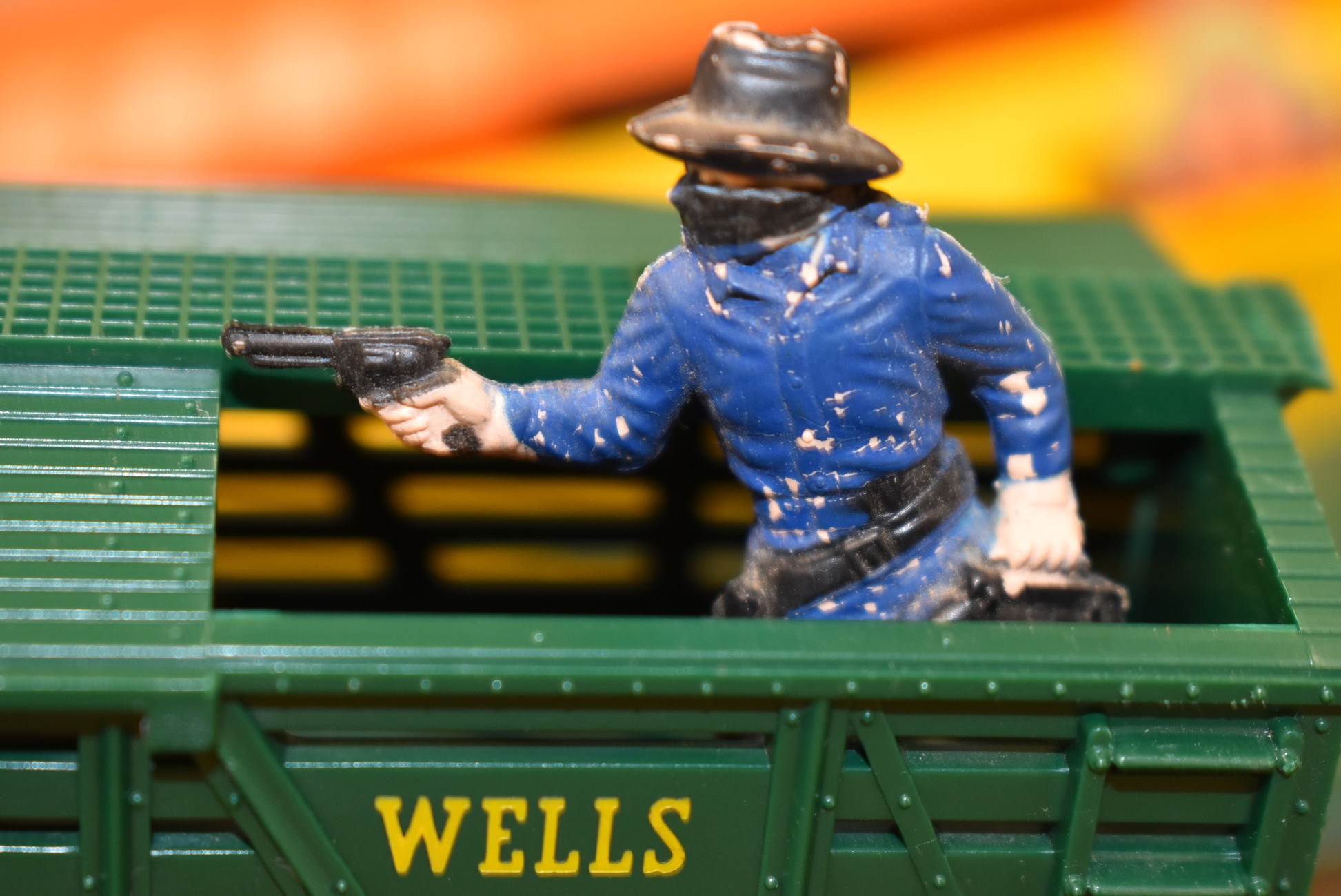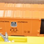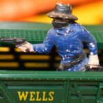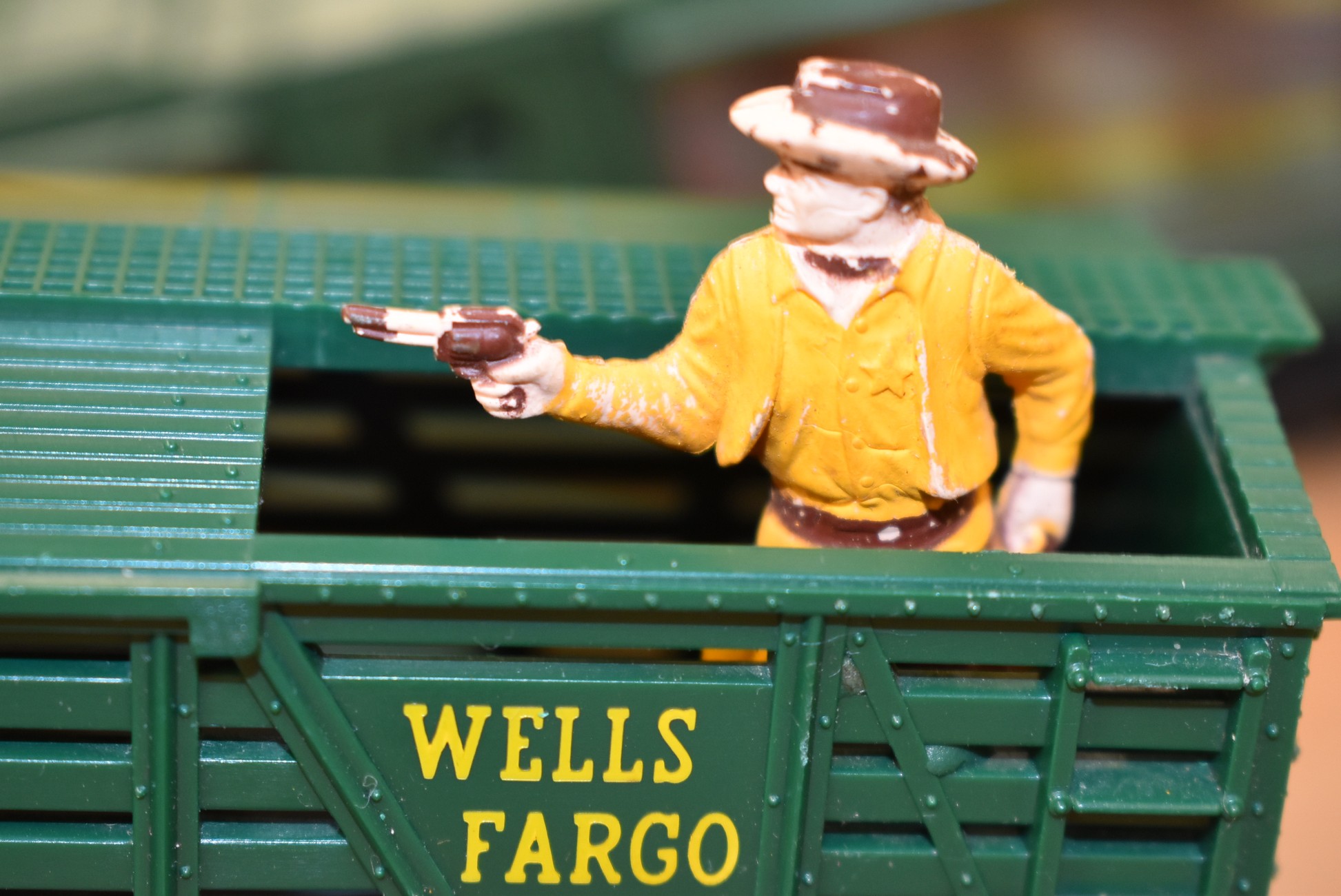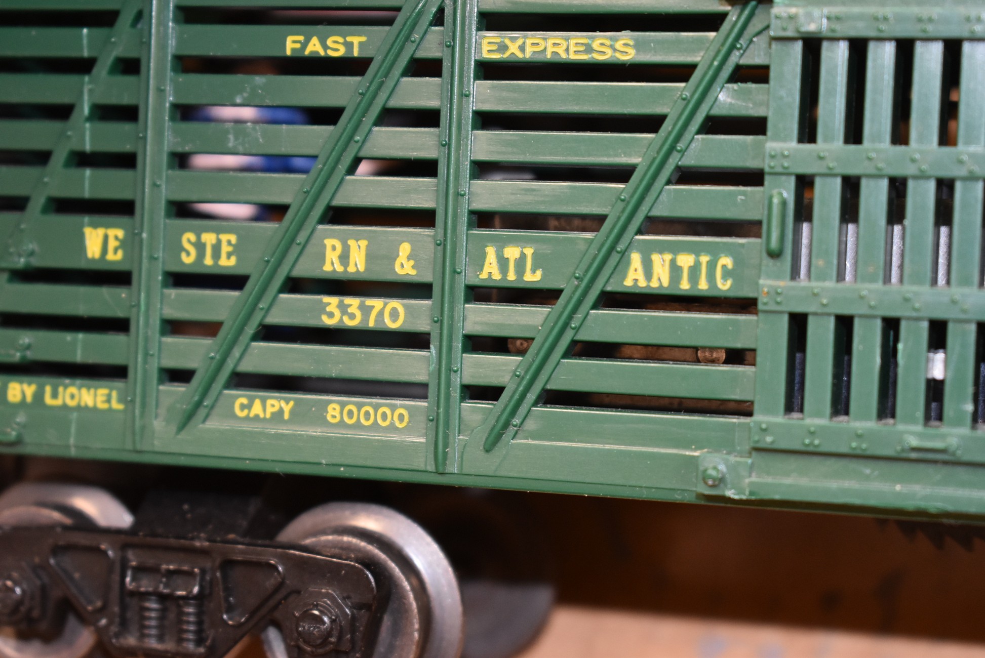 246. Lot of 4 Train Cars – Including Wells Fargo Western Atlantic 3370 “Sheriff and Outlaw” Car, Traveling Aquarium 3435, Looney Tunes 16662, and Pacific Express Fruit P.F.E. 6700 – No Boxes