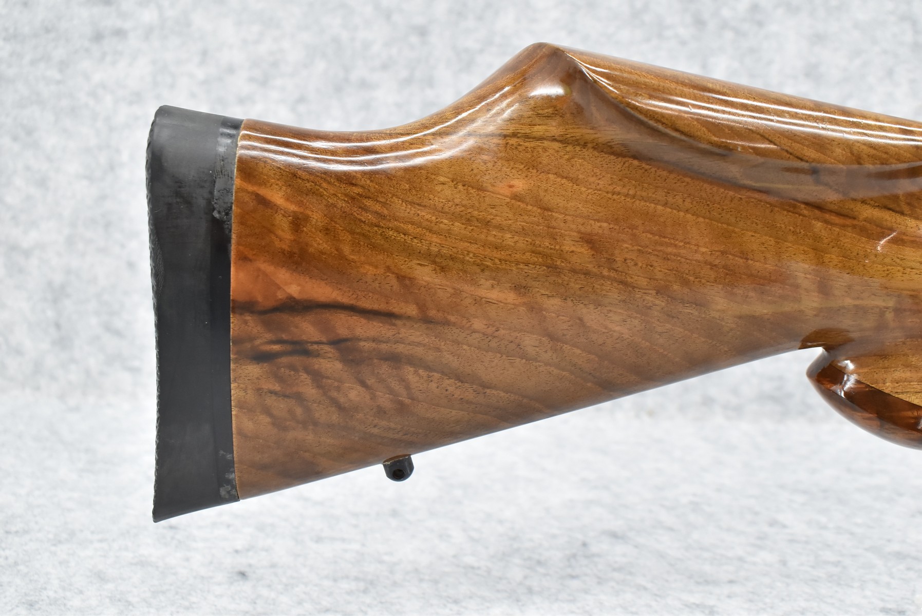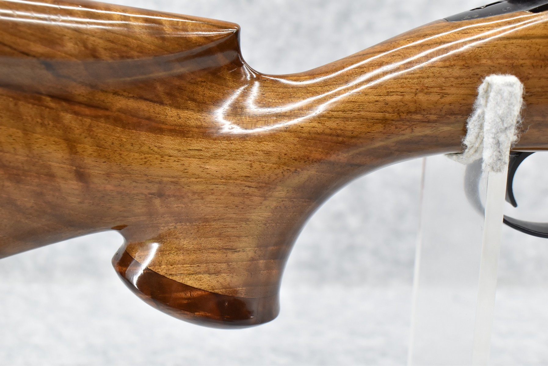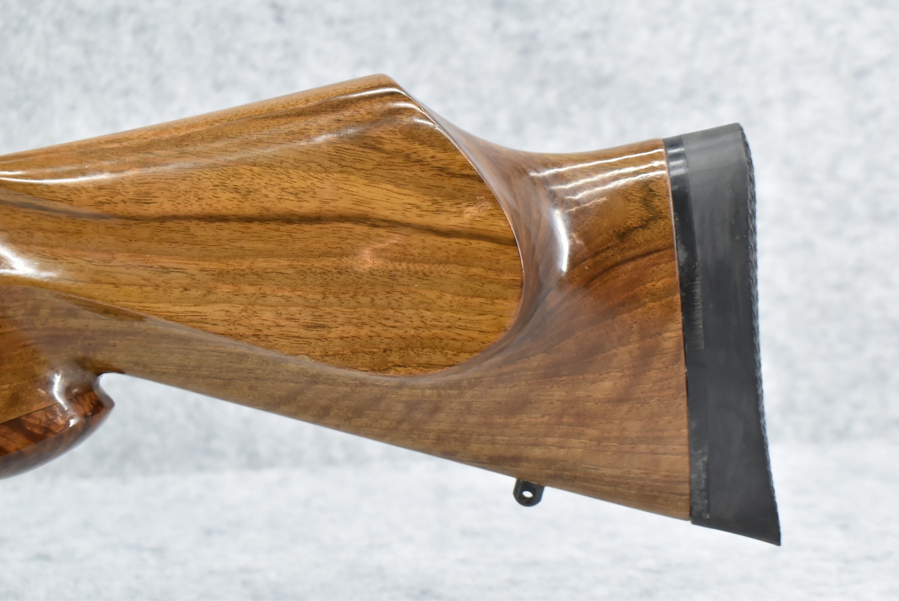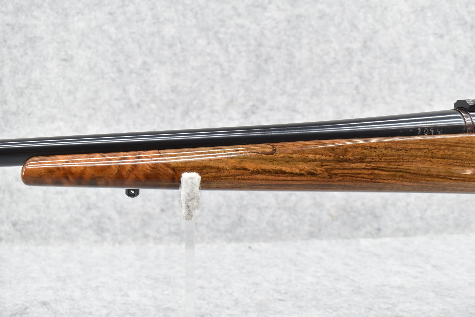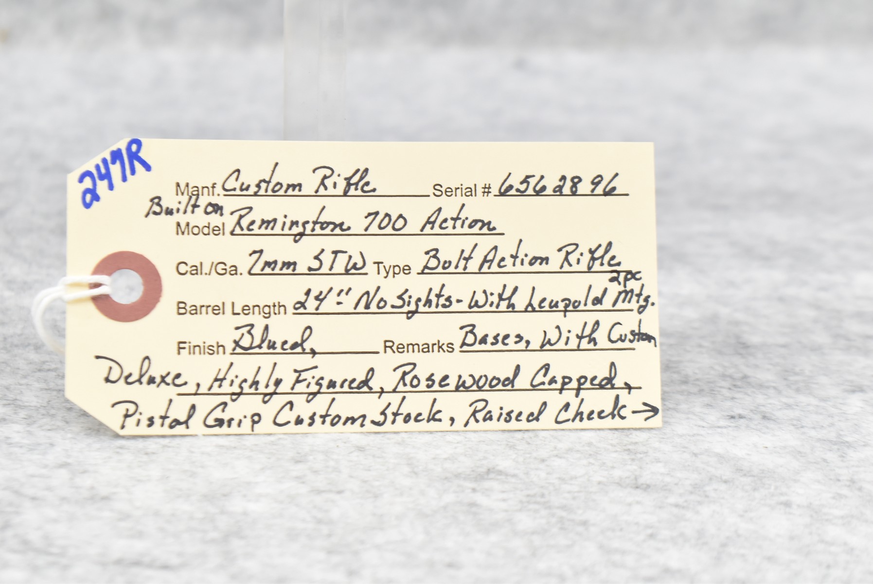 247R. Custom Rifle – Built on Remington Mod. 700 Action – 7mm STW Cal. Bolt Action Rifle – w/24” Barrel (No Sights) – Blued Finish – w/Custom Deluxe Highly Figured Rosewood Capped Pistol Grip Custom Stock w/Raised Cheek Piece w/Pachmayr Butt Pad – w/Leupold 2pc. Mounting Bases