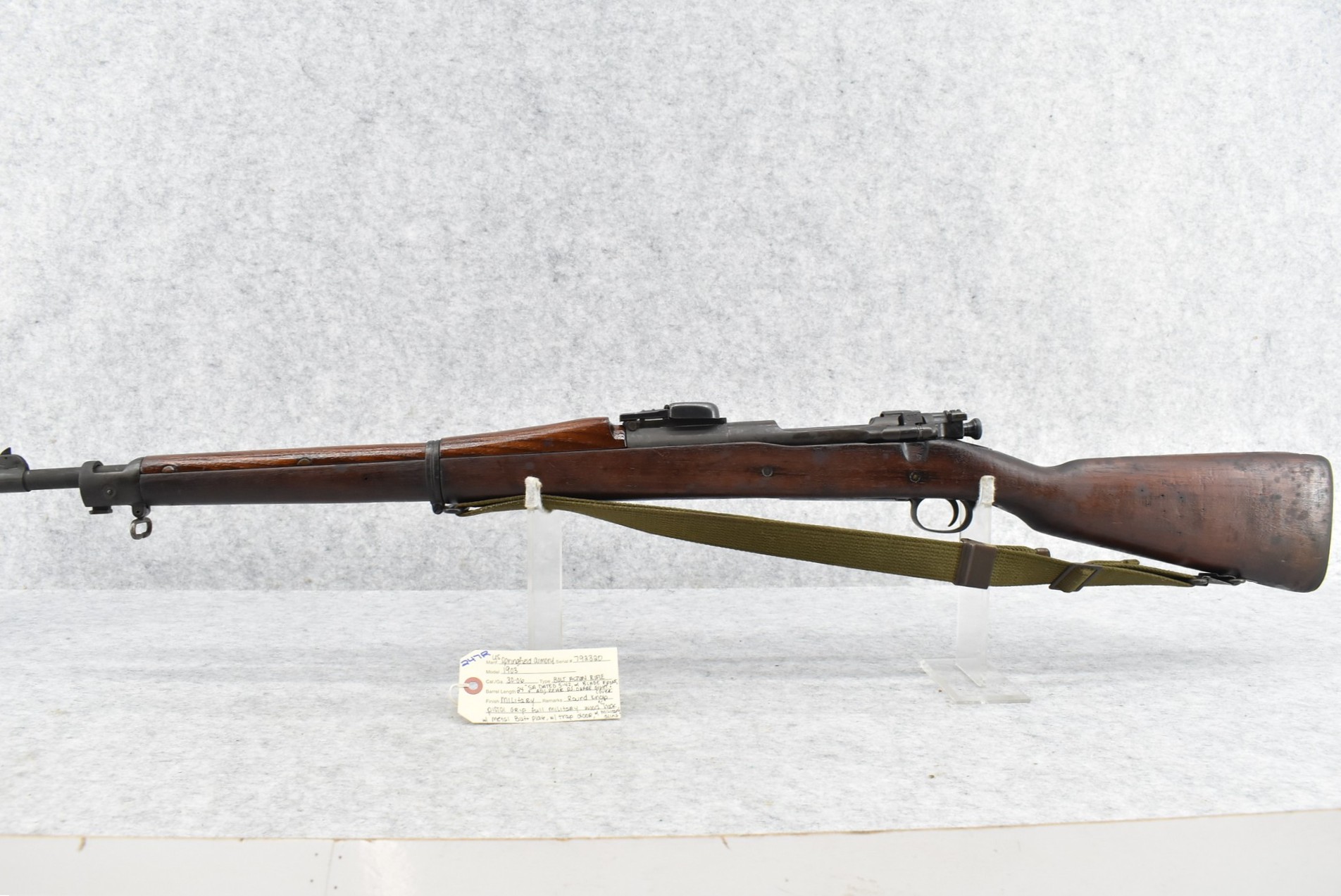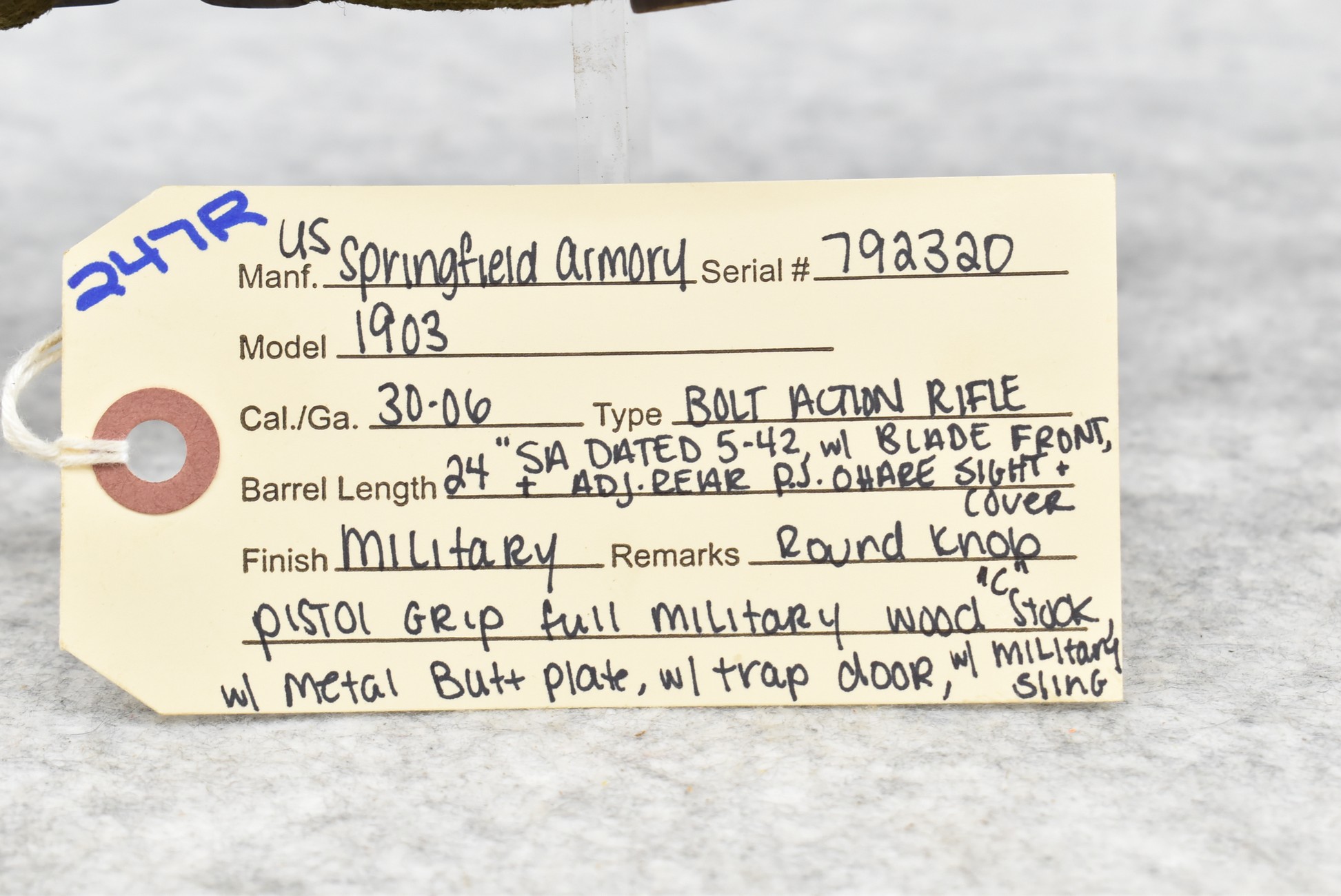 247R. U.S. Springfield Armory – Mod. 1903 – 30-06 Cal. Bolt Action Rifle – w/24” SA Marked 5-42 Dated Barrel w/Blade Front and Adjustable Rear Sight w/P.J. Ohare Cover – Military Finish – w/Round Knob Pistol Grip Full Wood Military Stock w/Butt Plate – w/Trapdoor – w/Military Sling