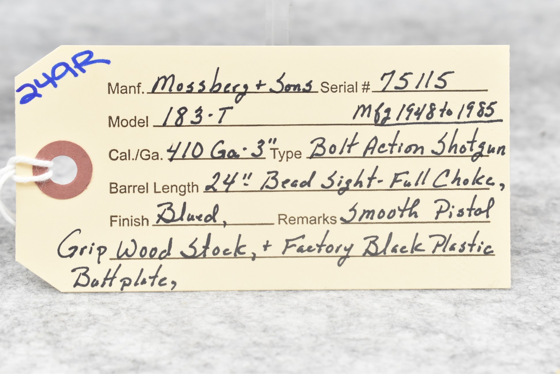 249R. Mossberg – Mod. 183-T – 410ga. 3” Bolt Action Shotgun – w/24” Full Choke Barrel w/Bead Sight – Blued Finish – w/Smooth Pistol Grip Wood Stock w/Factory Butt Plate
