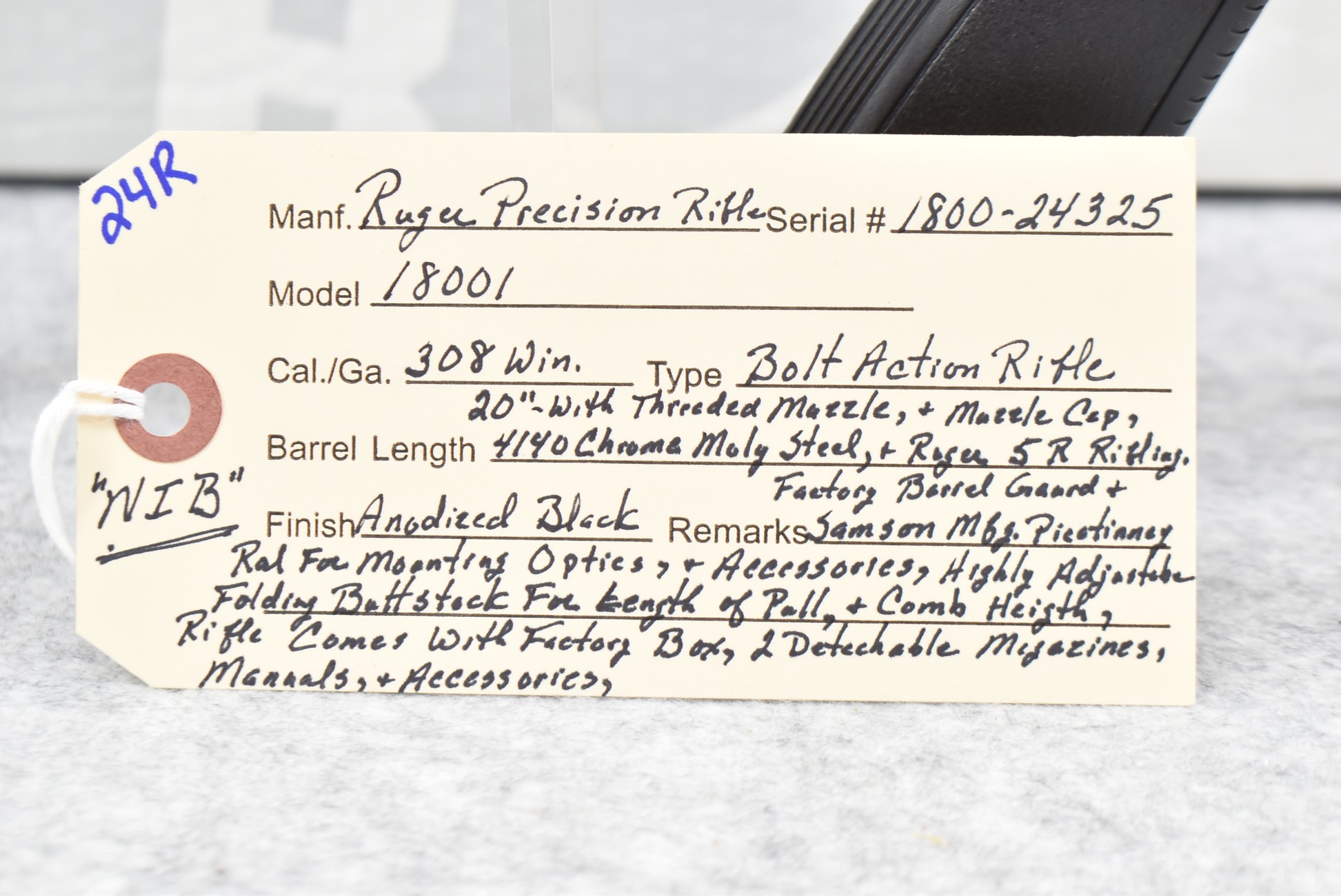 24R. Ruger – Mod. Precision Rifle – 308 Win. Cal. Bolt Action Rifle – w/20” 4140 Chrome Moly Steel, Ruger 5R Rifling Barrel w/Threaded Muzzle & Muzzle Cap w/Factory Vented Barrel Guard – Anodized Black Finish – w/Highly Adjustable Folding Butt Stock for Length of Pull & Comb Height – w/Samson Mfg. Picatinny Rail for Mounting Optics & Accessories – New w/Factory Box, 2 Detachable Magazines, Manuals & Accessories
