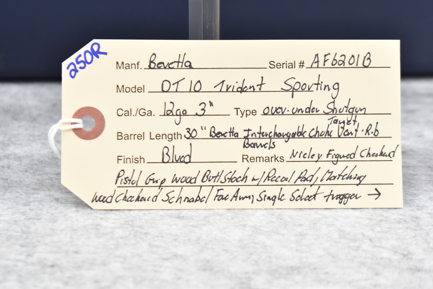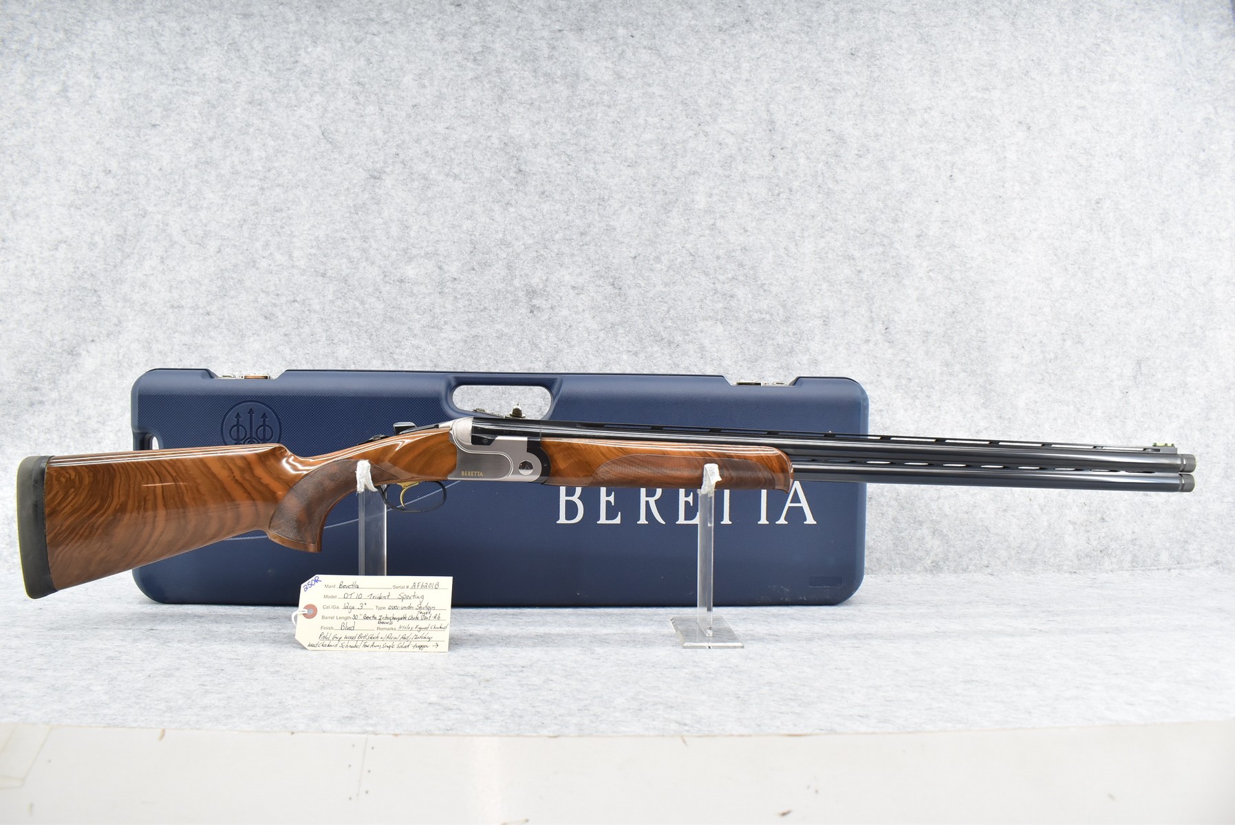 250R.     Beretta – Mod. DT 10 Trident Sporting – 12ga. 3” Over-Under Shotgun – w/30” Beretta Interchangeable Choked, Target Vent-Rib Barrels – Blued Finish – w/Nicely Figured Checkered Pistol Grip Wood Butt Stock w/Recoil Pad & Matching Wood Checkered Schnabel Forearm – w/Single Select Trigger – w/Take Down Hard Case w/2 Seminole Custom Chokes