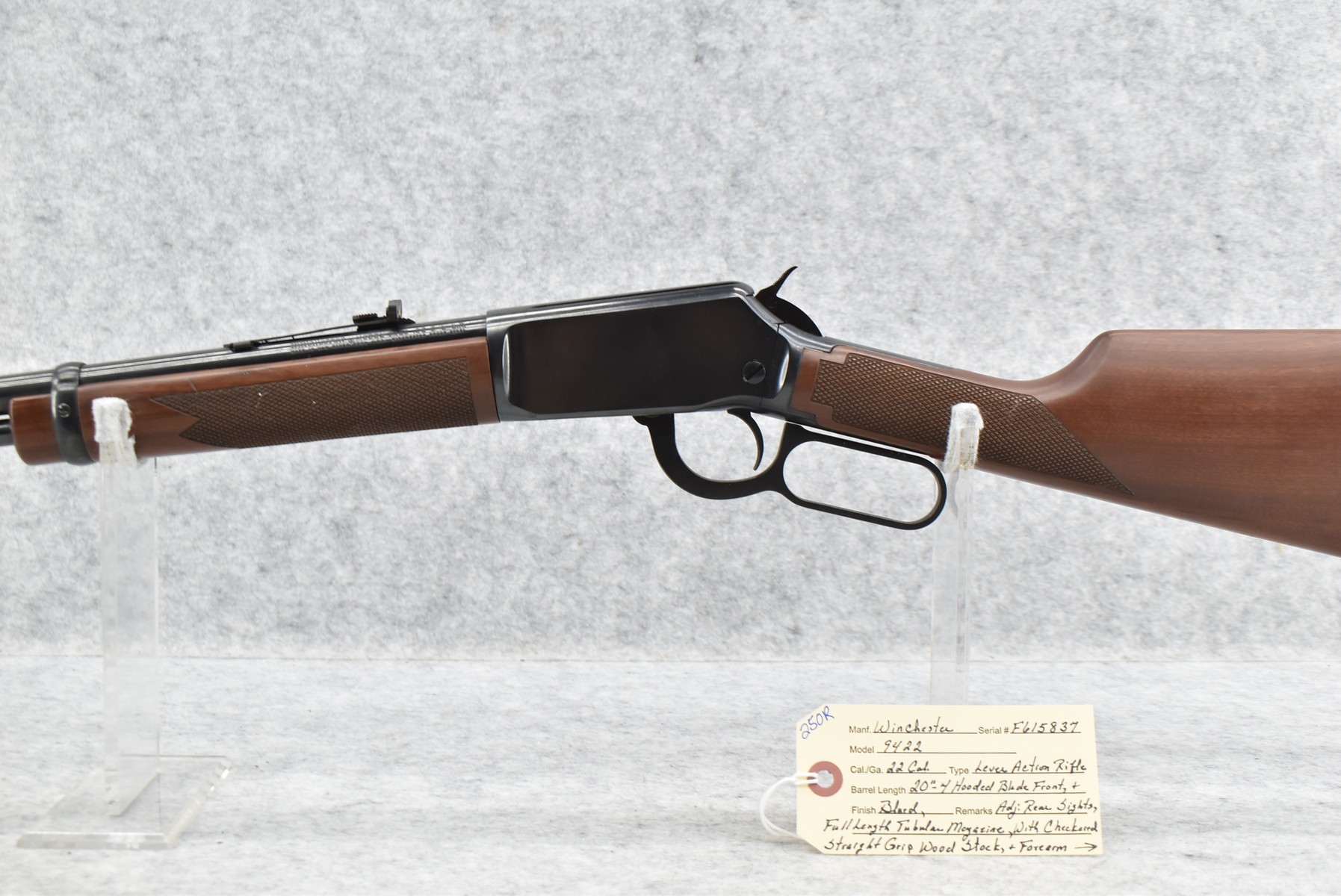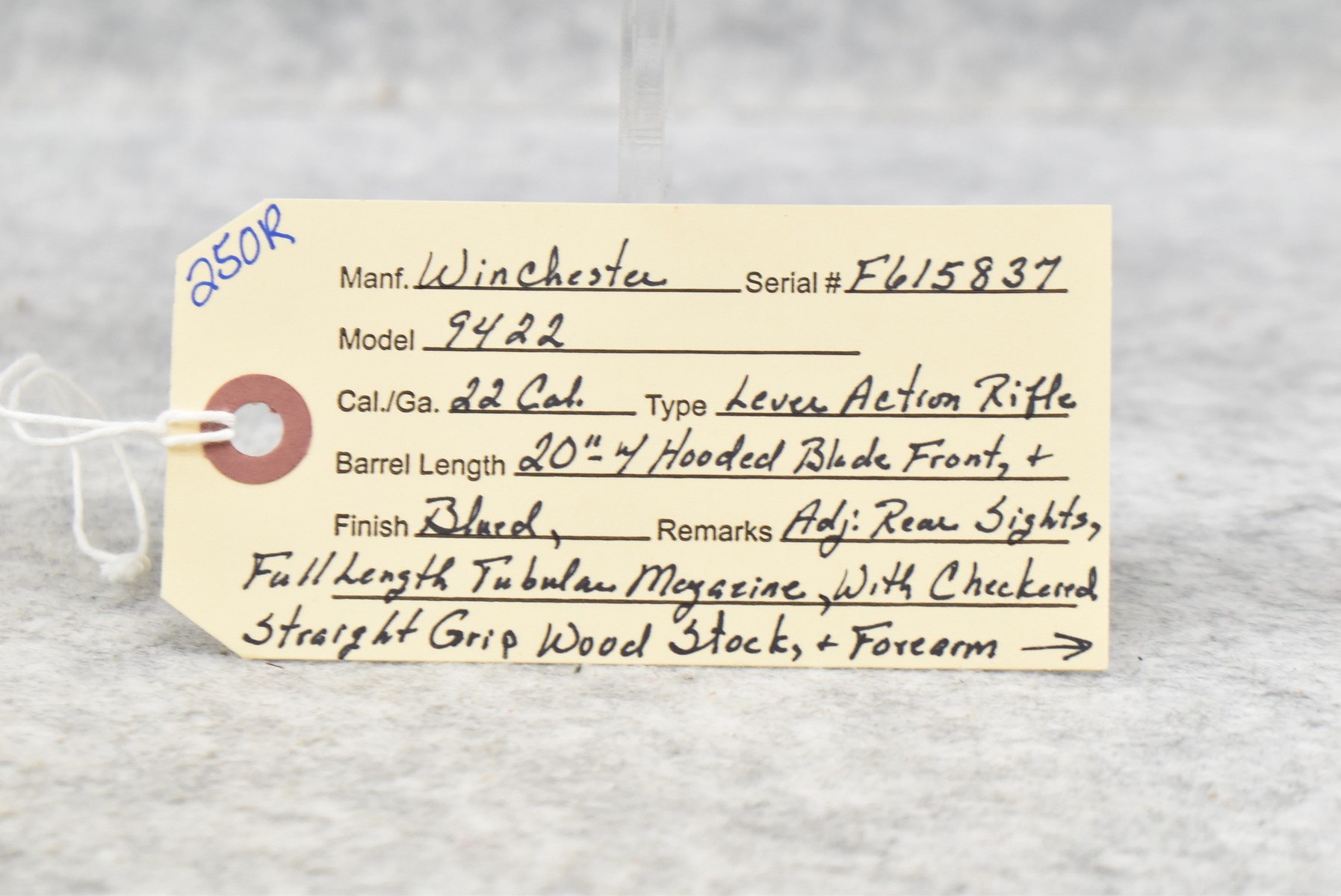 250R. Winchester – Mod. 9422 – 22 Cal. Lever Action Rifle – w/20” Barrel w/Hooded Blade Front & Adj. Rear Sights w/Full Length Tubular Magazine – Blued Finish – w/Checkered Straight Grip Wood Stocks w/Factory Butt Plate