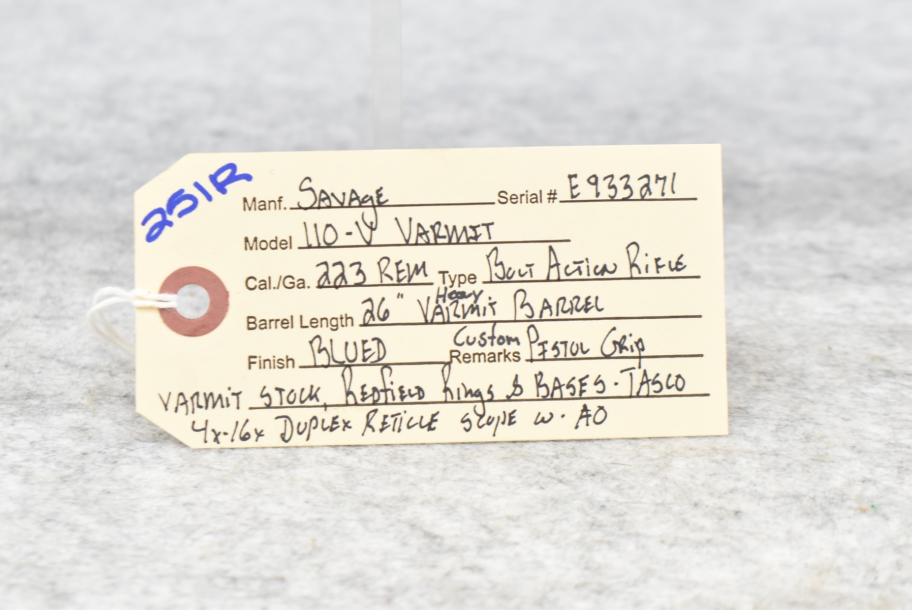 251R. Savage – Mod. 110-V Varmint – 223 Rem. Cal. Bolt Action Rifle – w/26” Heavy Varmint Barrel – Blued Finish – w/Custom Pistol Grip Varmint Stock – w/Redfield Rings & Bases – w/Tasco 4x-16x Duplex Reticle Scope w/Front AO