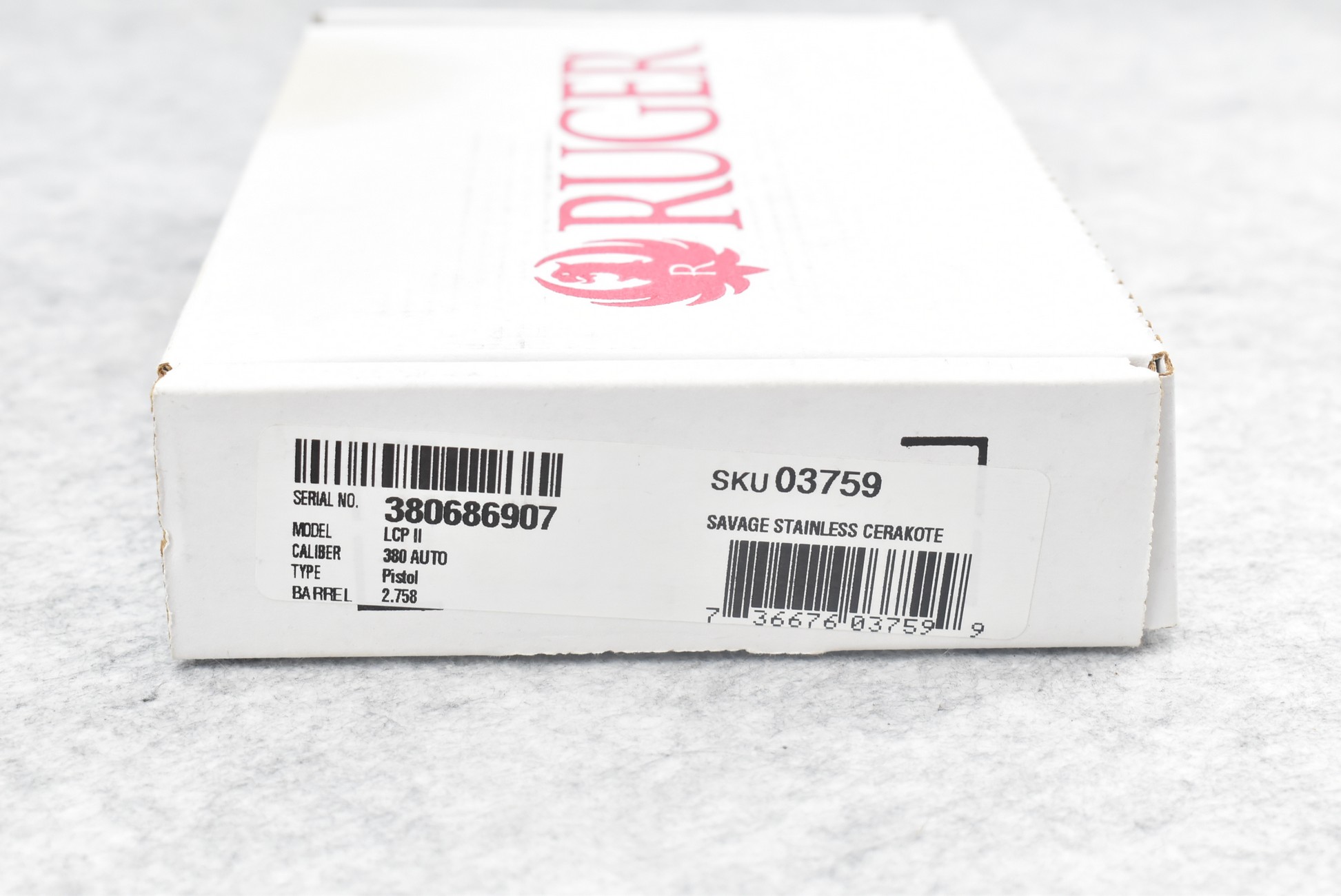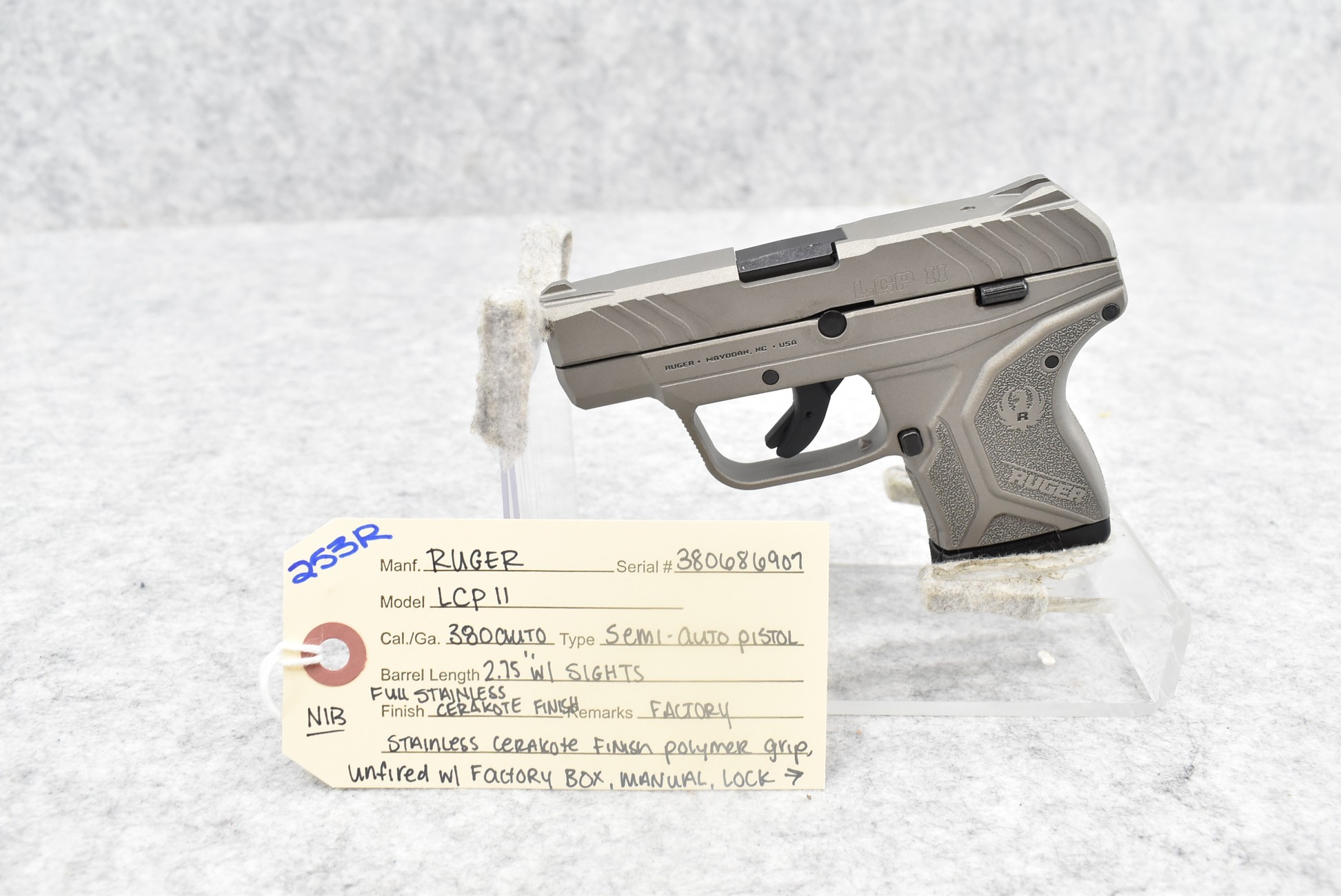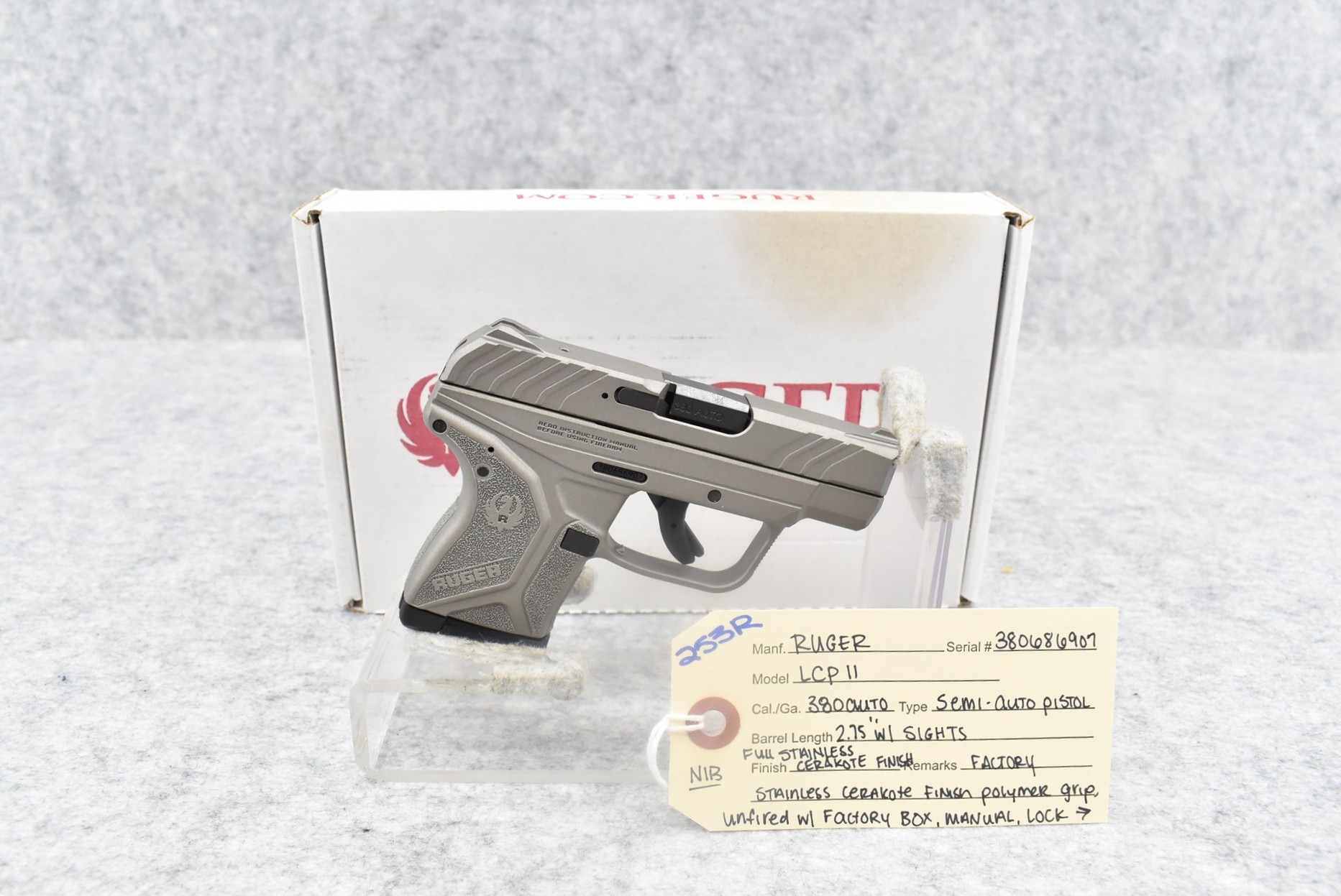 253R. Ruger – Mod. LCP 11 – 380 Auto Cal. Semi-Auto Pistol – w/2.75” Barrel w/Sights – Full Stainless Cerakote Finish – w/Factory Stainless Cerakote Finish Polymer Grip – Unfired w/Factory Box, Manual, Pocket Holster & Factory 6Rd Mag