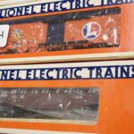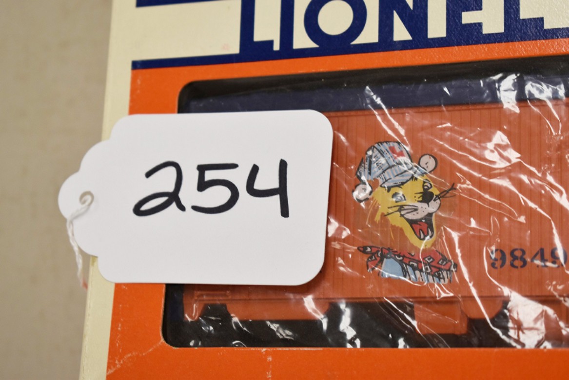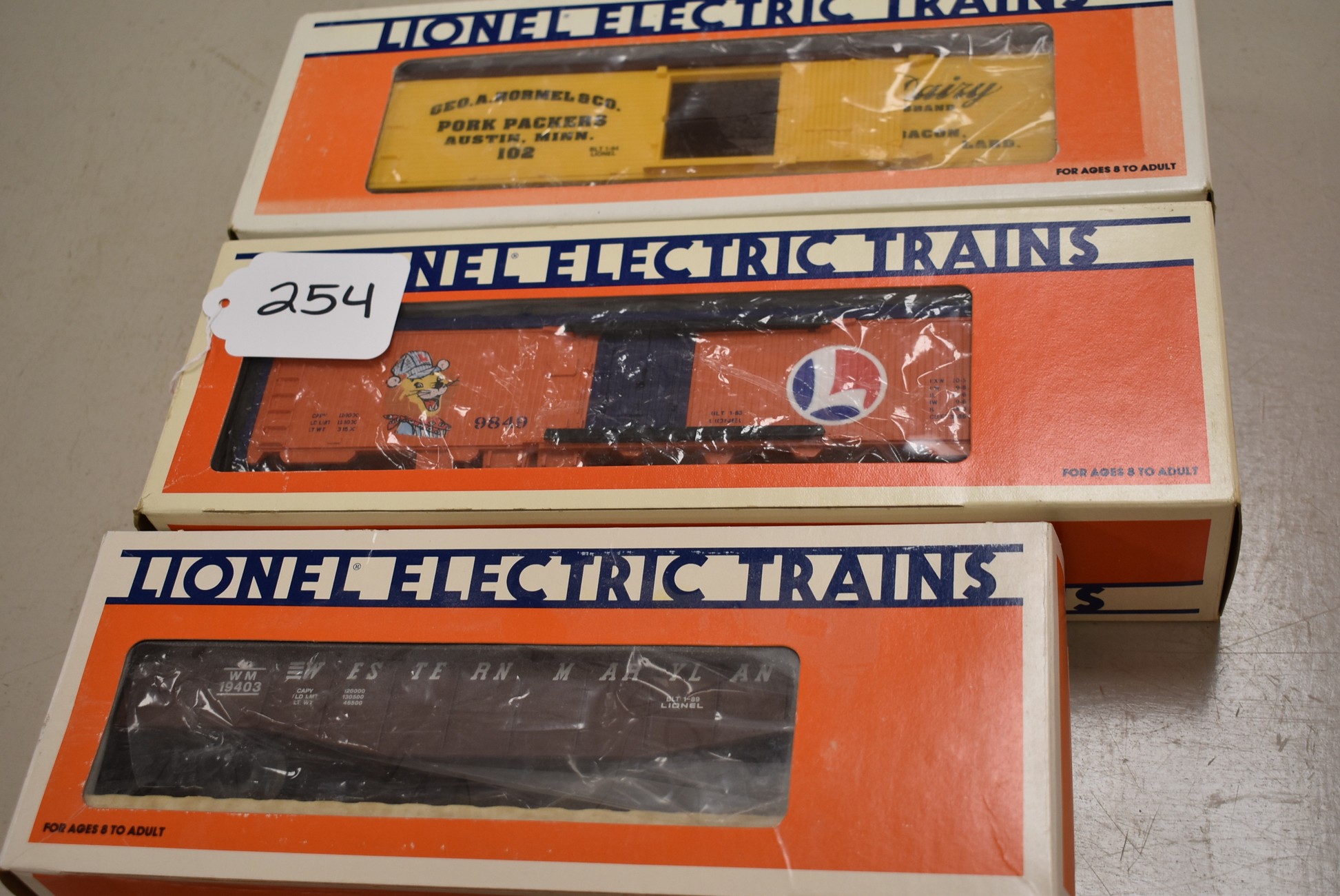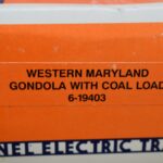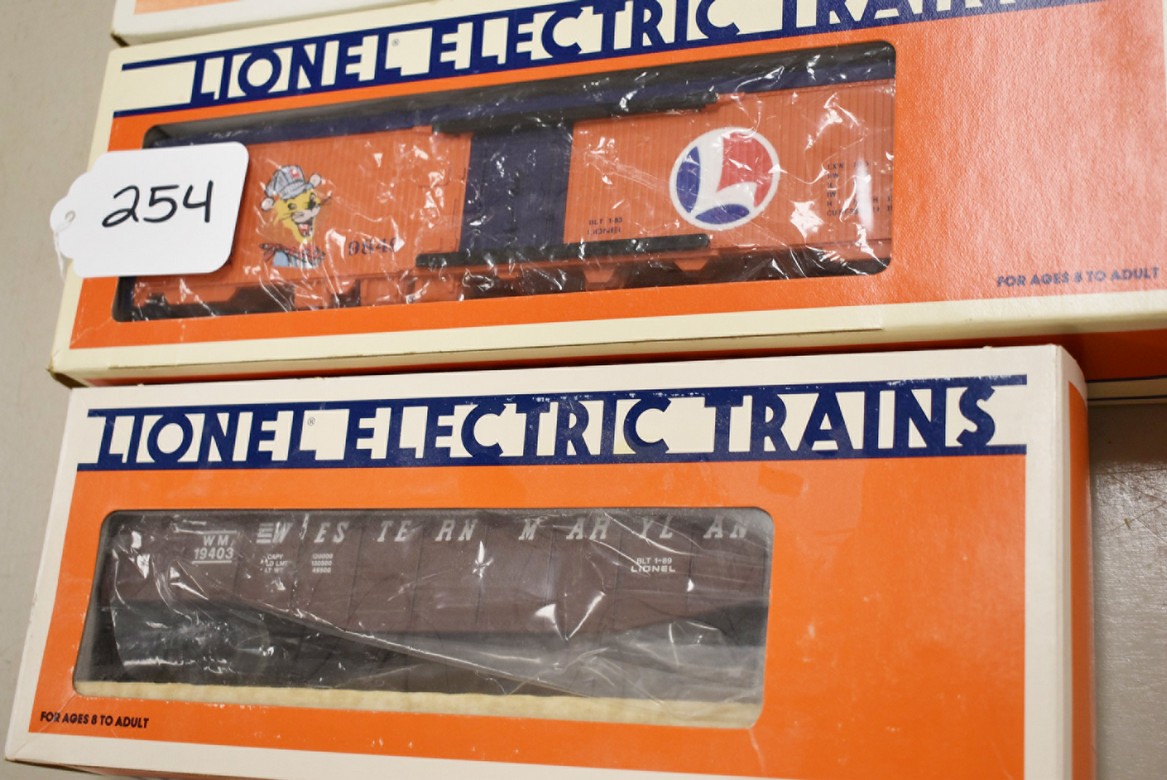 254. Lot of 3 Lionel Train Cars – Including Western Maryland Gondola with Coal Load 6-19403, Lionel Billboard Reefer 70-9849-212, and Homer Reefer 6-19538 – All w/Boxes