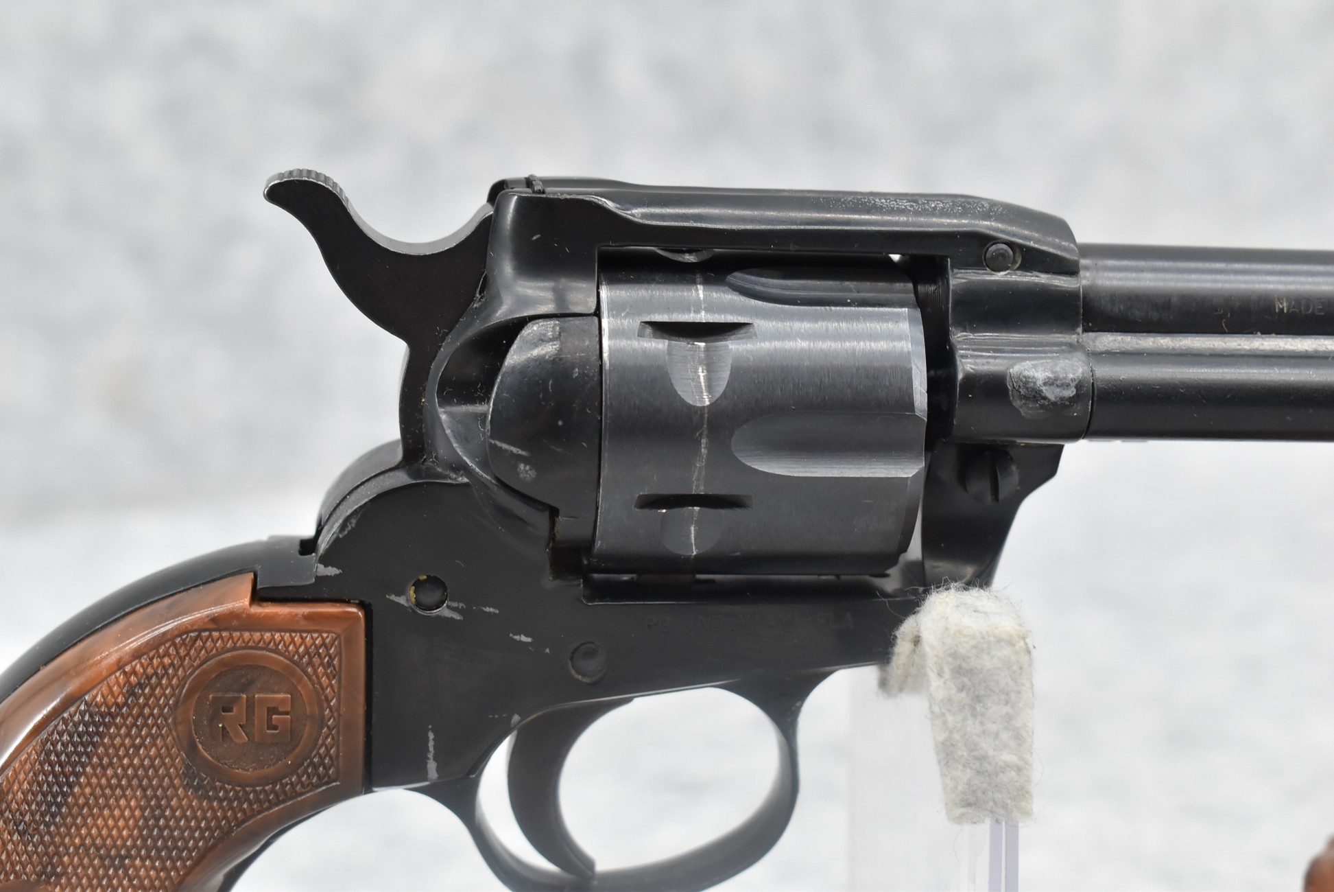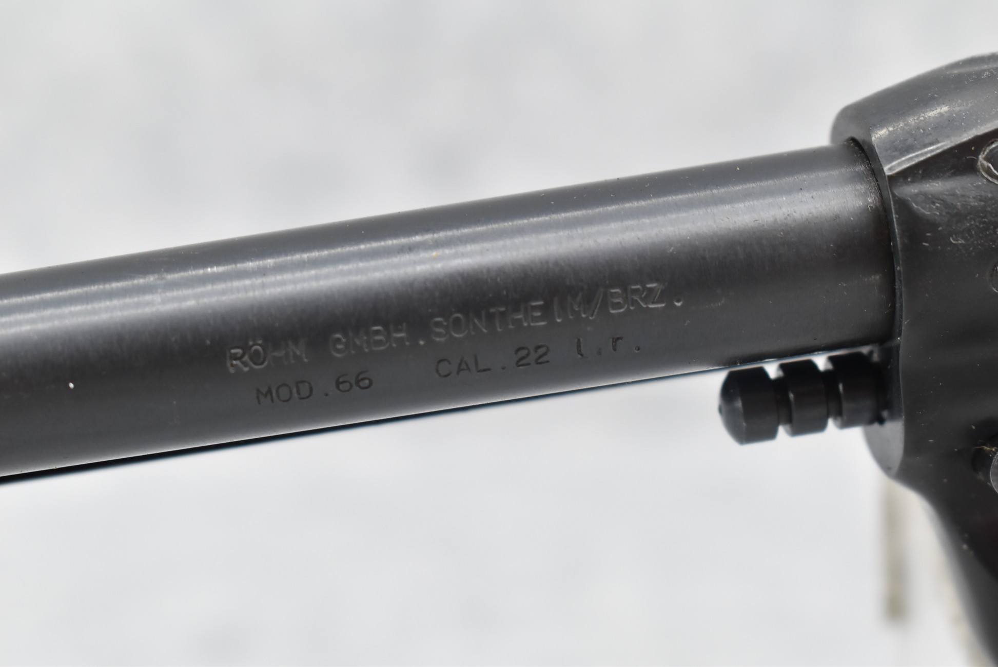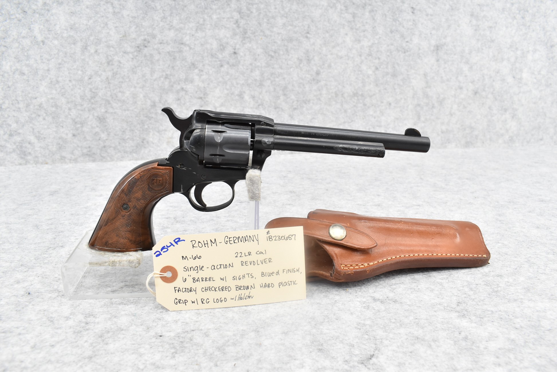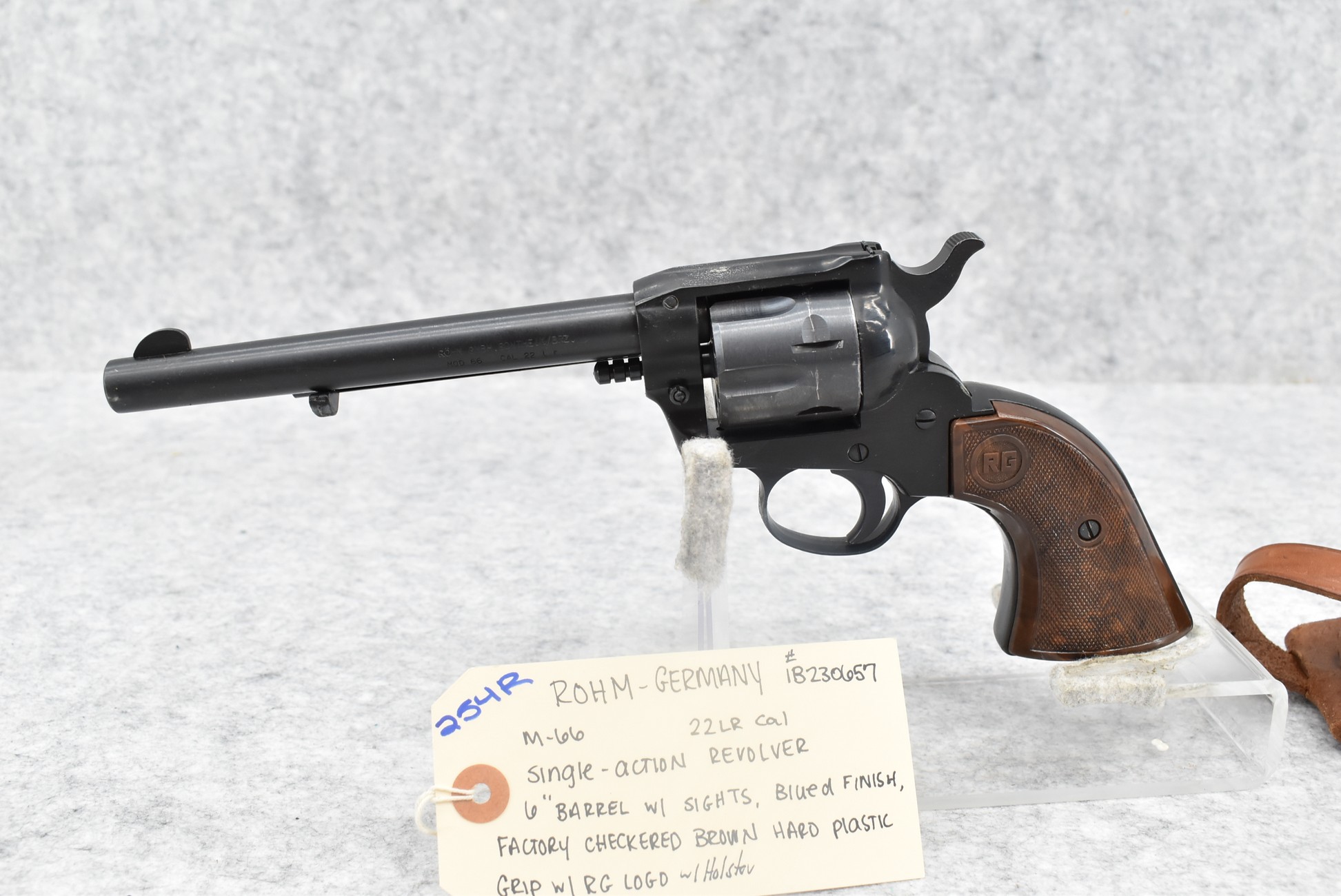 254R. Rohm (Germany) – Mod. 66 – 22LR Cal. Single Action Revolver – w/6” Barrel w/Sights – Blued Finish – w/Factory Checkered Brown Hard Plastic Grip w/RG Logo – w/Holster