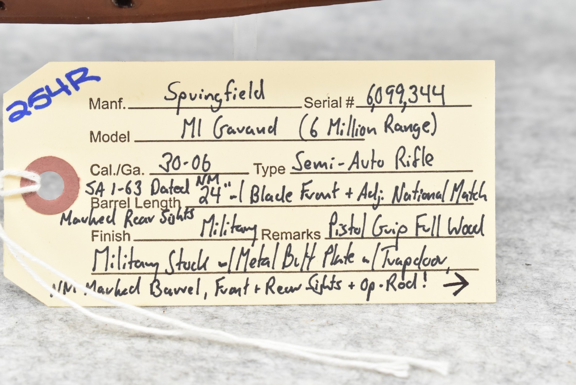 254R. Springfield – Mod. M1 Garand (6-Million Range) – 30-06 Cal. Semi-Auto Rifle – w/24” SA and NM Marked 1-63 Dated Barrel w/Blade Front and Adjustable National Match Marked Rear Sights – Military Finish – w/Pistol Grip Full Wood Military Stock w/Butt Plate – w/National Match Marked Barrel, Front and Rear Sights, and OP Rod! – w/Trapdoor – Trigger Group will Not Set in Properly