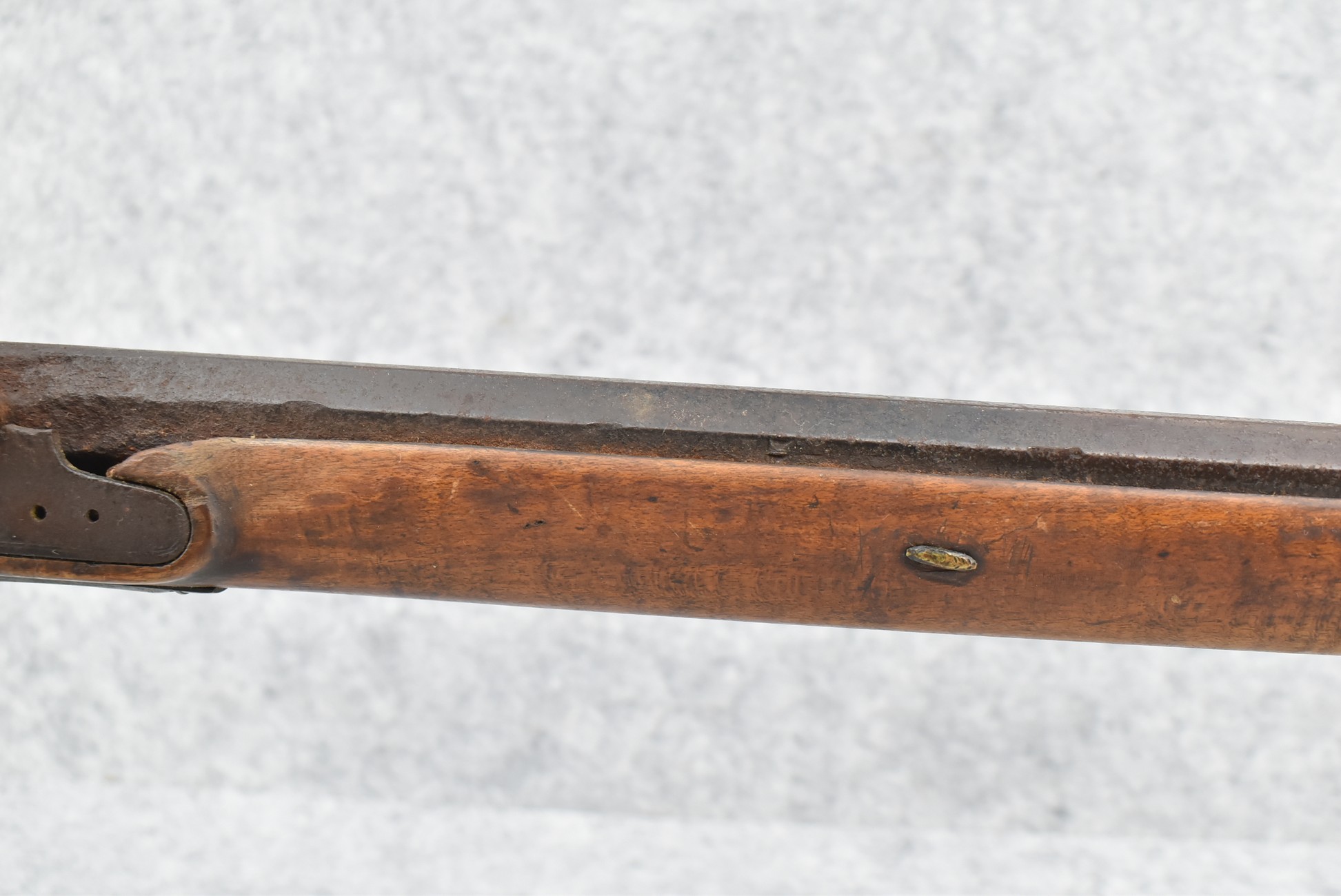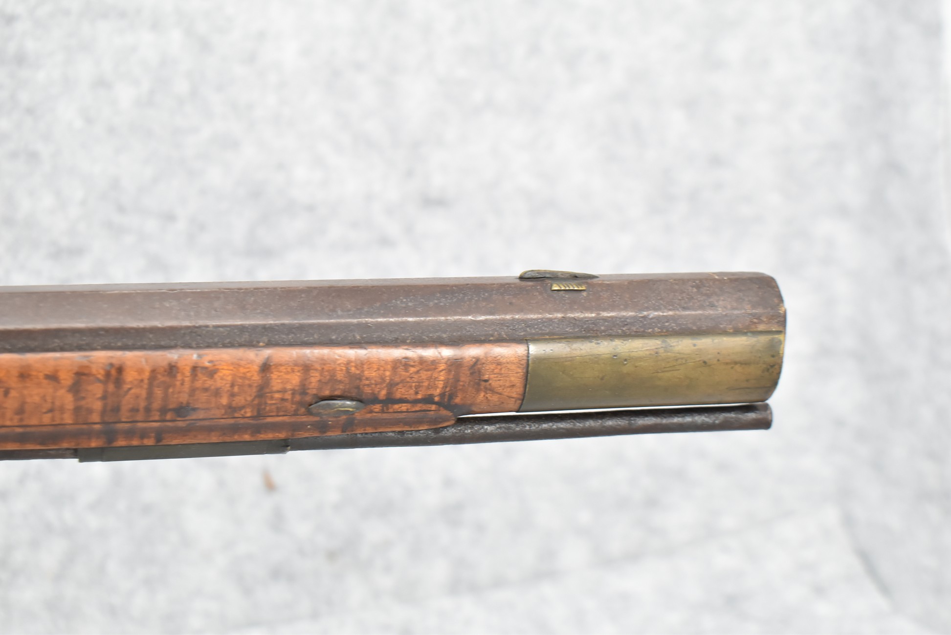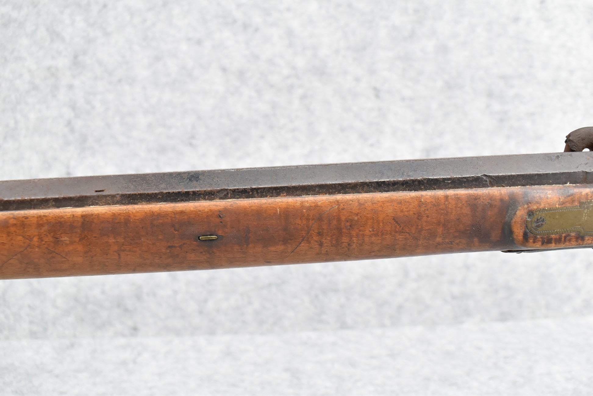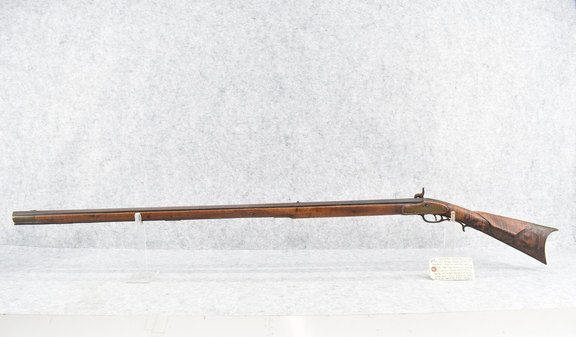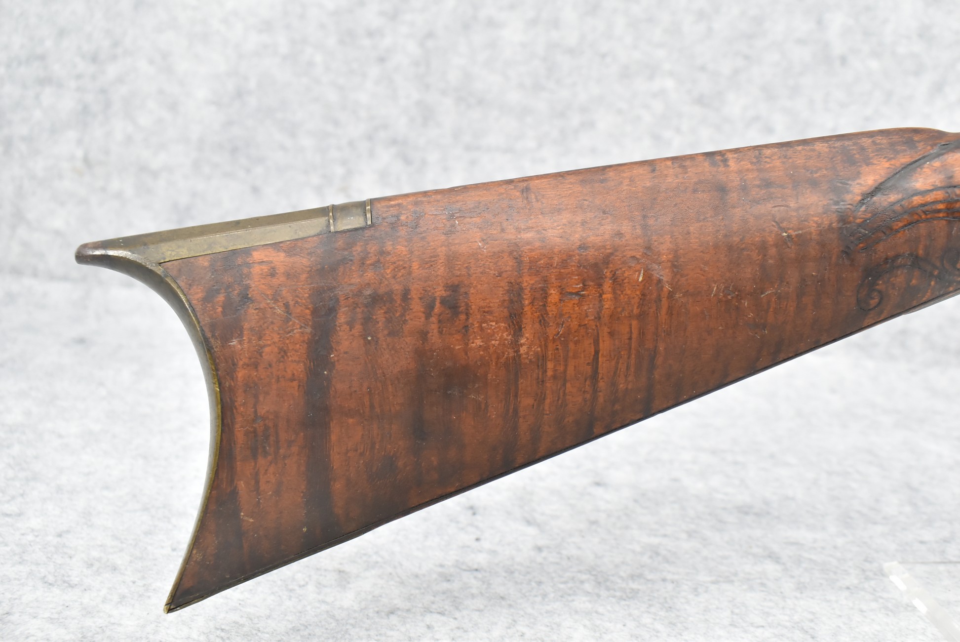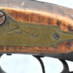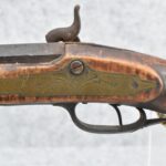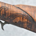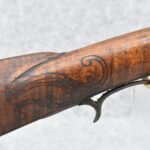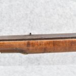255. Signed N. Rowe (Nathaniel Rowe of Emmitsburg, MD) – 45 Cal. Percussion Long Rifle – w/43” Octagon Barrel w/Blade Front & Notch Rear Sights – Brown Finish – w/Straight Grip Full Wood Stock w/Crescent Metal Butt Plate & Brass Mountings – w/Light Carving on Both Sides of the Butt Stock – “N. Rowe” Signed in Script on Top Barrel Flat – w/Joseph Golcher Percussion Lock – Nathaniel Rowe Was Born August 8, 1821, He Moved to Emmitsburg at 16 & Apprenticed Under John Armstrong to Learn Gunsmithing – He Died April 10th, 1915