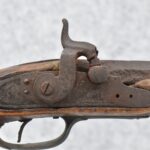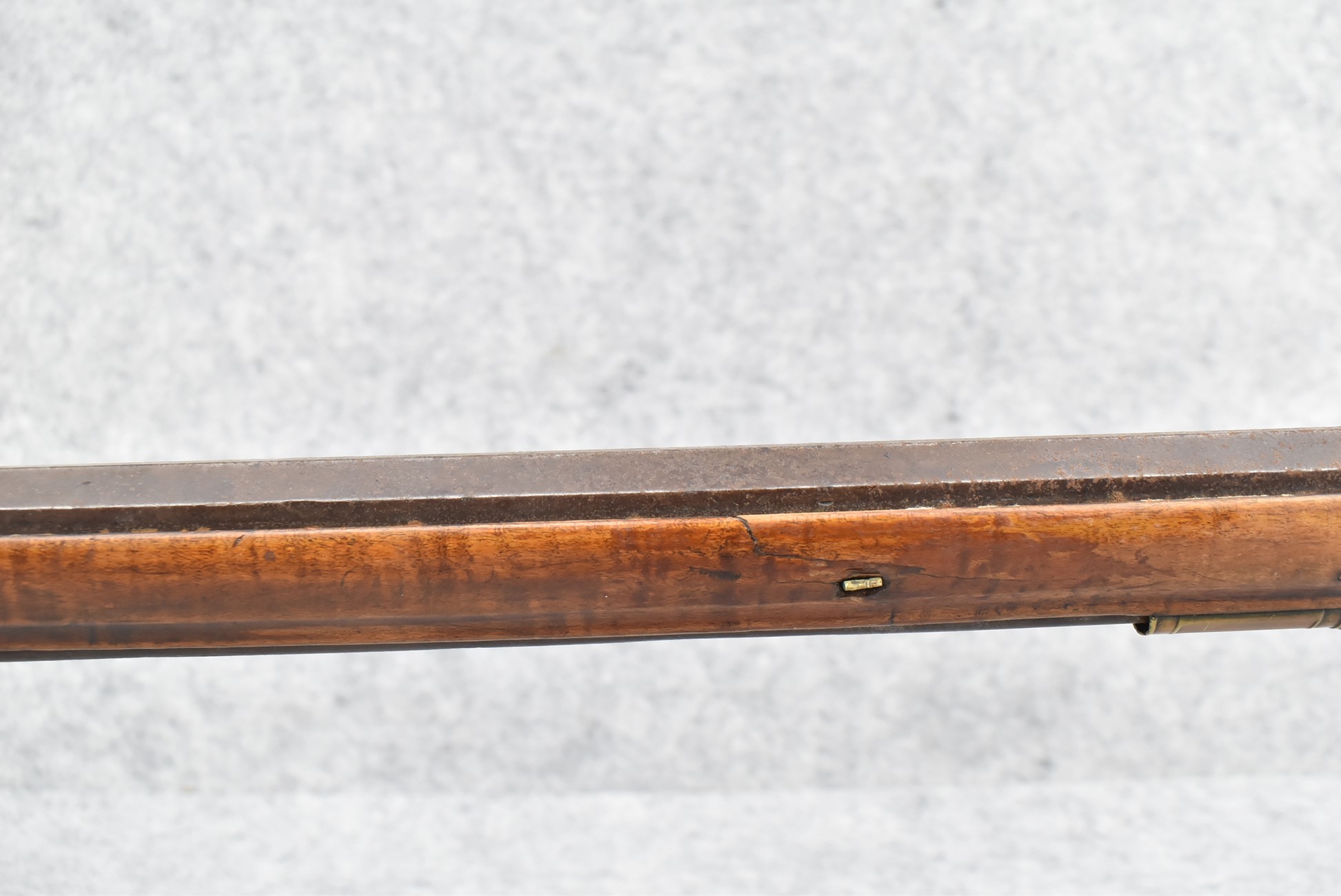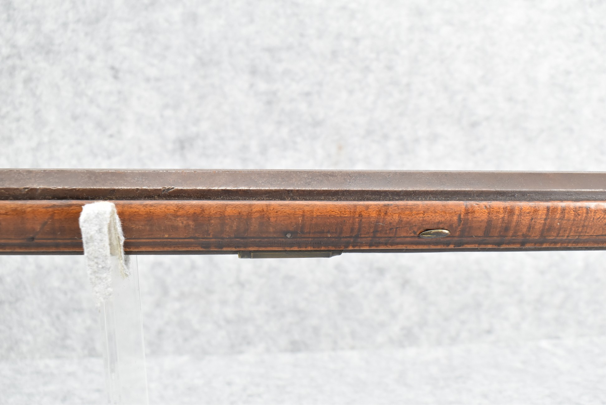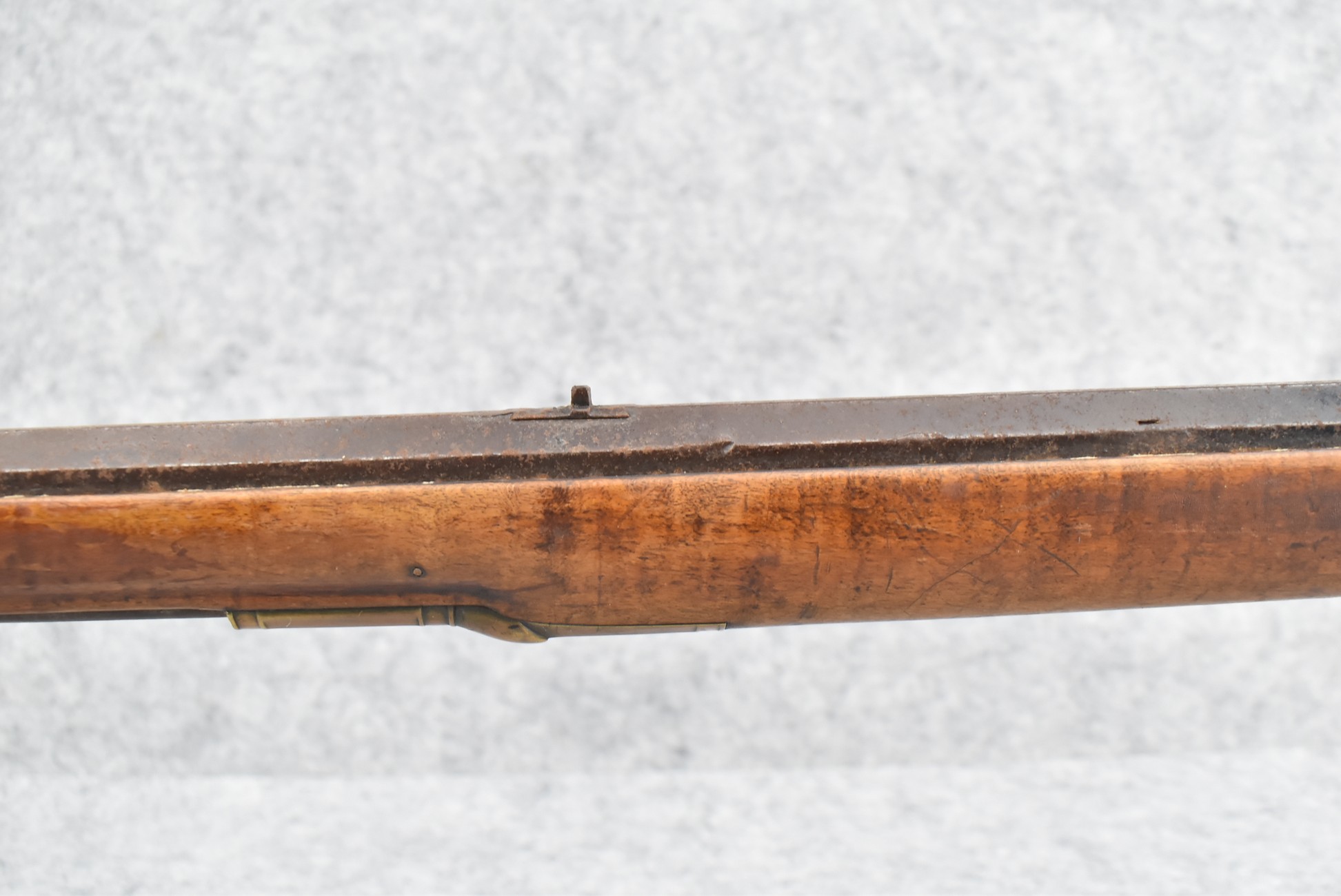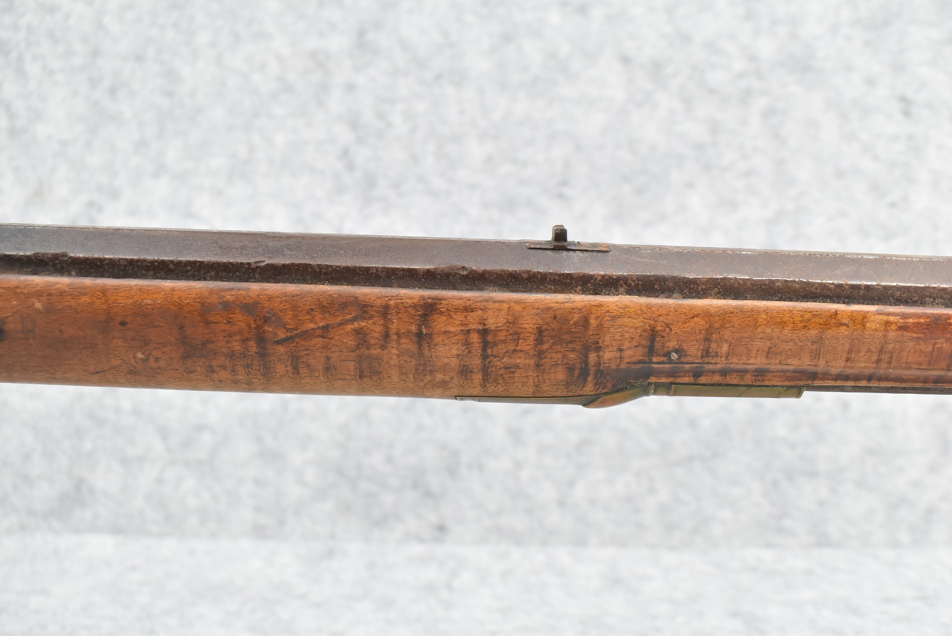 255. Signed N. Rowe (Nathaniel Rowe of Emmitsburg, MD) – 45 Cal. Percussion Long Rifle – w/43” Octagon Barrel w/Blade Front & Notch Rear Sights – Brown Finish – w/Straight Grip Full Wood Stock w/Crescent Metal Butt Plate & Brass Mountings – w/Light Carving on Both Sides of the Butt Stock – “N. Rowe” Signed in Script on Top Barrel Flat – w/Joseph Golcher Percussion Lock – Nathaniel Rowe Was Born August 8, 1821, He Moved to Emmitsburg at 16 & Apprenticed Under John Armstrong to Learn Gunsmithing – He Died April 10th, 1915