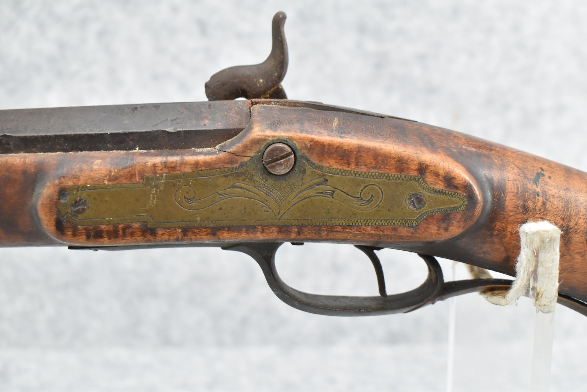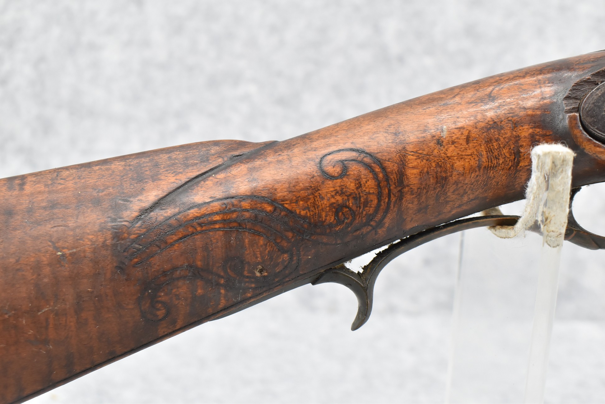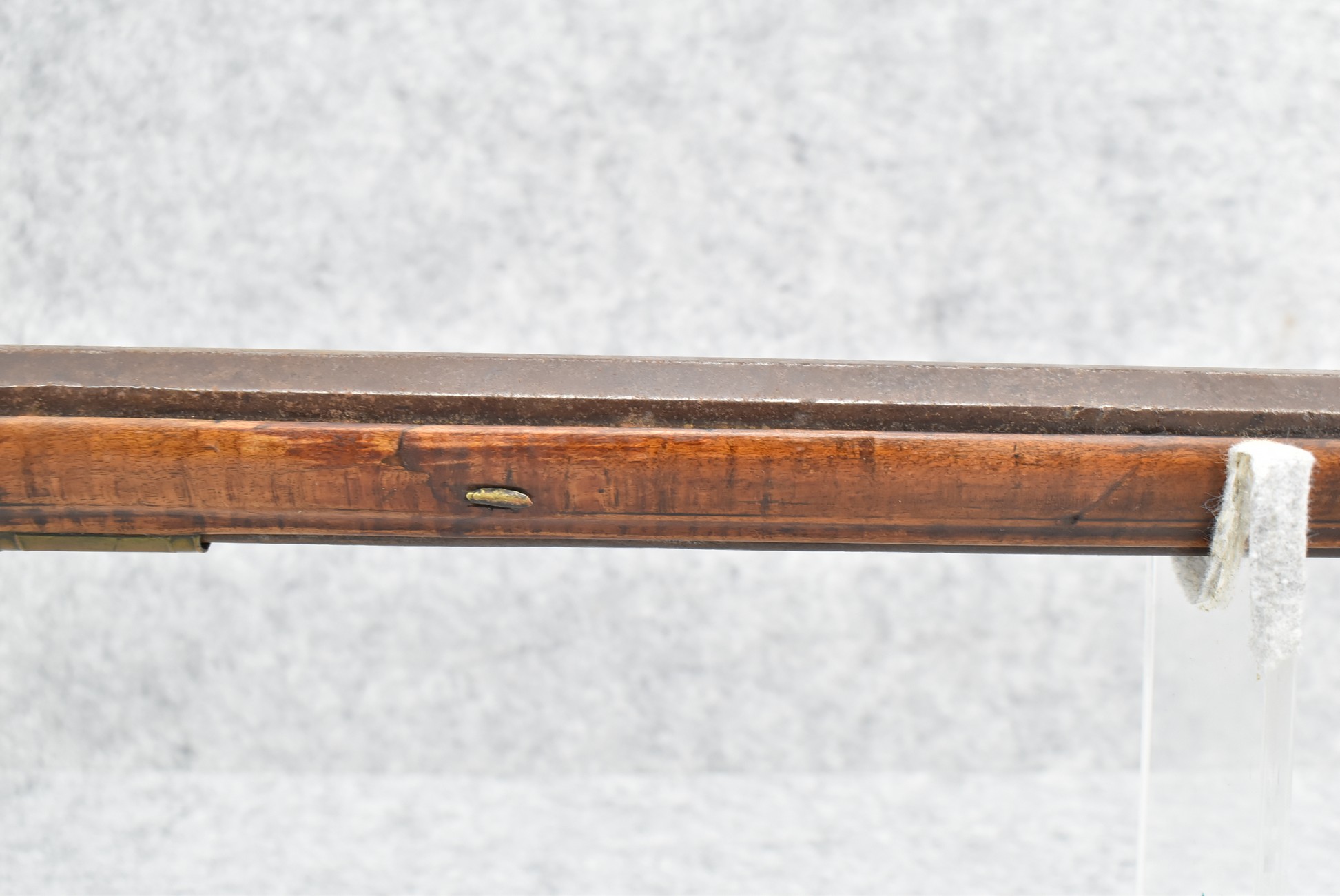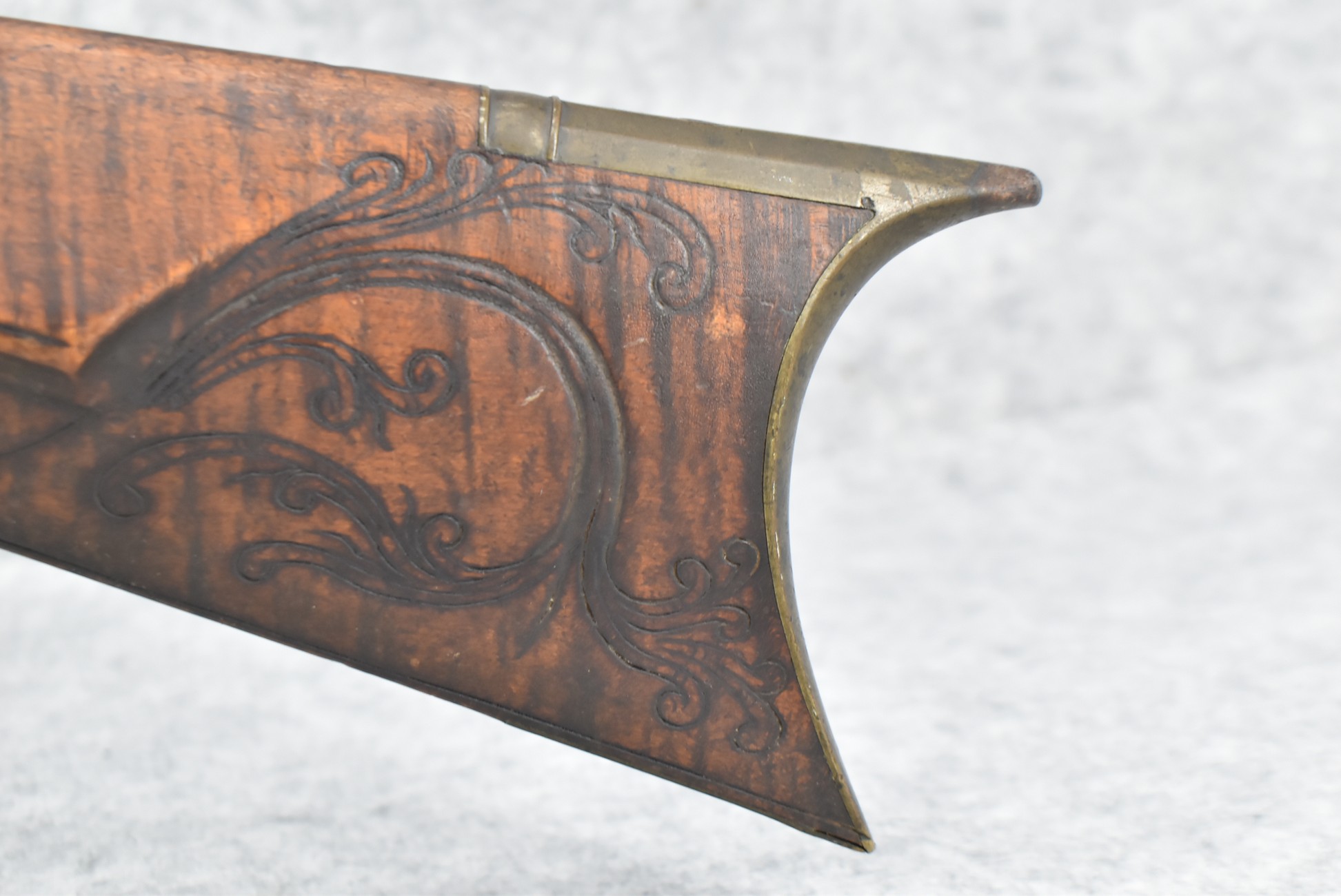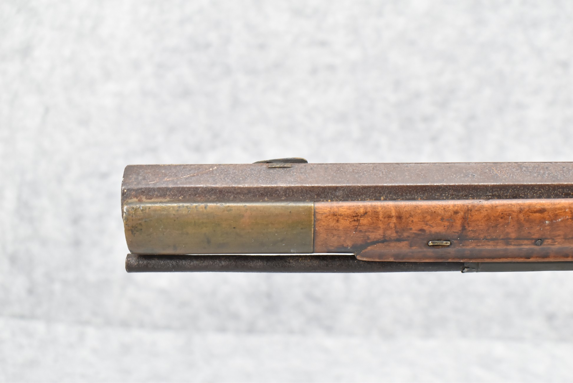 255. Signed N. Rowe (Nathaniel Rowe of Emmitsburg, MD) – 45 Cal. Percussion Long Rifle – w/43” Octagon Barrel w/Blade Front & Notch Rear Sights – Brown Finish – w/Straight Grip Full Wood Stock w/Crescent Metal Butt Plate & Brass Mountings – w/Light Carving on Both Sides of the Butt Stock – “N. Rowe” Signed in Script on Top Barrel Flat – w/Joseph Golcher Percussion Lock – Nathaniel Rowe Was Born August 8, 1821, He Moved to Emmitsburg at 16 & Apprenticed Under John Armstrong to Learn Gunsmithing – He Died April 10th, 1915