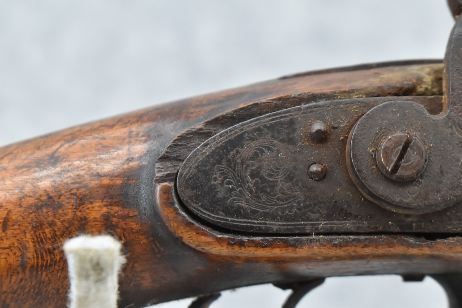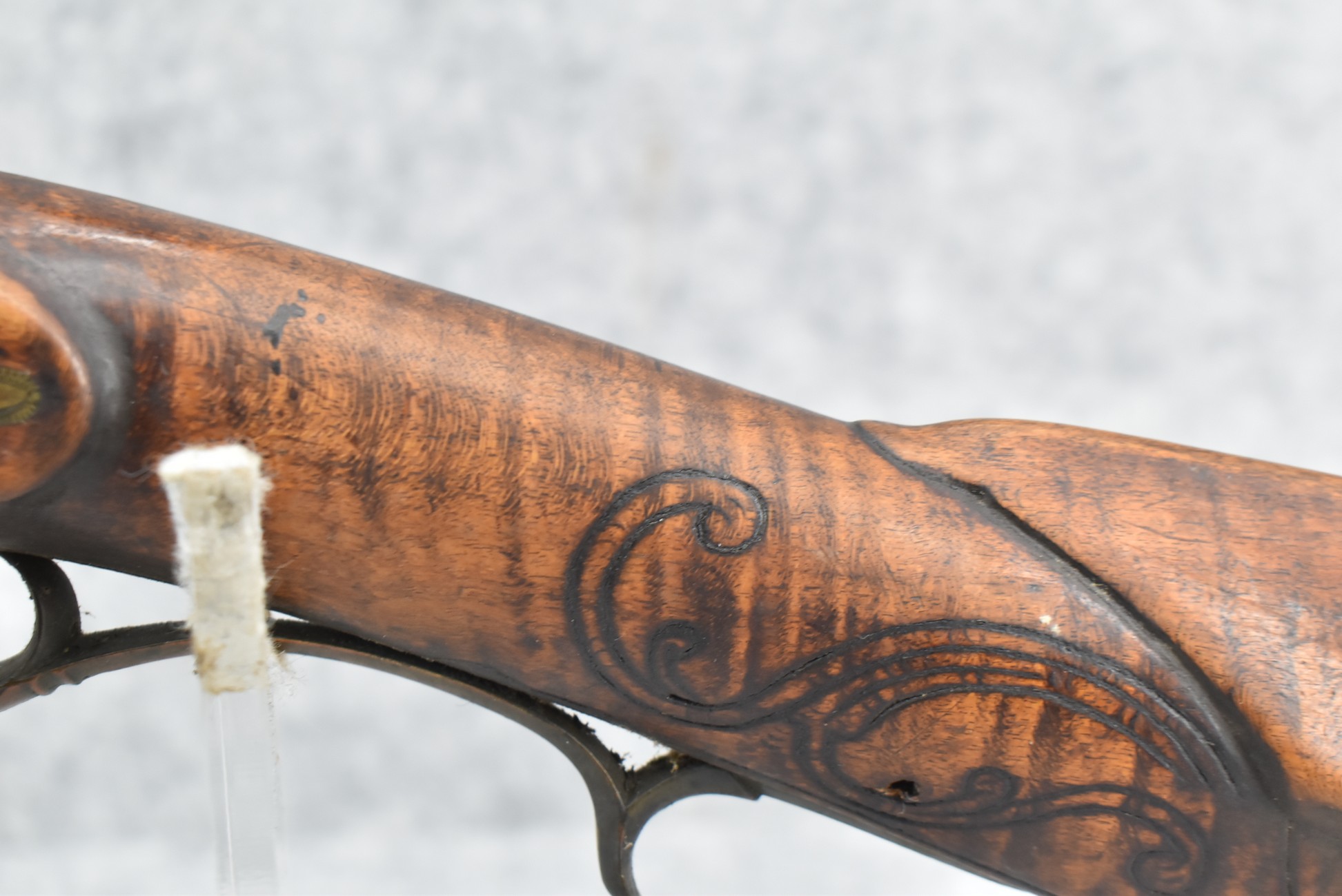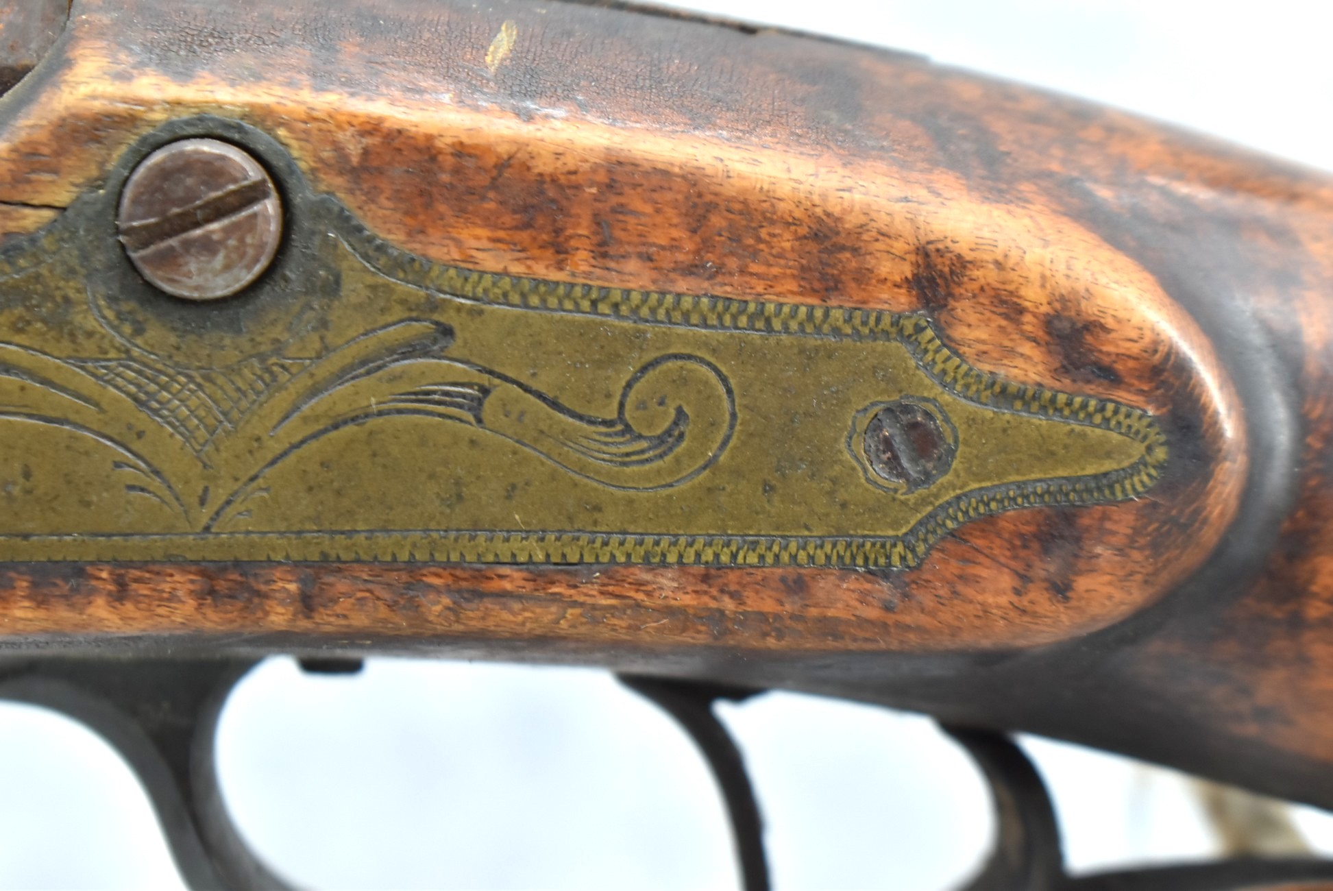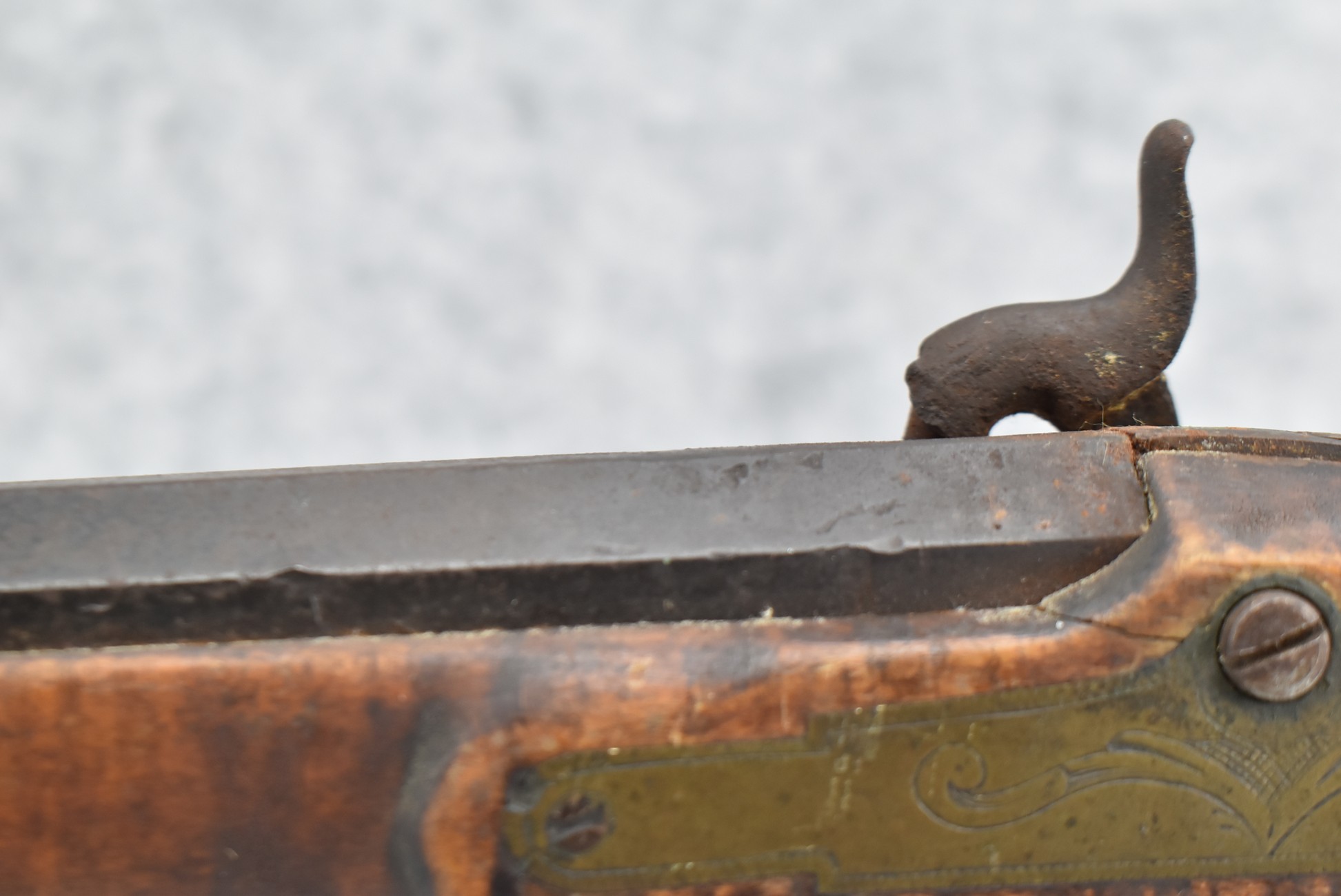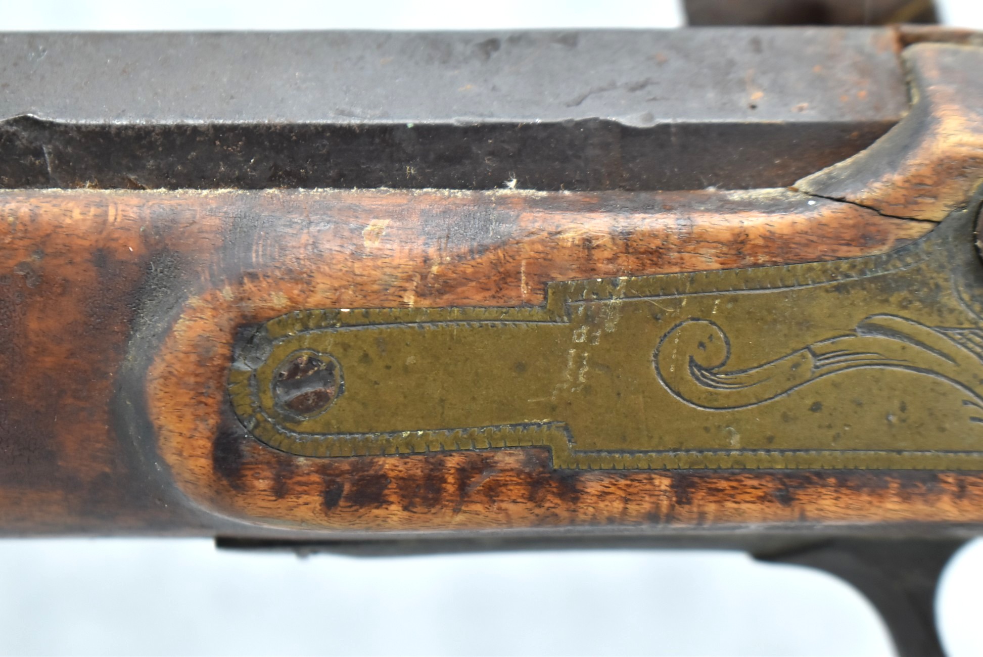 255. Signed N. Rowe (Nathaniel Rowe of Emmitsburg, MD) – 45 Cal. Percussion Long Rifle – w/43” Octagon Barrel w/Blade Front & Notch Rear Sights – Brown Finish – w/Straight Grip Full Wood Stock w/Crescent Metal Butt Plate & Brass Mountings – w/Light Carving on Both Sides of the Butt Stock – “N. Rowe” Signed in Script on Top Barrel Flat – w/Joseph Golcher Percussion Lock – Nathaniel Rowe Was Born August 8, 1821, He Moved to Emmitsburg at 16 & Apprenticed Under John Armstrong to Learn Gunsmithing – He Died April 10th, 1915