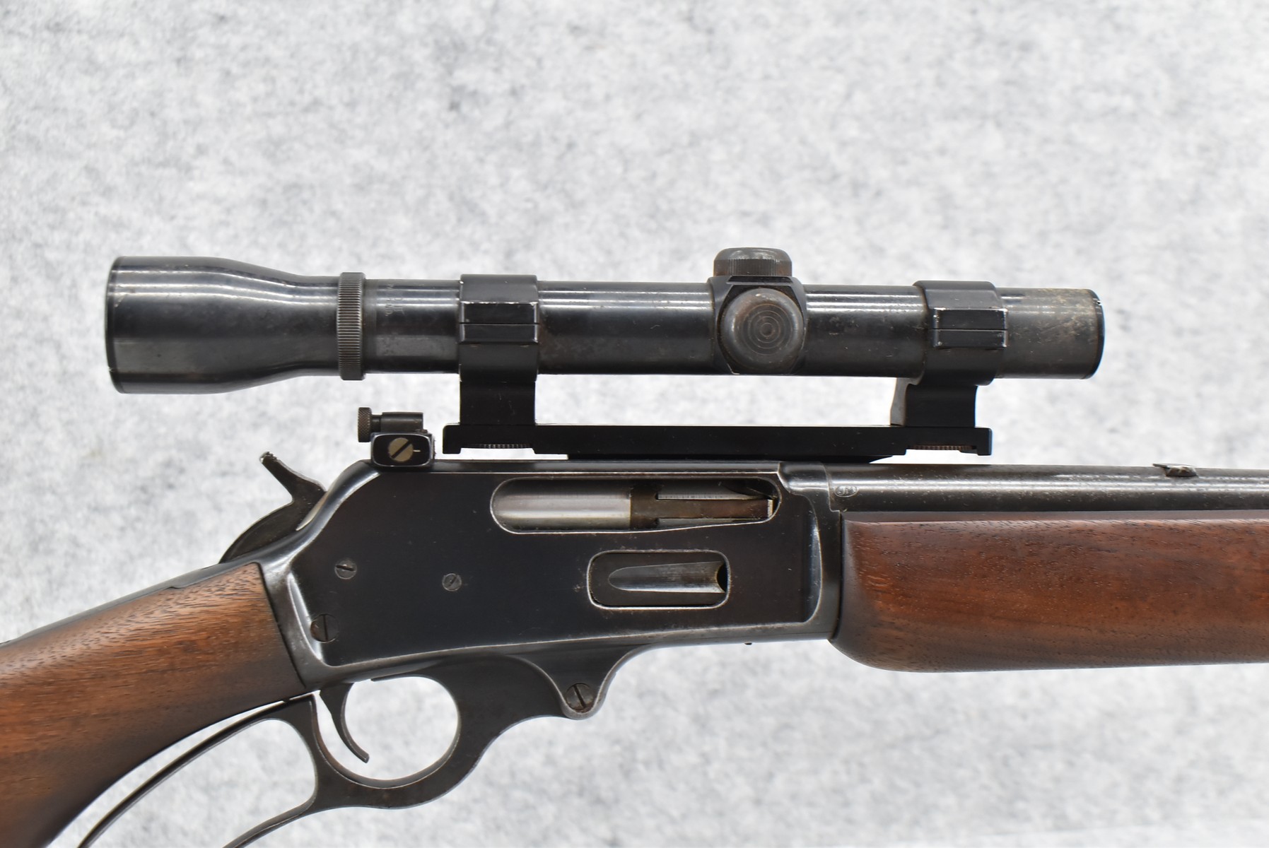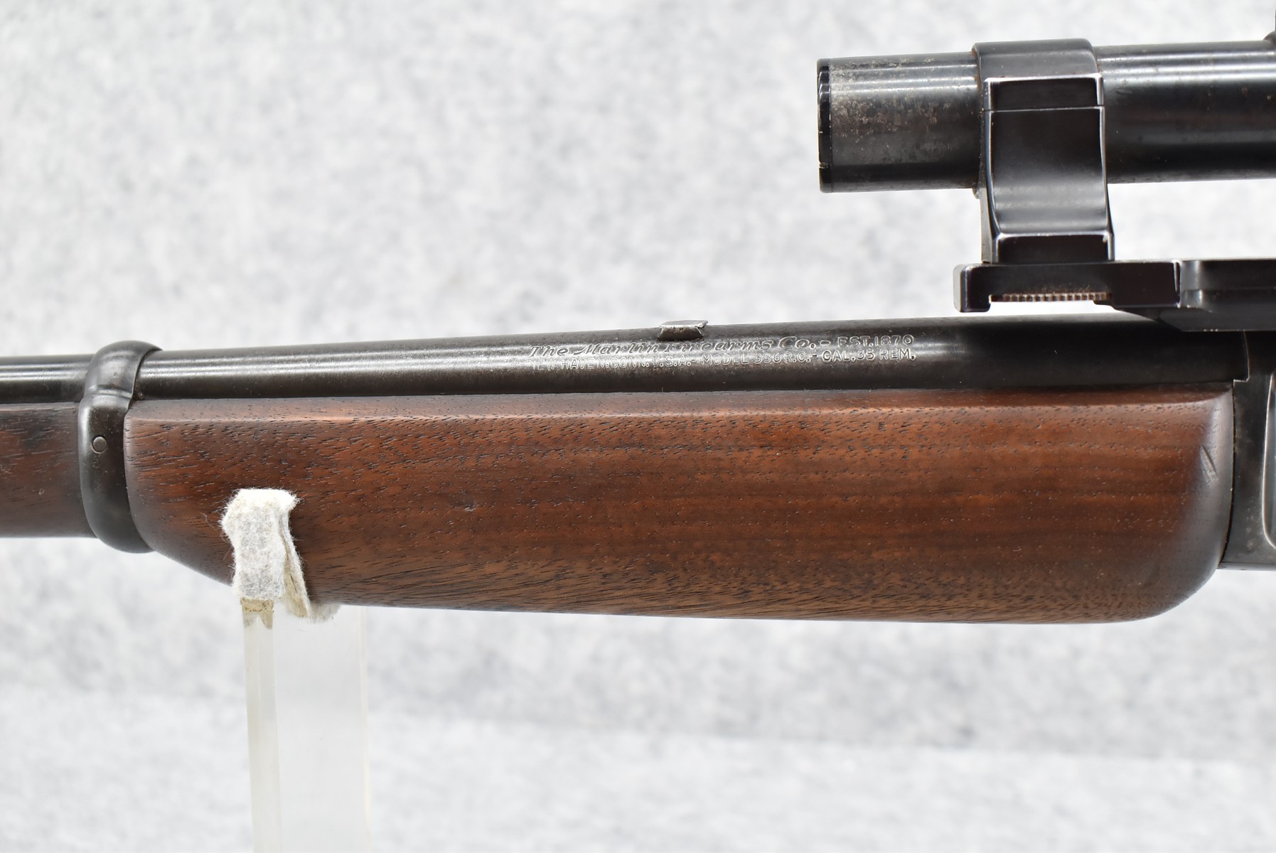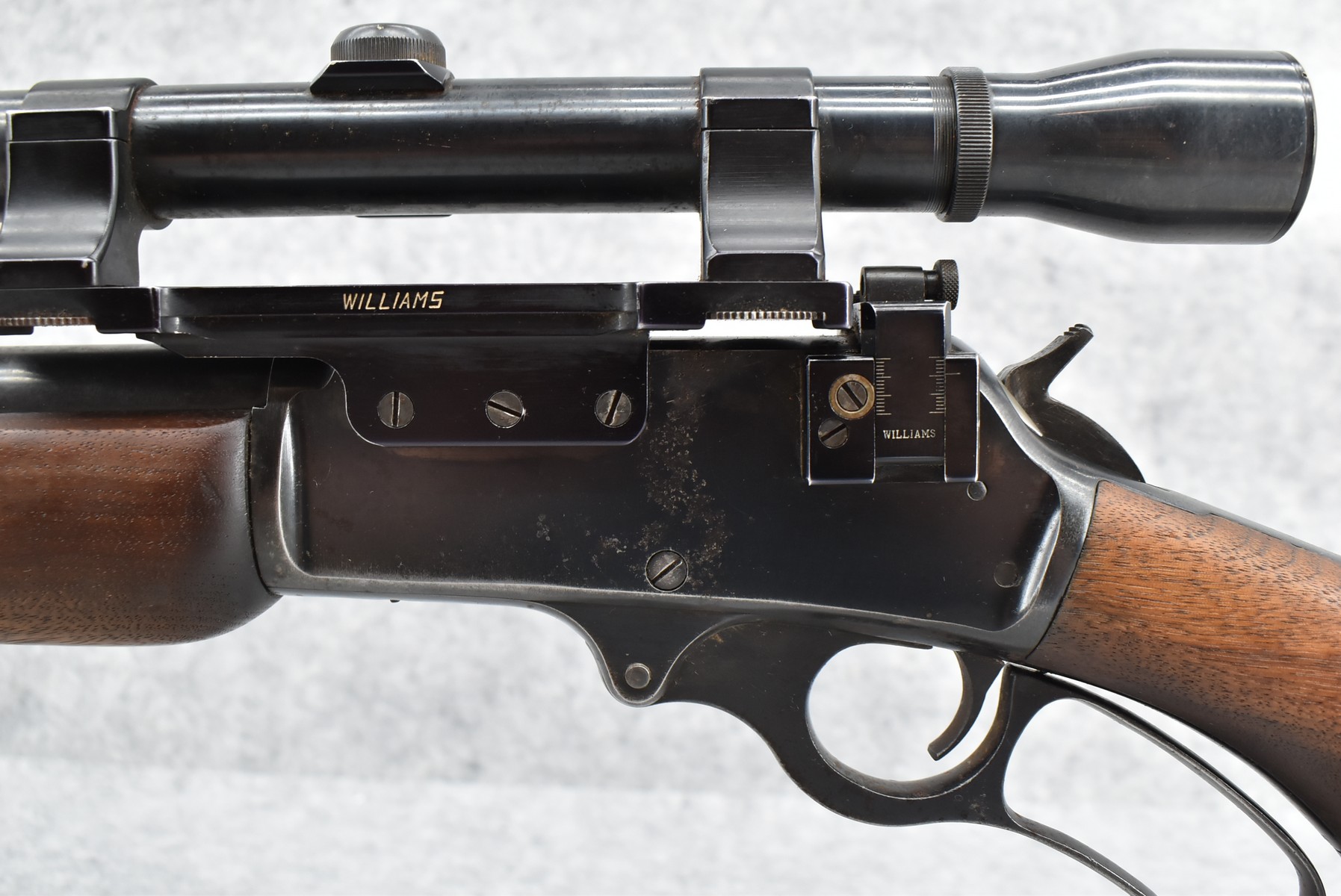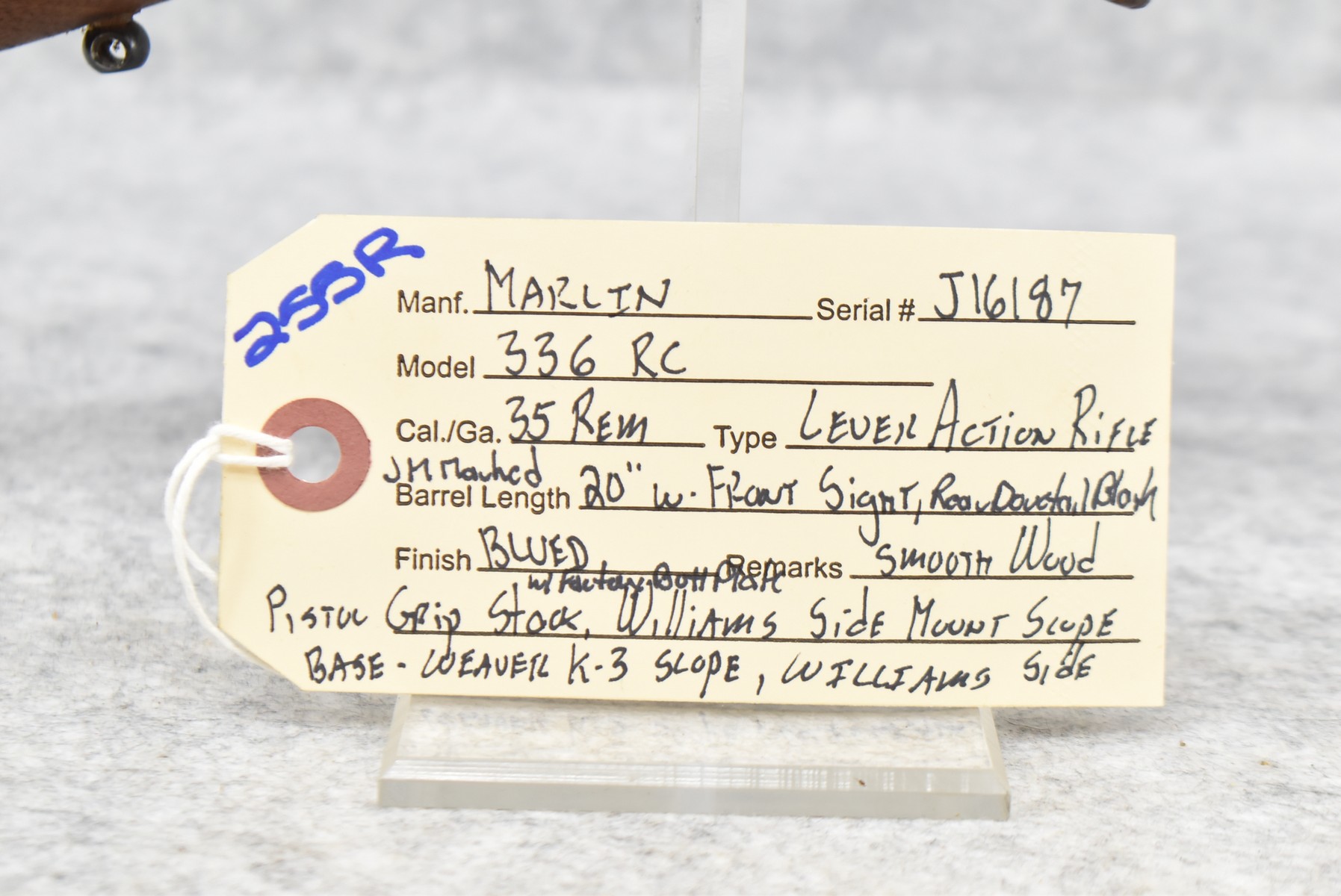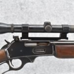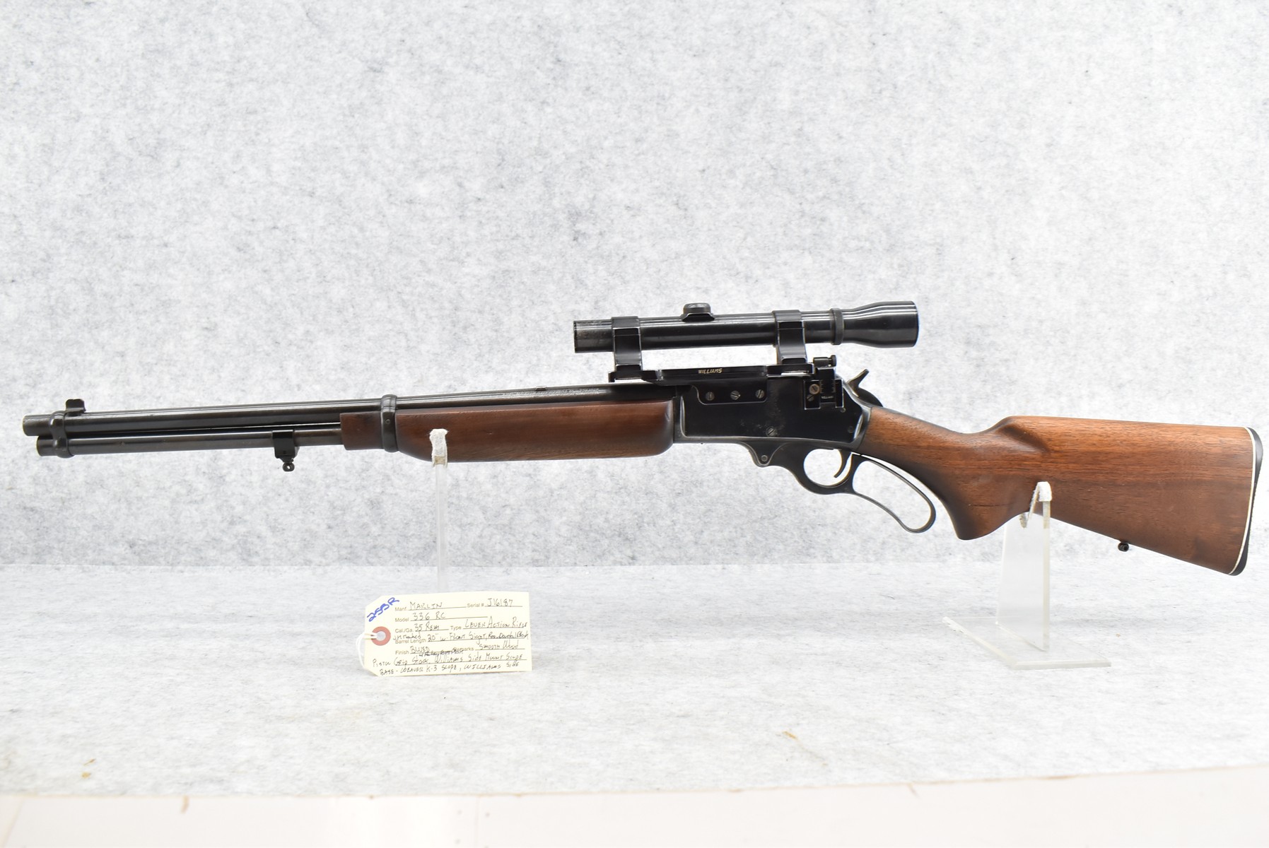 255R. Marlin – Mod. 336 RC – 35 Rem. Cal. Lever Action Rifle – w/20” JM Marked Barrel w/Front Sight (Rear Dovetail Blank) – Blued Finish – w/Smooth Wood Pistol Grip Stock w/Factory Butt Plate – w/Williams Side Receiver Adj. Rear Peep Sight – w/Williams Side Mount Scope Base – w/Weaver K-3 Scope – Note: Crack in Wood at Pistol Grip