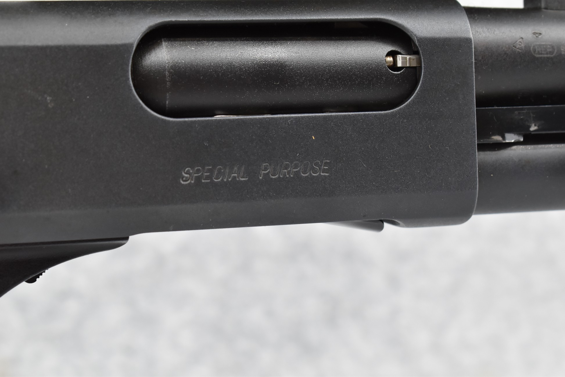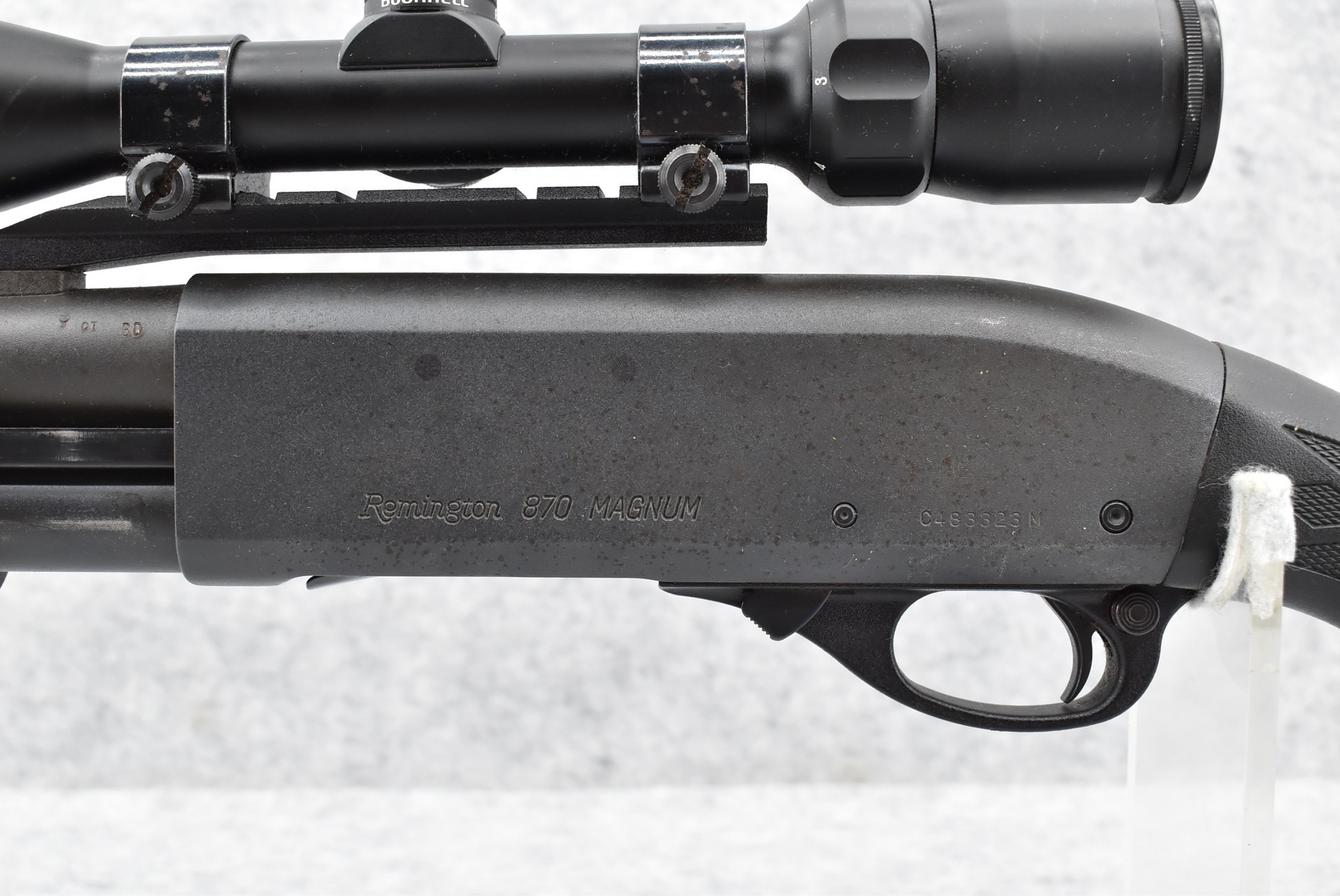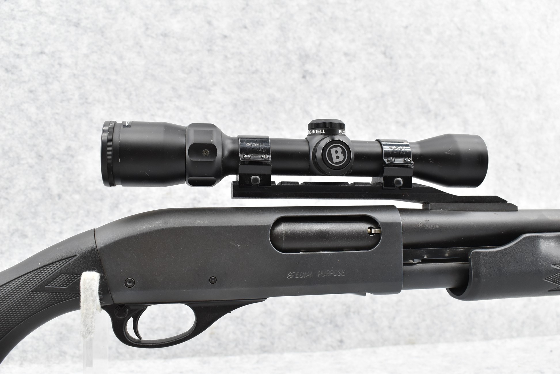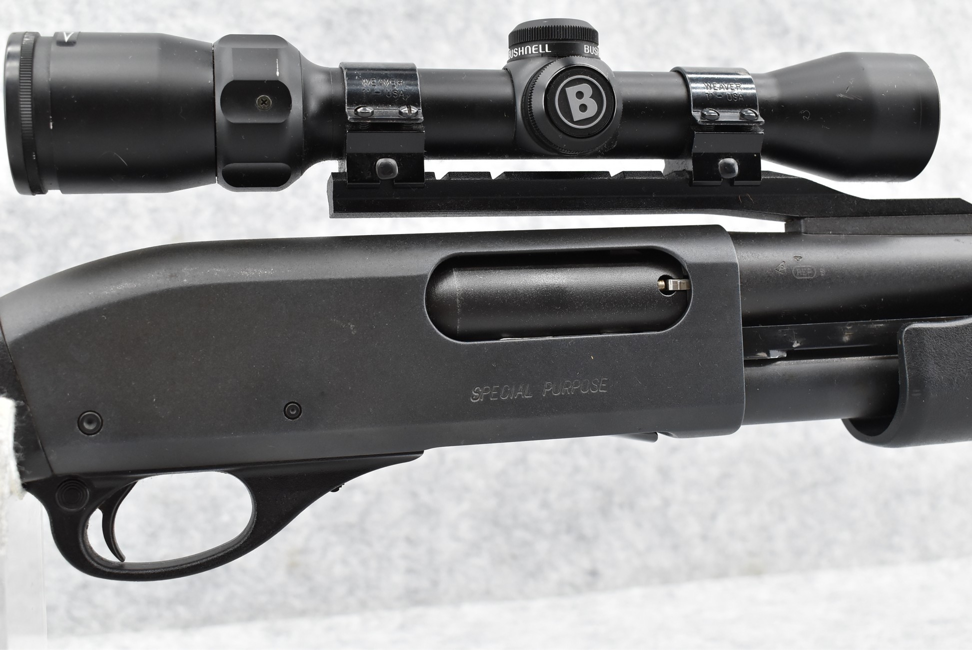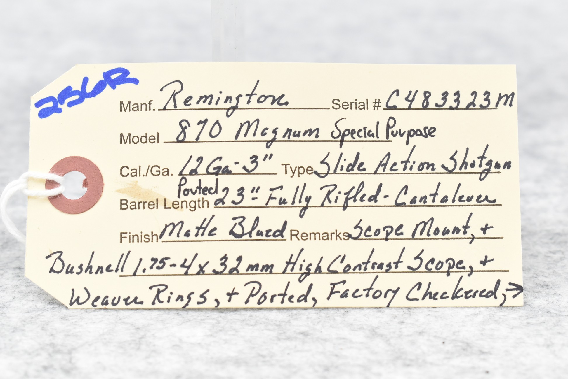 256R. Remington – Mod. 870 Magnum Special Purpose – 12ga. 3” Pump Action Shotgun – w/23” Fully Rifled Ported Barrel – Matte Blued Finish – w/Factory Checkered Capped Pistol Grip Black Synthetic Stocks w/Limb Saver Butt Pad – w/Bushnell 1.75-4x32mm High Contrast Scope, Cantilever Scope Mount, and Weaver Rings