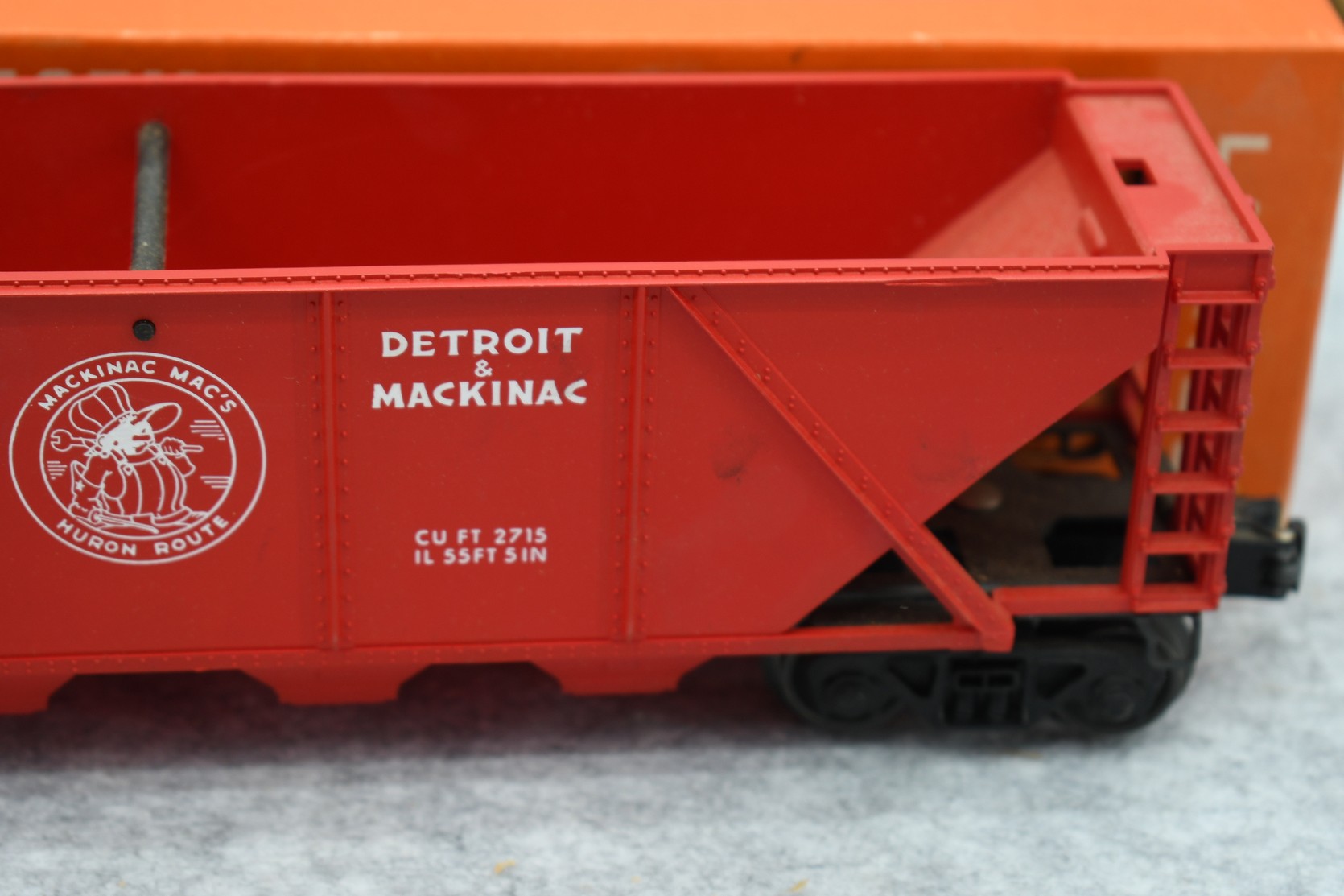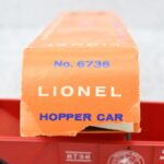 257. Lot of 4 Lionel vintage train cars including 6456 Hopper car, 6736 Hopper car, 6464 boxcar, 3357 Cop and Hobo car. All with boxes