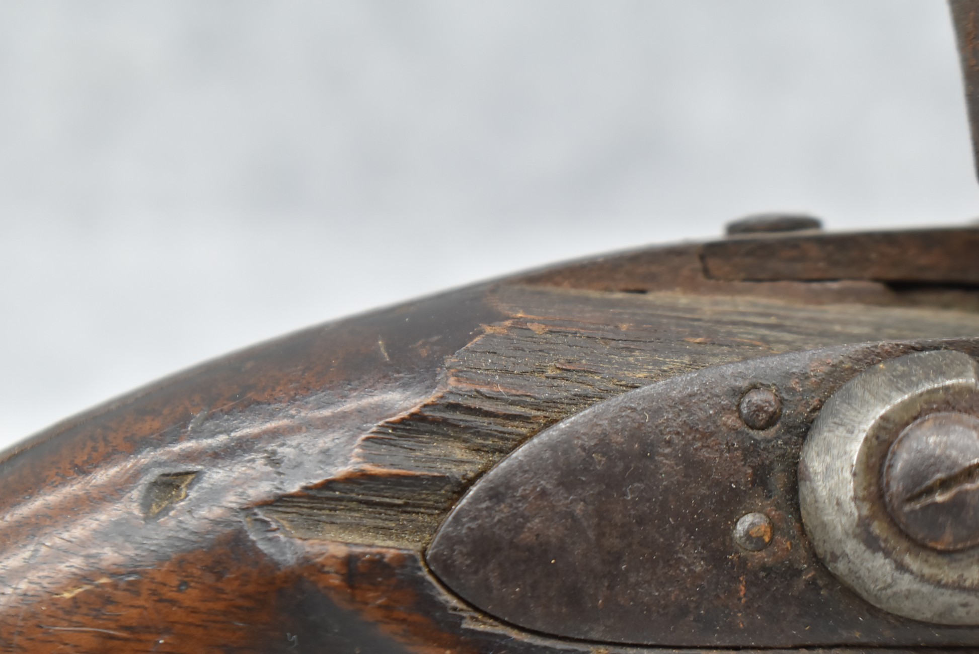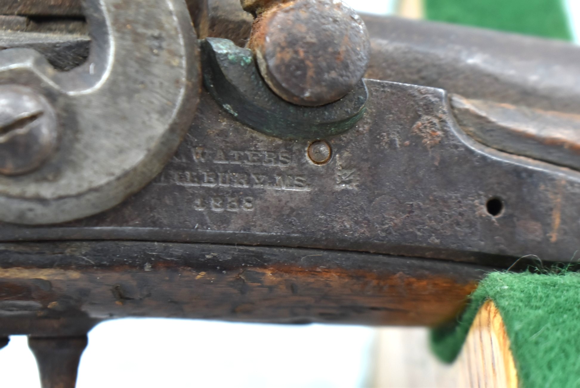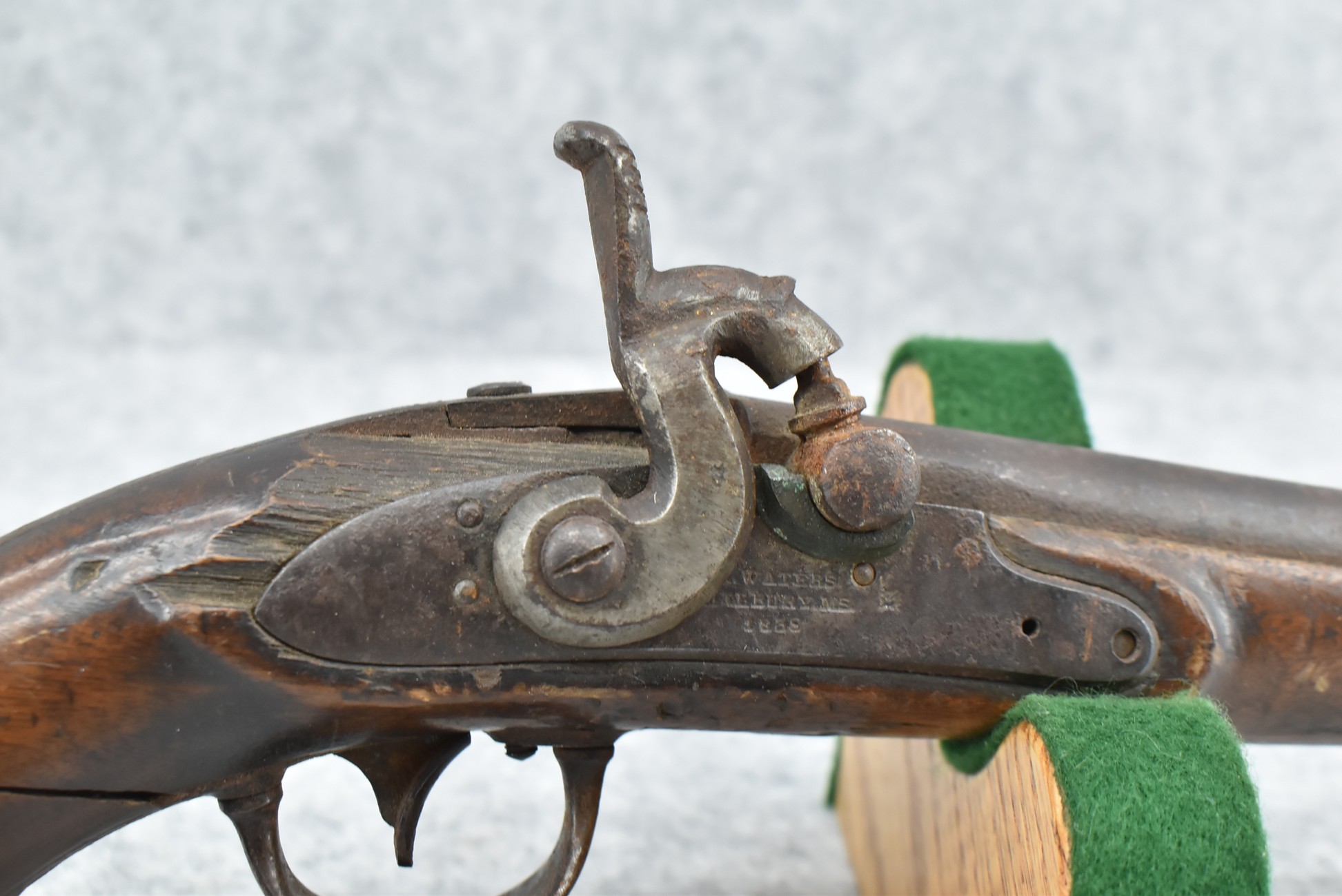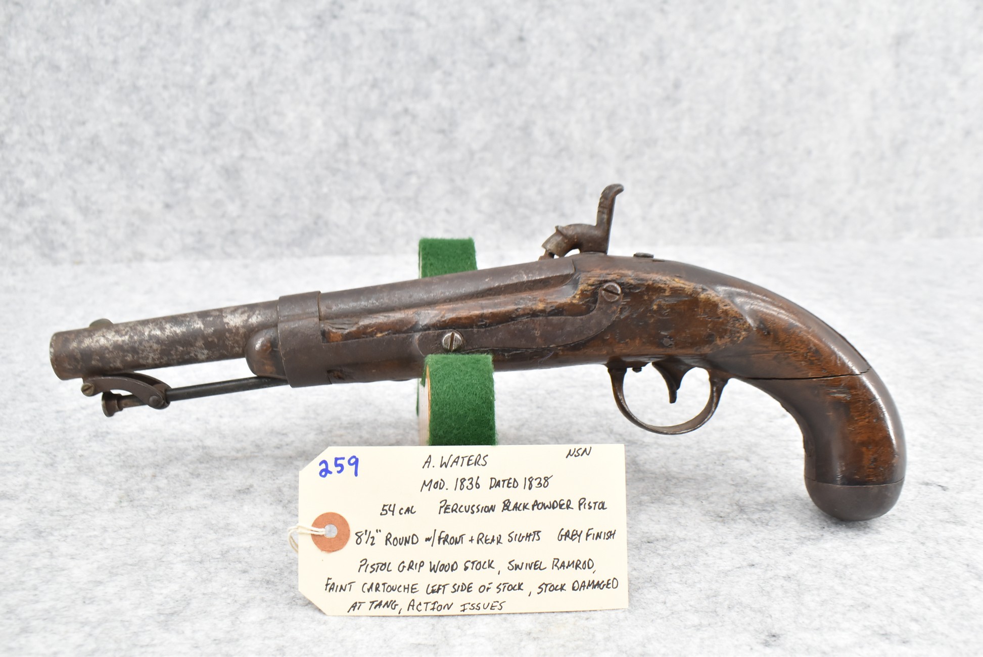 259. A. Waters – Mod. 1836 – 54 Cal. Percussion Black Powder Pistol – w/8 ½” Round Barrel w/Front & Rear Sights – Gray Finish – w/Pistol Grip Wood Stock – w/Faint Cartouche on Left Side of Stock – w/Swivel Ram Rod – Dated 1838 – Note: Stock Damaged at Tang & Action Issues!