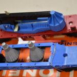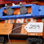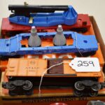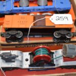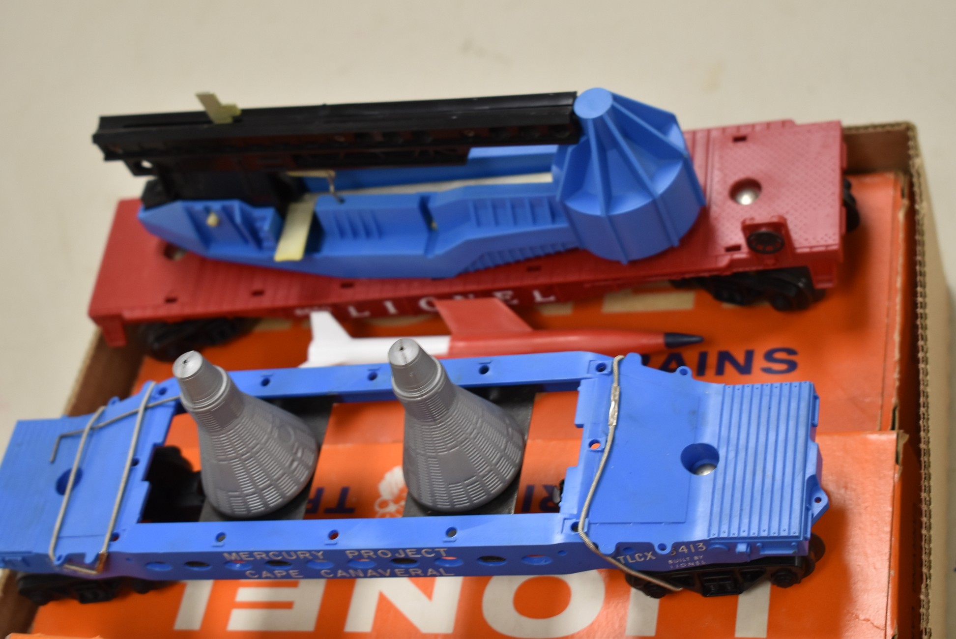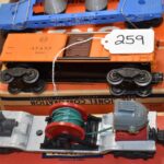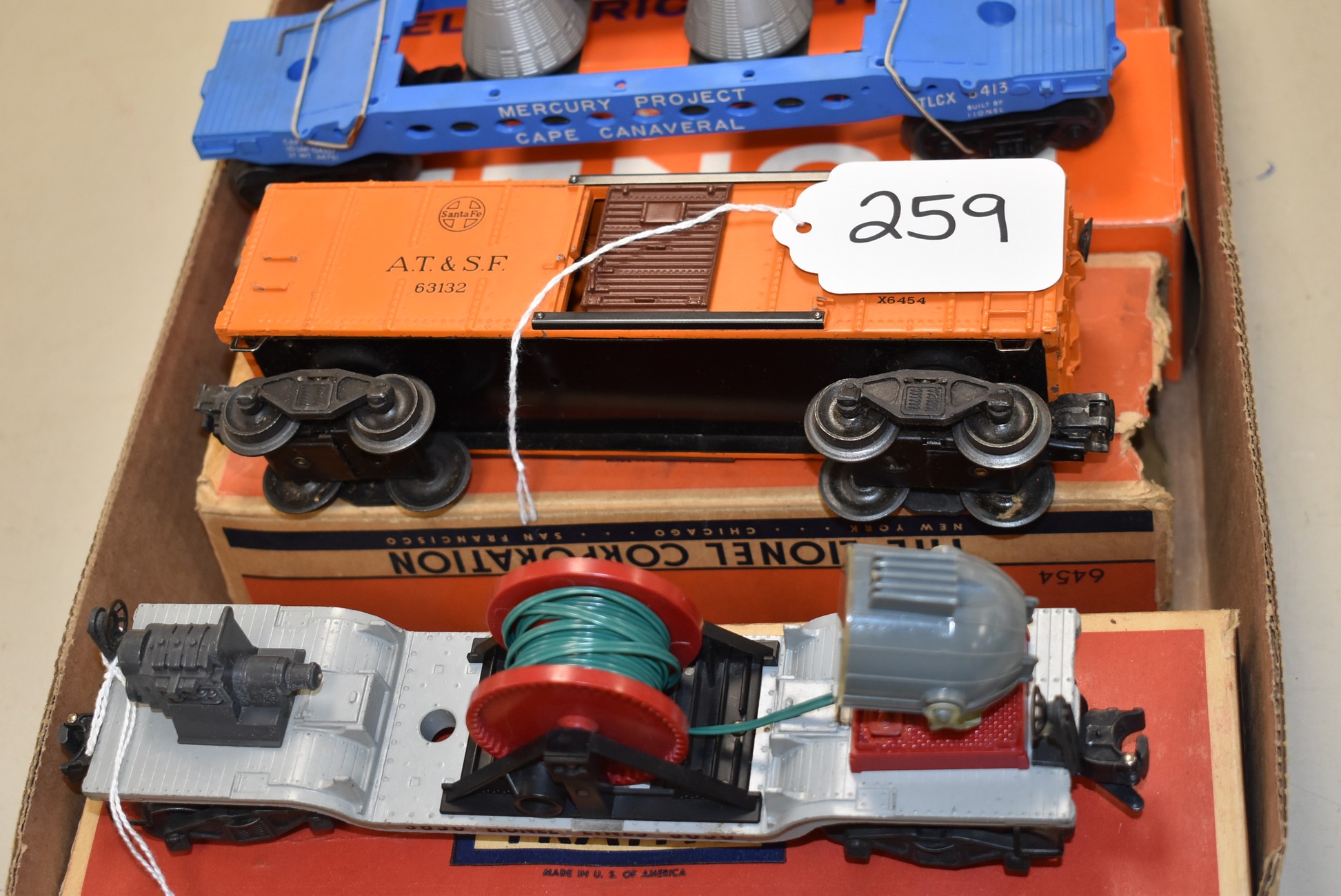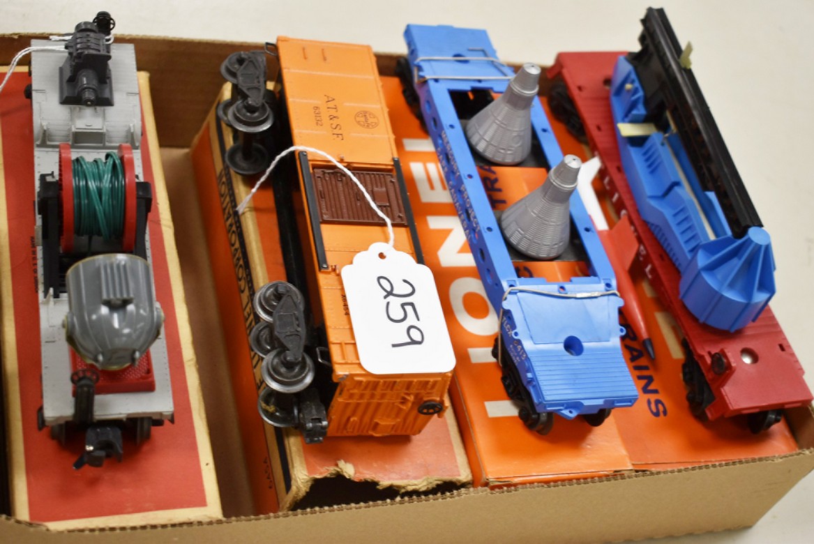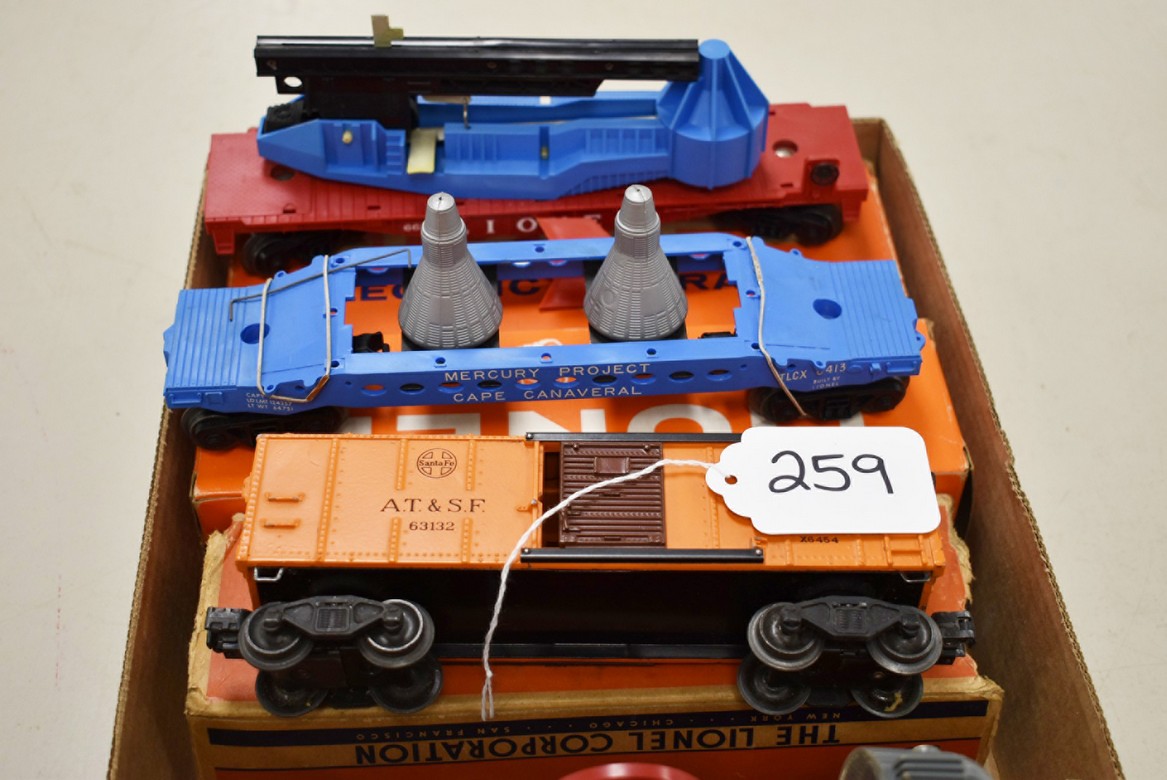 259. Lot of 4 Lionel Train Cars – Including Searchlight Extension Car No. 3650, Santa Fe A.T. & S.F 63132, Mercury Project Cape Canaveral TLCX 6413, and Lionel 6650 Missile Launching Car – All w/Boxes