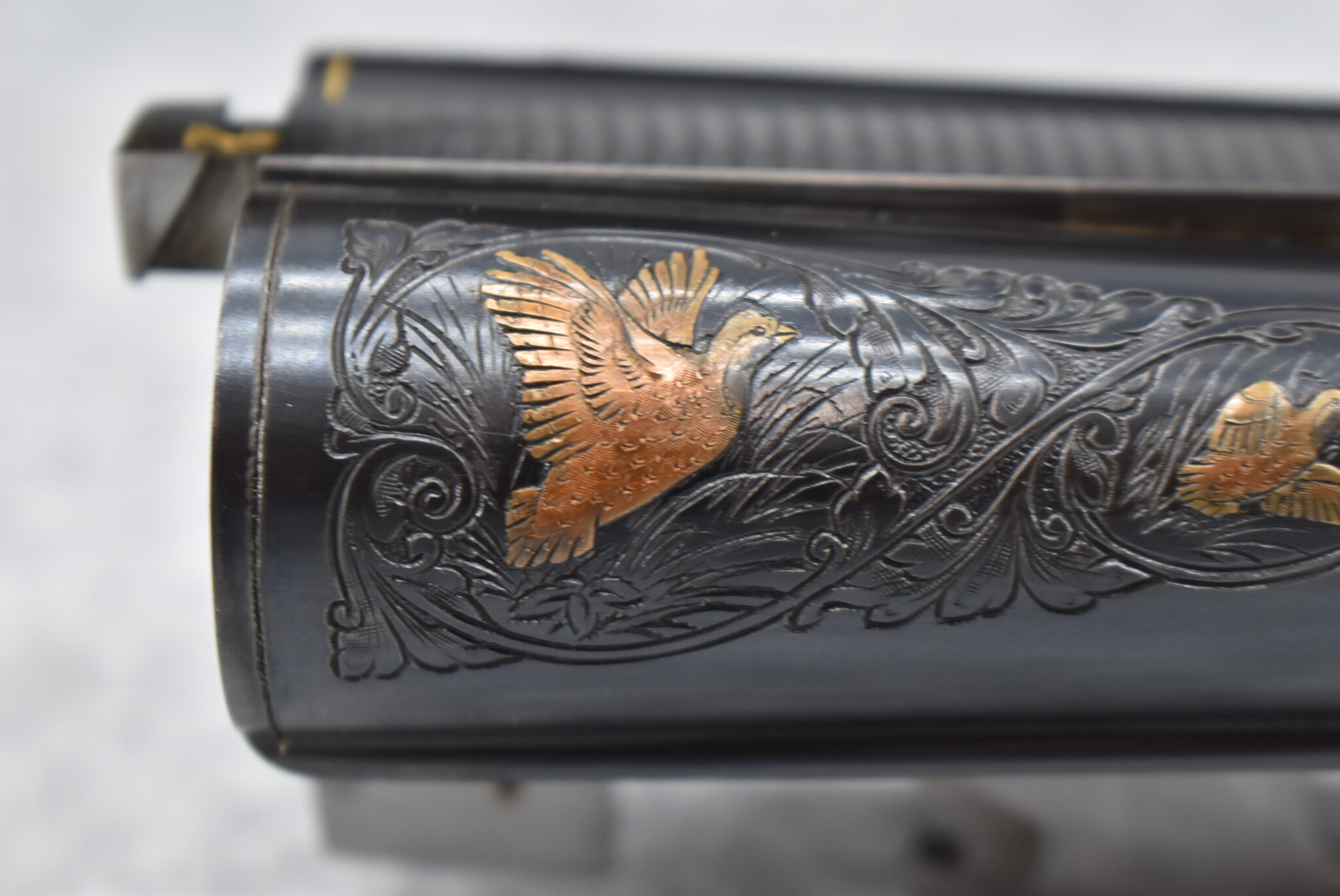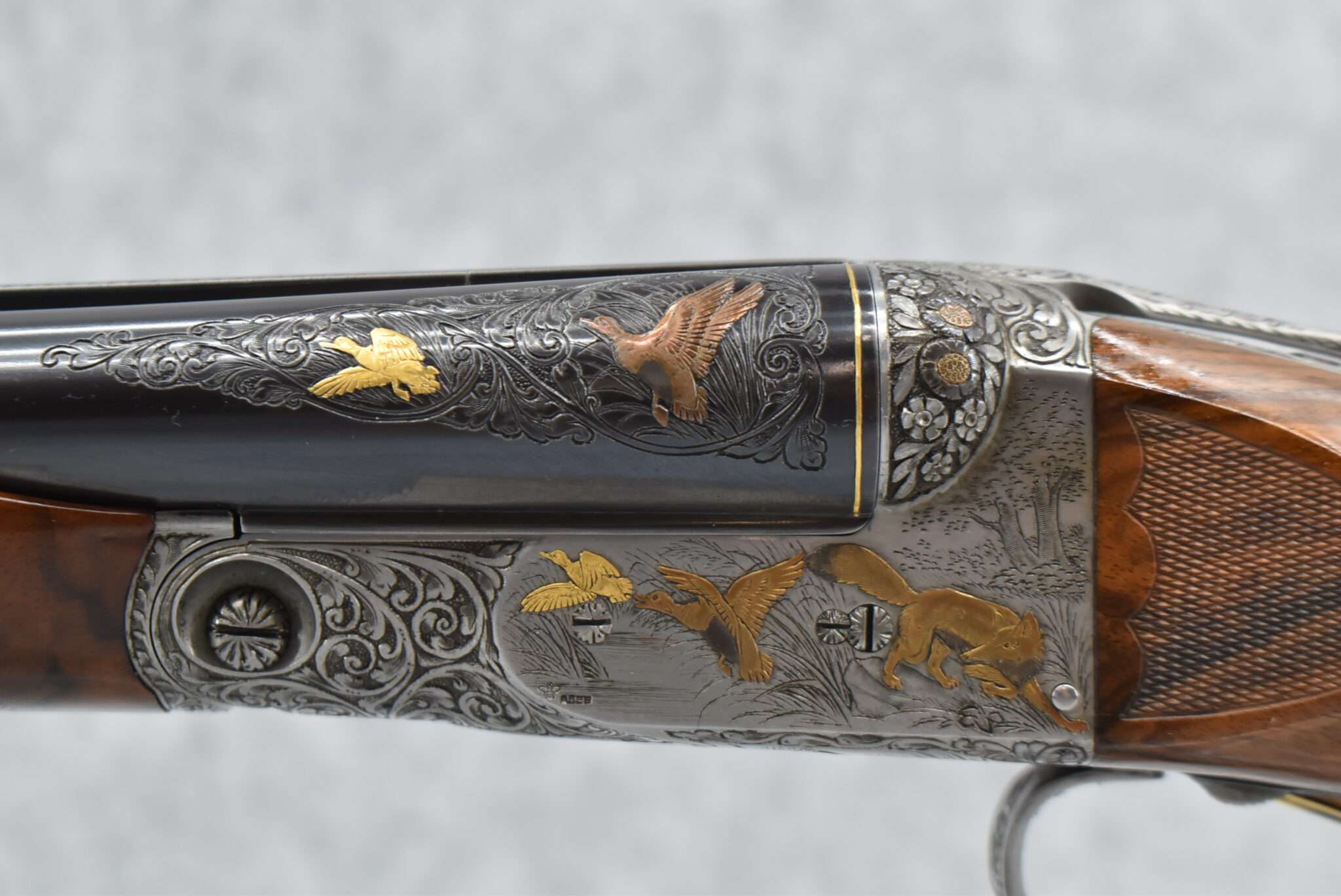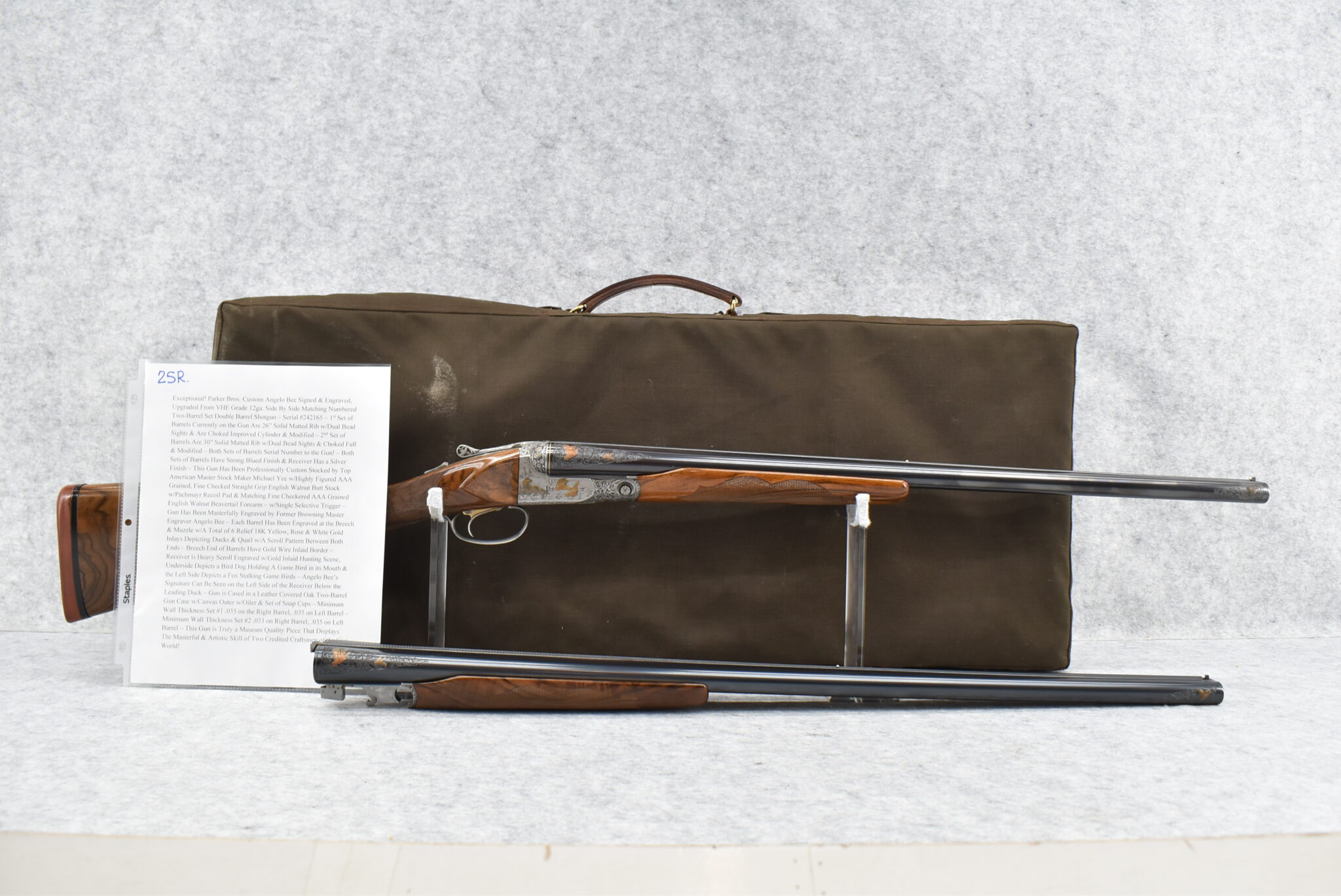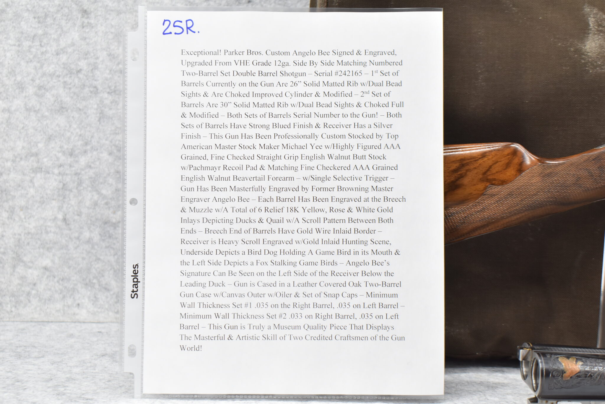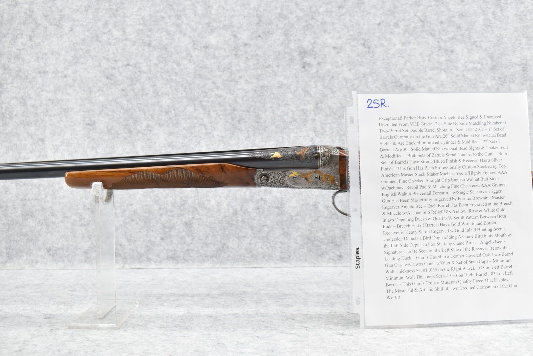 25R. Exceptional! Parker Bros. Custom Angelo Bee Signed & Engraved, Upgraded From VHE Grade 12ga. Side By Side Matching Numbered Two-Barrel Set Double Barrel Shotgun – Serial #242165 – 1st Set of Barrels Currently on the Gun Are 26” Solid Matted Rib w/Dual Bead Sights & Are Choked Improved Cylinder & Modified – 2nd Set of Barrels Are 30” Solid Matted Rib w/Dual Bead Sights & Choked Full & Modified – Both Sets of Barrels Serial Number to the Gun! – Both Sets of Barrels Have Strong Blued Finish & Receiver Has a Silver Finish – This Gun Has Been Professionally Custom Stocked by Top American Master Stock Maker Michael Yee w/Highly Figured AAA Grained, Fine Checked Straight Grip English Walnut Butt Stock w/Pachmayr Recoil Pad & Matching Fine Checkered AAA Grained English Walnut Beavertail Forearm – w/Single Selective Trigger – Gun Has Been Masterfully Engraved by Former Browning Master Engraver Angelo Bee – Each Barrel Has Been Engraved at the Breech & Muzzle w/A Total of 6 Relief 18K Yellow, Rose & White Gold Inlays Depicting Ducks & Quail w/A Scroll Pattern Between Both Ends – Breech End of Barrels Have Gold Wire Inlaid Border – Receiver is Heavy Scroll Engraved w/Gold Inlaid Hunting Scene, Underside Depicts a Bird Dog Holding A Game Bird in its Mouth & the Left Side Depicts a Fox Stalking Game Birds – Angelo Bee’s Signature Can Be Seen on the Left Side of the Receiver Below the Leading Duck – Gun is Cased in a Leather Covered Oak Two-Barrel Gun Case w/Canvas Outer w/Oiler & Set of Snap Caps – Minimum Wall Thickness Set #1 .035 on the Right Barrel, .035 on Left Barrel – Minimum Wall Thickness Set #2 .033 on Right Barrel, .035 on Left Barrel – This Gun is Truly a Museum Quality Piece That Displays The Masterful & Artistic Skill of Two Credited Craftsmen of the Gun World!