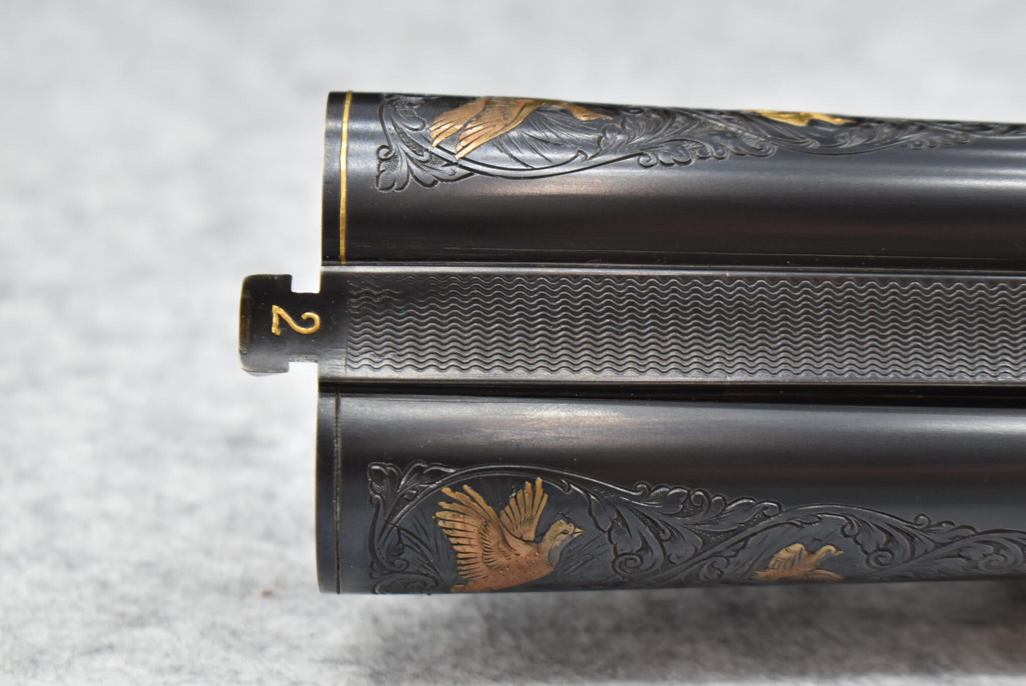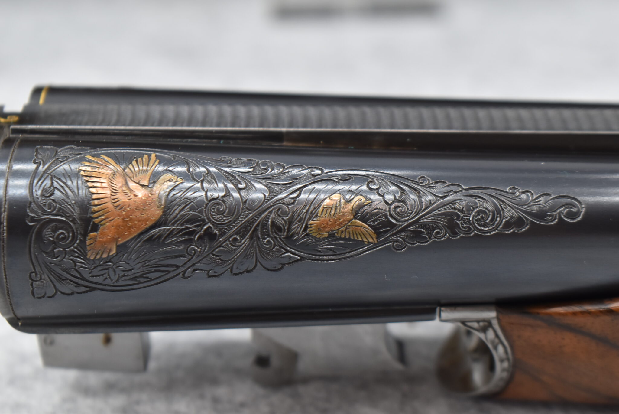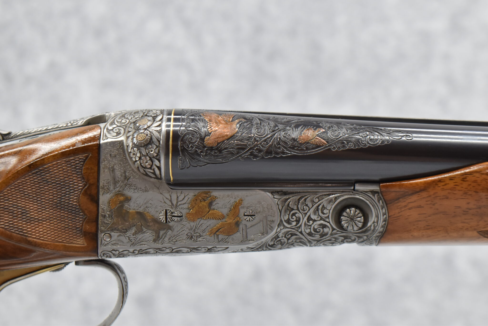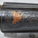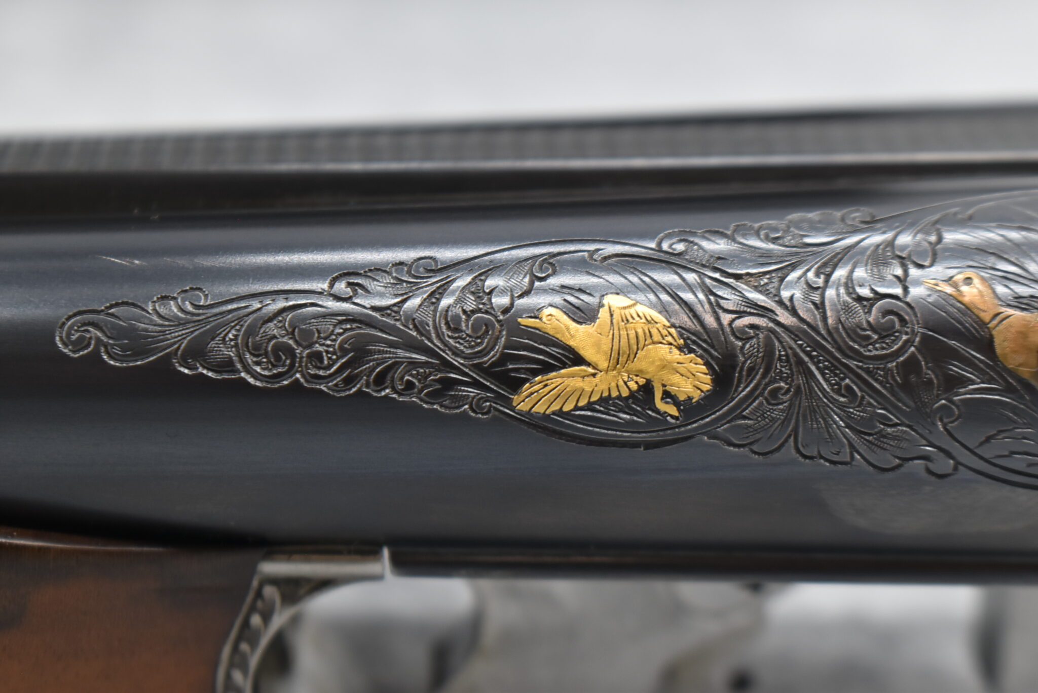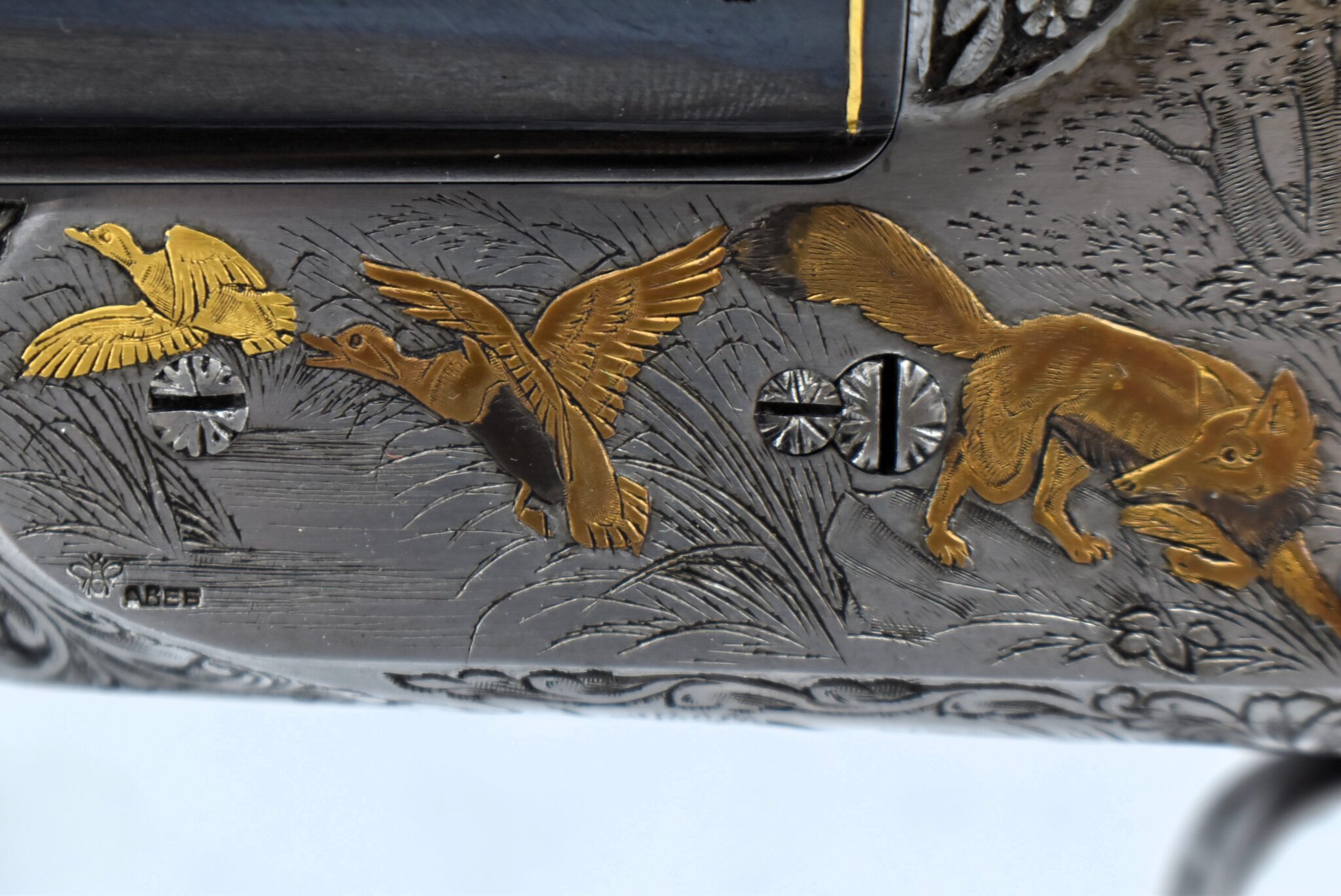25R. Exceptional! Parker Bros. Custom Angelo Bee Signed & Engraved, Upgraded From VHE Grade 12ga. Side By Side Matching Numbered Two-Barrel Set Double Barrel Shotgun – Serial #242165 – 1st Set of Barrels Currently on the Gun Are 26” Solid Matted Rib w/Dual Bead Sights & Are Choked Improved Cylinder & Modified – 2nd Set of Barrels Are 30” Solid Matted Rib w/Dual Bead Sights & Choked Full & Modified – Both Sets of Barrels Serial Number to the Gun! – Both Sets of Barrels Have Strong Blued Finish & Receiver Has a Silver Finish – This Gun Has Been Professionally Custom Stocked by Top American Master Stock Maker Michael Yee w/Highly Figured AAA Grained, Fine Checked Straight Grip English Walnut Butt Stock w/Pachmayr Recoil Pad & Matching Fine Checkered AAA Grained English Walnut Beavertail Forearm – w/Single Selective Trigger – Gun Has Been Masterfully Engraved by Former Browning Master Engraver Angelo Bee – Each Barrel Has Been Engraved at the Breech & Muzzle w/A Total of 6 Relief 18K Yellow, Rose & White Gold Inlays Depicting Ducks & Quail w/A Scroll Pattern Between Both Ends – Breech End of Barrels Have Gold Wire Inlaid Border – Receiver is Heavy Scroll Engraved w/Gold Inlaid Hunting Scene, Underside Depicts a Bird Dog Holding A Game Bird in its Mouth & the Left Side Depicts a Fox Stalking Game Birds – Angelo Bee’s Signature Can Be Seen on the Left Side of the Receiver Below the Leading Duck – Gun is Cased in a Leather Covered Oak Two-Barrel Gun Case w/Canvas Outer w/Oiler & Set of Snap Caps – Minimum Wall Thickness Set #1 .035 on the Right Barrel, .035 on Left Barrel – Minimum Wall Thickness Set #2 .033 on Right Barrel, .035 on Left Barrel – This Gun is Truly a Museum Quality Piece That Displays The Masterful & Artistic Skill of Two Credited Craftsmen of the Gun World!