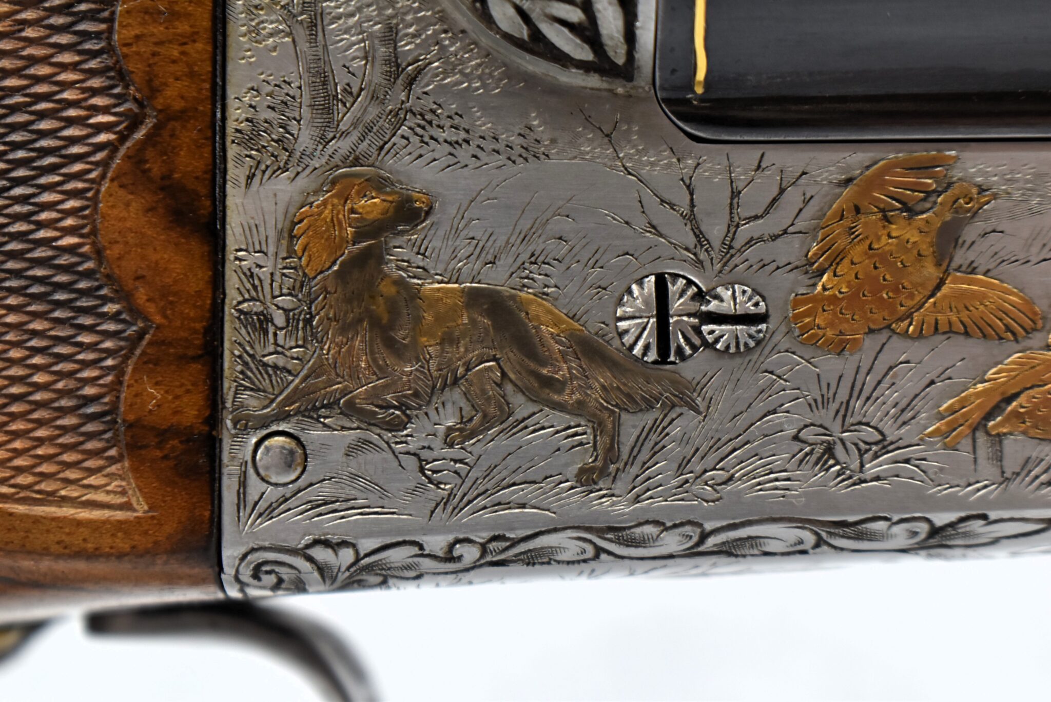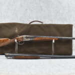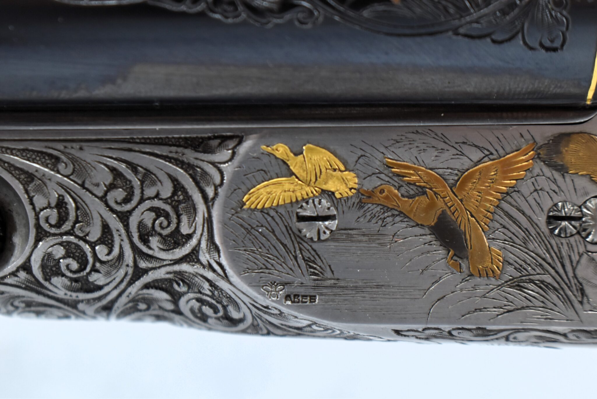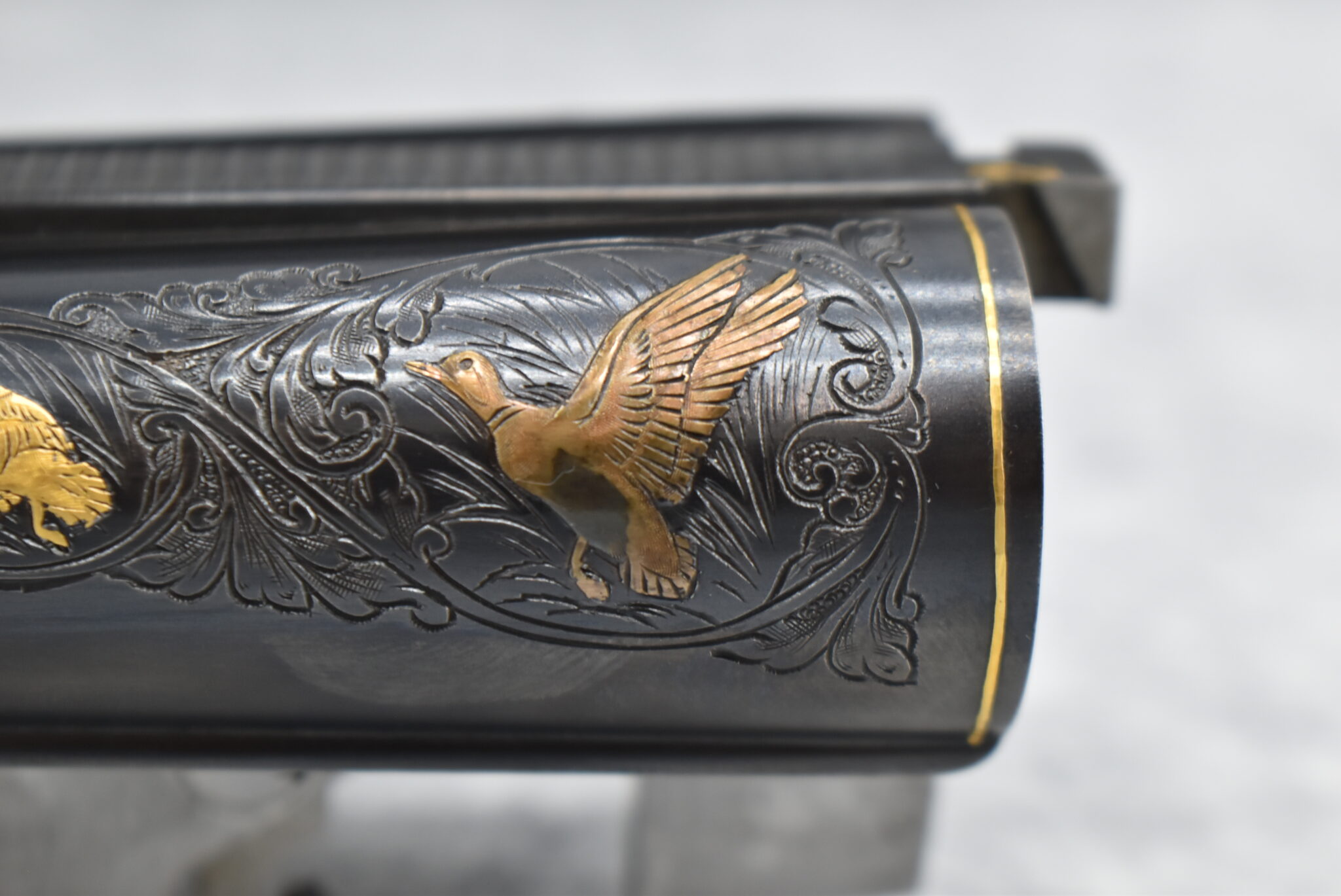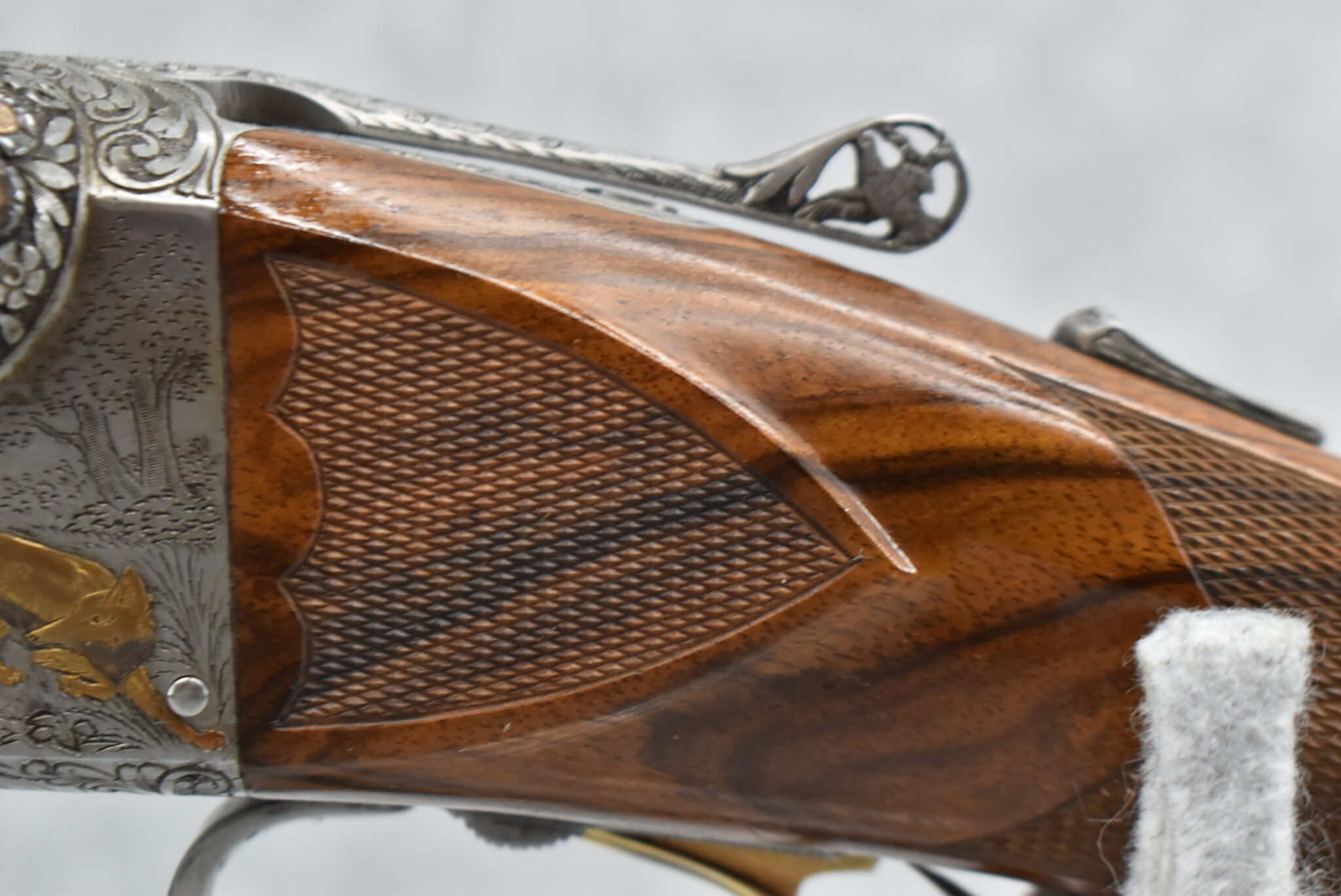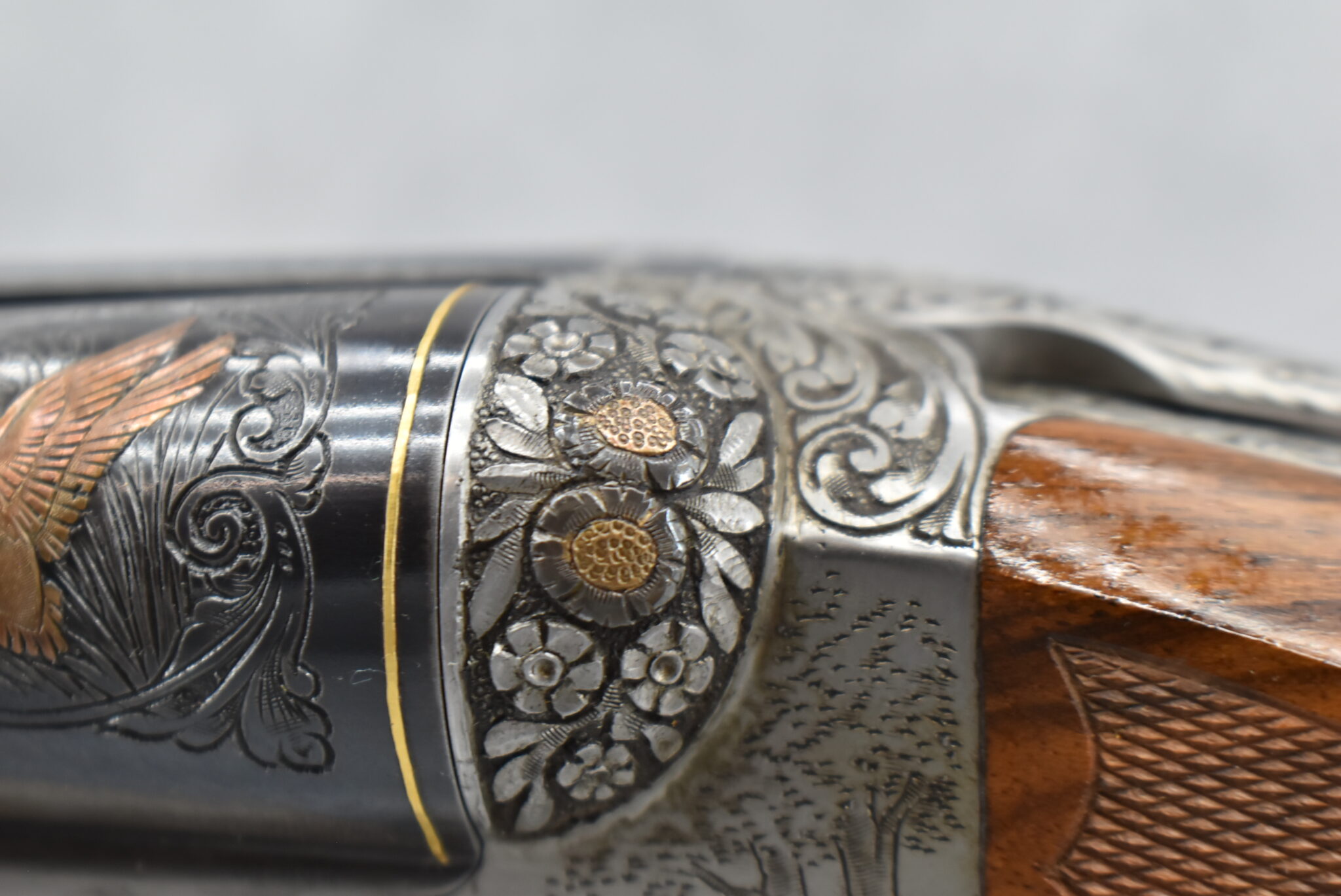 25R. Exceptional! Parker Bros. Custom Angelo Bee Signed & Engraved, Upgraded From VHE Grade 12ga. Side By Side Matching Numbered Two-Barrel Set Double Barrel Shotgun – Serial #242165 – 1st Set of Barrels Currently on the Gun Are 26” Solid Matted Rib w/Dual Bead Sights & Are Choked Improved Cylinder & Modified – 2nd Set of Barrels Are 30” Solid Matted Rib w/Dual Bead Sights & Choked Full & Modified – Both Sets of Barrels Serial Number to the Gun! – Both Sets of Barrels Have Strong Blued Finish & Receiver Has a Silver Finish – This Gun Has Been Professionally Custom Stocked by Top American Master Stock Maker Michael Yee w/Highly Figured AAA Grained, Fine Checked Straight Grip English Walnut Butt Stock w/Pachmayr Recoil Pad & Matching Fine Checkered AAA Grained English Walnut Beavertail Forearm – w/Single Selective Trigger – Gun Has Been Masterfully Engraved by Former Browning Master Engraver Angelo Bee – Each Barrel Has Been Engraved at the Breech & Muzzle w/A Total of 6 Relief 18K Yellow, Rose & White Gold Inlays Depicting Ducks & Quail w/A Scroll Pattern Between Both Ends – Breech End of Barrels Have Gold Wire Inlaid Border – Receiver is Heavy Scroll Engraved w/Gold Inlaid Hunting Scene, Underside Depicts a Bird Dog Holding A Game Bird in its Mouth & the Left Side Depicts a Fox Stalking Game Birds – Angelo Bee’s Signature Can Be Seen on the Left Side of the Receiver Below the Leading Duck – Gun is Cased in a Leather Covered Oak Two-Barrel Gun Case w/Canvas Outer w/Oiler & Set of Snap Caps – Minimum Wall Thickness Set #1 .035 on the Right Barrel, .035 on Left Barrel – Minimum Wall Thickness Set #2 .033 on Right Barrel, .035 on Left Barrel – This Gun is Truly a Museum Quality Piece That Displays The Masterful & Artistic Skill of Two Credited Craftsmen of the Gun World!