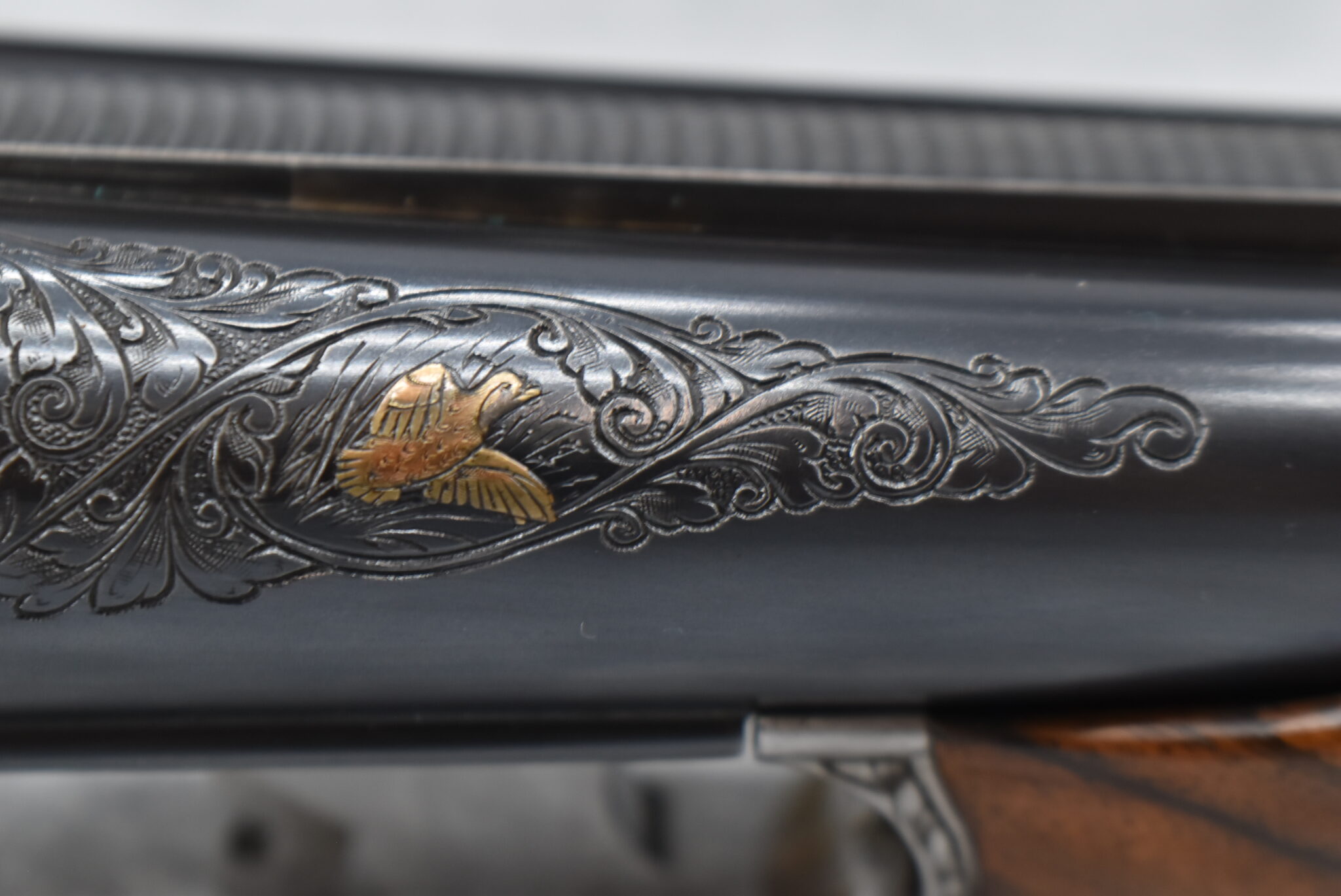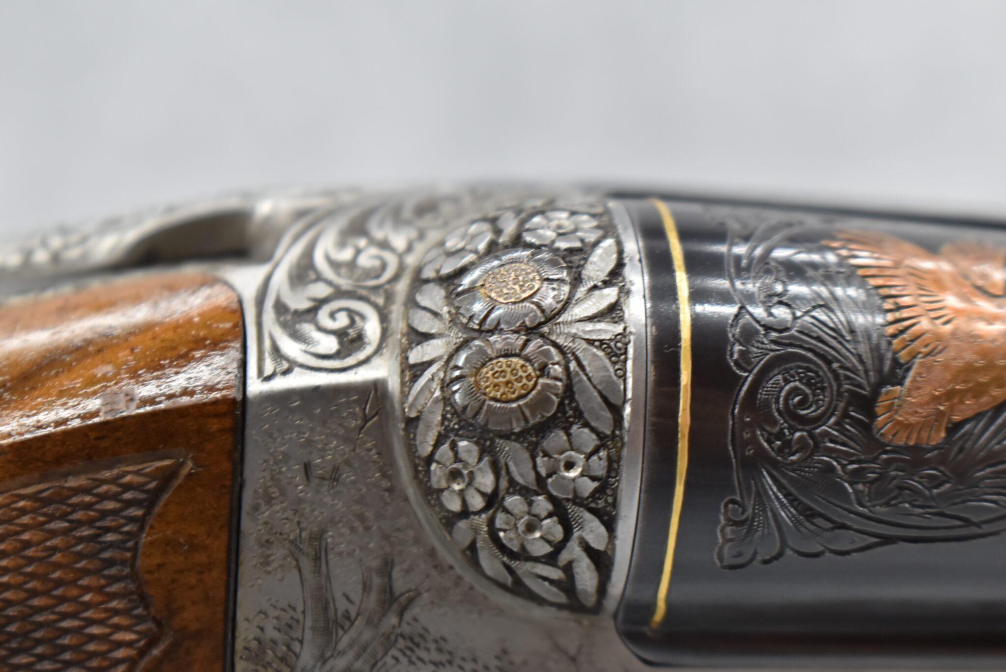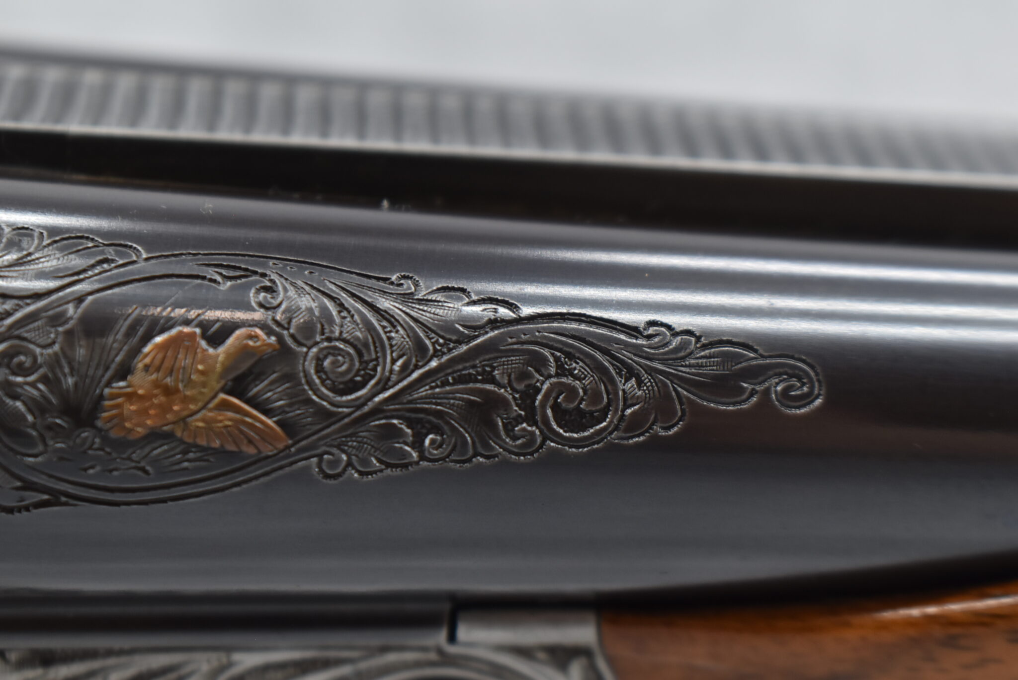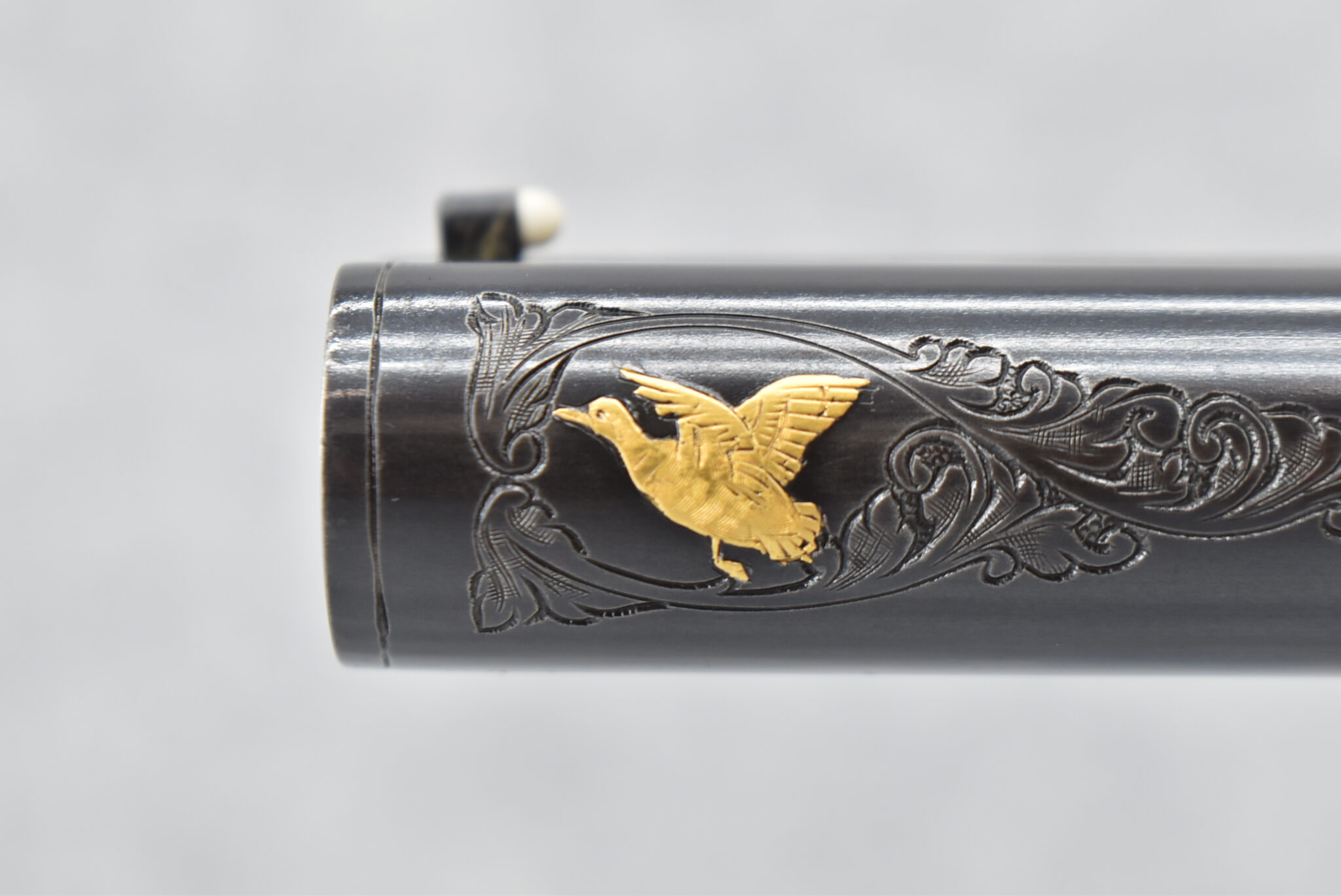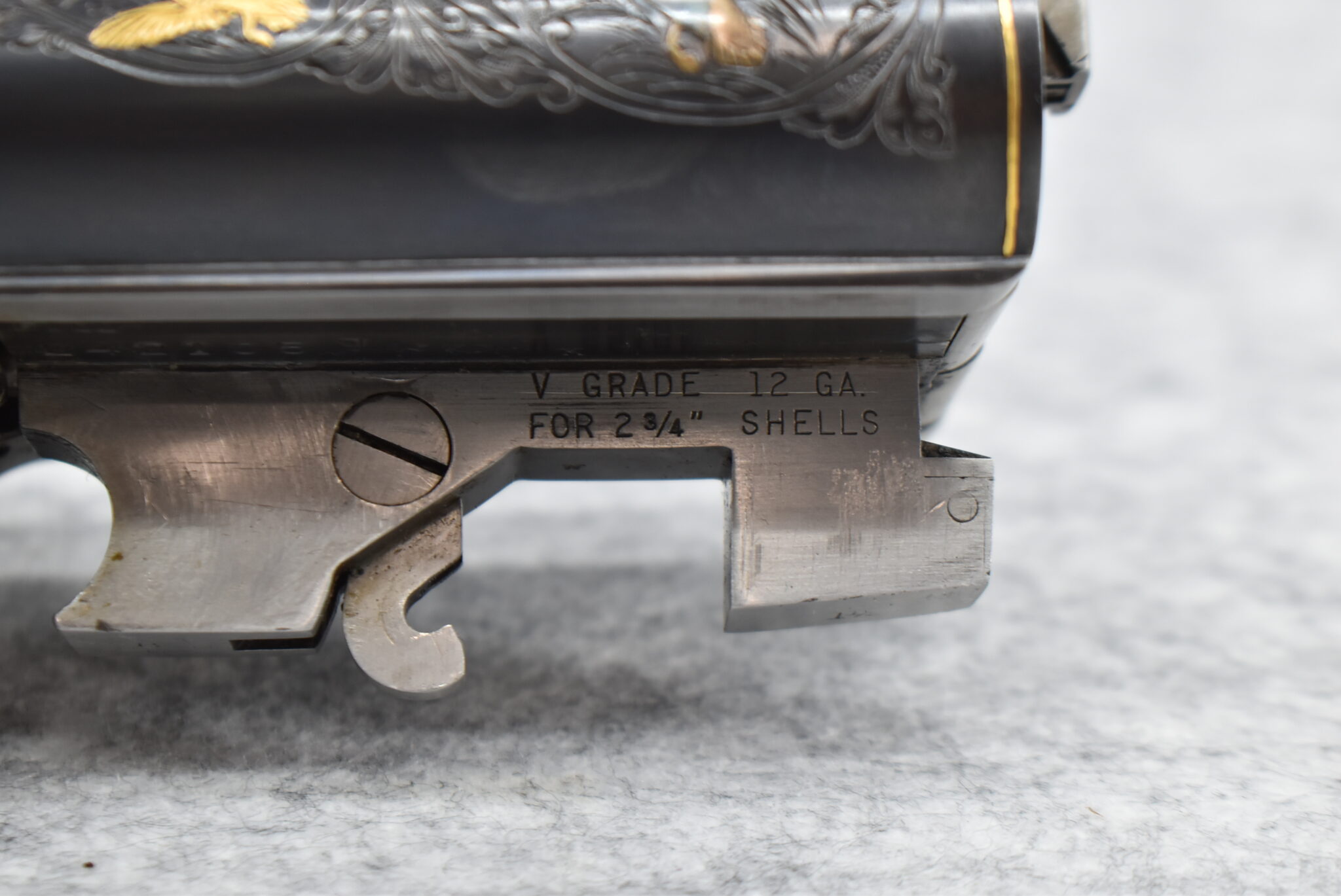 25R. Exceptional! Parker Bros. Custom Angelo Bee Signed & Engraved, Upgraded From VHE Grade 12ga. Side By Side Matching Numbered Two-Barrel Set Double Barrel Shotgun – Serial #242165 – 1st Set of Barrels Currently on the Gun Are 26” Solid Matted Rib w/Dual Bead Sights & Are Choked Improved Cylinder & Modified – 2nd Set of Barrels Are 30” Solid Matted Rib w/Dual Bead Sights & Choked Full & Modified – Both Sets of Barrels Serial Number to the Gun! – Both Sets of Barrels Have Strong Blued Finish & Receiver Has a Silver Finish – This Gun Has Been Professionally Custom Stocked by Top American Master Stock Maker Michael Yee w/Highly Figured AAA Grained, Fine Checked Straight Grip English Walnut Butt Stock w/Pachmayr Recoil Pad & Matching Fine Checkered AAA Grained English Walnut Beavertail Forearm – w/Single Selective Trigger – Gun Has Been Masterfully Engraved by Former Browning Master Engraver Angelo Bee – Each Barrel Has Been Engraved at the Breech & Muzzle w/A Total of 6 Relief 18K Yellow, Rose & White Gold Inlays Depicting Ducks & Quail w/A Scroll Pattern Between Both Ends – Breech End of Barrels Have Gold Wire Inlaid Border – Receiver is Heavy Scroll Engraved w/Gold Inlaid Hunting Scene, Underside Depicts a Bird Dog Holding A Game Bird in its Mouth & the Left Side Depicts a Fox Stalking Game Birds – Angelo Bee’s Signature Can Be Seen on the Left Side of the Receiver Below the Leading Duck – Gun is Cased in a Leather Covered Oak Two-Barrel Gun Case w/Canvas Outer w/Oiler & Set of Snap Caps – Minimum Wall Thickness Set #1 .035 on the Right Barrel, .035 on Left Barrel – Minimum Wall Thickness Set #2 .033 on Right Barrel, .035 on Left Barrel – This Gun is Truly a Museum Quality Piece That Displays The Masterful & Artistic Skill of Two Credited Craftsmen of the Gun World!