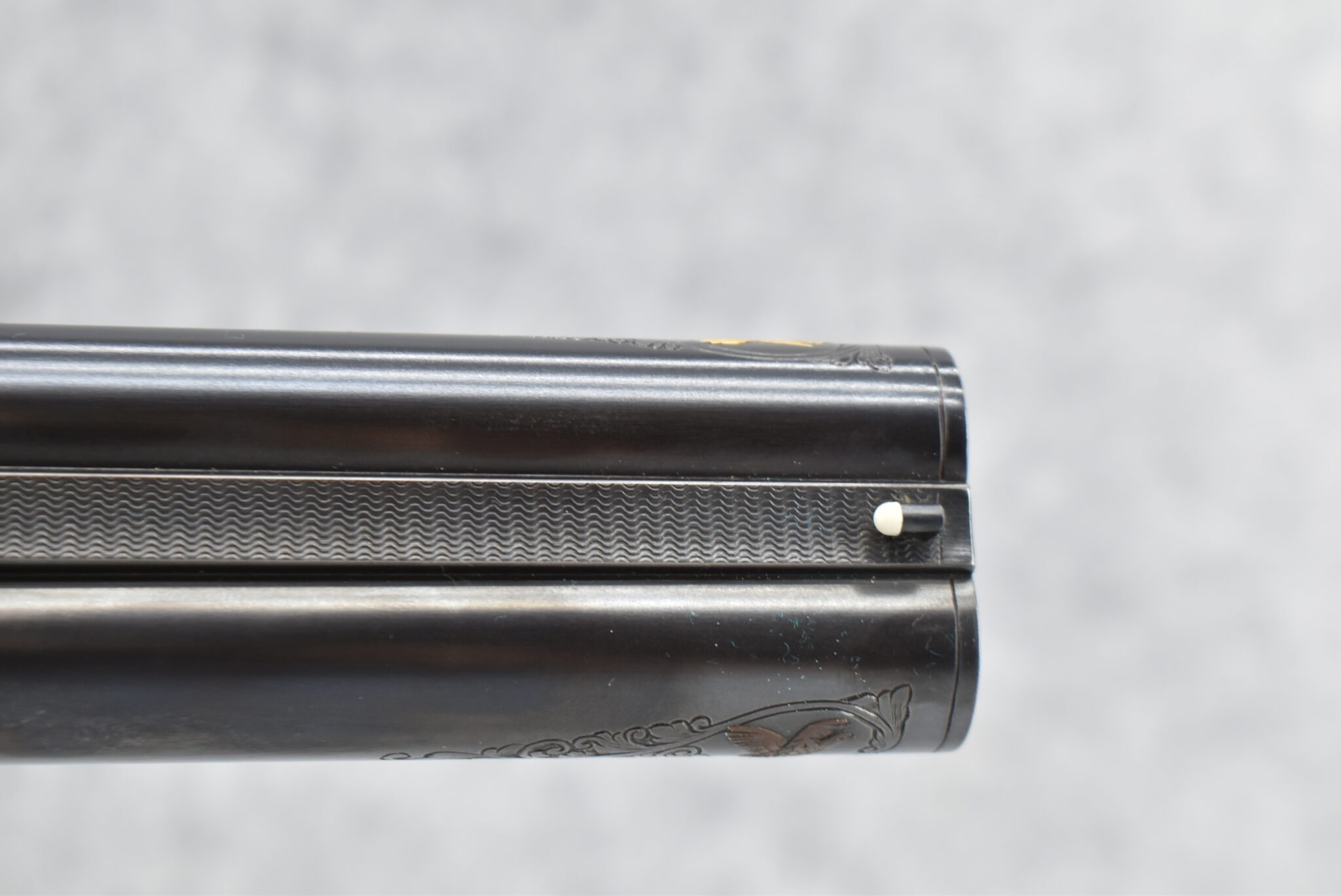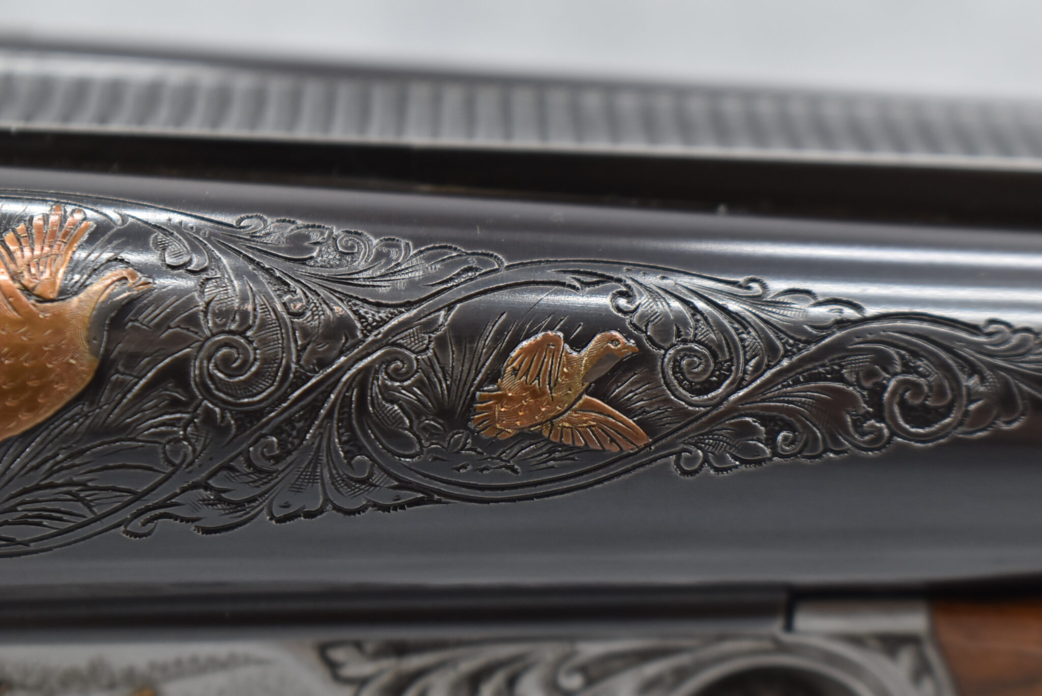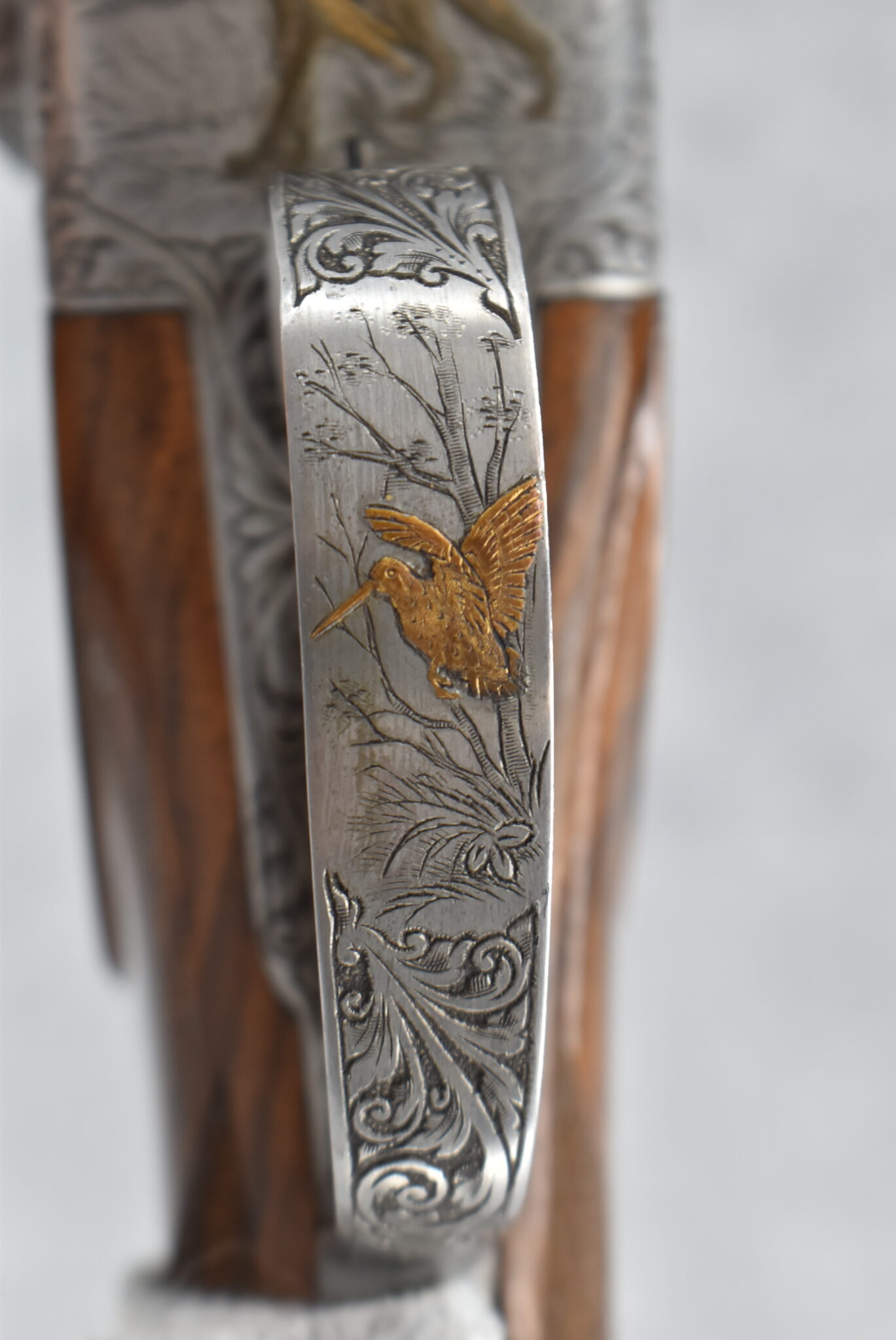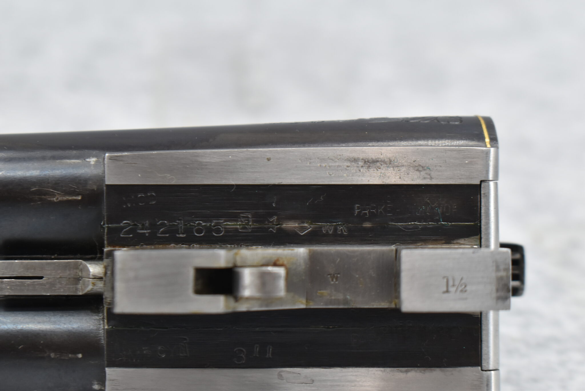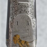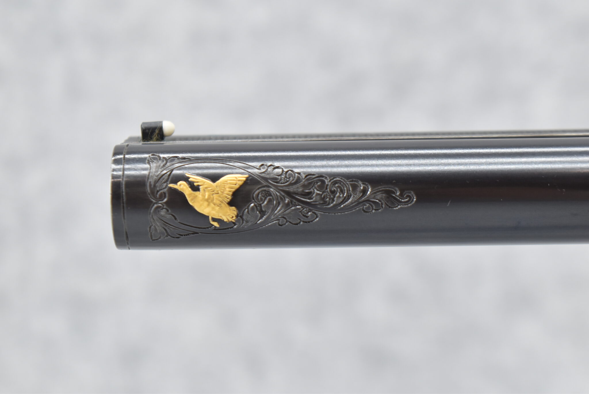 25R. Exceptional! Parker Bros. Custom Angelo Bee Signed & Engraved, Upgraded From VHE Grade 12ga. Side By Side Matching Numbered Two-Barrel Set Double Barrel Shotgun – Serial #242165 – 1st Set of Barrels Currently on the Gun Are 26” Solid Matted Rib w/Dual Bead Sights & Are Choked Improved Cylinder & Modified – 2nd Set of Barrels Are 30” Solid Matted Rib w/Dual Bead Sights & Choked Full & Modified – Both Sets of Barrels Serial Number to the Gun! – Both Sets of Barrels Have Strong Blued Finish & Receiver Has a Silver Finish – This Gun Has Been Professionally Custom Stocked by Top American Master Stock Maker Michael Yee w/Highly Figured AAA Grained, Fine Checked Straight Grip English Walnut Butt Stock w/Pachmayr Recoil Pad & Matching Fine Checkered AAA Grained English Walnut Beavertail Forearm – w/Single Selective Trigger – Gun Has Been Masterfully Engraved by Former Browning Master Engraver Angelo Bee – Each Barrel Has Been Engraved at the Breech & Muzzle w/A Total of 6 Relief 18K Yellow, Rose & White Gold Inlays Depicting Ducks & Quail w/A Scroll Pattern Between Both Ends – Breech End of Barrels Have Gold Wire Inlaid Border – Receiver is Heavy Scroll Engraved w/Gold Inlaid Hunting Scene, Underside Depicts a Bird Dog Holding A Game Bird in its Mouth & the Left Side Depicts a Fox Stalking Game Birds – Angelo Bee’s Signature Can Be Seen on the Left Side of the Receiver Below the Leading Duck – Gun is Cased in a Leather Covered Oak Two-Barrel Gun Case w/Canvas Outer w/Oiler & Set of Snap Caps – Minimum Wall Thickness Set #1 .035 on the Right Barrel, .035 on Left Barrel – Minimum Wall Thickness Set #2 .033 on Right Barrel, .035 on Left Barrel – This Gun is Truly a Museum Quality Piece That Displays The Masterful & Artistic Skill of Two Credited Craftsmen of the Gun World!