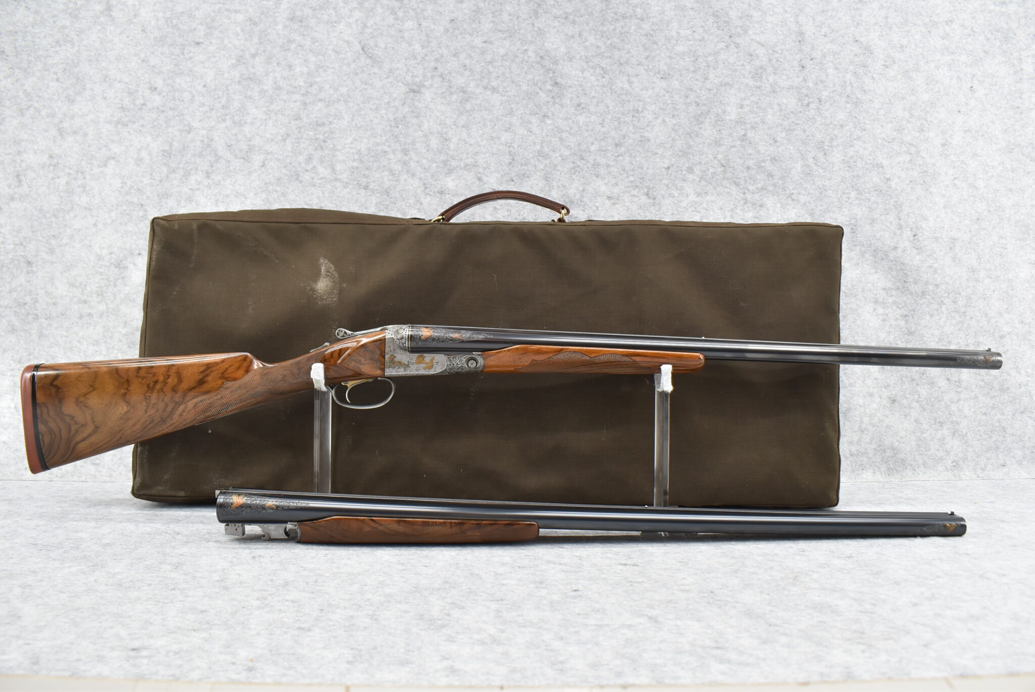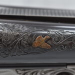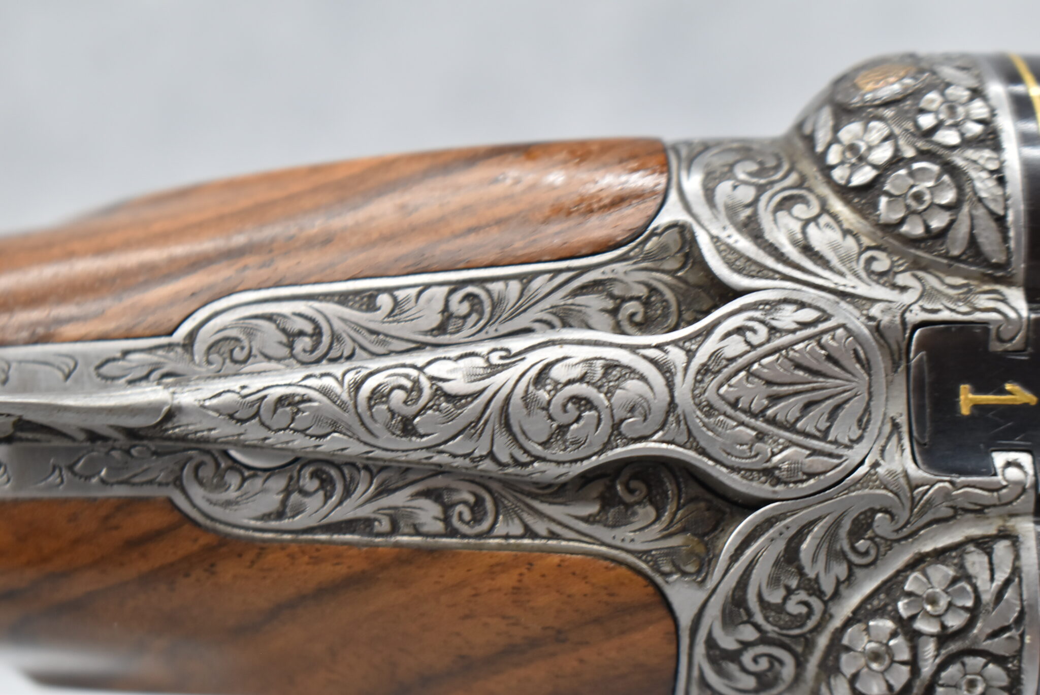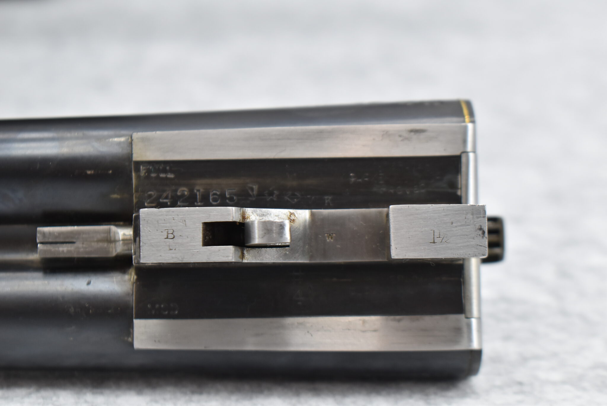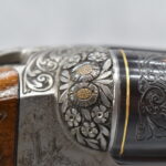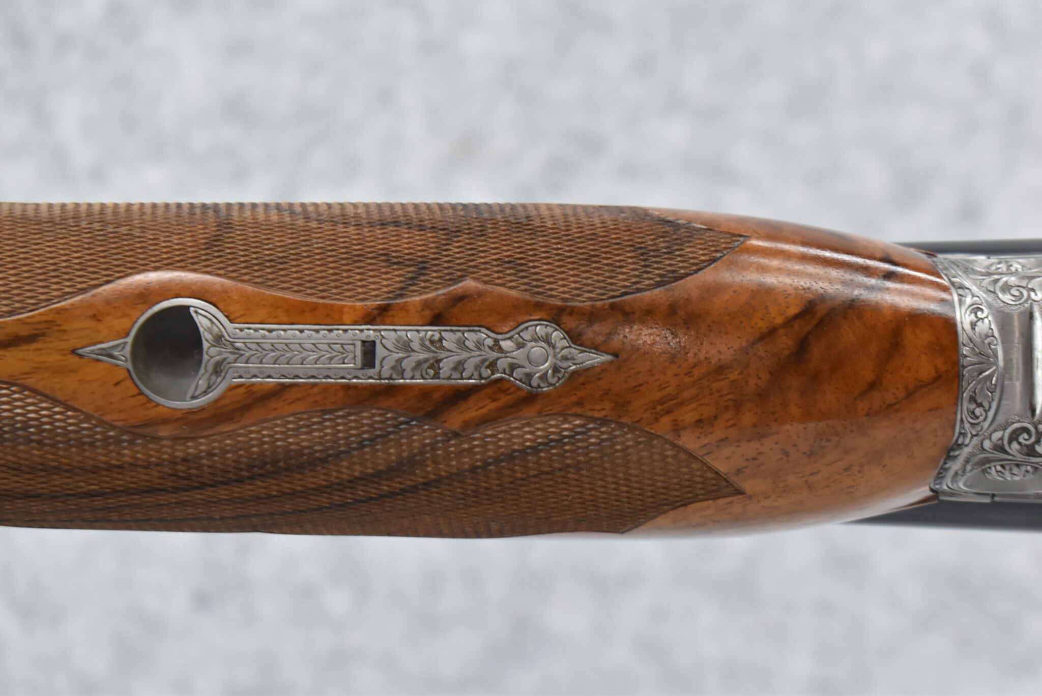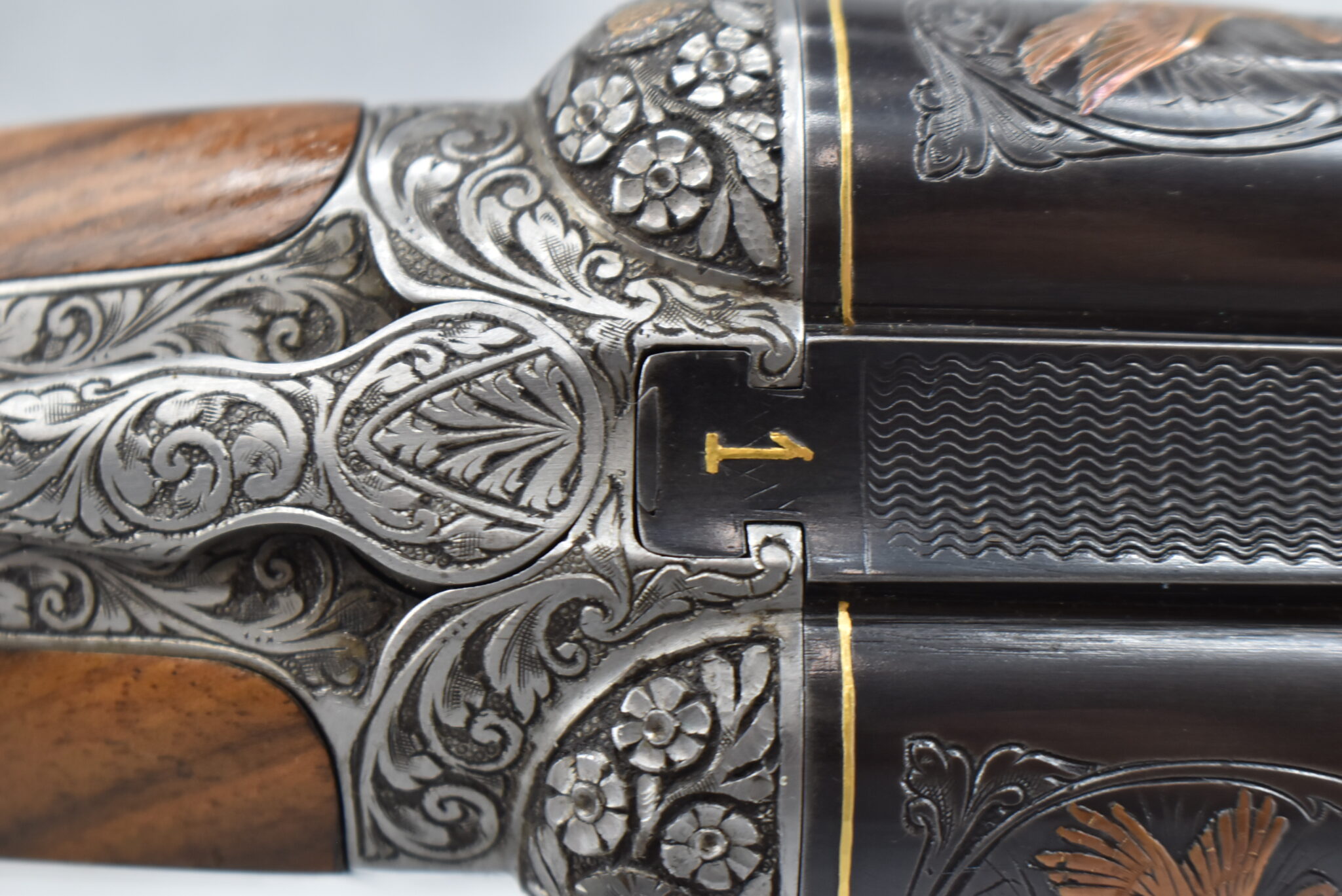 25R. Exceptional! Parker Bros. Custom Angelo Bee Signed & Engraved, Upgraded From VHE Grade 12ga. Side By Side Matching Numbered Two-Barrel Set Double Barrel Shotgun – Serial #242165 – 1st Set of Barrels Currently on the Gun Are 26” Solid Matted Rib w/Dual Bead Sights & Are Choked Improved Cylinder & Modified – 2nd Set of Barrels Are 30” Solid Matted Rib w/Dual Bead Sights & Choked Full & Modified – Both Sets of Barrels Serial Number to the Gun! – Both Sets of Barrels Have Strong Blued Finish & Receiver Has a Silver Finish – This Gun Has Been Professionally Custom Stocked by Top American Master Stock Maker Michael Yee w/Highly Figured AAA Grained, Fine Checked Straight Grip English Walnut Butt Stock w/Pachmayr Recoil Pad & Matching Fine Checkered AAA Grained English Walnut Beavertail Forearm – w/Single Selective Trigger – Gun Has Been Masterfully Engraved by Former Browning Master Engraver Angelo Bee – Each Barrel Has Been Engraved at the Breech & Muzzle w/A Total of 6 Relief 18K Yellow, Rose & White Gold Inlays Depicting Ducks & Quail w/A Scroll Pattern Between Both Ends – Breech End of Barrels Have Gold Wire Inlaid Border – Receiver is Heavy Scroll Engraved w/Gold Inlaid Hunting Scene, Underside Depicts a Bird Dog Holding A Game Bird in its Mouth & the Left Side Depicts a Fox Stalking Game Birds – Angelo Bee’s Signature Can Be Seen on the Left Side of the Receiver Below the Leading Duck – Gun is Cased in a Leather Covered Oak Two-Barrel Gun Case w/Canvas Outer w/Oiler & Set of Snap Caps – Minimum Wall Thickness Set #1 .035 on the Right Barrel, .035 on Left Barrel – Minimum Wall Thickness Set #2 .033 on Right Barrel, .035 on Left Barrel – This Gun is Truly a Museum Quality Piece That Displays The Masterful & Artistic Skill of Two Credited Craftsmen of the Gun World!