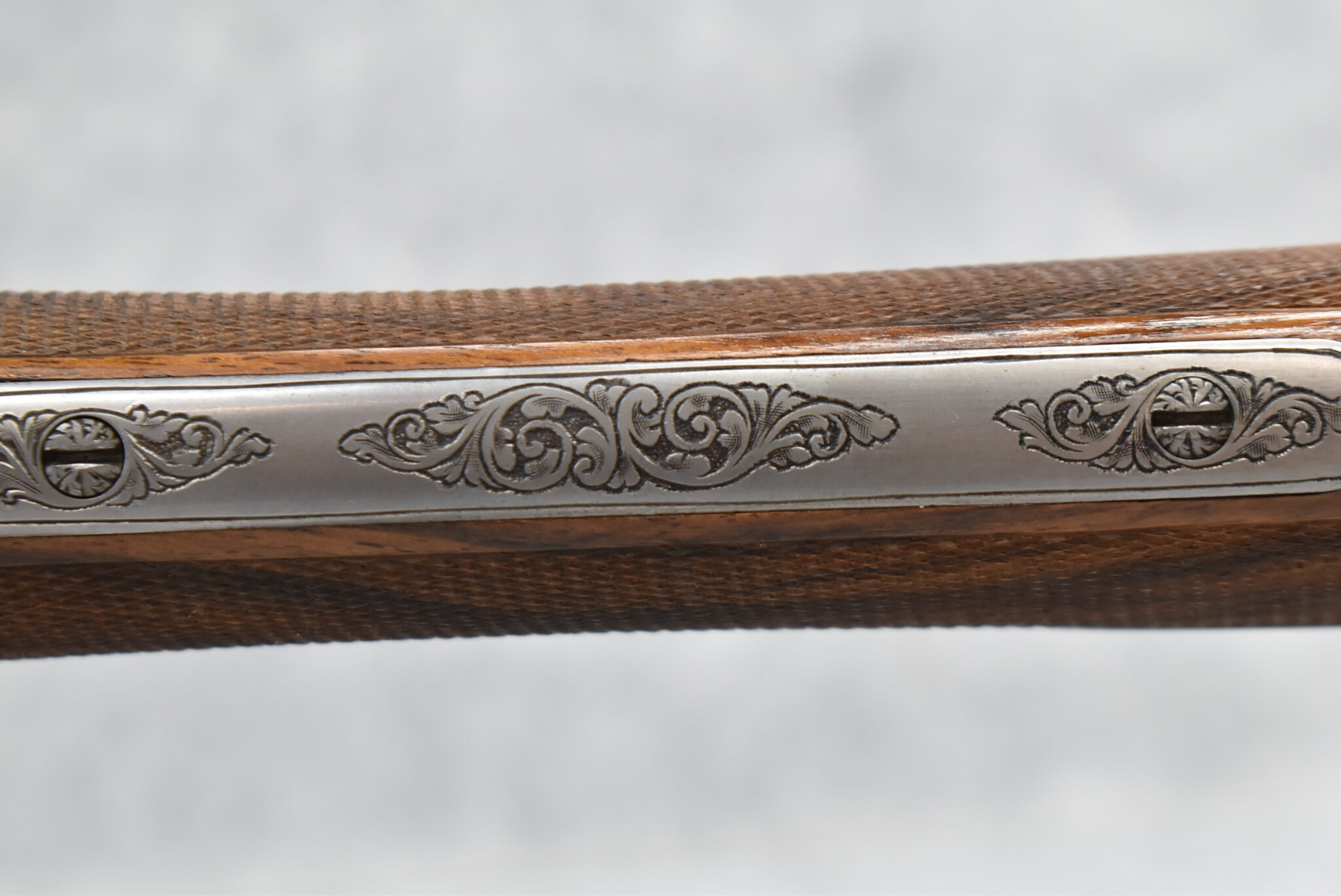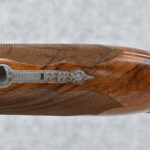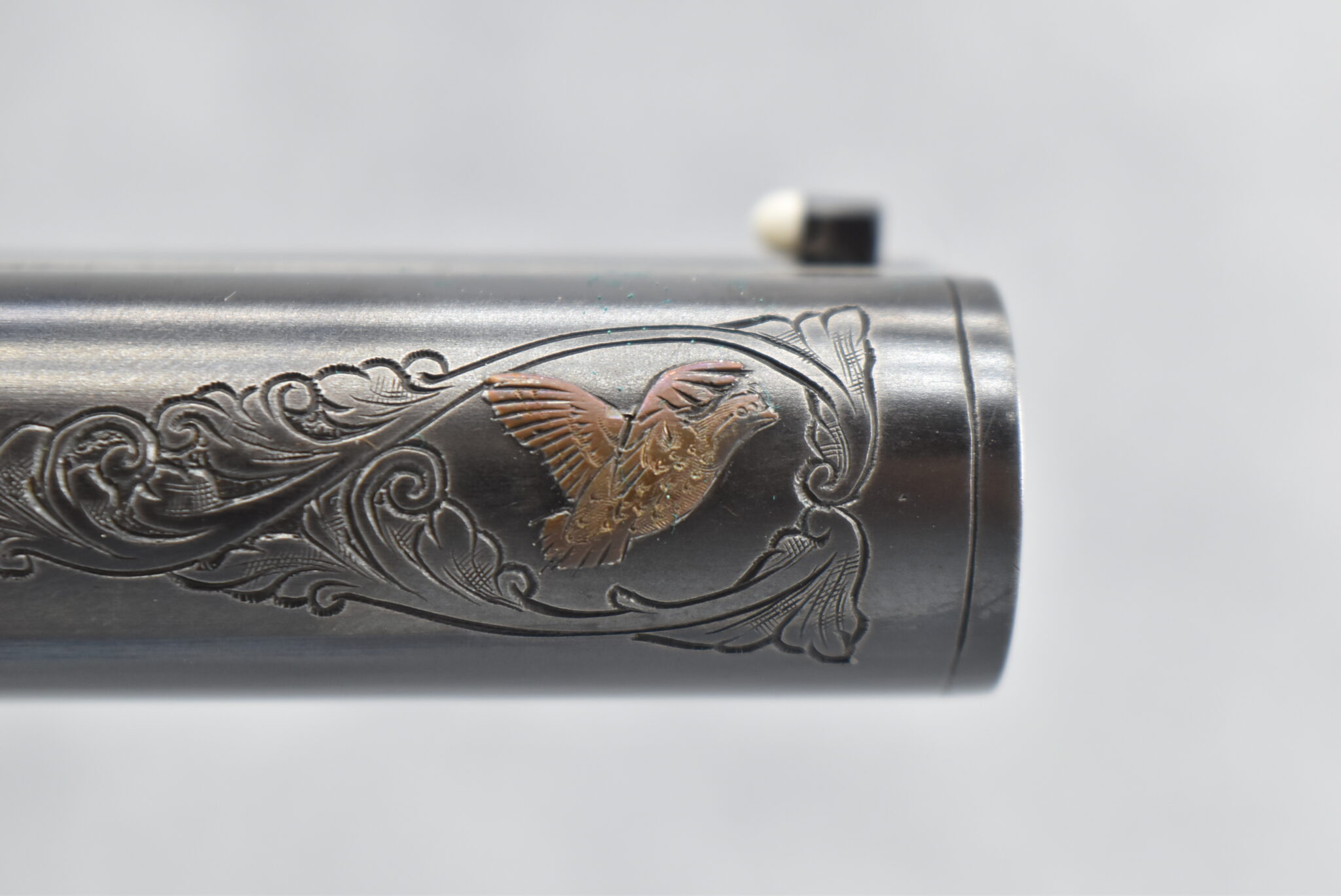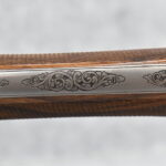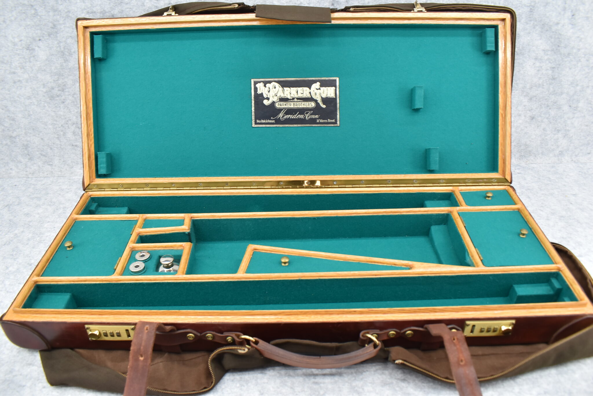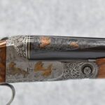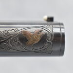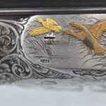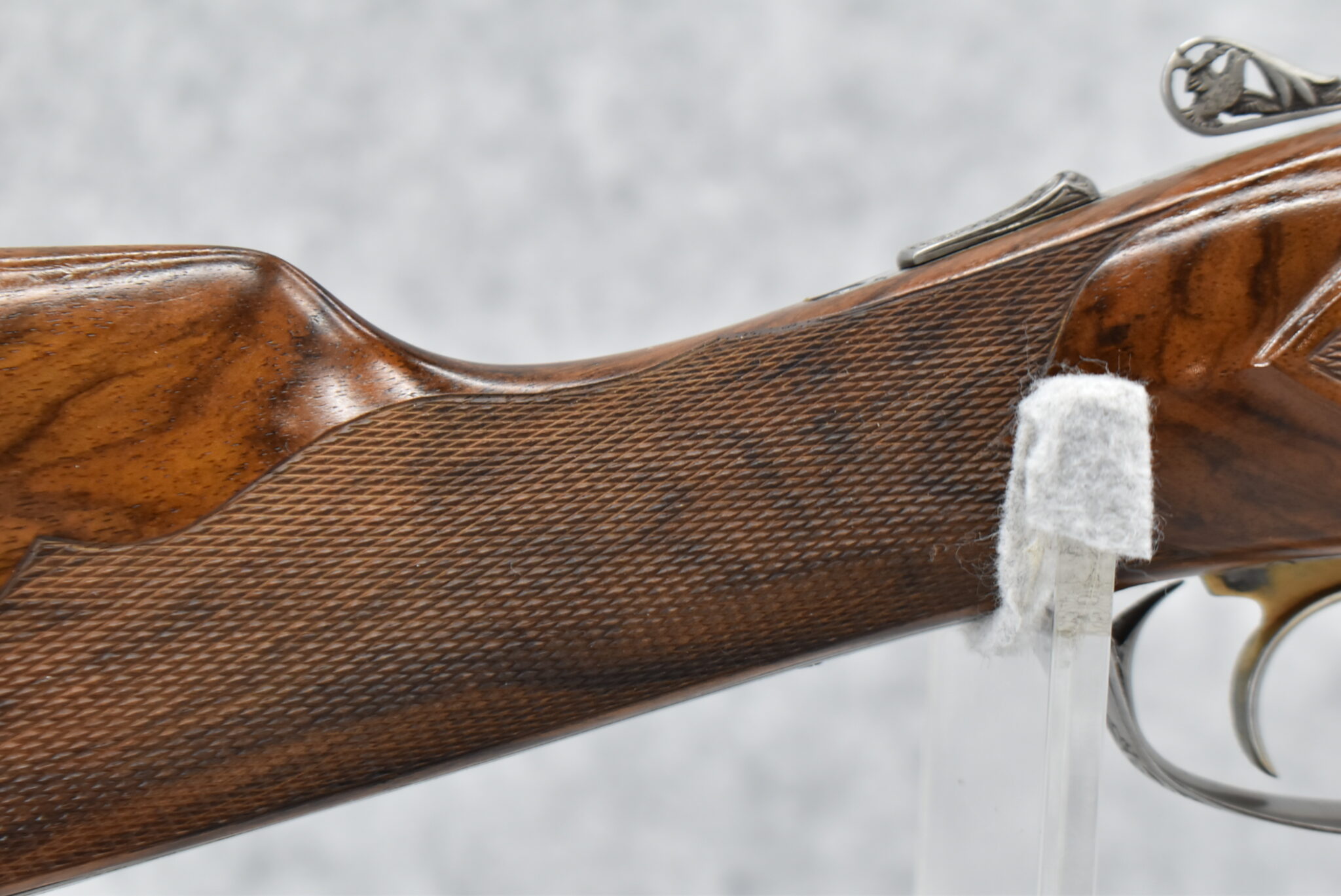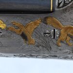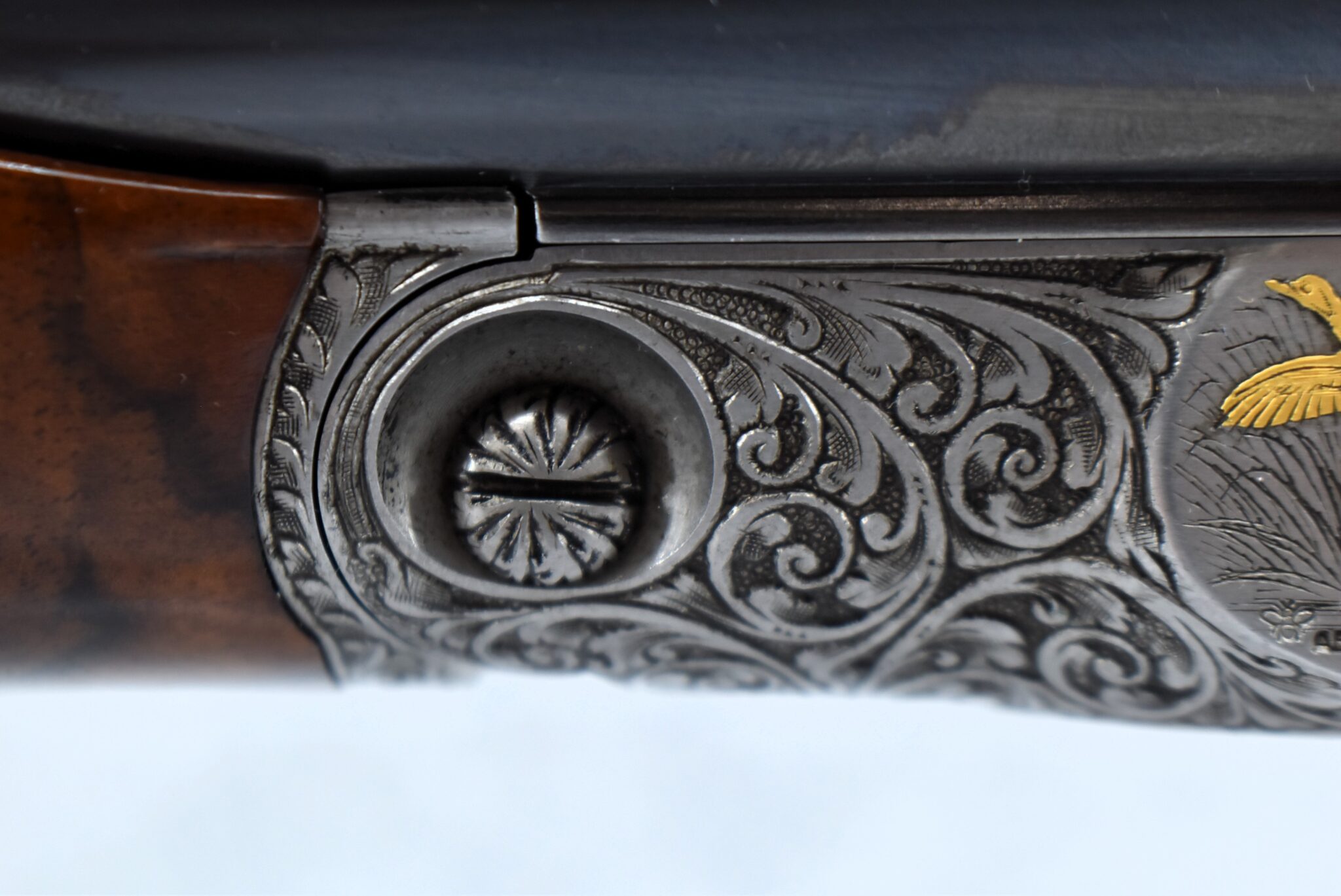 25R. Exceptional! Parker Bros. Custom Angelo Bee Signed & Engraved, Upgraded From VHE Grade 12ga. Side By Side Matching Numbered Two-Barrel Set Double Barrel Shotgun – Serial #242165 – 1st Set of Barrels Currently on the Gun Are 26” Solid Matted Rib w/Dual Bead Sights & Are Choked Improved Cylinder & Modified – 2nd Set of Barrels Are 30” Solid Matted Rib w/Dual Bead Sights & Choked Full & Modified – Both Sets of Barrels Serial Number to the Gun! – Both Sets of Barrels Have Strong Blued Finish & Receiver Has a Silver Finish – This Gun Has Been Professionally Custom Stocked by Top American Master Stock Maker Michael Yee w/Highly Figured AAA Grained, Fine Checked Straight Grip English Walnut Butt Stock w/Pachmayr Recoil Pad & Matching Fine Checkered AAA Grained English Walnut Beavertail Forearm – w/Single Selective Trigger – Gun Has Been Masterfully Engraved by Former Browning Master Engraver Angelo Bee – Each Barrel Has Been Engraved at the Breech & Muzzle w/A Total of 6 Relief 18K Yellow, Rose & White Gold Inlays Depicting Ducks & Quail w/A Scroll Pattern Between Both Ends – Breech End of Barrels Have Gold Wire Inlaid Border – Receiver is Heavy Scroll Engraved w/Gold Inlaid Hunting Scene, Underside Depicts a Bird Dog Holding A Game Bird in its Mouth & the Left Side Depicts a Fox Stalking Game Birds – Angelo Bee’s Signature Can Be Seen on the Left Side of the Receiver Below the Leading Duck – Gun is Cased in a Leather Covered Oak Two-Barrel Gun Case w/Canvas Outer w/Oiler & Set of Snap Caps – Minimum Wall Thickness Set #1 .035 on the Right Barrel, .035 on Left Barrel – Minimum Wall Thickness Set #2 .033 on Right Barrel, .035 on Left Barrel – This Gun is Truly a Museum Quality Piece That Displays The Masterful & Artistic Skill of Two Credited Craftsmen of the Gun World!