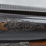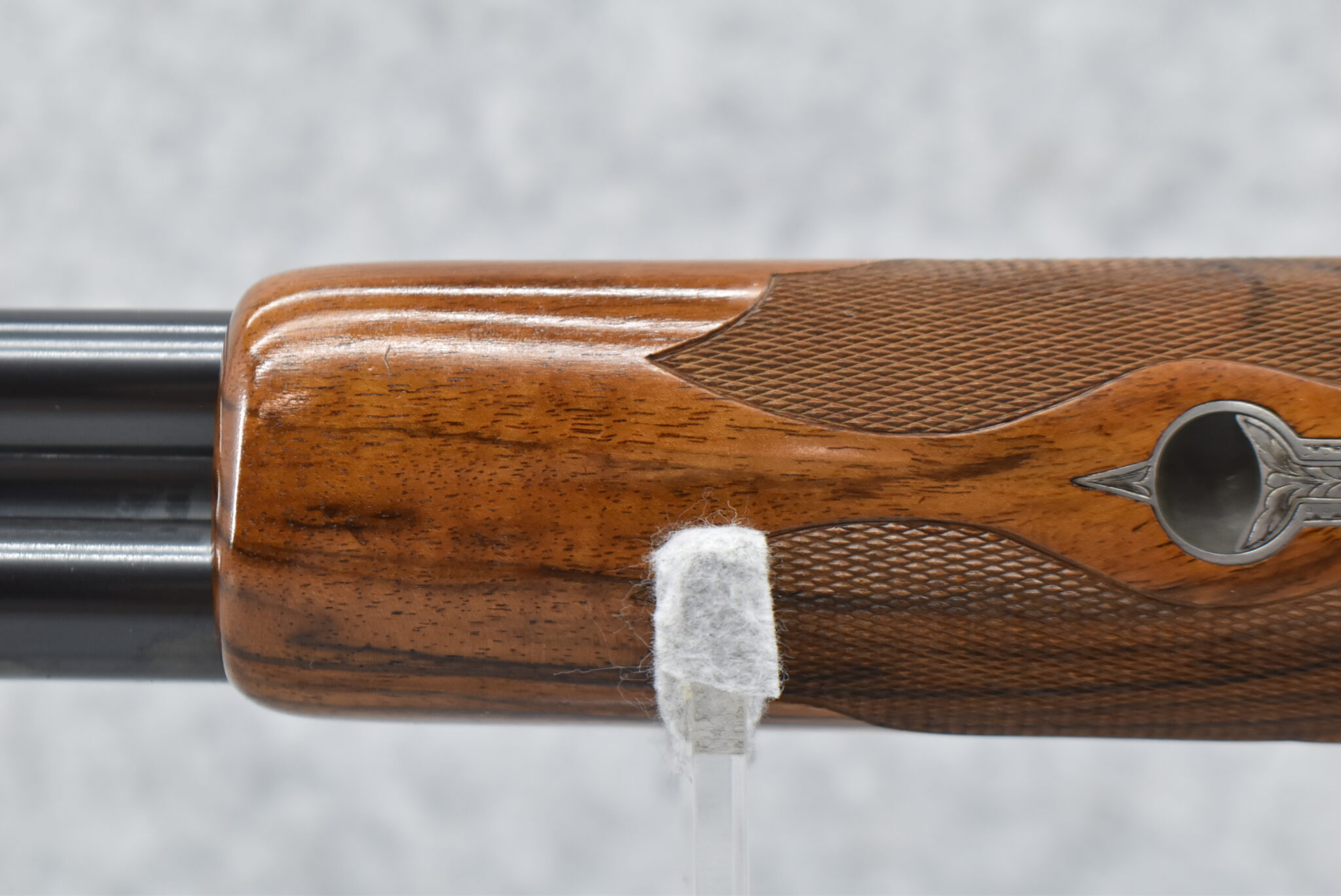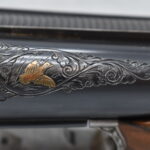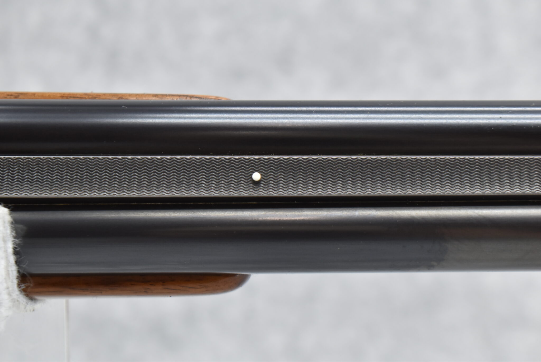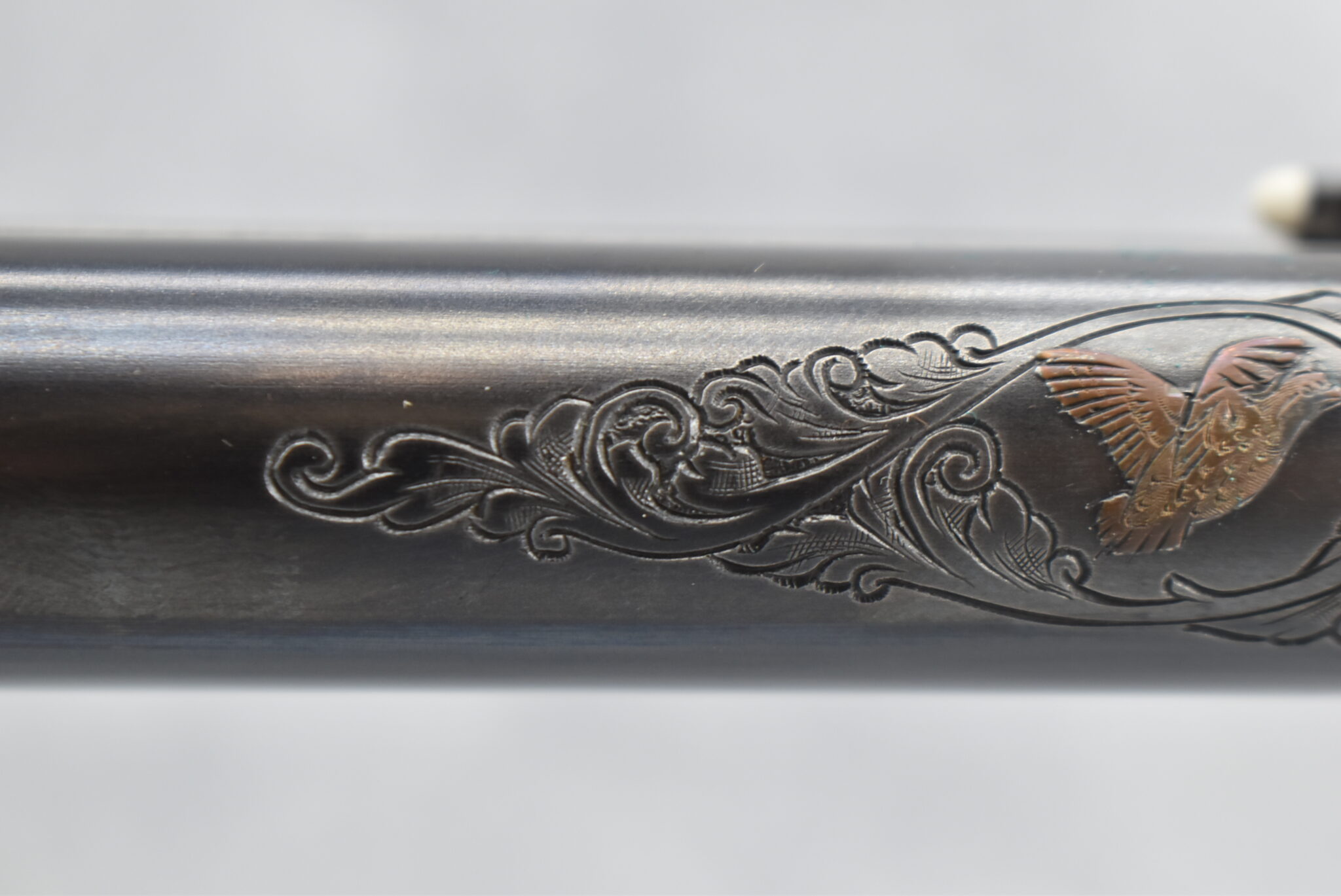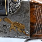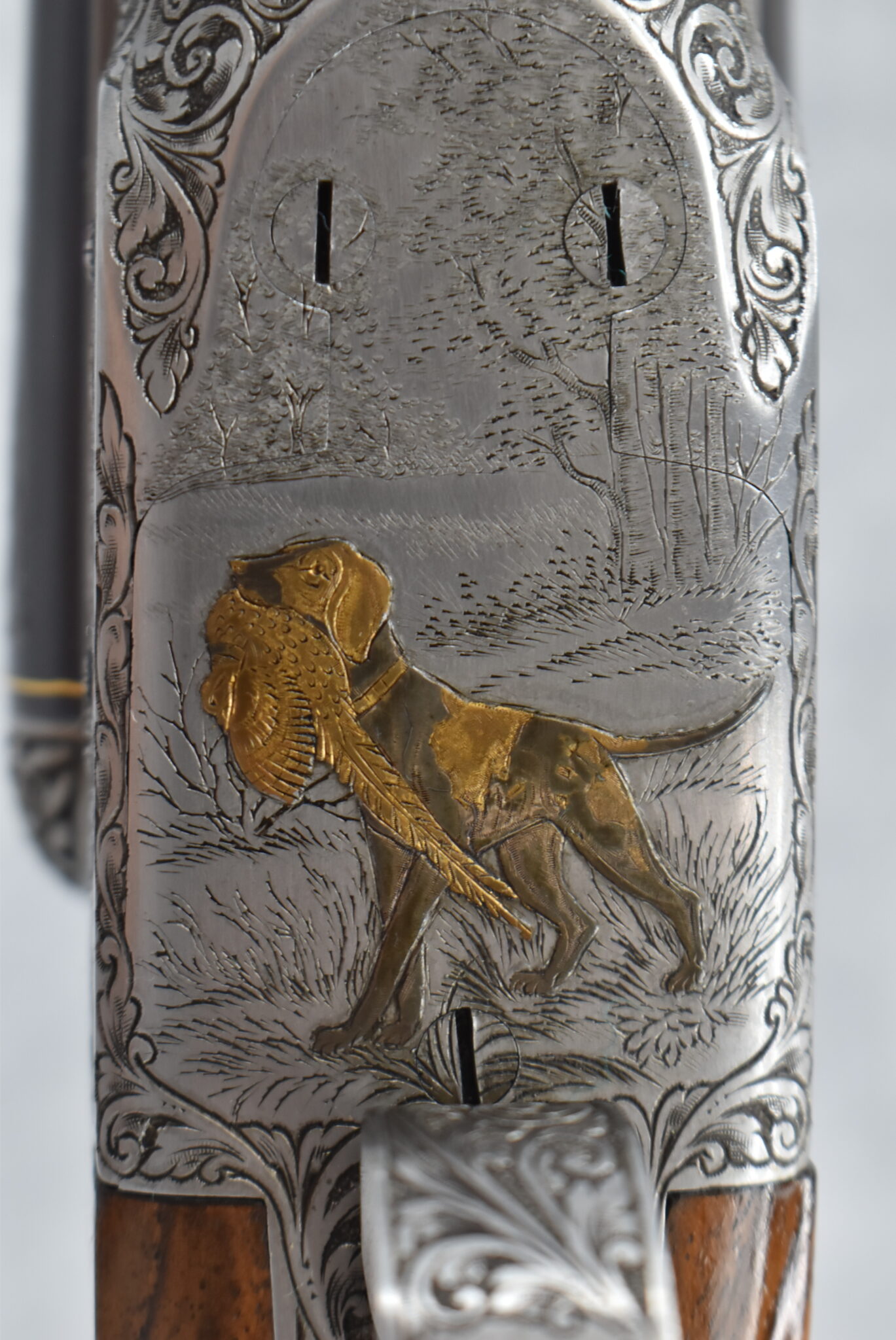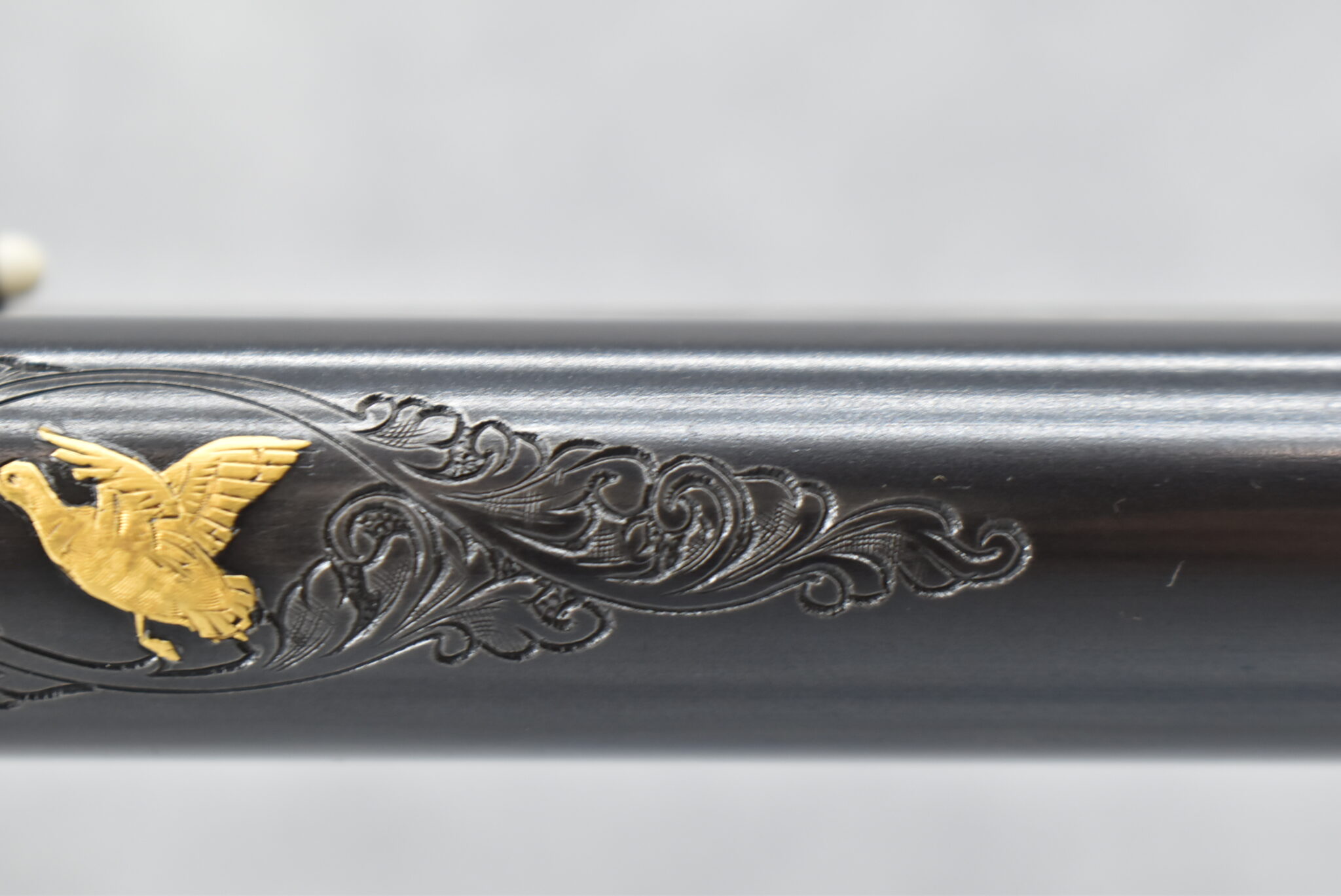 25R. Exceptional! Parker Bros. Custom Angelo Bee Signed & Engraved, Upgraded From VHE Grade 12ga. Side By Side Matching Numbered Two-Barrel Set Double Barrel Shotgun – Serial #242165 – 1st Set of Barrels Currently on the Gun Are 26” Solid Matted Rib w/Dual Bead Sights & Are Choked Improved Cylinder & Modified – 2nd Set of Barrels Are 30” Solid Matted Rib w/Dual Bead Sights & Choked Full & Modified – Both Sets of Barrels Serial Number to the Gun! – Both Sets of Barrels Have Strong Blued Finish & Receiver Has a Silver Finish – This Gun Has Been Professionally Custom Stocked by Top American Master Stock Maker Michael Yee w/Highly Figured AAA Grained, Fine Checked Straight Grip English Walnut Butt Stock w/Pachmayr Recoil Pad & Matching Fine Checkered AAA Grained English Walnut Beavertail Forearm – w/Single Selective Trigger – Gun Has Been Masterfully Engraved by Former Browning Master Engraver Angelo Bee – Each Barrel Has Been Engraved at the Breech & Muzzle w/A Total of 6 Relief 18K Yellow, Rose & White Gold Inlays Depicting Ducks & Quail w/A Scroll Pattern Between Both Ends – Breech End of Barrels Have Gold Wire Inlaid Border – Receiver is Heavy Scroll Engraved w/Gold Inlaid Hunting Scene, Underside Depicts a Bird Dog Holding A Game Bird in its Mouth & the Left Side Depicts a Fox Stalking Game Birds – Angelo Bee’s Signature Can Be Seen on the Left Side of the Receiver Below the Leading Duck – Gun is Cased in a Leather Covered Oak Two-Barrel Gun Case w/Canvas Outer w/Oiler & Set of Snap Caps – Minimum Wall Thickness Set #1 .035 on the Right Barrel, .035 on Left Barrel – Minimum Wall Thickness Set #2 .033 on Right Barrel, .035 on Left Barrel – This Gun is Truly a Museum Quality Piece That Displays The Masterful & Artistic Skill of Two Credited Craftsmen of the Gun World!