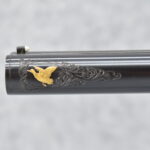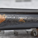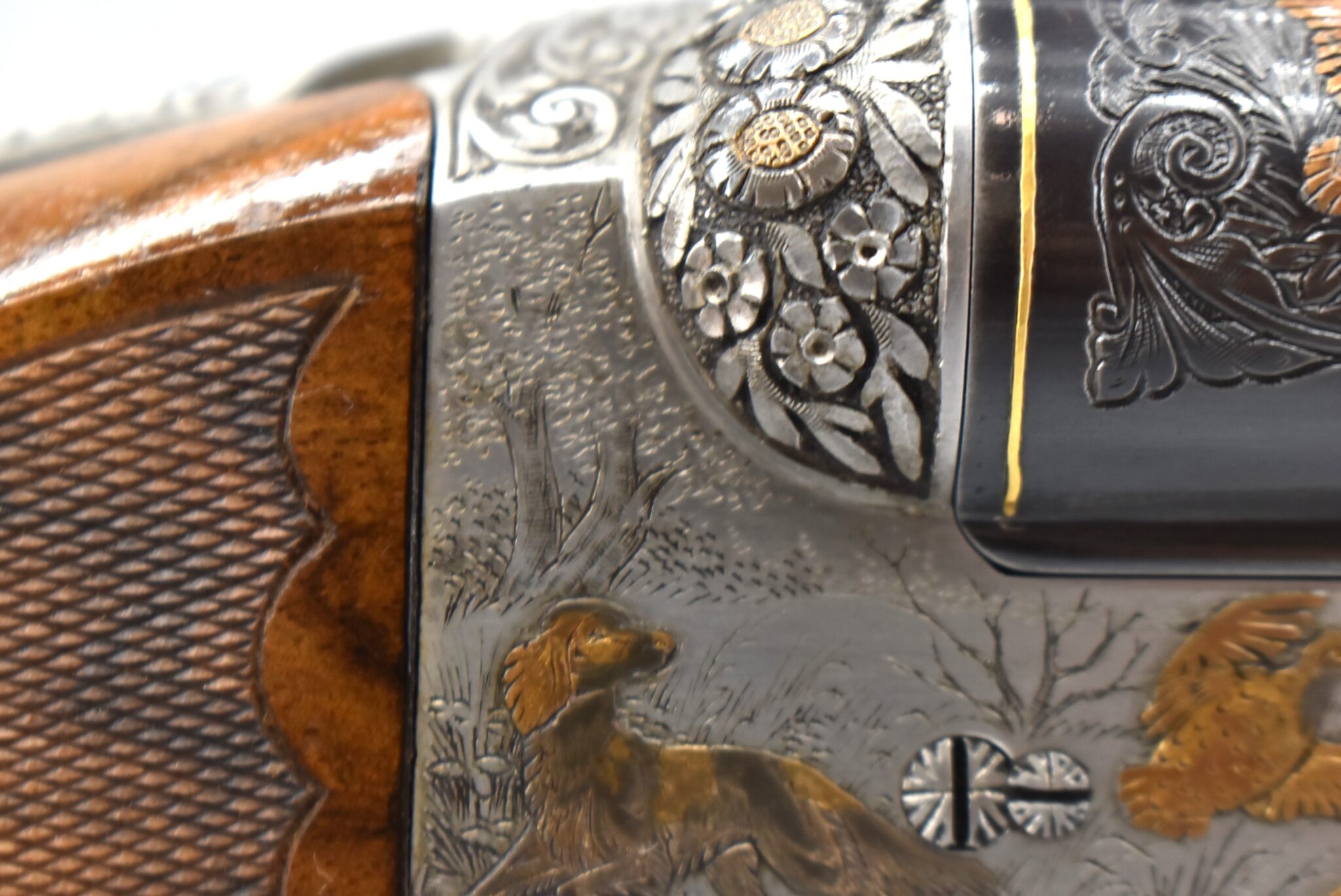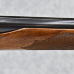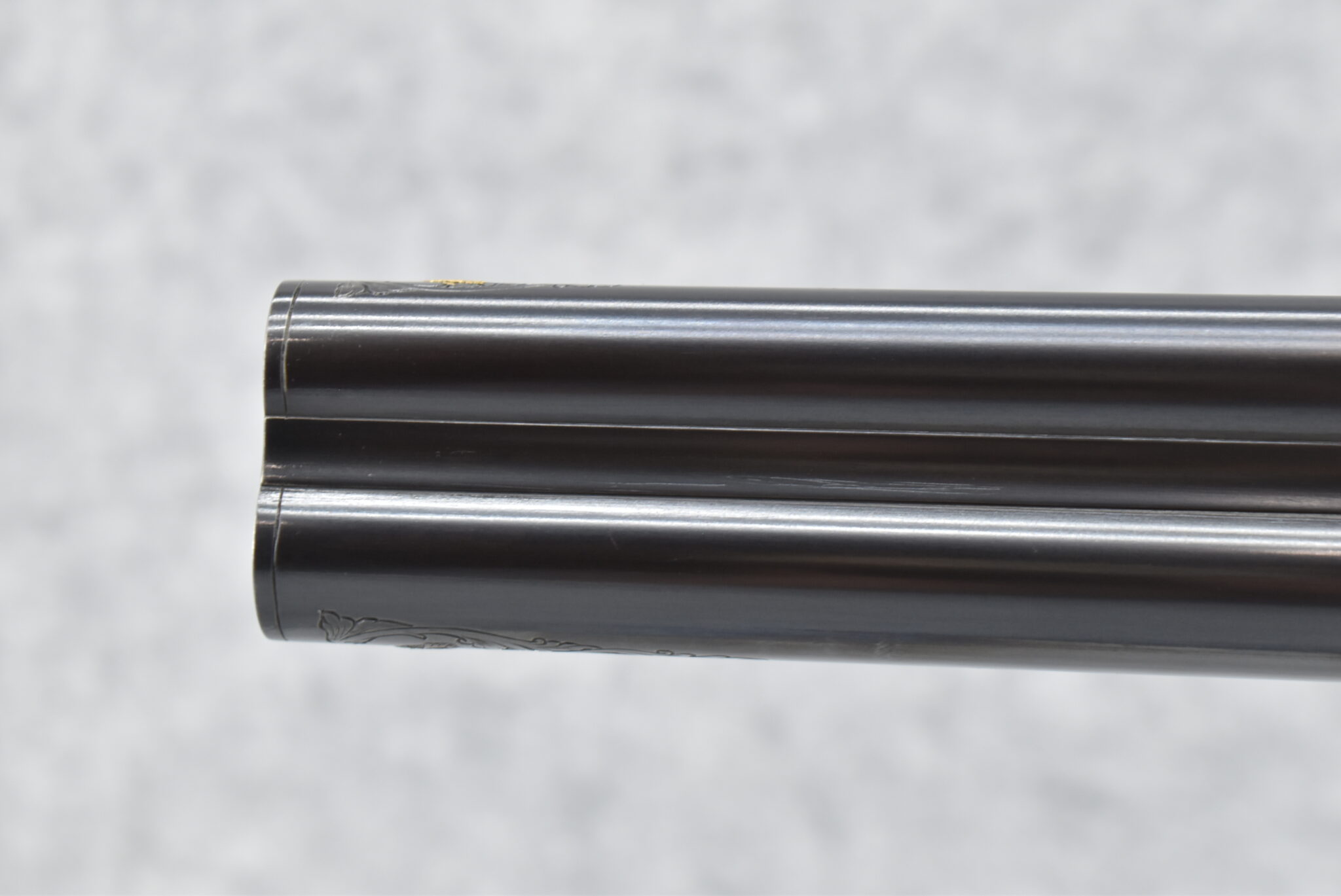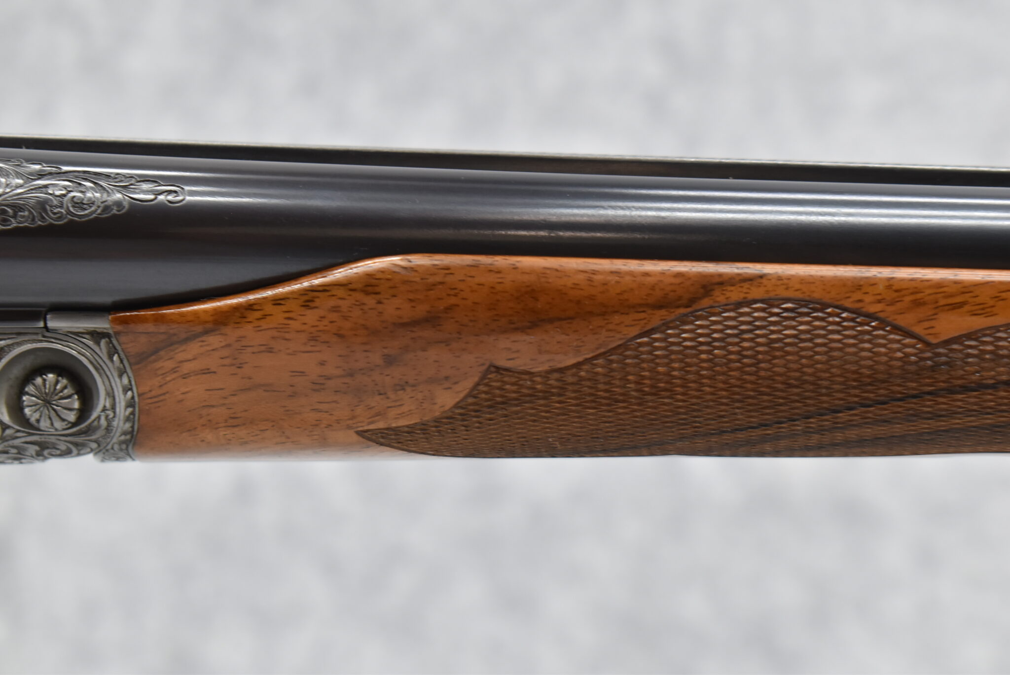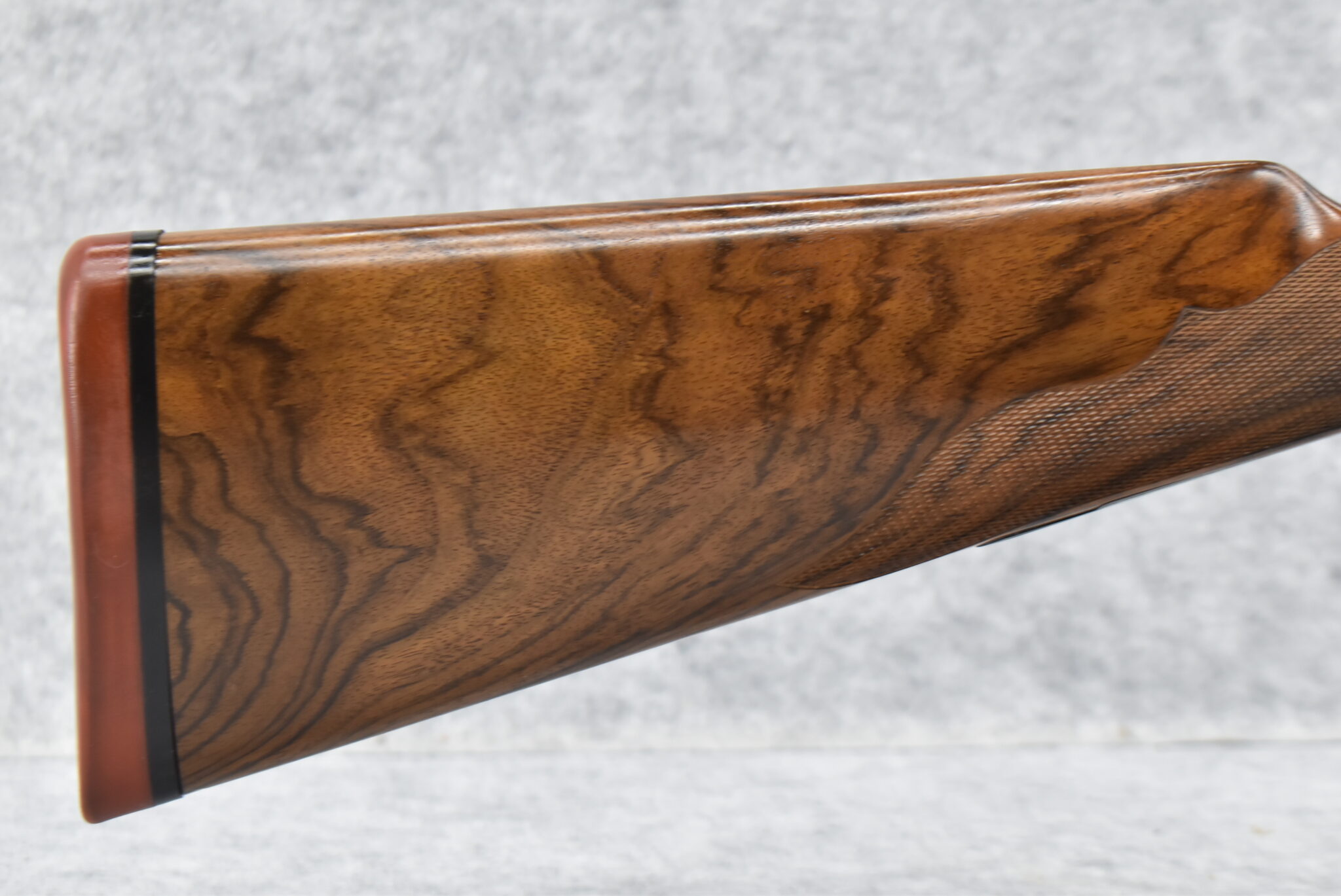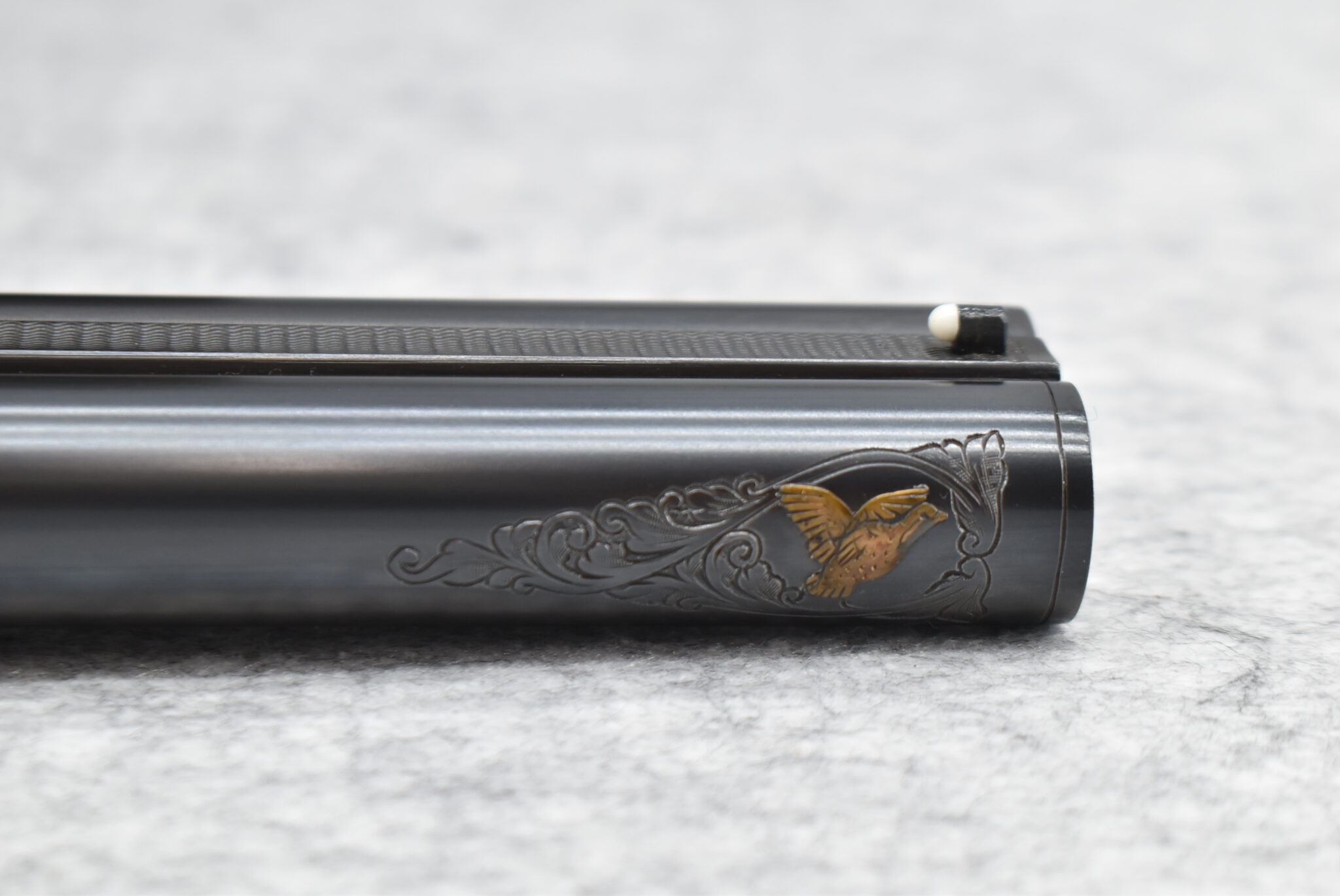 25R. Exceptional! Parker Bros. Custom Angelo Bee Signed & Engraved, Upgraded From VHE Grade 12ga. Side By Side Matching Numbered Two-Barrel Set Double Barrel Shotgun – Serial #242165 – 1st Set of Barrels Currently on the Gun Are 26” Solid Matted Rib w/Dual Bead Sights & Are Choked Improved Cylinder & Modified – 2nd Set of Barrels Are 30” Solid Matted Rib w/Dual Bead Sights & Choked Full & Modified – Both Sets of Barrels Serial Number to the Gun! – Both Sets of Barrels Have Strong Blued Finish & Receiver Has a Silver Finish – This Gun Has Been Professionally Custom Stocked by Top American Master Stock Maker Michael Yee w/Highly Figured AAA Grained, Fine Checked Straight Grip English Walnut Butt Stock w/Pachmayr Recoil Pad & Matching Fine Checkered AAA Grained English Walnut Beavertail Forearm – w/Single Selective Trigger – Gun Has Been Masterfully Engraved by Former Browning Master Engraver Angelo Bee – Each Barrel Has Been Engraved at the Breech & Muzzle w/A Total of 6 Relief 18K Yellow, Rose & White Gold Inlays Depicting Ducks & Quail w/A Scroll Pattern Between Both Ends – Breech End of Barrels Have Gold Wire Inlaid Border – Receiver is Heavy Scroll Engraved w/Gold Inlaid Hunting Scene, Underside Depicts a Bird Dog Holding A Game Bird in its Mouth & the Left Side Depicts a Fox Stalking Game Birds – Angelo Bee’s Signature Can Be Seen on the Left Side of the Receiver Below the Leading Duck – Gun is Cased in a Leather Covered Oak Two-Barrel Gun Case w/Canvas Outer w/Oiler & Set of Snap Caps – Minimum Wall Thickness Set #1 .035 on the Right Barrel, .035 on Left Barrel – Minimum Wall Thickness Set #2 .033 on Right Barrel, .035 on Left Barrel – This Gun is Truly a Museum Quality Piece That Displays The Masterful & Artistic Skill of Two Credited Craftsmen of the Gun World!