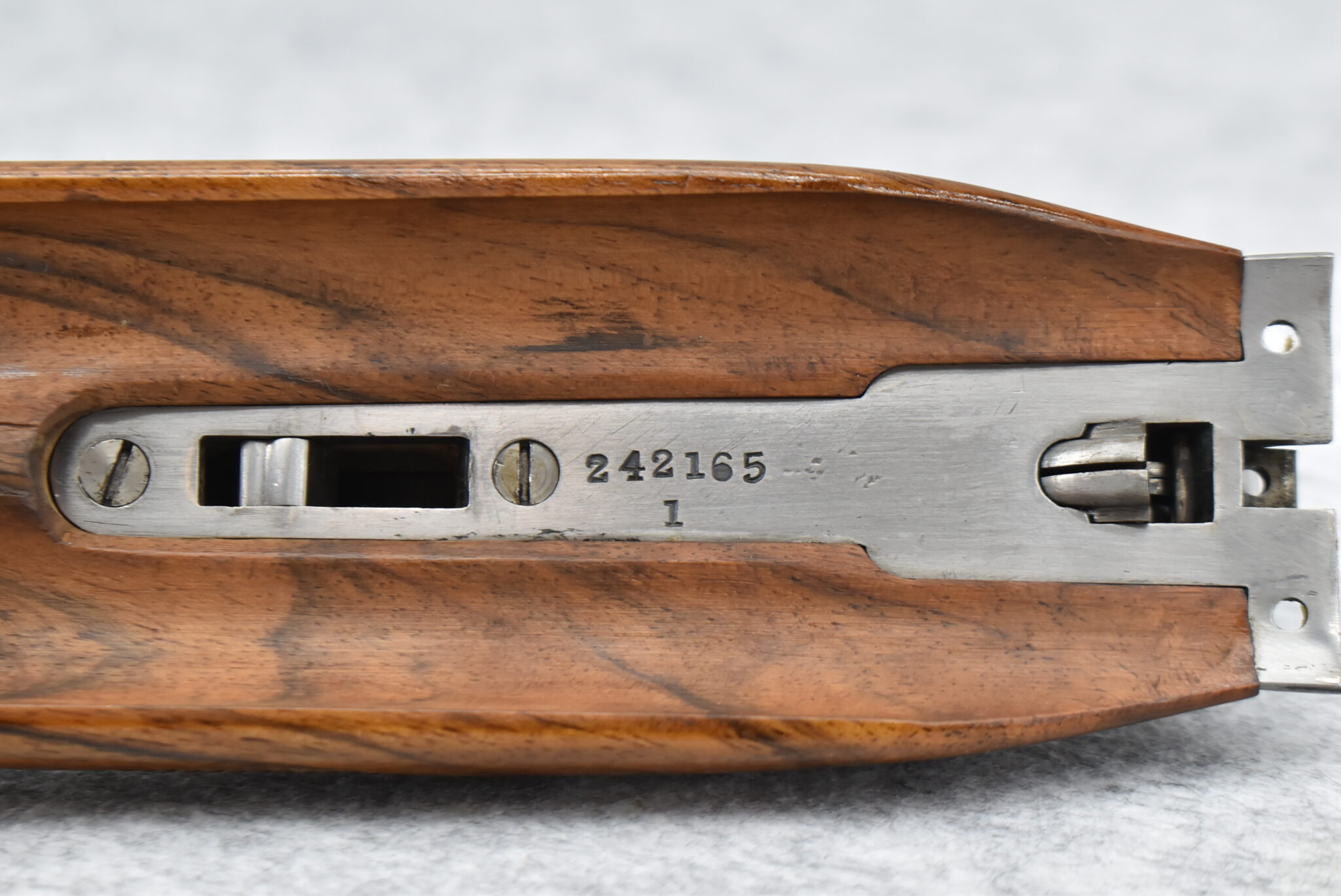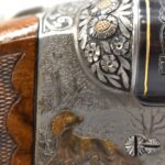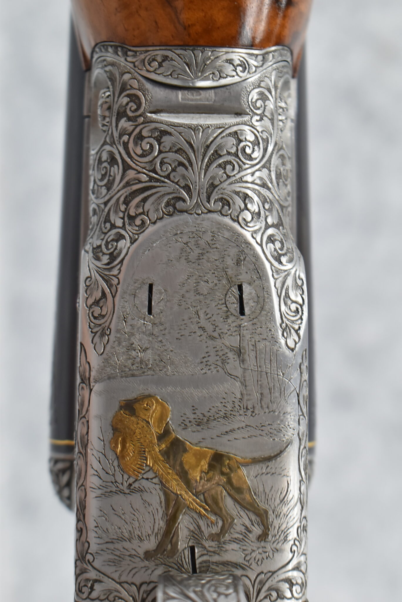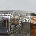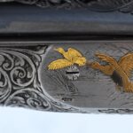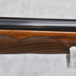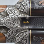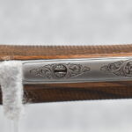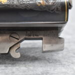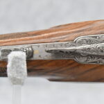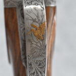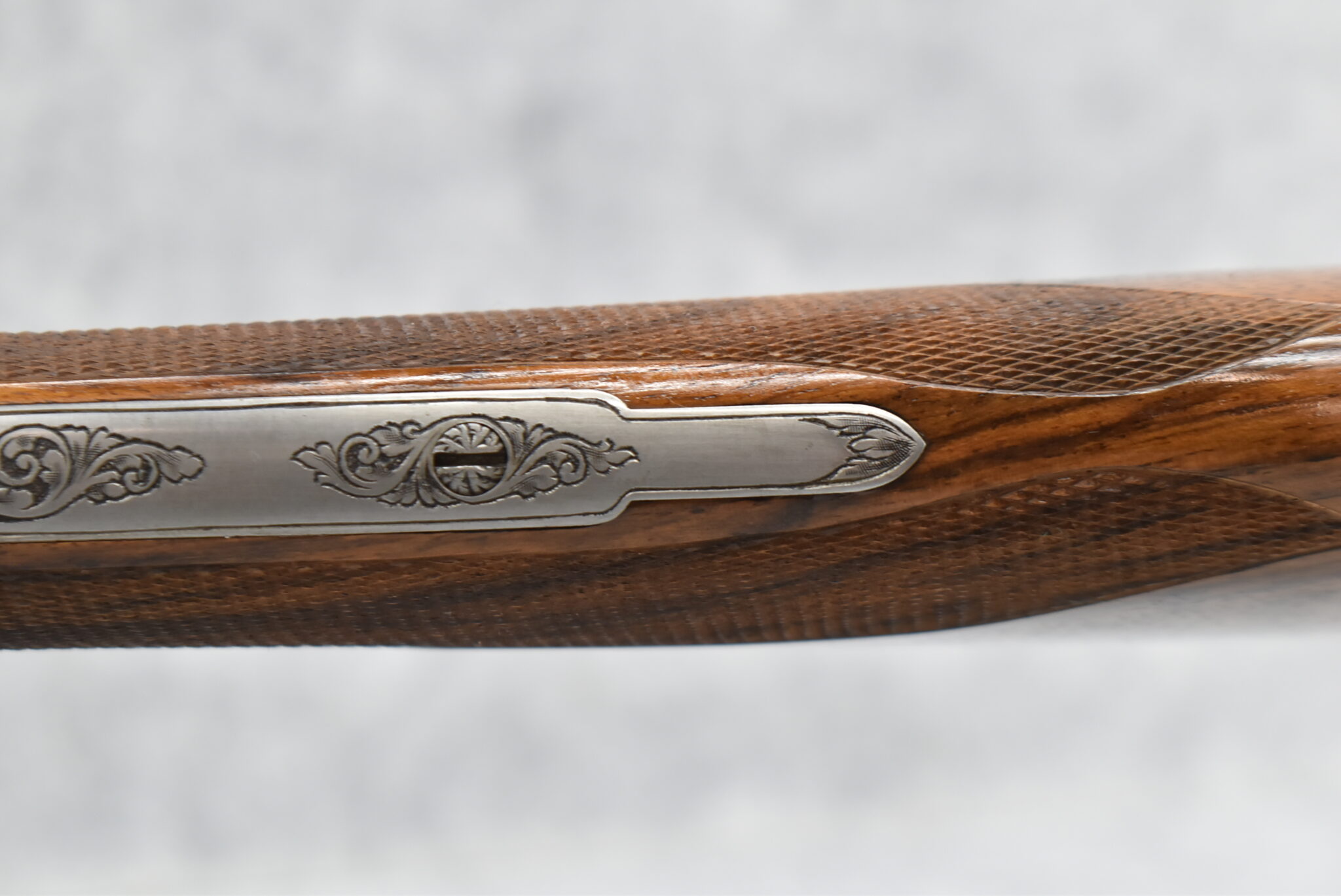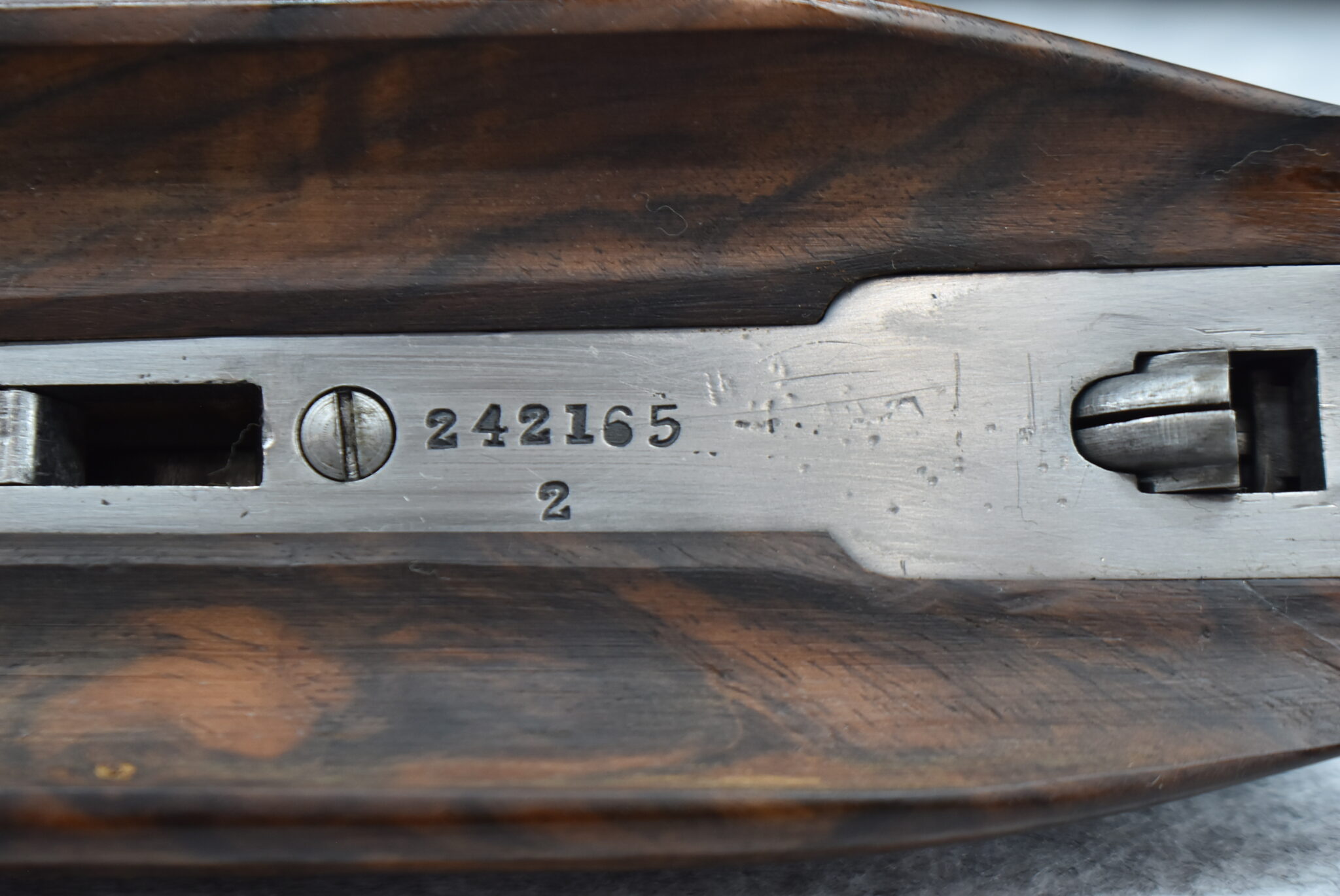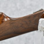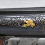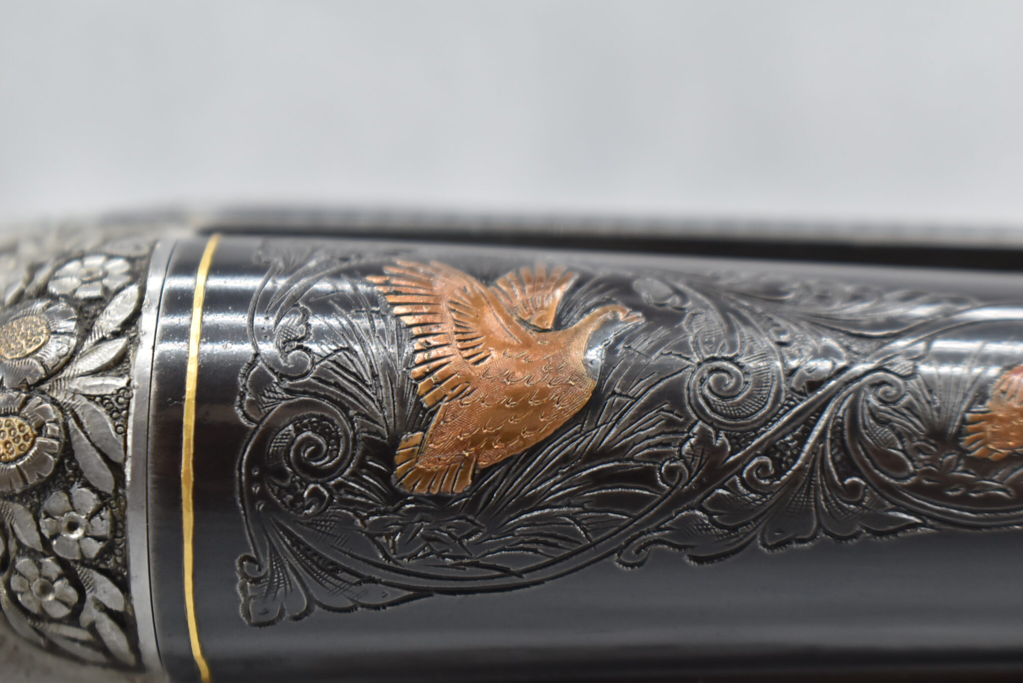 25R. Exceptional! Parker Bros. Custom Angelo Bee Signed & Engraved, Upgraded From VHE Grade 12ga. Side By Side Matching Numbered Two-Barrel Set Double Barrel Shotgun – Serial #242165 – 1st Set of Barrels Currently on the Gun Are 26” Solid Matted Rib w/Dual Bead Sights & Are Choked Improved Cylinder & Modified – 2nd Set of Barrels Are 30” Solid Matted Rib w/Dual Bead Sights & Choked Full & Modified – Both Sets of Barrels Serial Number to the Gun! – Both Sets of Barrels Have Strong Blued Finish & Receiver Has a Silver Finish – This Gun Has Been Professionally Custom Stocked by Top American Master Stock Maker Michael Yee w/Highly Figured AAA Grained, Fine Checked Straight Grip English Walnut Butt Stock w/Pachmayr Recoil Pad & Matching Fine Checkered AAA Grained English Walnut Beavertail Forearm – w/Single Selective Trigger – Gun Has Been Masterfully Engraved by Former Browning Master Engraver Angelo Bee – Each Barrel Has Been Engraved at the Breech & Muzzle w/A Total of 6 Relief 18K Yellow, Rose & White Gold Inlays Depicting Ducks & Quail w/A Scroll Pattern Between Both Ends – Breech End of Barrels Have Gold Wire Inlaid Border – Receiver is Heavy Scroll Engraved w/Gold Inlaid Hunting Scene, Underside Depicts a Bird Dog Holding A Game Bird in its Mouth & the Left Side Depicts a Fox Stalking Game Birds – Angelo Bee’s Signature Can Be Seen on the Left Side of the Receiver Below the Leading Duck – Gun is Cased in a Leather Covered Oak Two-Barrel Gun Case w/Canvas Outer w/Oiler & Set of Snap Caps – Minimum Wall Thickness Set #1 .035 on the Right Barrel, .035 on Left Barrel – Minimum Wall Thickness Set #2 .033 on Right Barrel, .035 on Left Barrel – This Gun is Truly a Museum Quality Piece That Displays The Masterful & Artistic Skill of Two Credited Craftsmen of the Gun World!