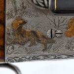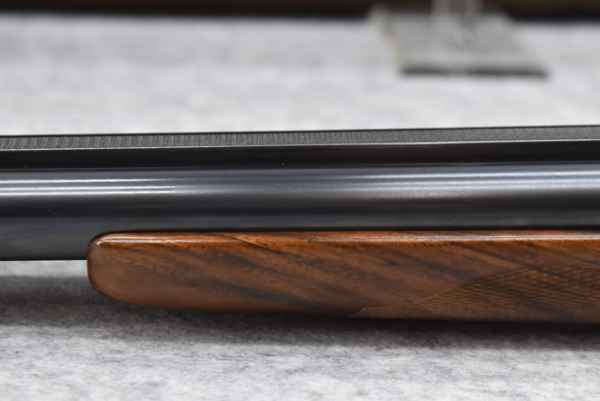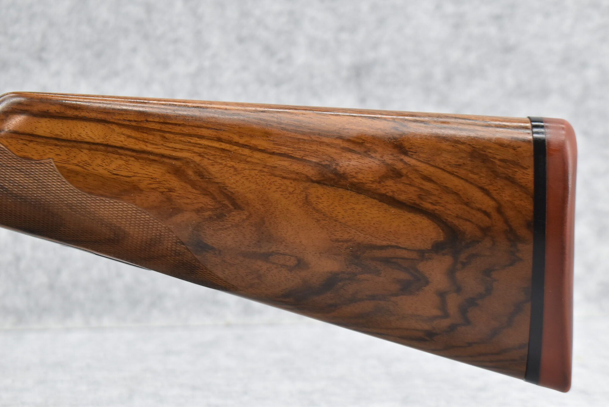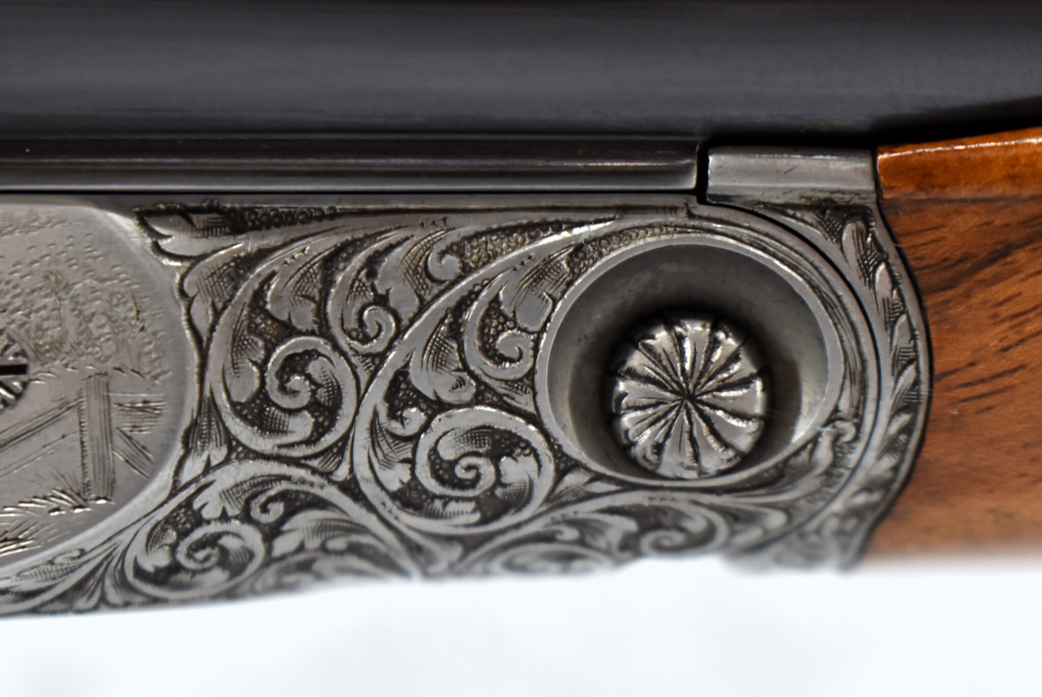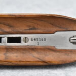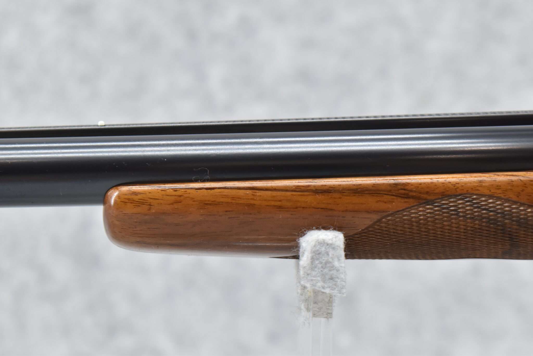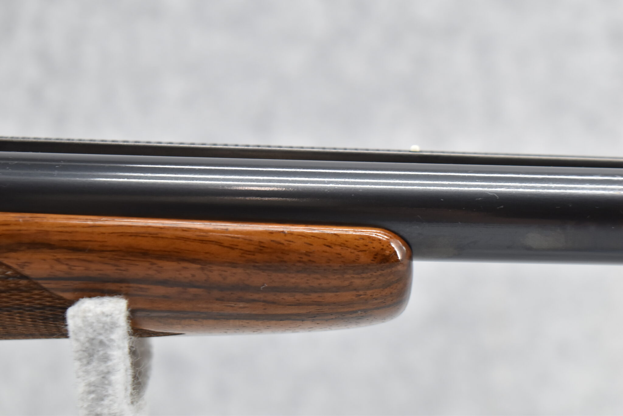 25R. Exceptional! Parker Bros. Custom Angelo Bee Signed & Engraved, Upgraded From VHE Grade 12ga. Side By Side Matching Numbered Two-Barrel Set Double Barrel Shotgun – Serial #242165 – 1st Set of Barrels Currently on the Gun Are 26” Solid Matted Rib w/Dual Bead Sights & Are Choked Improved Cylinder & Modified – 2nd Set of Barrels Are 30” Solid Matted Rib w/Dual Bead Sights & Choked Full & Modified – Both Sets of Barrels Serial Number to the Gun! – Both Sets of Barrels Have Strong Blued Finish & Receiver Has a Silver Finish – This Gun Has Been Professionally Custom Stocked by Top American Master Stock Maker Michael Yee w/Highly Figured AAA Grained, Fine Checked Straight Grip English Walnut Butt Stock w/Pachmayr Recoil Pad & Matching Fine Checkered AAA Grained English Walnut Beavertail Forearm – w/Single Selective Trigger – Gun Has Been Masterfully Engraved by Former Browning Master Engraver Angelo Bee – Each Barrel Has Been Engraved at the Breech & Muzzle w/A Total of 6 Relief 18K Yellow, Rose & White Gold Inlays Depicting Ducks & Quail w/A Scroll Pattern Between Both Ends – Breech End of Barrels Have Gold Wire Inlaid Border – Receiver is Heavy Scroll Engraved w/Gold Inlaid Hunting Scene, Underside Depicts a Bird Dog Holding A Game Bird in its Mouth & the Left Side Depicts a Fox Stalking Game Birds – Angelo Bee’s Signature Can Be Seen on the Left Side of the Receiver Below the Leading Duck – Gun is Cased in a Leather Covered Oak Two-Barrel Gun Case w/Canvas Outer w/Oiler & Set of Snap Caps – Minimum Wall Thickness Set #1 .035 on the Right Barrel, .035 on Left Barrel – Minimum Wall Thickness Set #2 .033 on Right Barrel, .035 on Left Barrel – This Gun is Truly a Museum Quality Piece That Displays The Masterful & Artistic Skill of Two Credited Craftsmen of the Gun World!