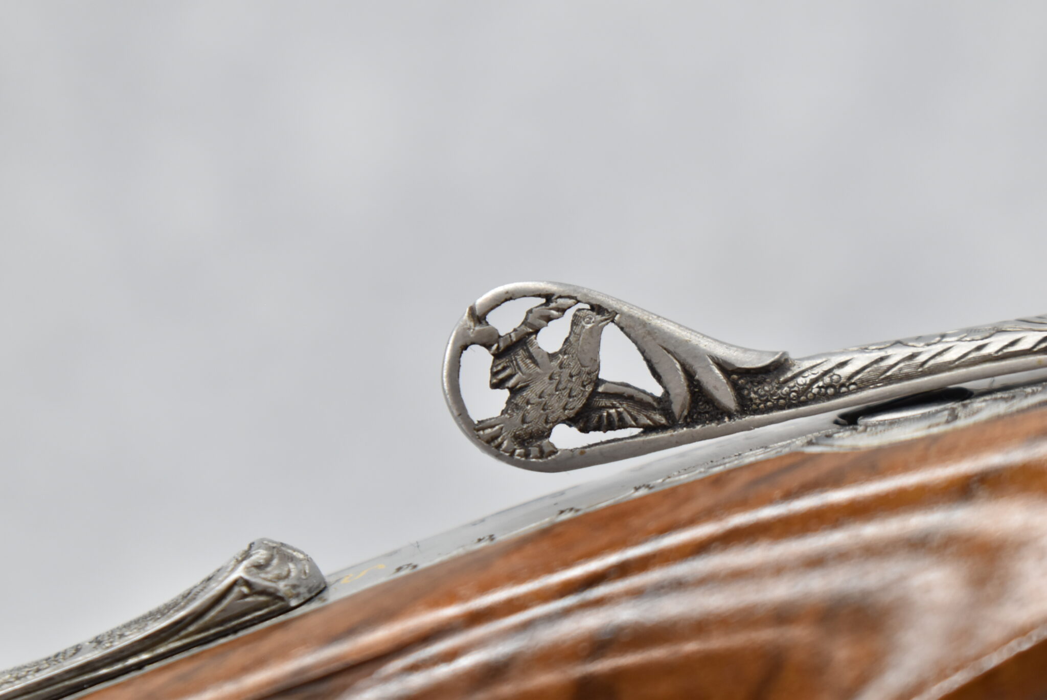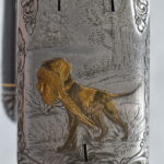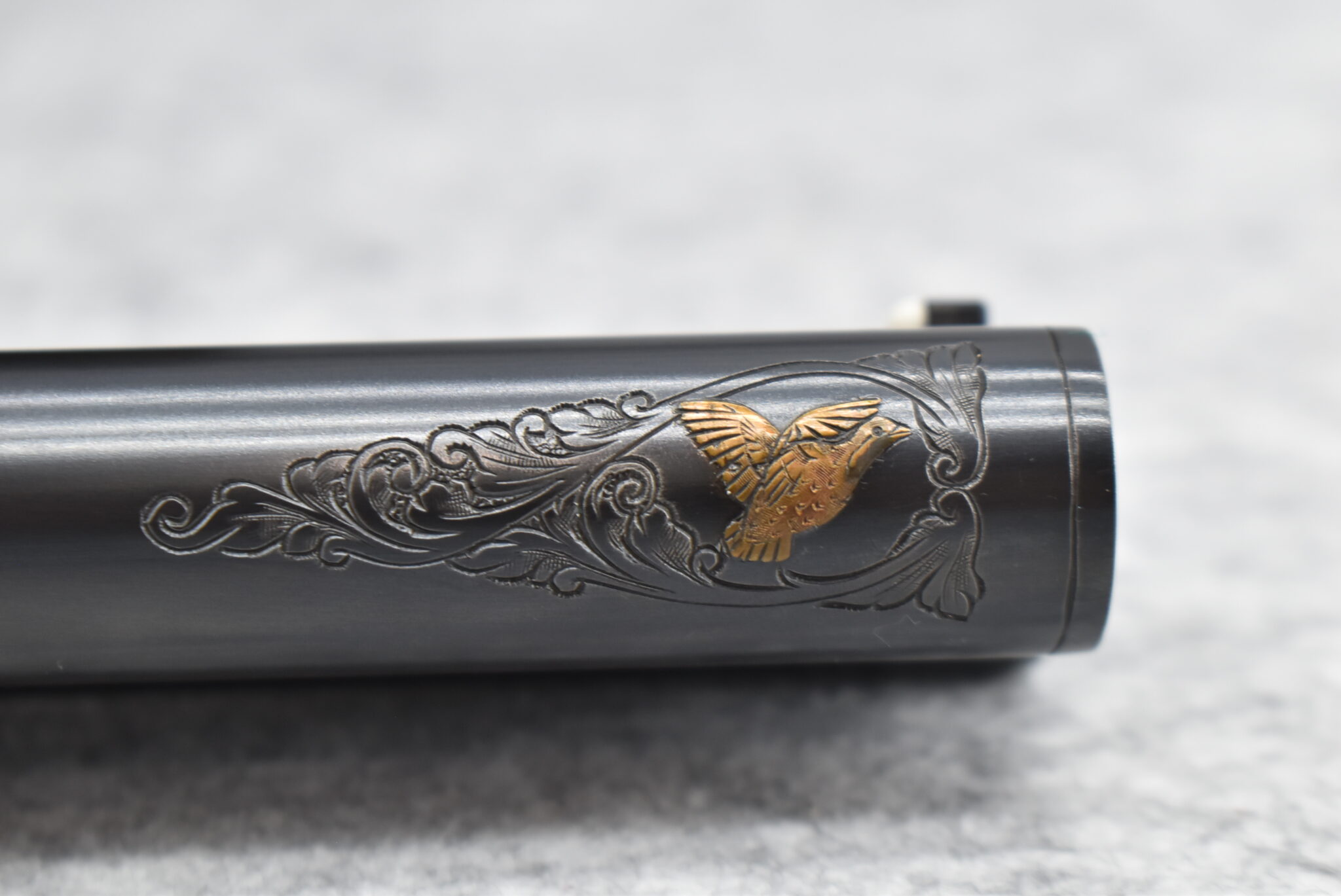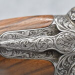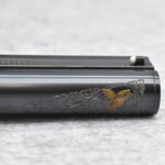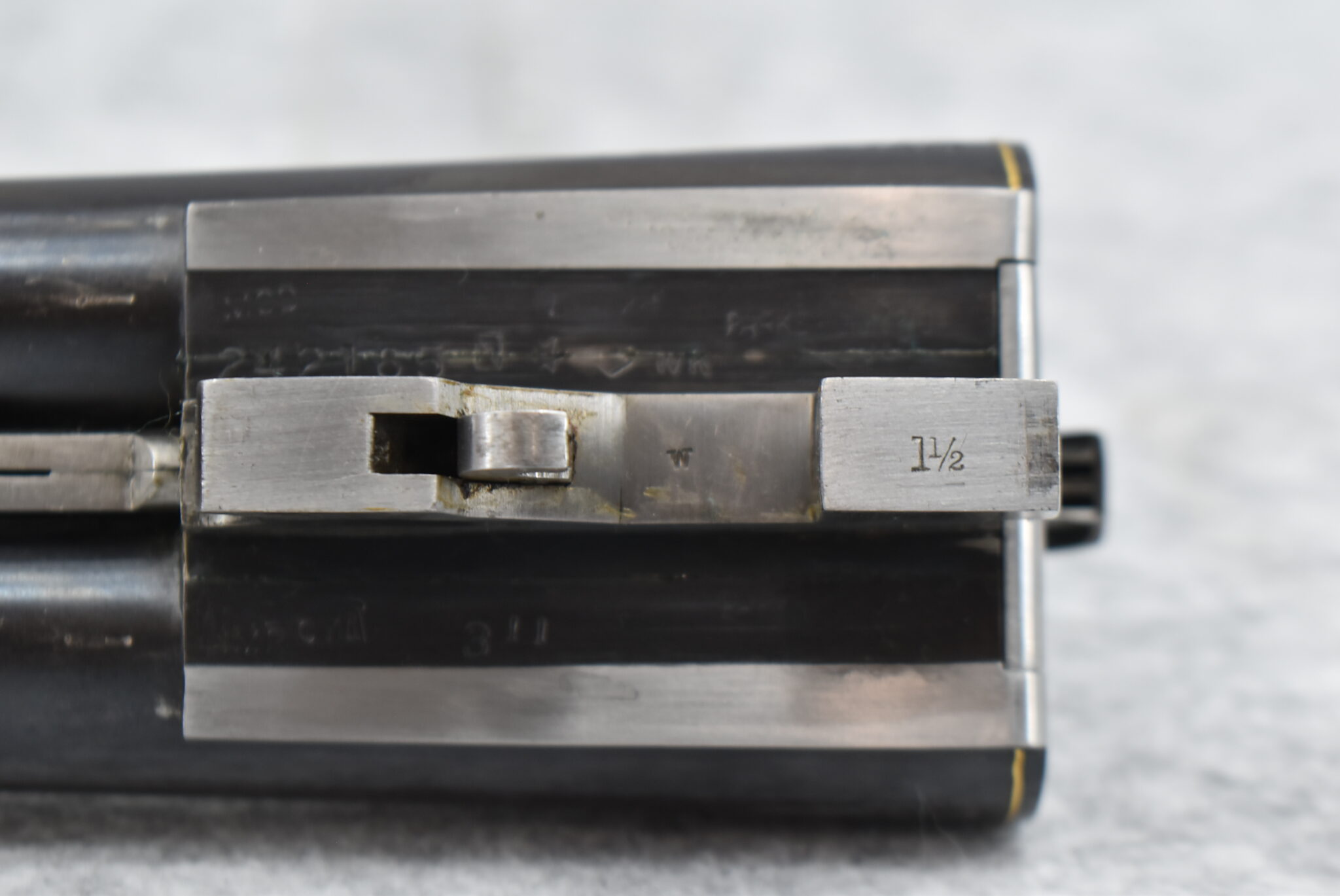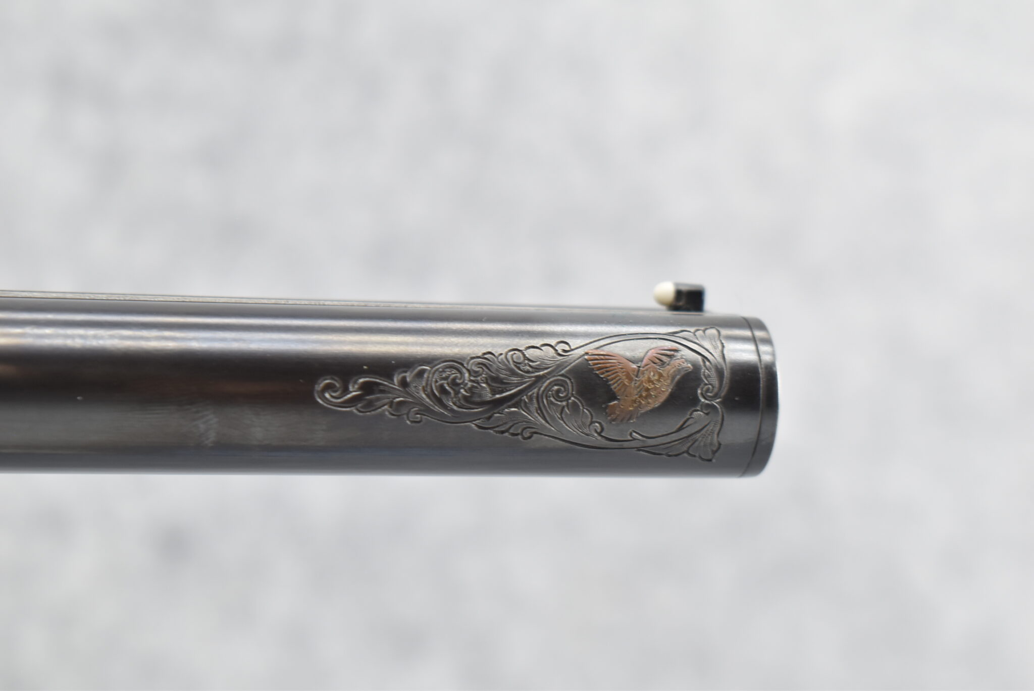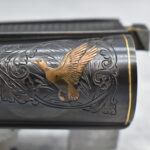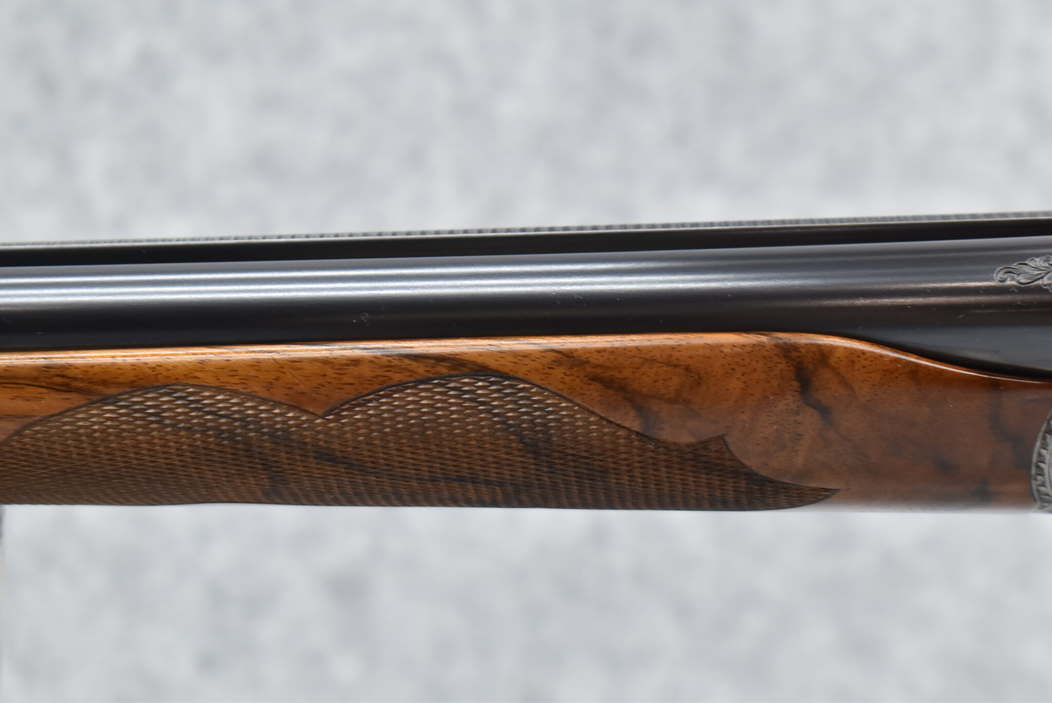 25R. Exceptional! Parker Bros. Custom Angelo Bee Signed & Engraved, Upgraded From VHE Grade 12ga. Side By Side Matching Numbered Two-Barrel Set Double Barrel Shotgun – Serial #242165 – 1st Set of Barrels Currently on the Gun Are 26” Solid Matted Rib w/Dual Bead Sights & Are Choked Improved Cylinder & Modified – 2nd Set of Barrels Are 30” Solid Matted Rib w/Dual Bead Sights & Choked Full & Modified – Both Sets of Barrels Serial Number to the Gun! – Both Sets of Barrels Have Strong Blued Finish & Receiver Has a Silver Finish – This Gun Has Been Professionally Custom Stocked by Top American Master Stock Maker Michael Yee w/Highly Figured AAA Grained, Fine Checked Straight Grip English Walnut Butt Stock w/Pachmayr Recoil Pad & Matching Fine Checkered AAA Grained English Walnut Beavertail Forearm – w/Single Selective Trigger – Gun Has Been Masterfully Engraved by Former Browning Master Engraver Angelo Bee – Each Barrel Has Been Engraved at the Breech & Muzzle w/A Total of 6 Relief 18K Yellow, Rose & White Gold Inlays Depicting Ducks & Quail w/A Scroll Pattern Between Both Ends – Breech End of Barrels Have Gold Wire Inlaid Border – Receiver is Heavy Scroll Engraved w/Gold Inlaid Hunting Scene, Underside Depicts a Bird Dog Holding A Game Bird in its Mouth & the Left Side Depicts a Fox Stalking Game Birds – Angelo Bee’s Signature Can Be Seen on the Left Side of the Receiver Below the Leading Duck – Gun is Cased in a Leather Covered Oak Two-Barrel Gun Case w/Canvas Outer w/Oiler & Set of Snap Caps – Minimum Wall Thickness Set #1 .035 on the Right Barrel, .035 on Left Barrel – Minimum Wall Thickness Set #2 .033 on Right Barrel, .035 on Left Barrel – This Gun is Truly a Museum Quality Piece That Displays The Masterful & Artistic Skill of Two Credited Craftsmen of the Gun World!