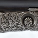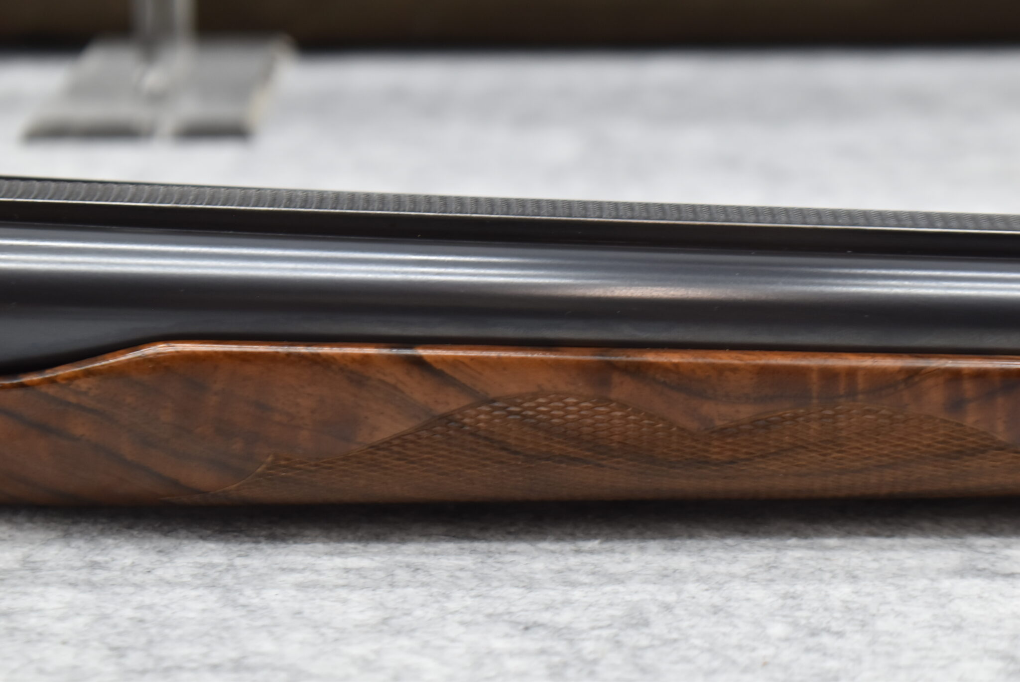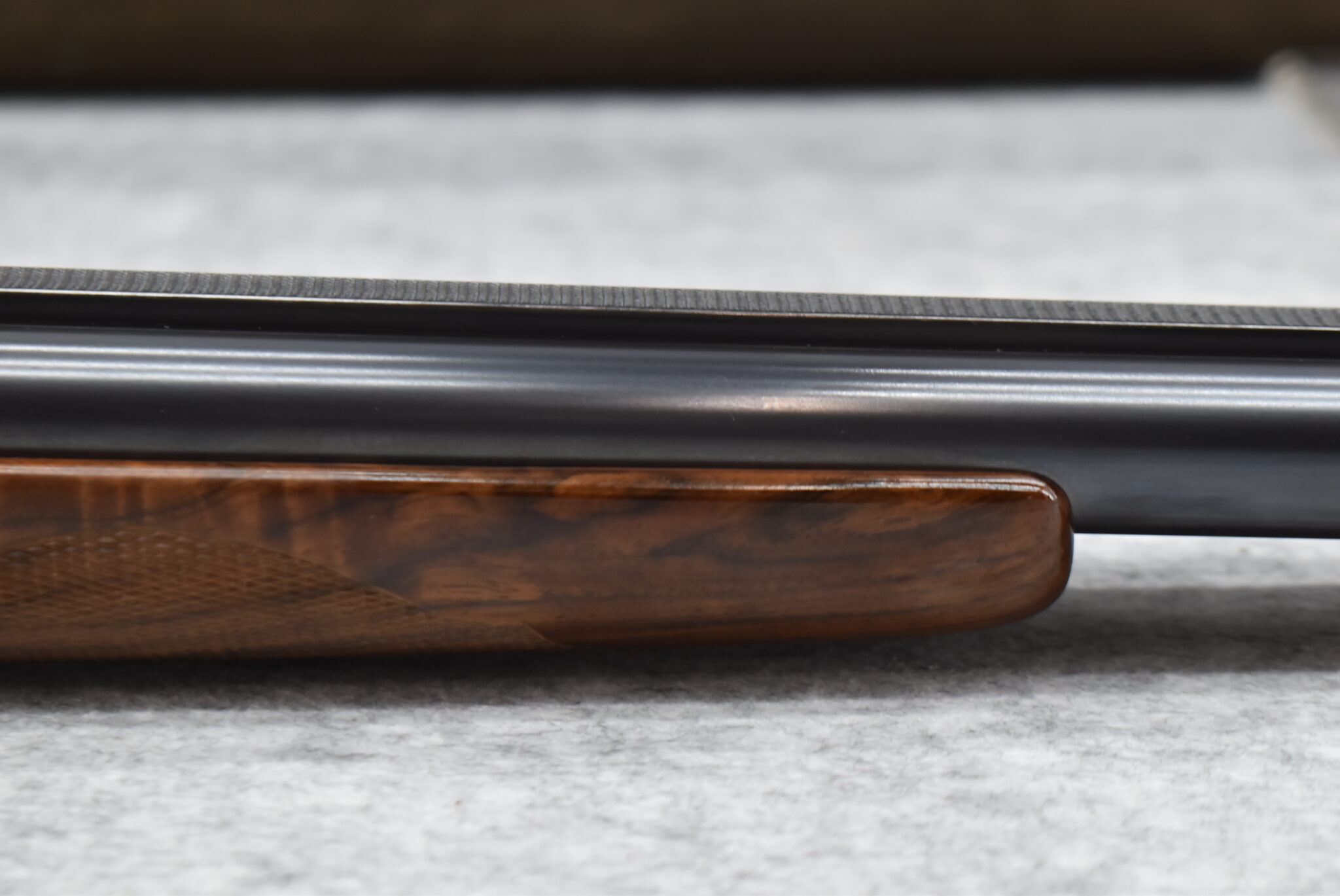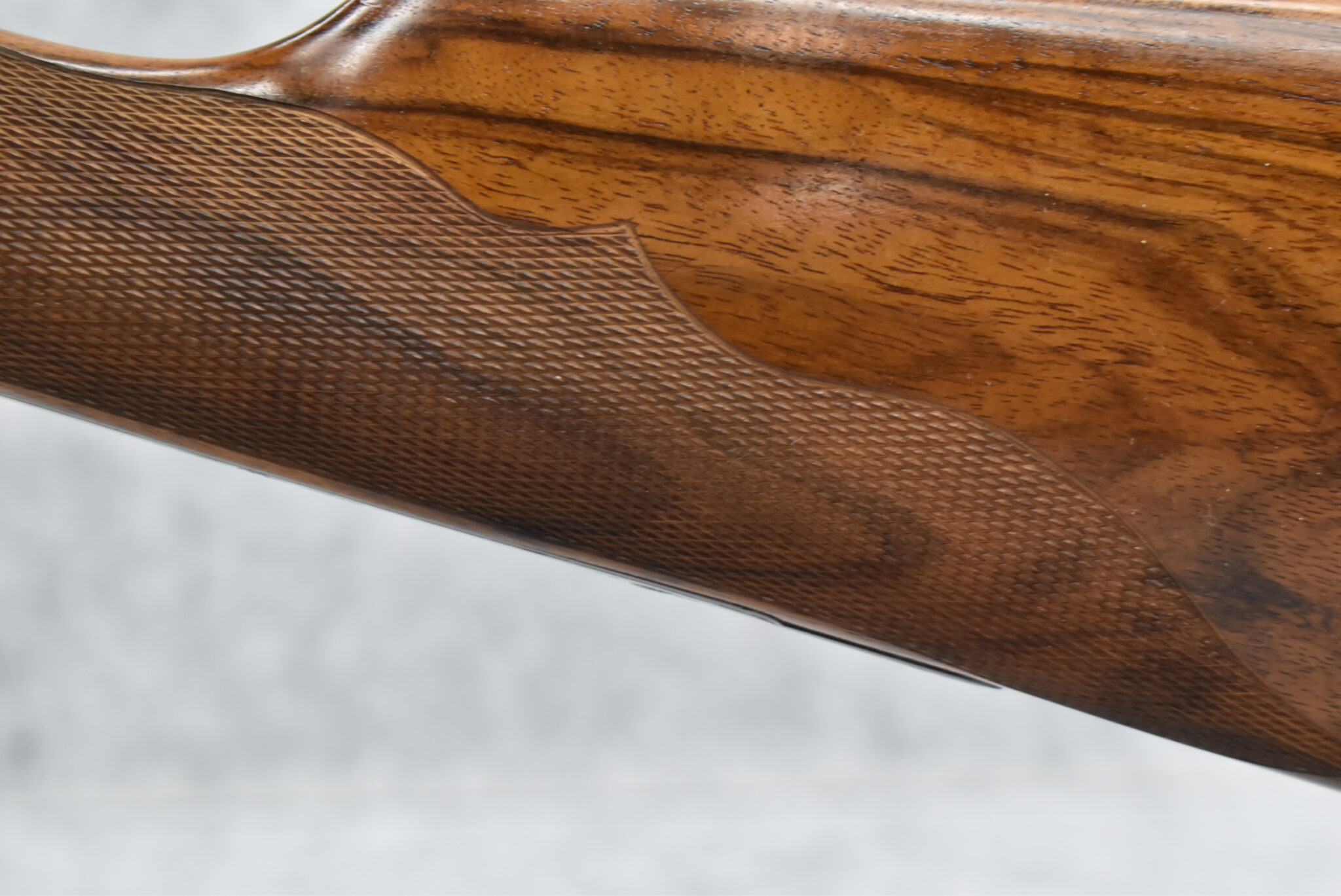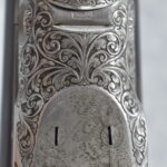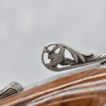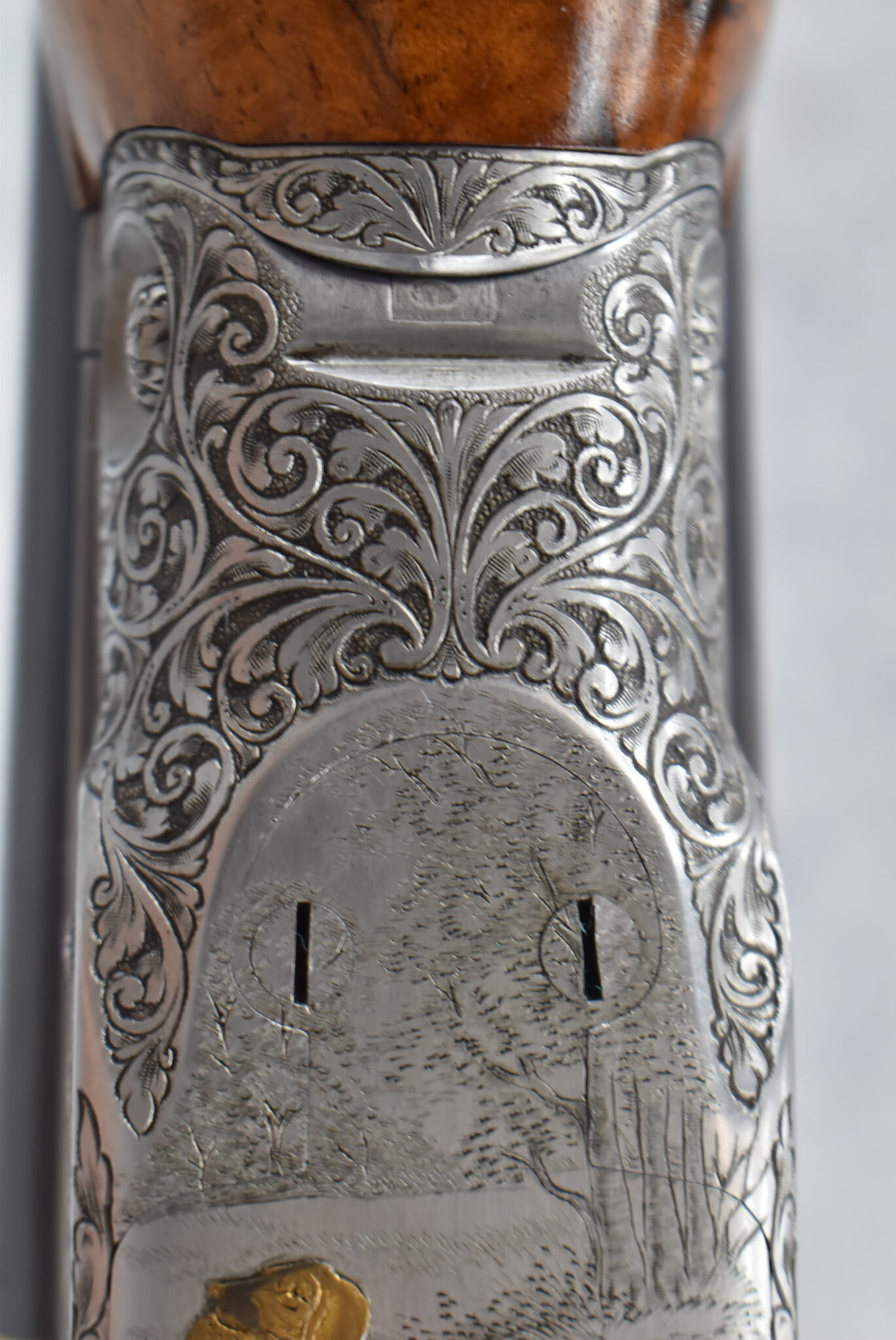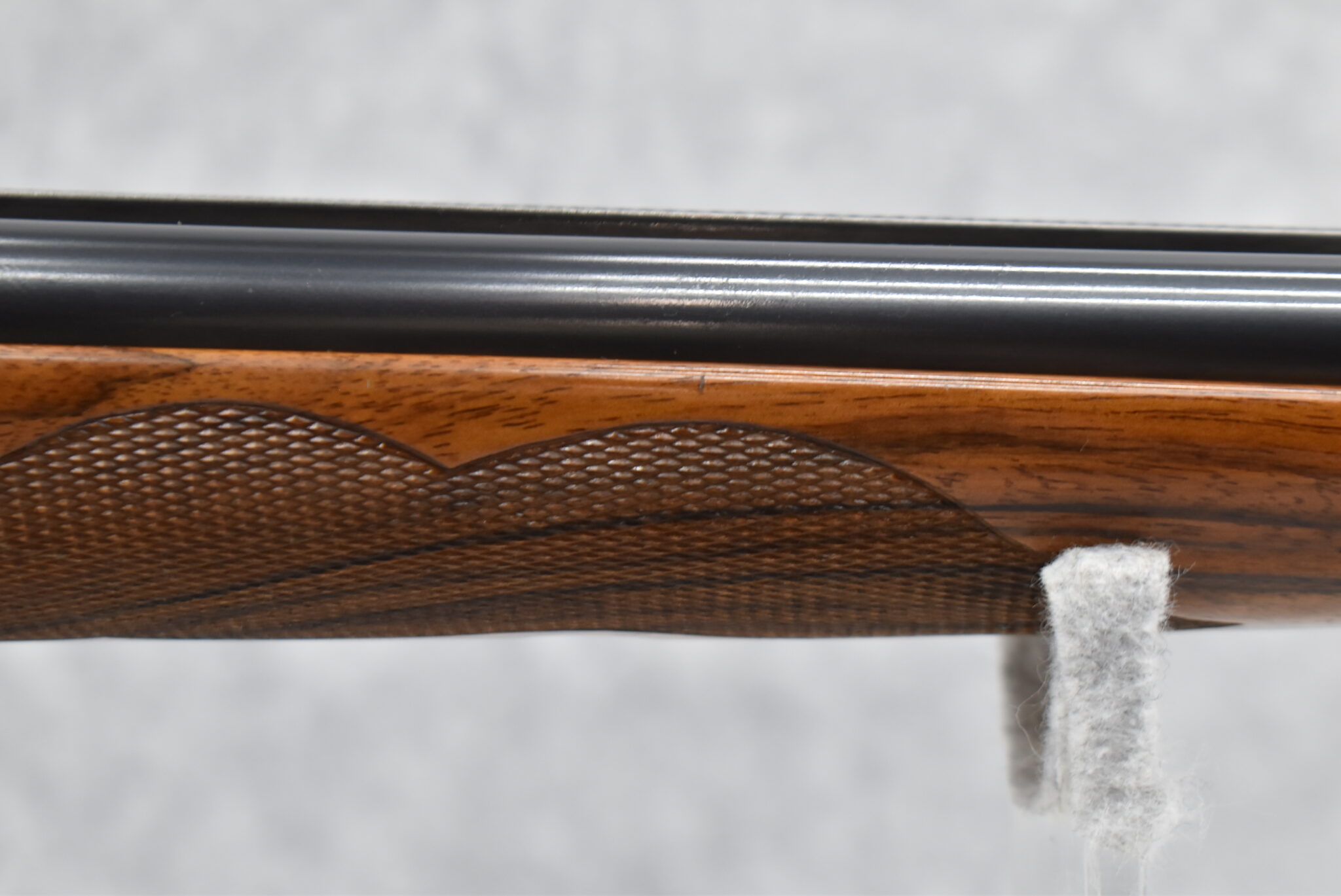 25R. Exceptional! Parker Bros. Custom Angelo Bee Signed & Engraved, Upgraded From VHE Grade 12ga. Side By Side Matching Numbered Two-Barrel Set Double Barrel Shotgun – Serial #242165 – 1st Set of Barrels Currently on the Gun Are 26” Solid Matted Rib w/Dual Bead Sights & Are Choked Improved Cylinder & Modified – 2nd Set of Barrels Are 30” Solid Matted Rib w/Dual Bead Sights & Choked Full & Modified – Both Sets of Barrels Serial Number to the Gun! – Both Sets of Barrels Have Strong Blued Finish & Receiver Has a Silver Finish – This Gun Has Been Professionally Custom Stocked by Top American Master Stock Maker Michael Yee w/Highly Figured AAA Grained, Fine Checked Straight Grip English Walnut Butt Stock w/Pachmayr Recoil Pad & Matching Fine Checkered AAA Grained English Walnut Beavertail Forearm – w/Single Selective Trigger – Gun Has Been Masterfully Engraved by Former Browning Master Engraver Angelo Bee – Each Barrel Has Been Engraved at the Breech & Muzzle w/A Total of 6 Relief 18K Yellow, Rose & White Gold Inlays Depicting Ducks & Quail w/A Scroll Pattern Between Both Ends – Breech End of Barrels Have Gold Wire Inlaid Border – Receiver is Heavy Scroll Engraved w/Gold Inlaid Hunting Scene, Underside Depicts a Bird Dog Holding A Game Bird in its Mouth & the Left Side Depicts a Fox Stalking Game Birds – Angelo Bee’s Signature Can Be Seen on the Left Side of the Receiver Below the Leading Duck – Gun is Cased in a Leather Covered Oak Two-Barrel Gun Case w/Canvas Outer w/Oiler & Set of Snap Caps – Minimum Wall Thickness Set #1 .035 on the Right Barrel, .035 on Left Barrel – Minimum Wall Thickness Set #2 .033 on Right Barrel, .035 on Left Barrel – This Gun is Truly a Museum Quality Piece That Displays The Masterful & Artistic Skill of Two Credited Craftsmen of the Gun World!