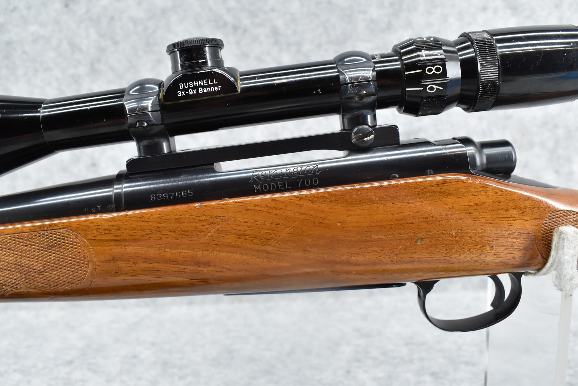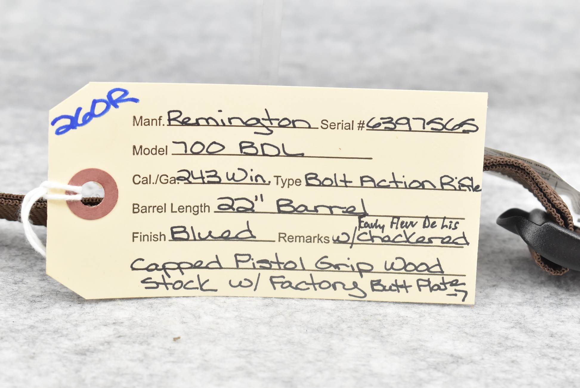 260R.     Remington – Mod. 700 BDL – 243 Win. Cal. Bolt Action Rifle – w/22” Barrel – Blued Finish – w/Early Fleur De Lis Checkered Capped Pistol Grip Wood Stock w/Factory Butt Plate – w/Sling Loops – w/Butler Creek Sling – w/Bushnell Banner 3x-9x Scope w/Redfield Rings & Base
