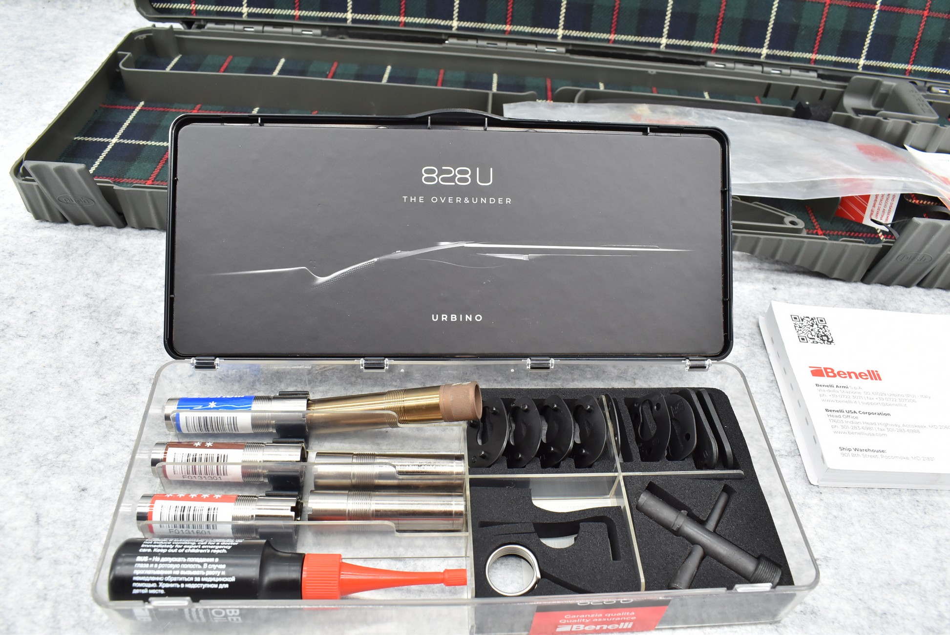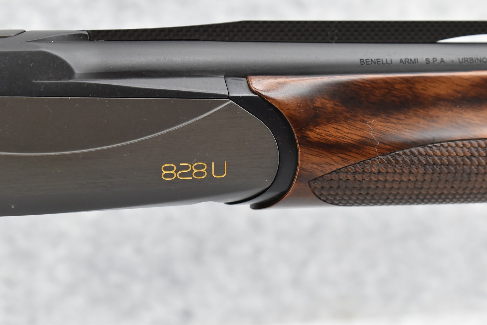 261R. Benelli – Mod. 828U – 20ga. 3” Over-Under Shotgun – w/24” Vent-Rib Barrels w/Interchangeable Chokes & Fiber Optic Front Bead Sight – Satin Blued Finish – w/Deluxe Fish Scale Checkered Pistol Grip Wood Stocks w/Progressive Comfort Factory Butt Pad – As New w/Factory Hard Case, Chokes, Manual & Accessories