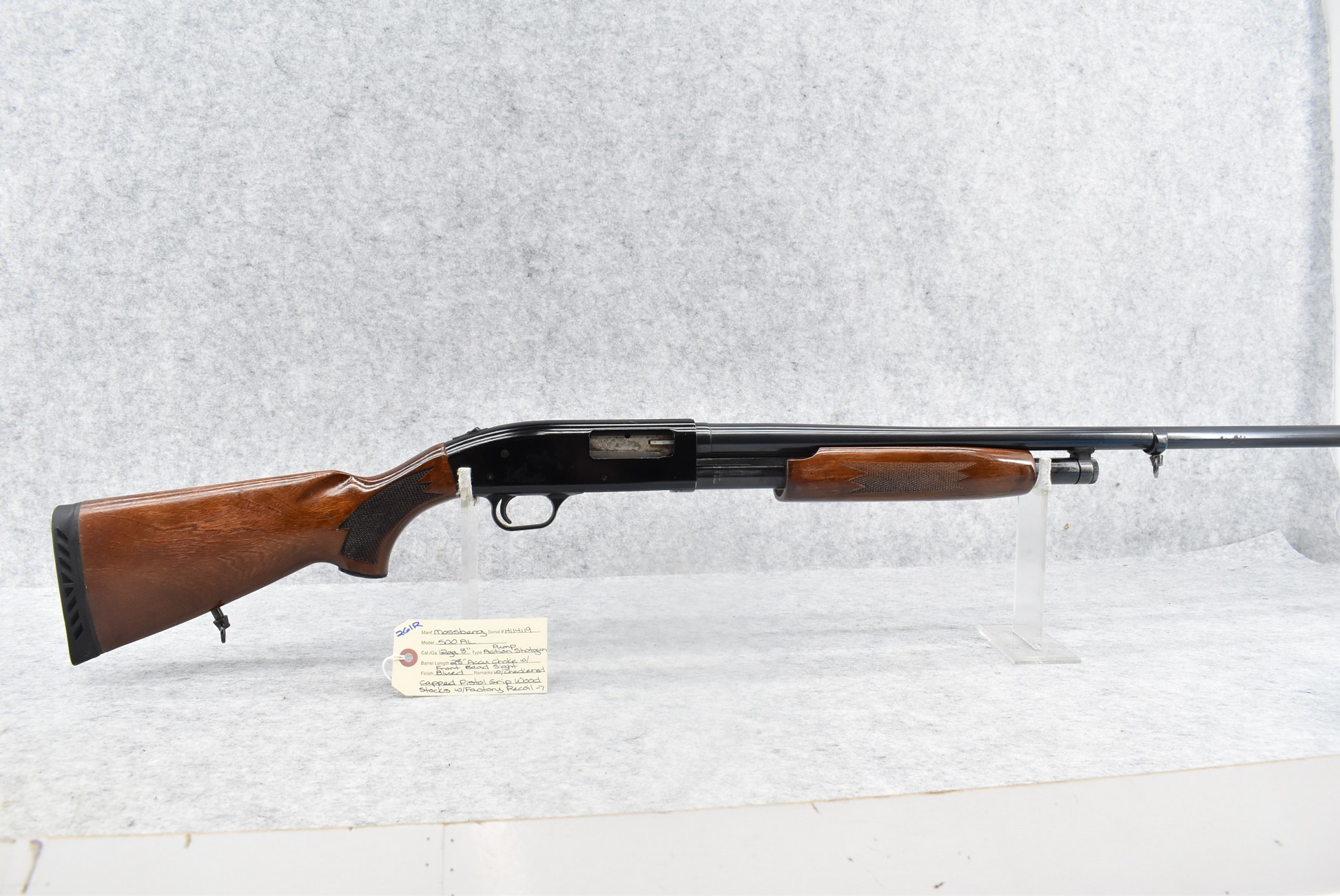 261R. Mossberg – Mod. 500 AL – 12ga. 3” Pump Action Shotgun – w/28” Accu Choke Barrel w/Front Bead Sight – Blued Finish – w/Checkered Capped Pistol Grip Wood Stocks w/Factory Recoil Pad