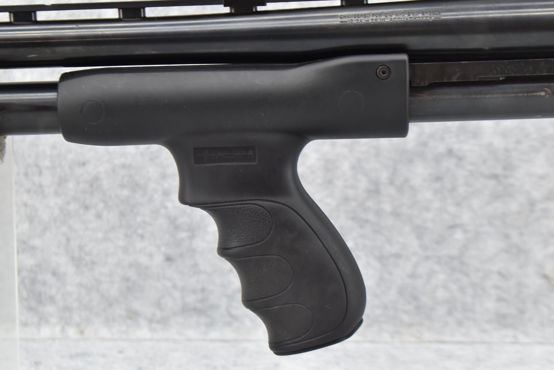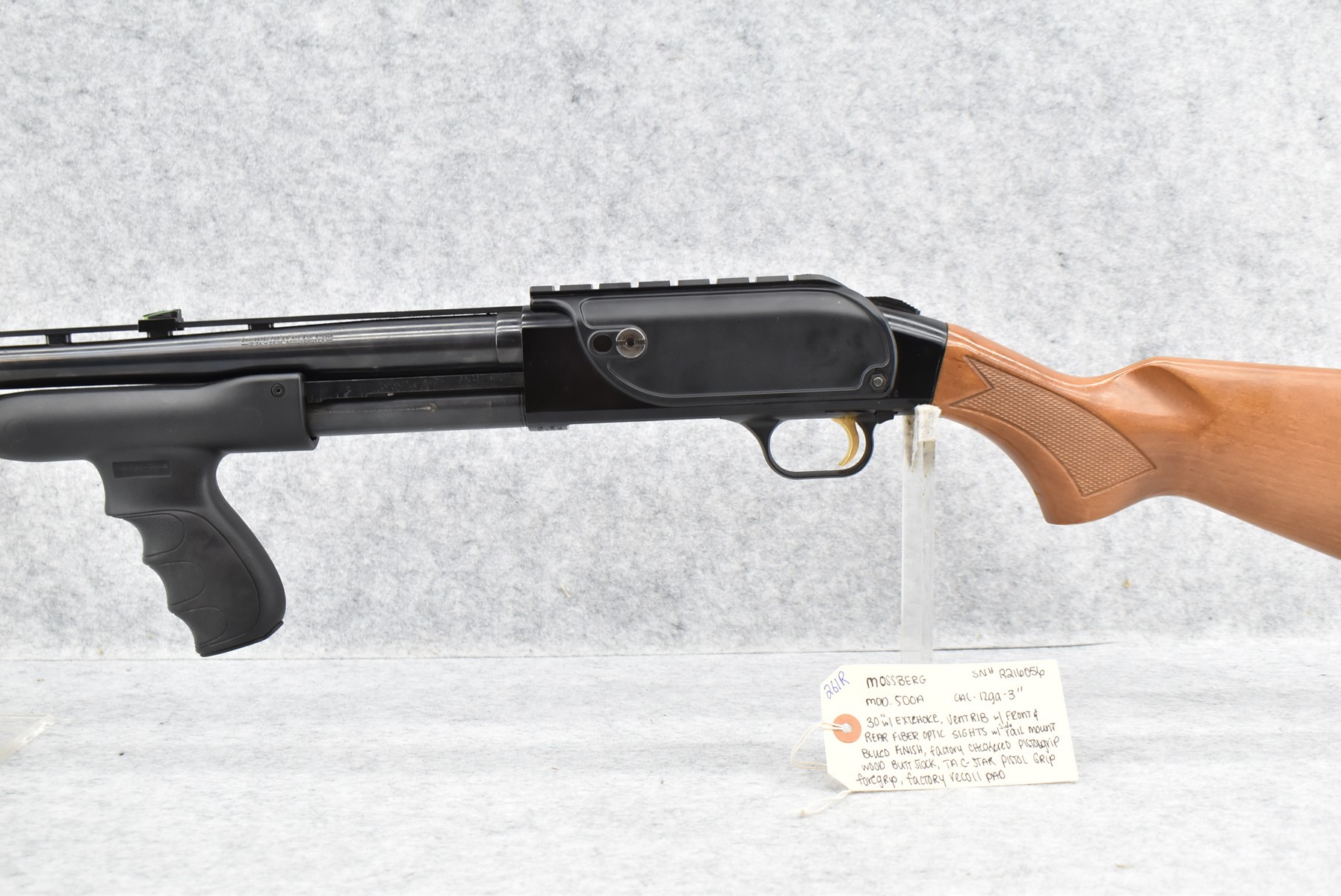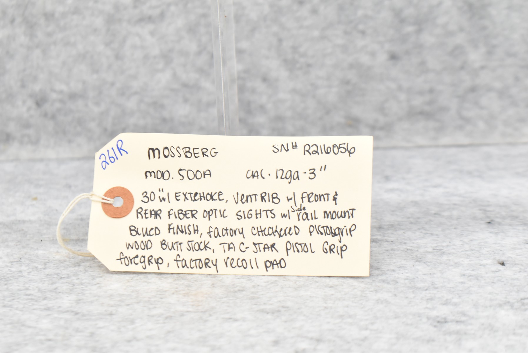 261R.     Mossberg – Mod. 500A – 12ga. 3” Pump Action Shotgun – w/30” Ext. Custom Choke, Vent-Rib Barrel w/Front & Rear Fiber Optic Sights – Blued Finish – w/Factory Checkered Pistol Grip Wood Butt Stock w/Factory Recoil Pad & TAC-Star Forearm Pistol Grip – w/Picatinny Rail Mount