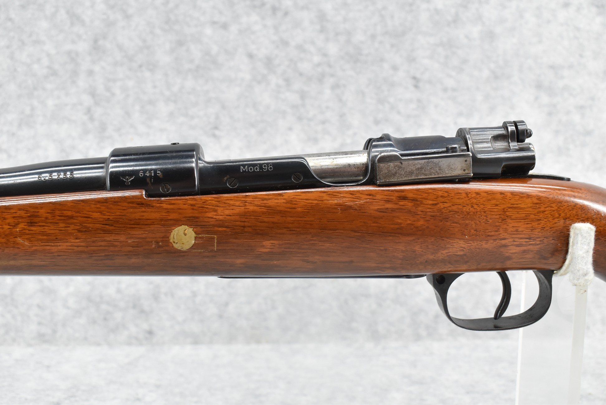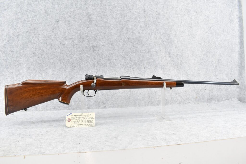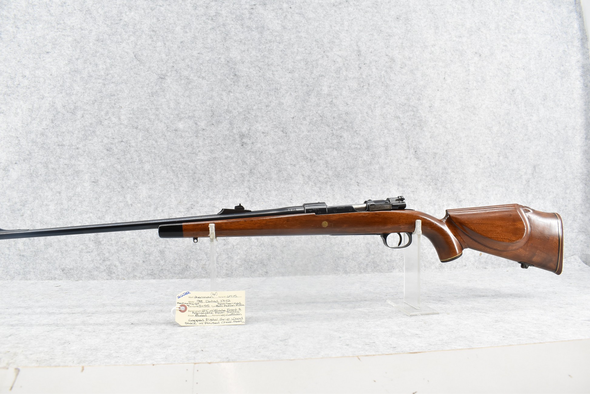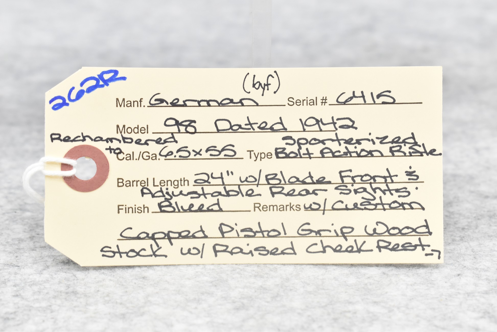 262R.     Mauser – Mod. 98 – Rechambered to 6.5×55 Cal. Sporterized Bolt Action Rifle – w/24” Barrel w/Blade Front & Adj. Rear Sights – Blued Finish – w/Custom Capped Pistol Grip Wood Stock w/Recoil Pad – Mfg. Code:  byf, Dated 1942