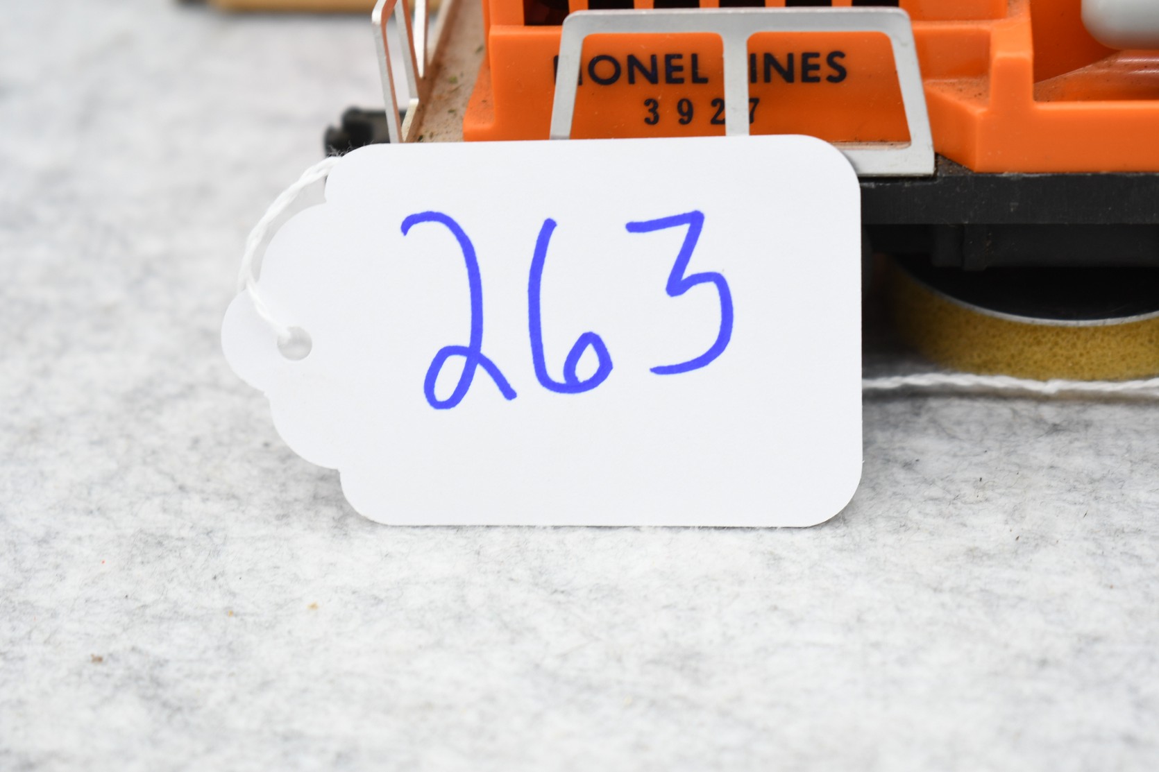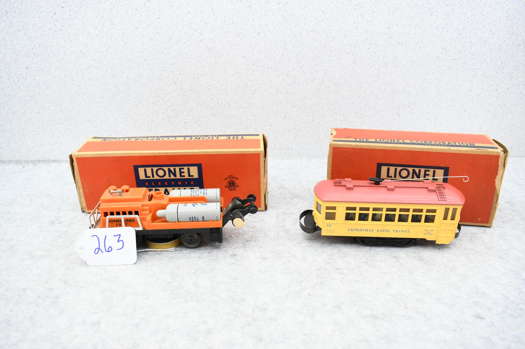 263. Grouping of Vintage Lionel train cars including 3927 Track Cleaning Car, #60 Lionel Rapid City Transit Trolly. Both with boxes (box issues)