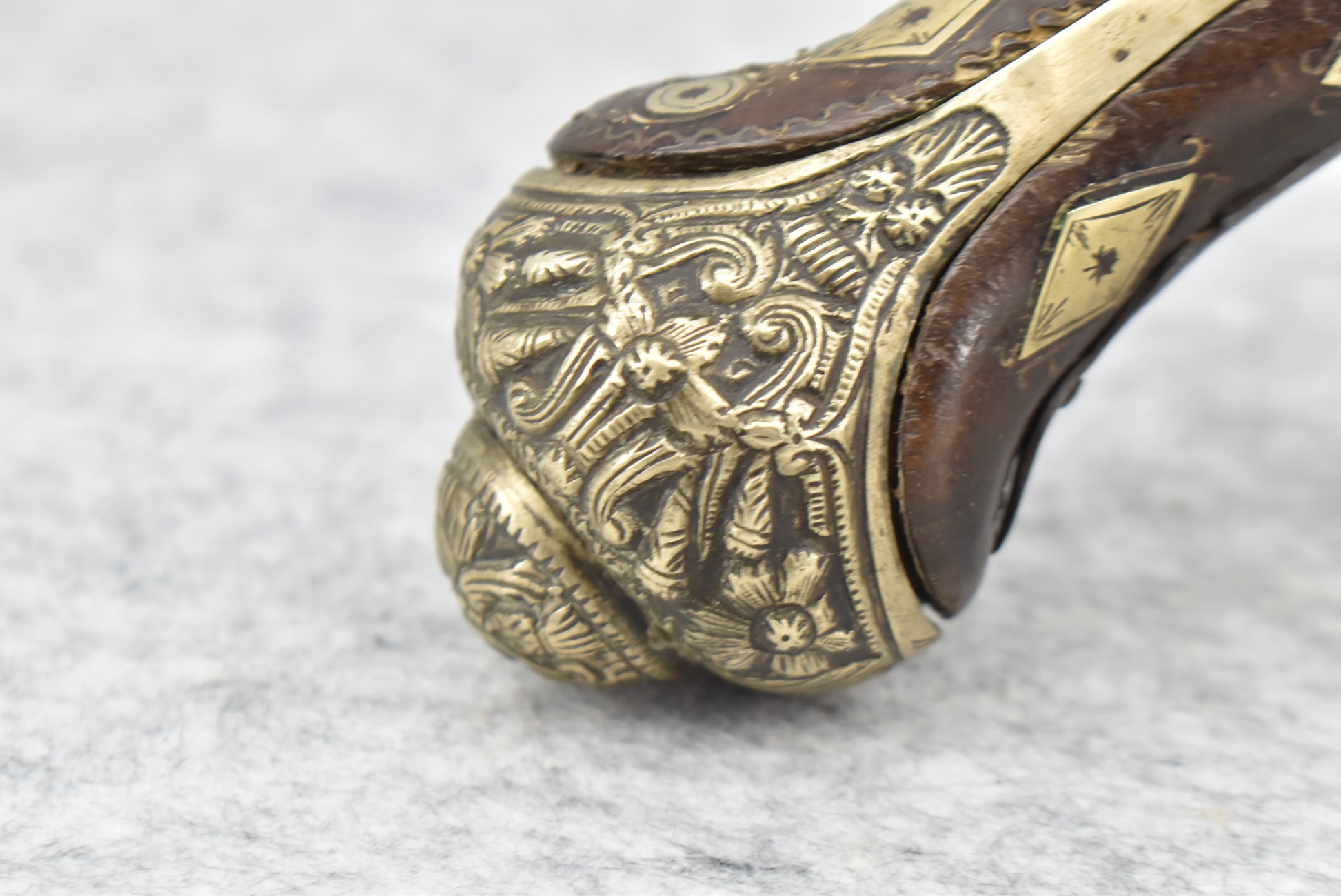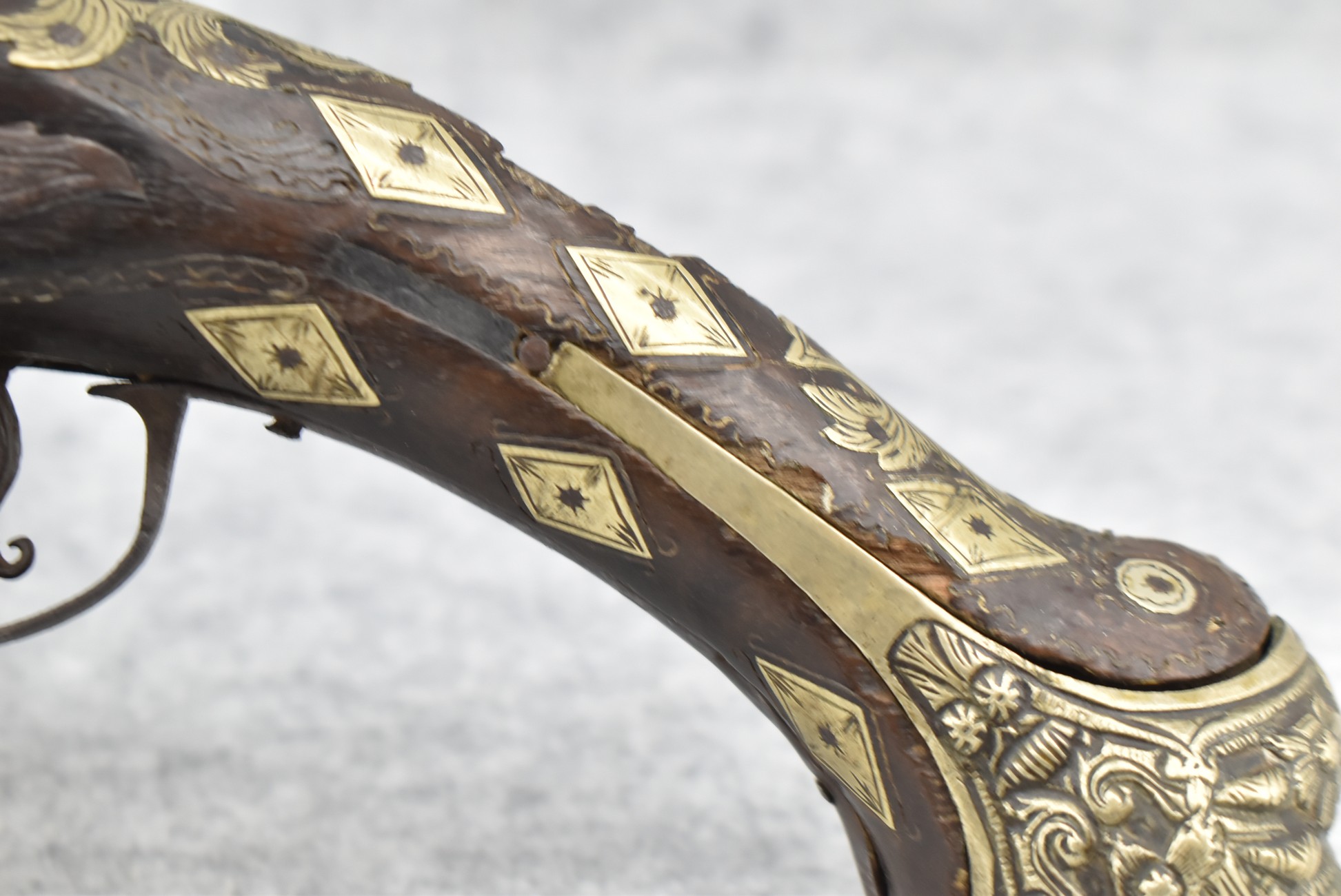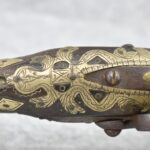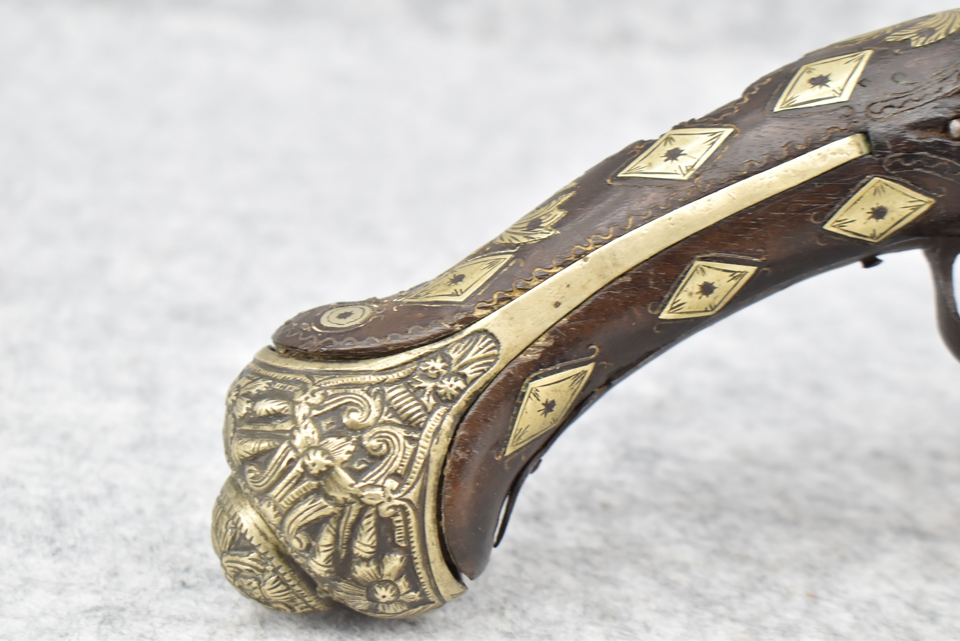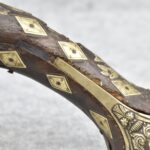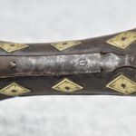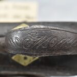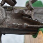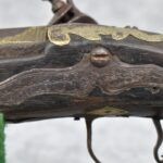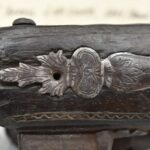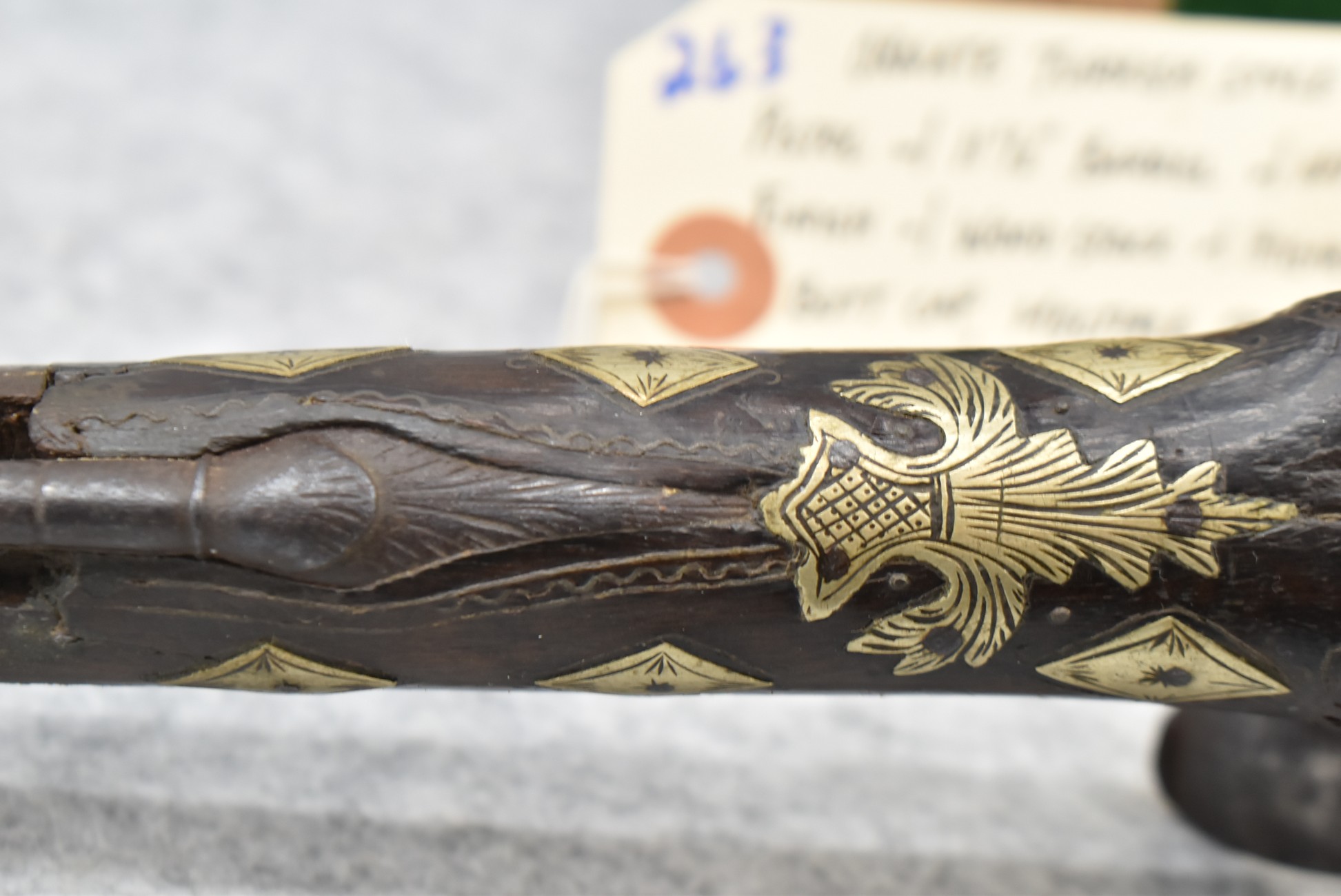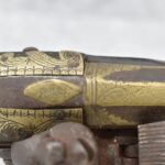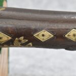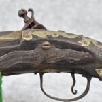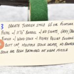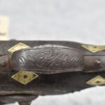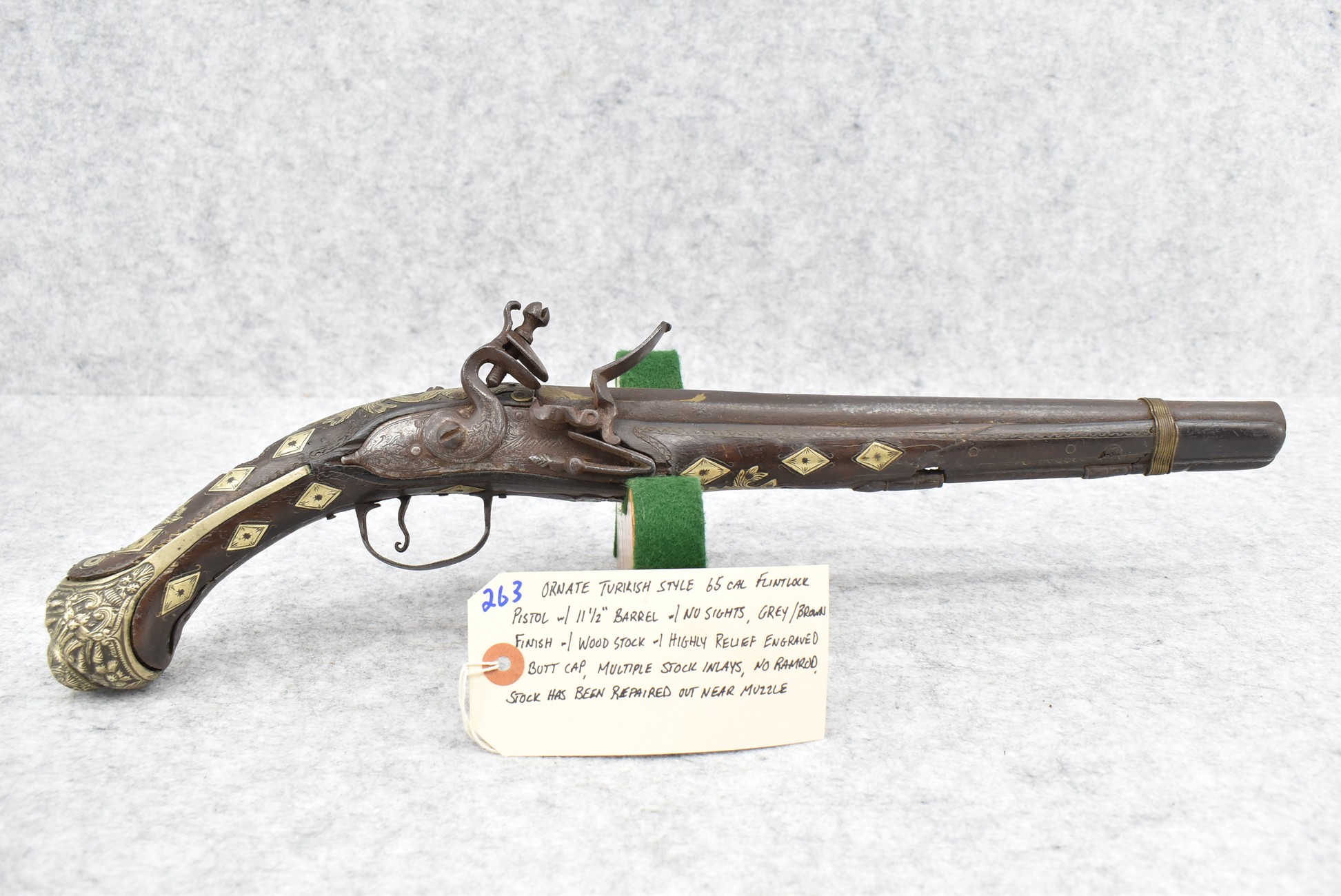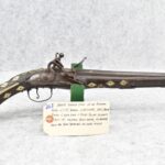 263. Ornate Turkish Style 65 Cal. Flintlock Pistol – w/11 ½” Barrel (No Sights) – Gray/Brown Finish – w/Wood Stock w/Highly Relief Engraved Butt Cap & Multiple Stock Inlays – No Ram Rod – Note: Stock Has Been Repaired Out Near Muzzle