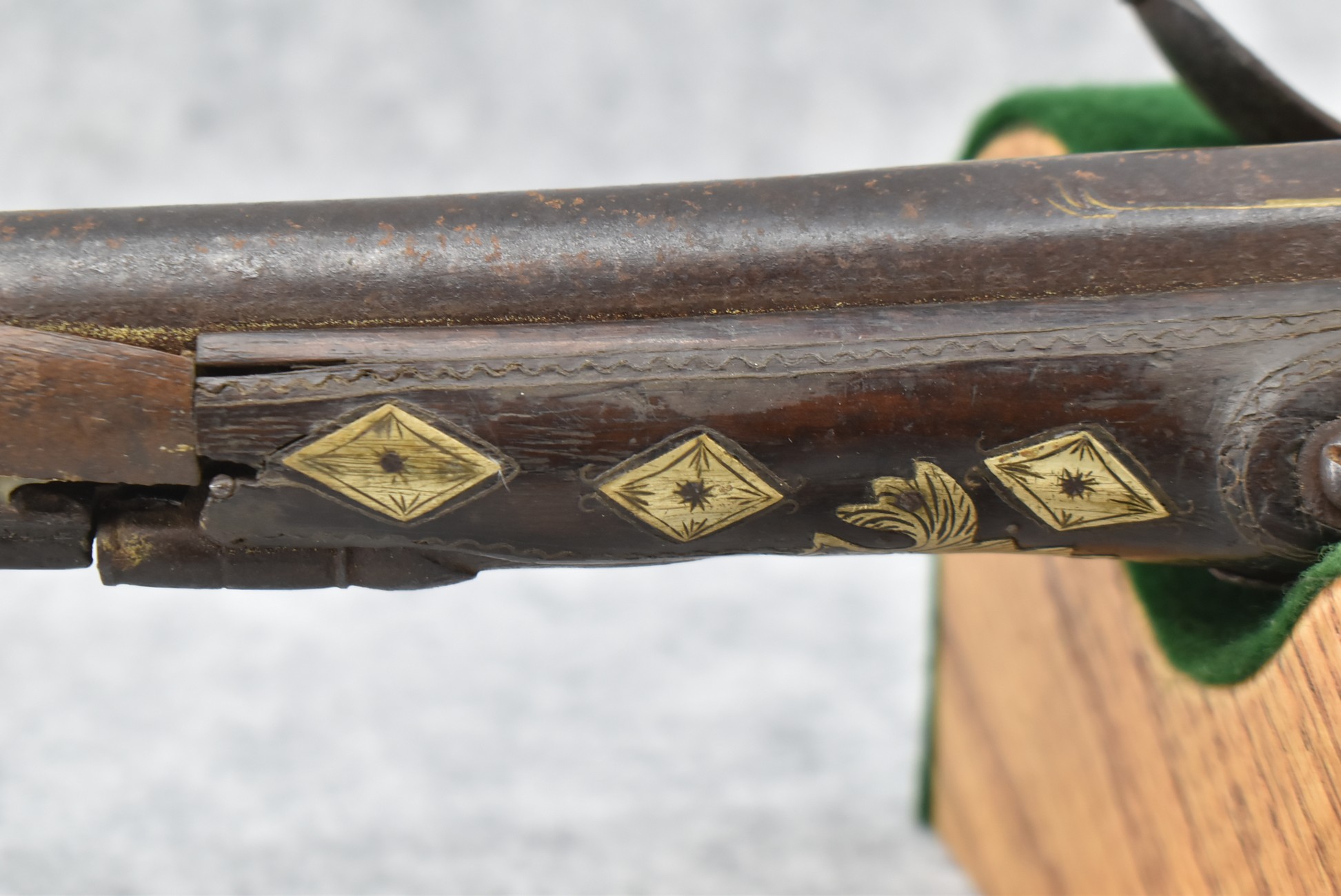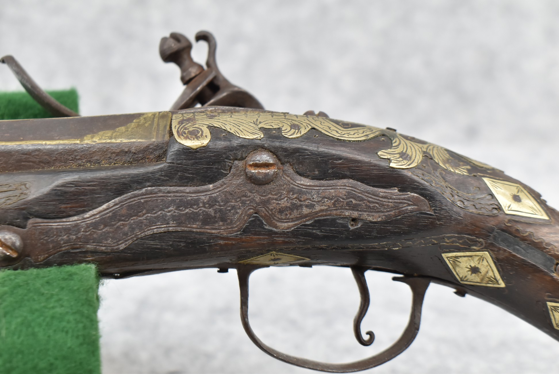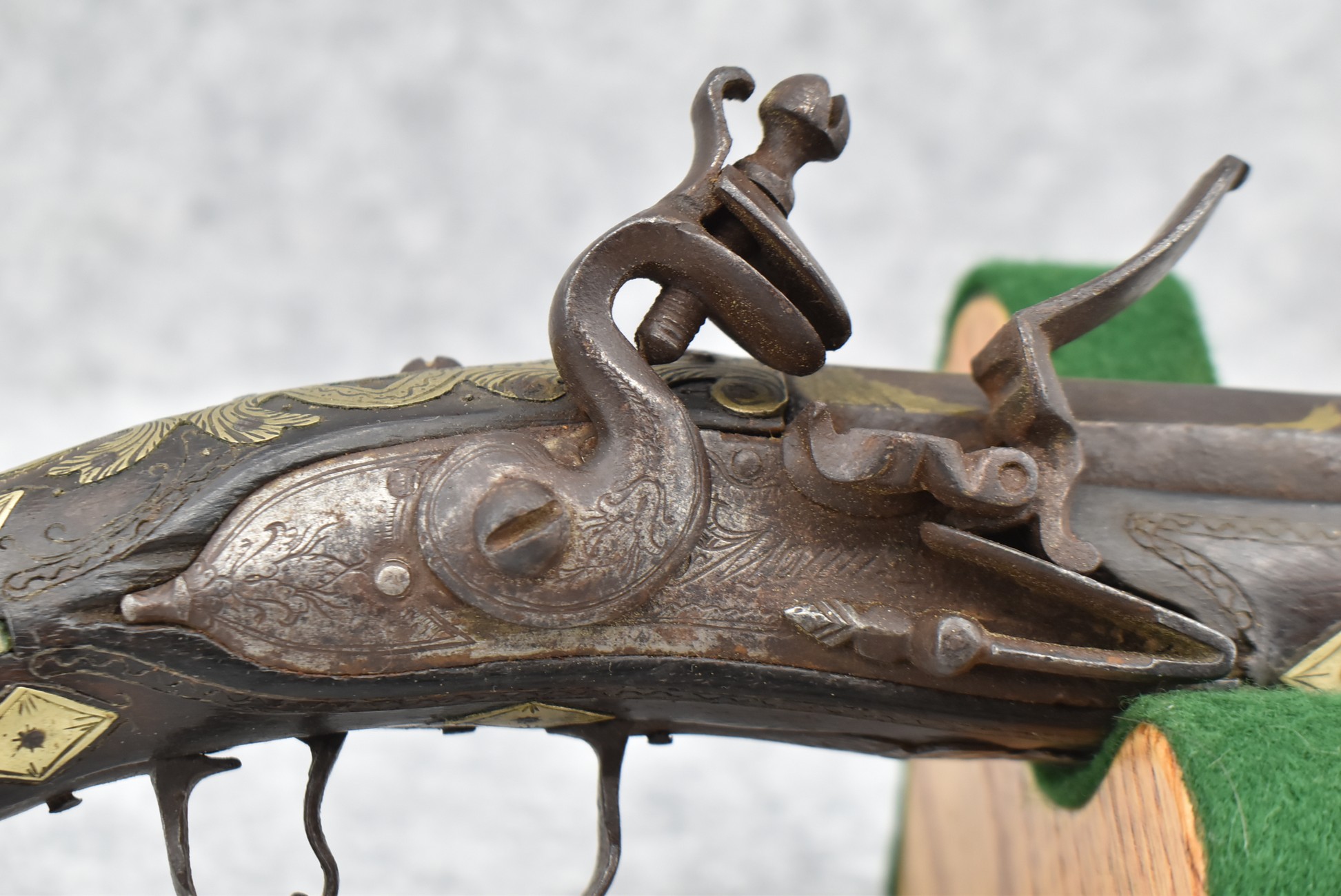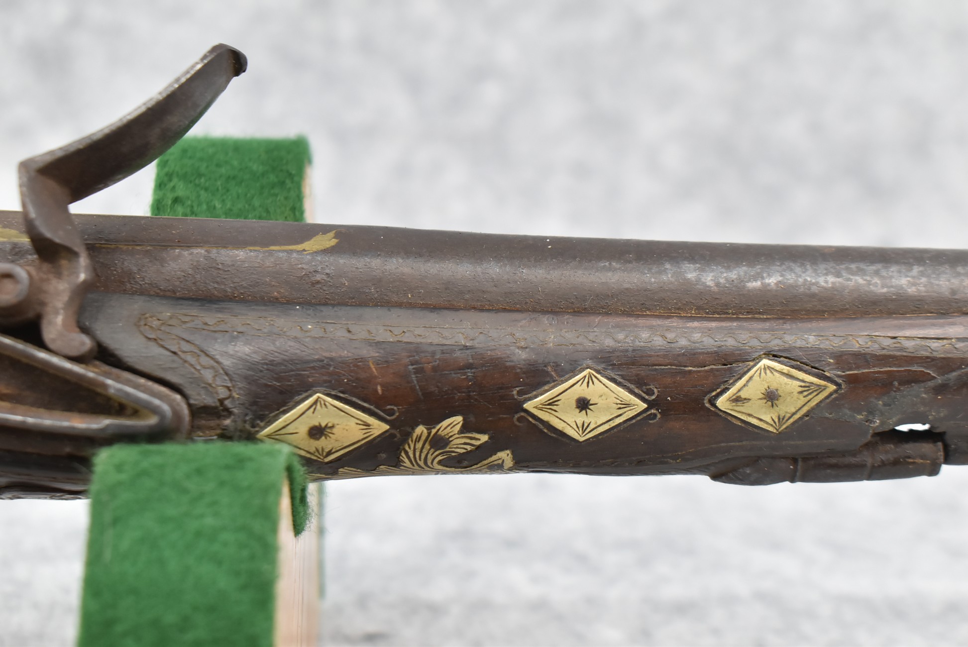 263. Ornate Turkish Style 65 Cal. Flintlock Pistol – w/11 ½” Barrel (No Sights) – Gray/Brown Finish – w/Wood Stock w/Highly Relief Engraved Butt Cap & Multiple Stock Inlays – No Ram Rod – Note: Stock Has Been Repaired Out Near Muzzle