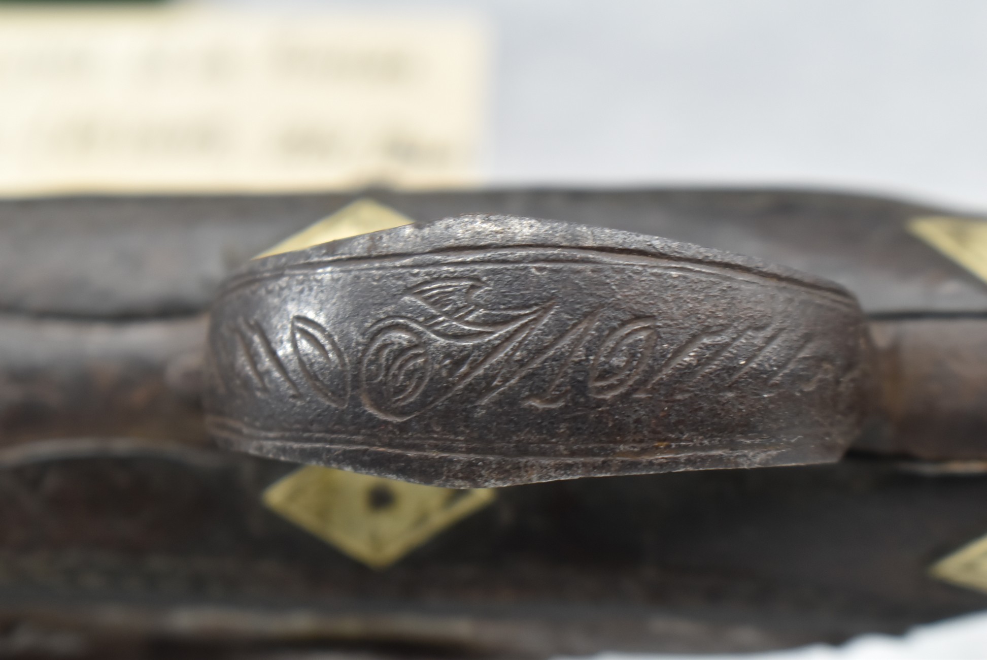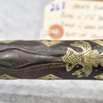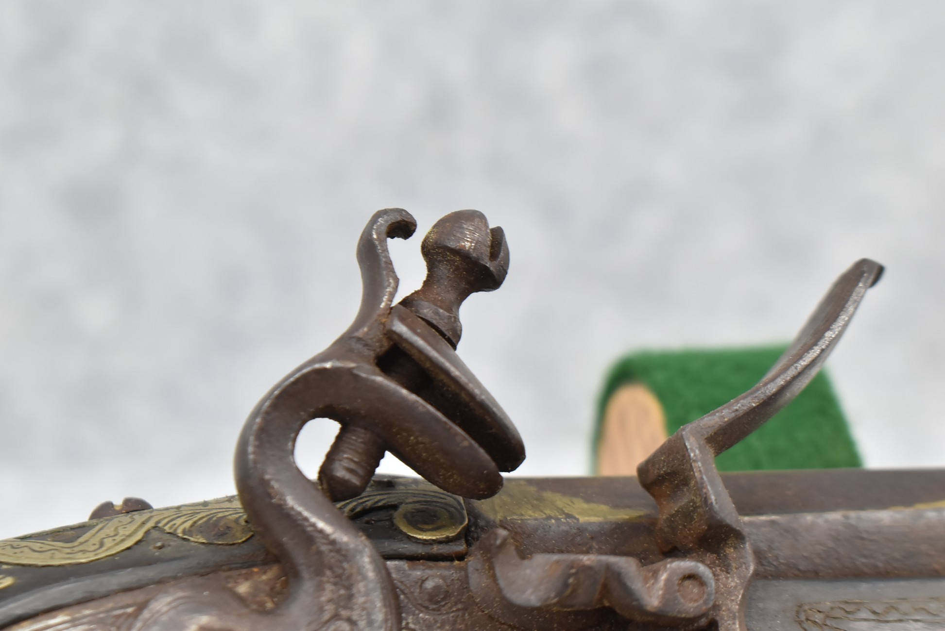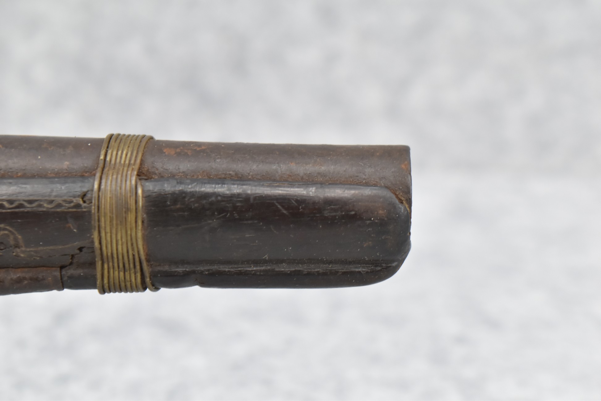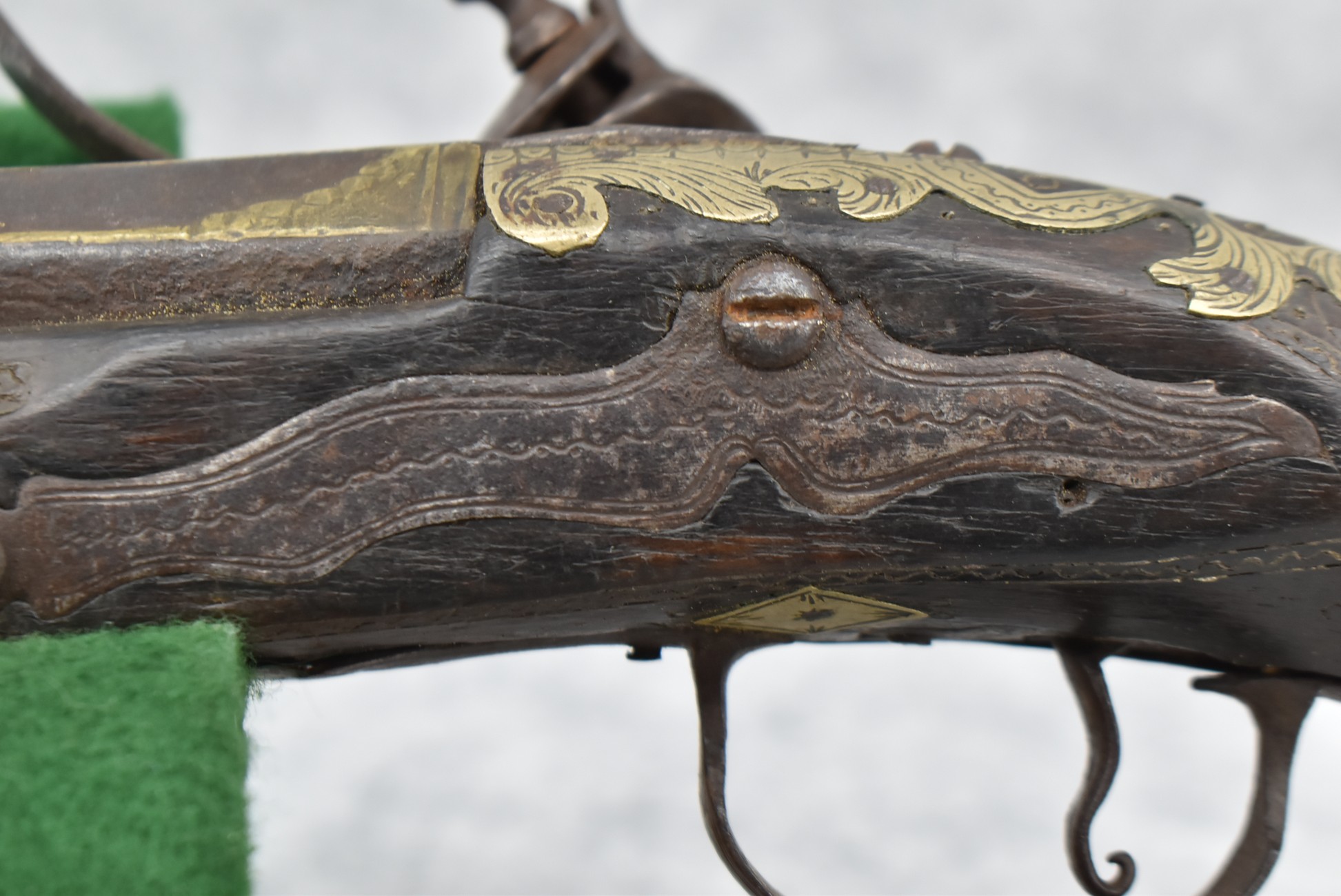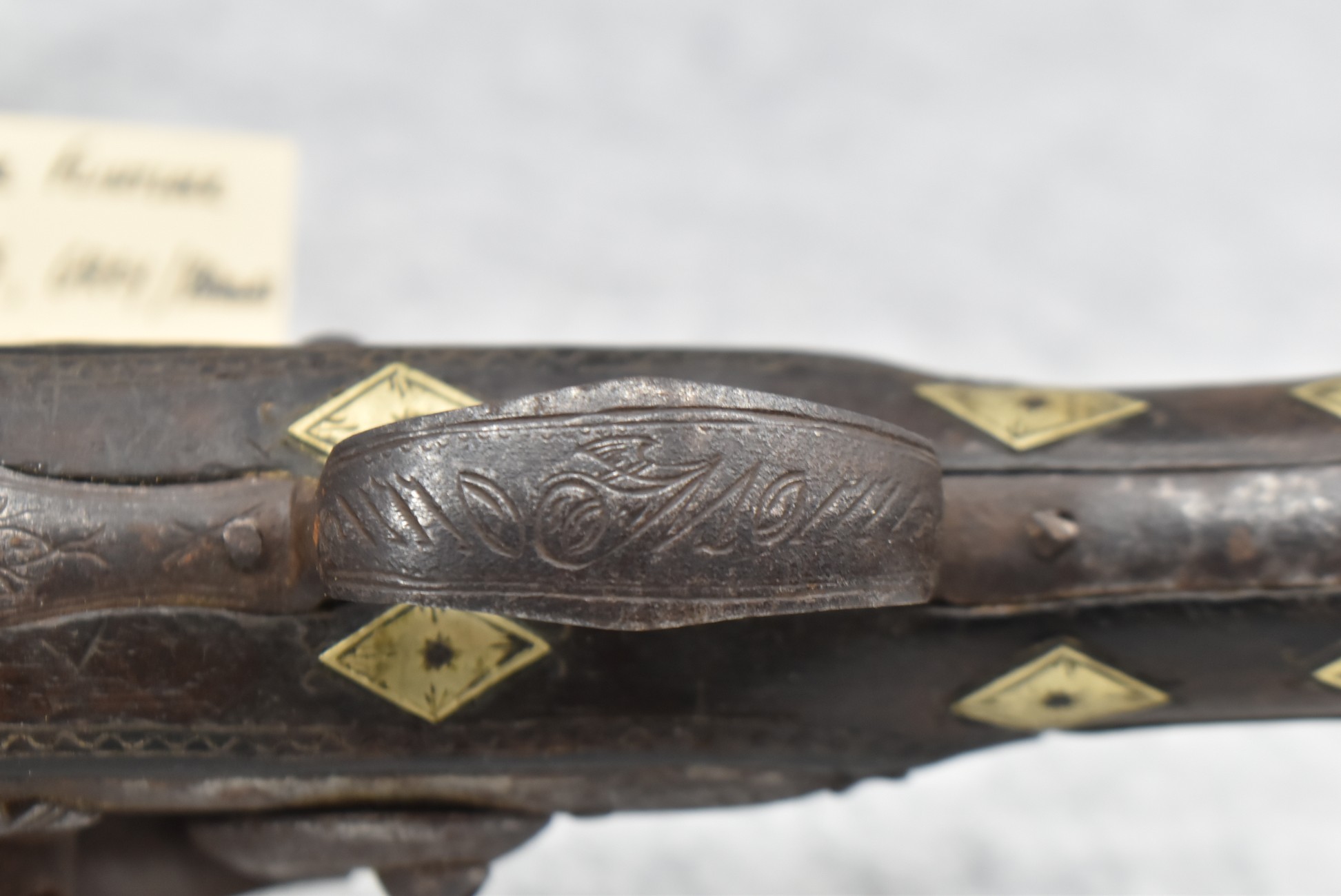 263. Ornate Turkish Style 65 Cal. Flintlock Pistol – w/11 ½” Barrel (No Sights) – Gray/Brown Finish – w/Wood Stock w/Highly Relief Engraved Butt Cap & Multiple Stock Inlays – No Ram Rod – Note: Stock Has Been Repaired Out Near Muzzle