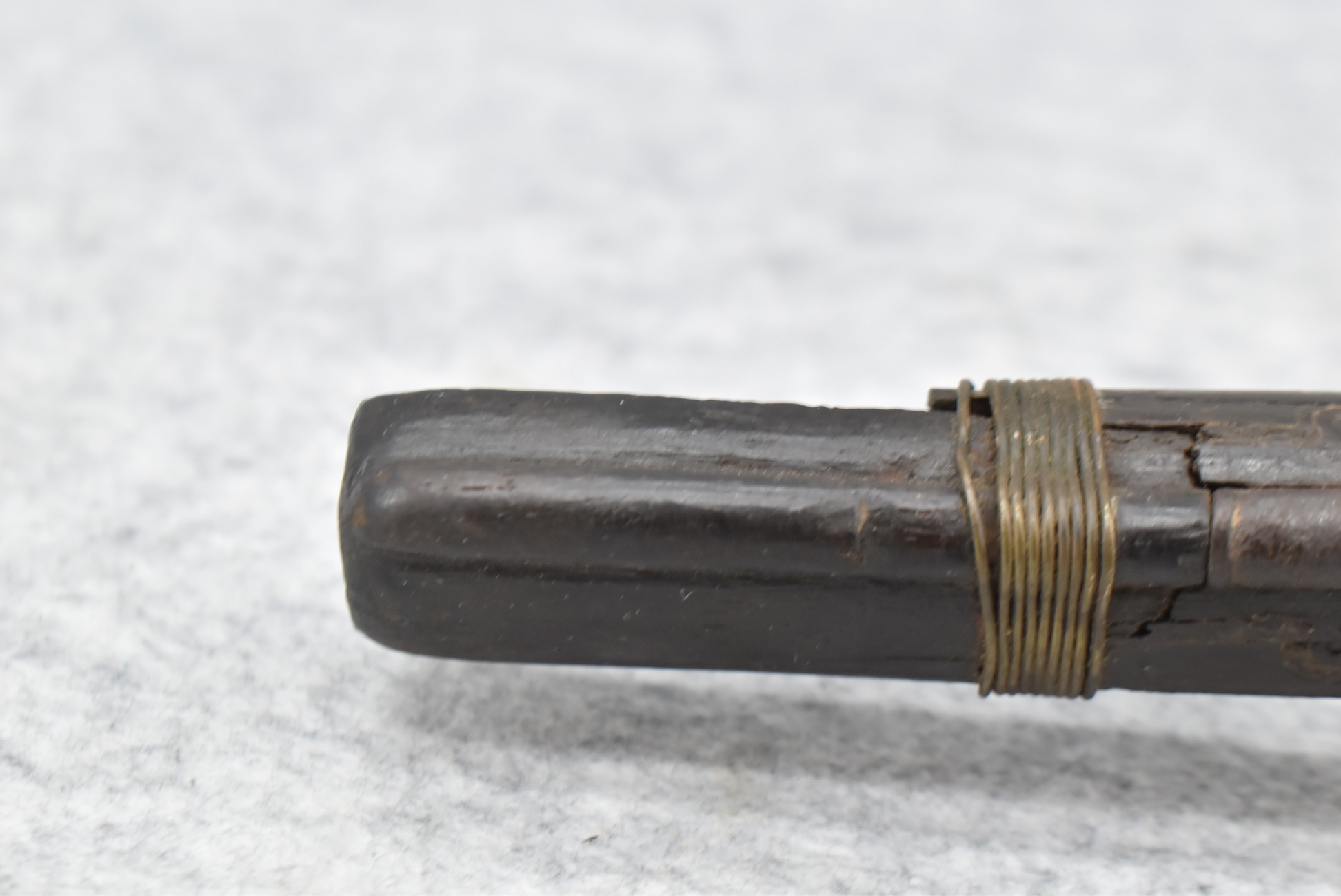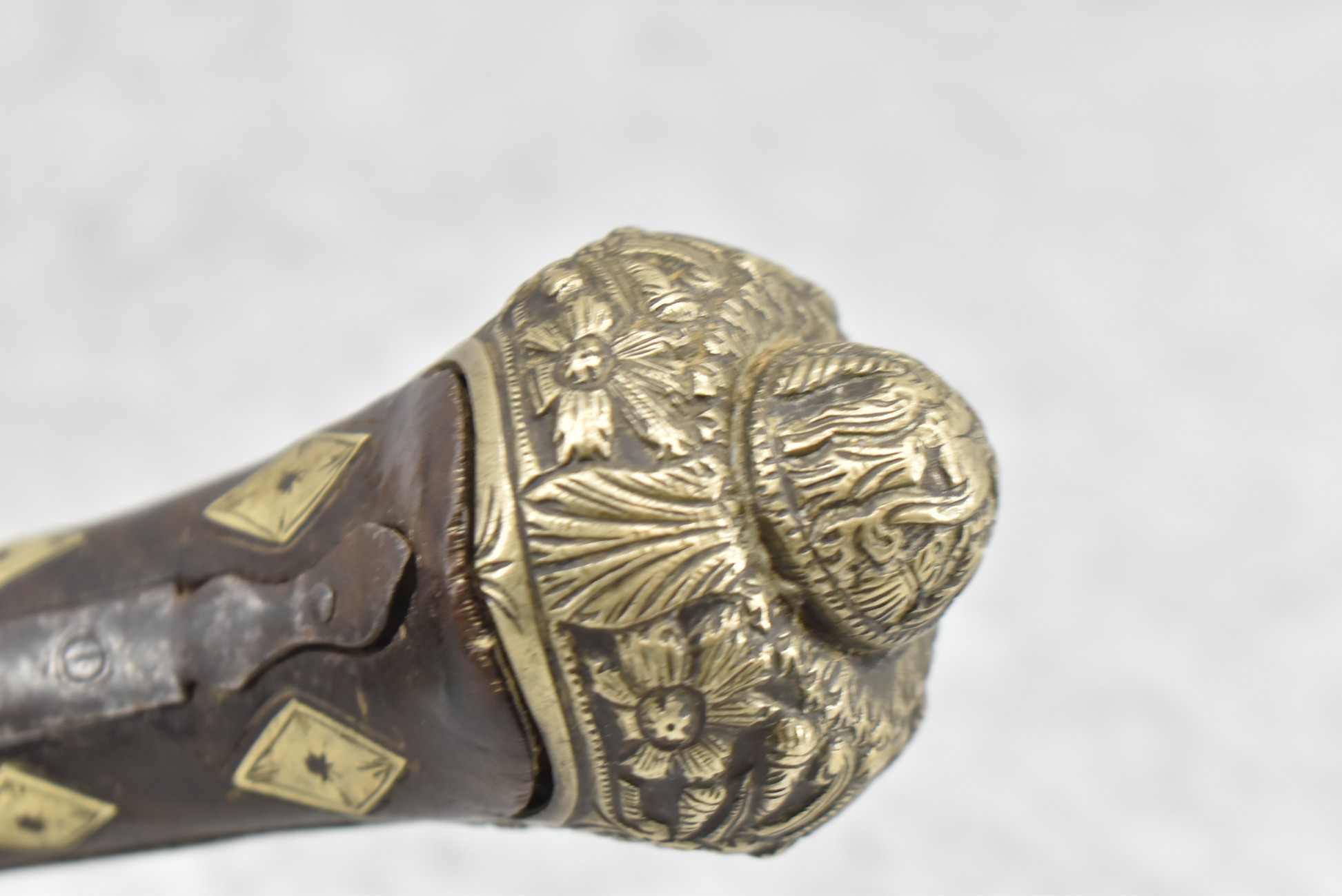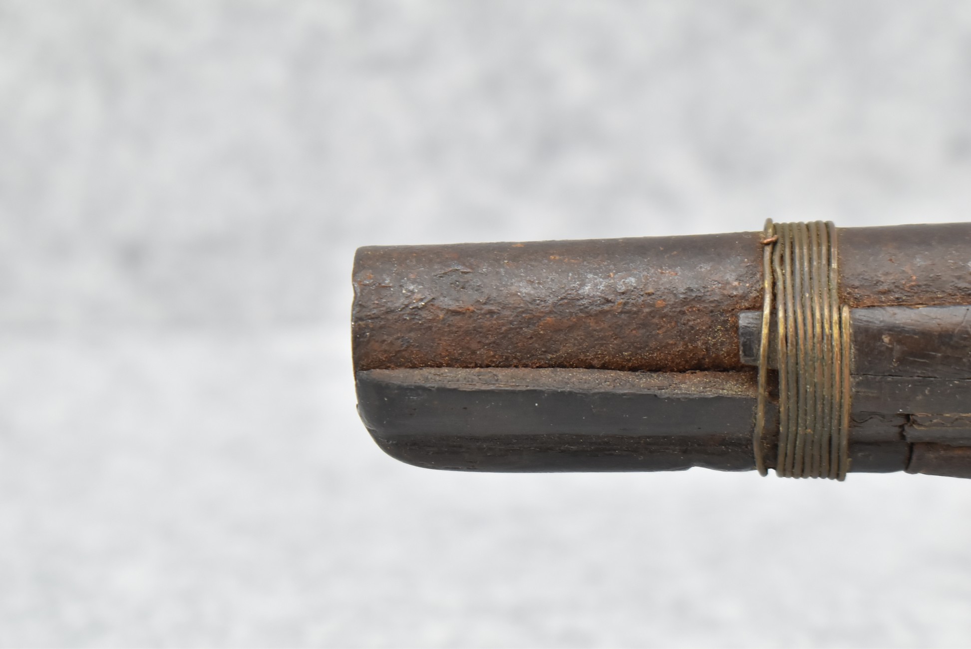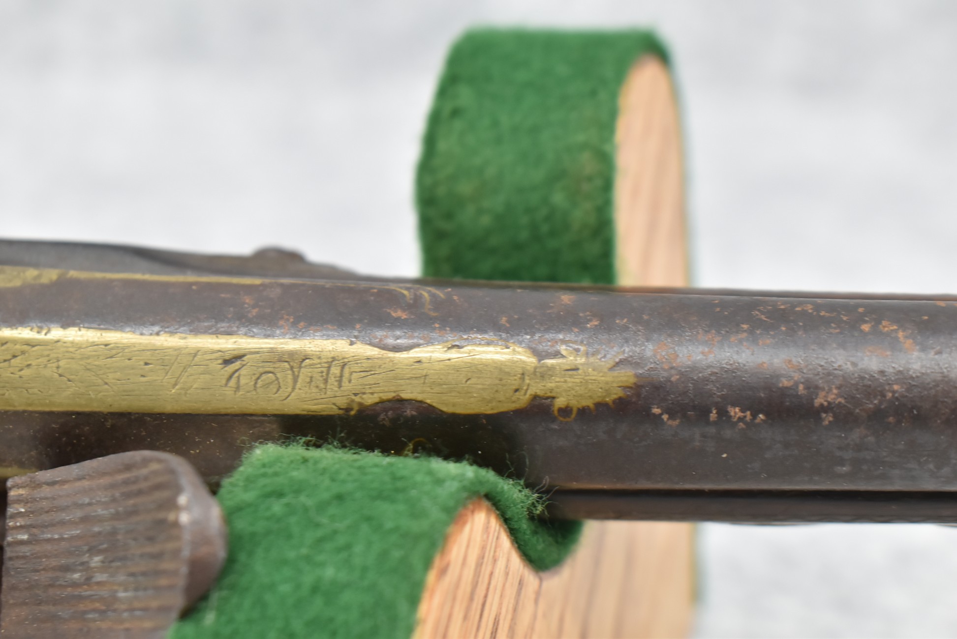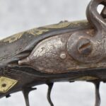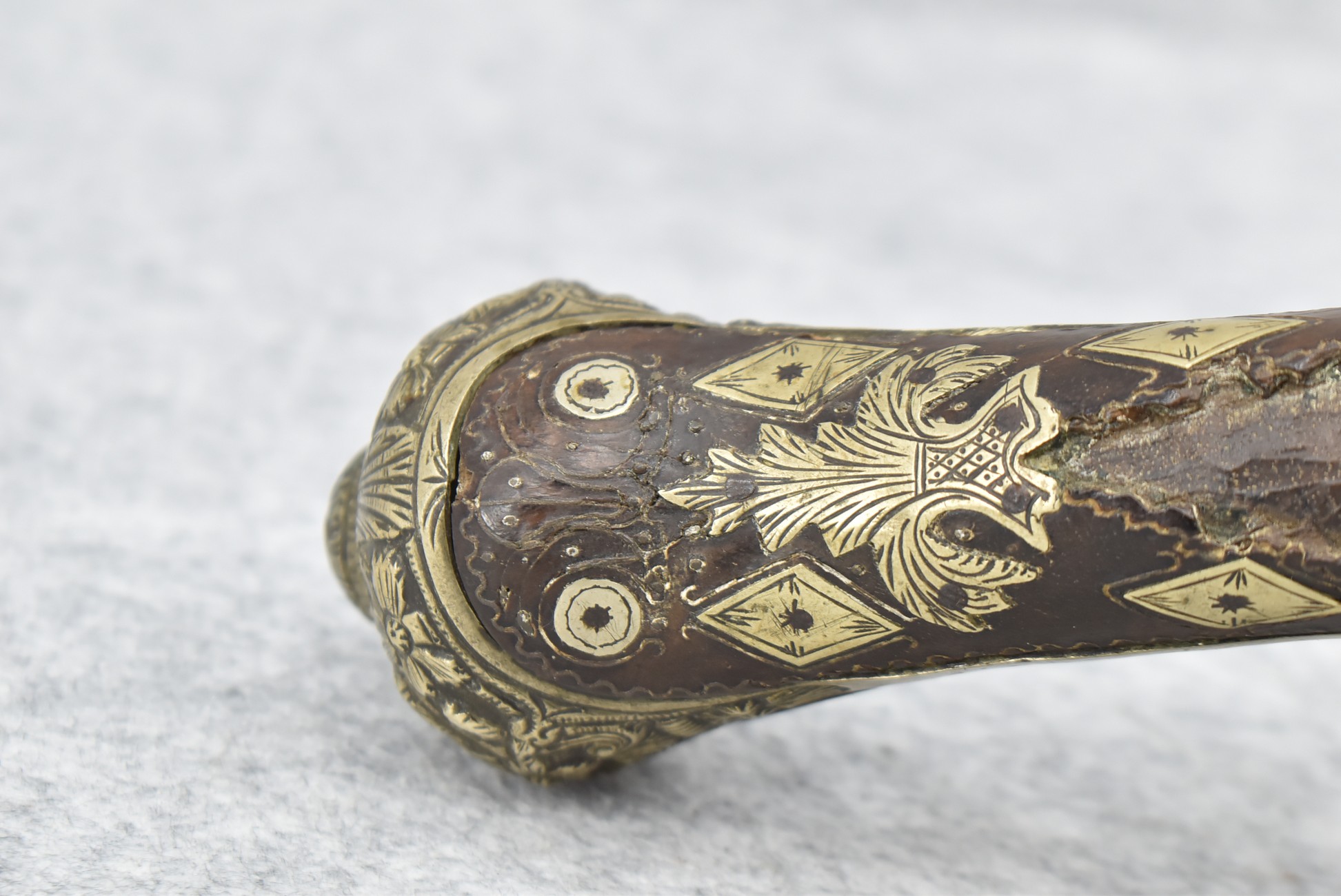263. Ornate Turkish Style 65 Cal. Flintlock Pistol – w/11 ½” Barrel (No Sights) – Gray/Brown Finish – w/Wood Stock w/Highly Relief Engraved Butt Cap & Multiple Stock Inlays – No Ram Rod – Note: Stock Has Been Repaired Out Near Muzzle
